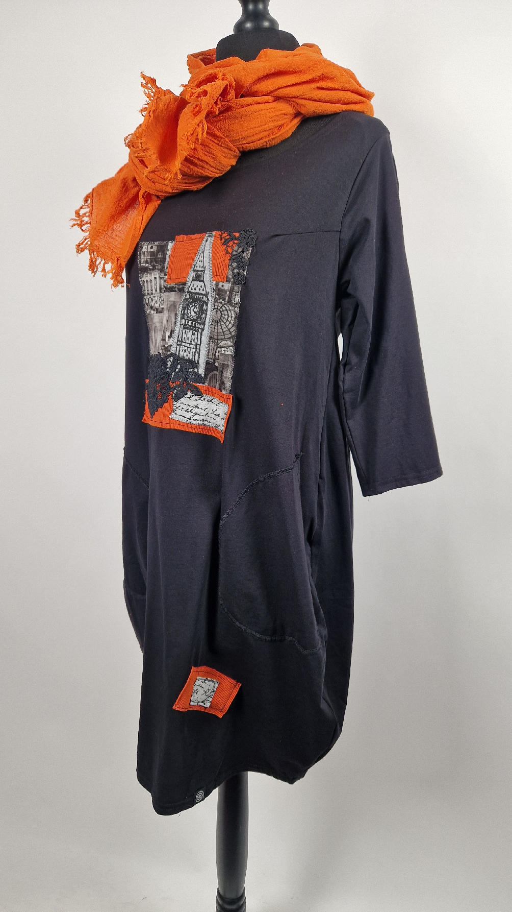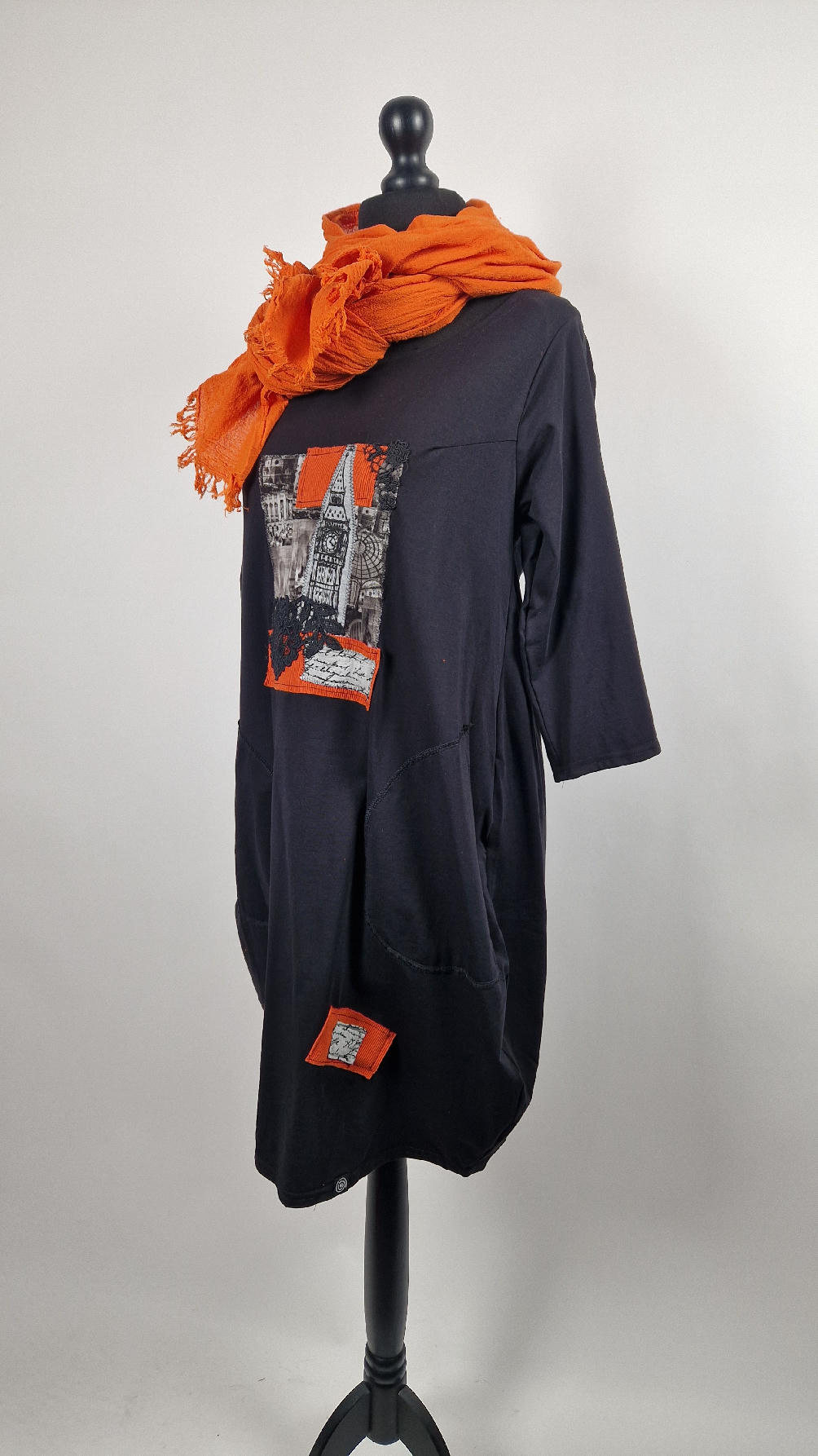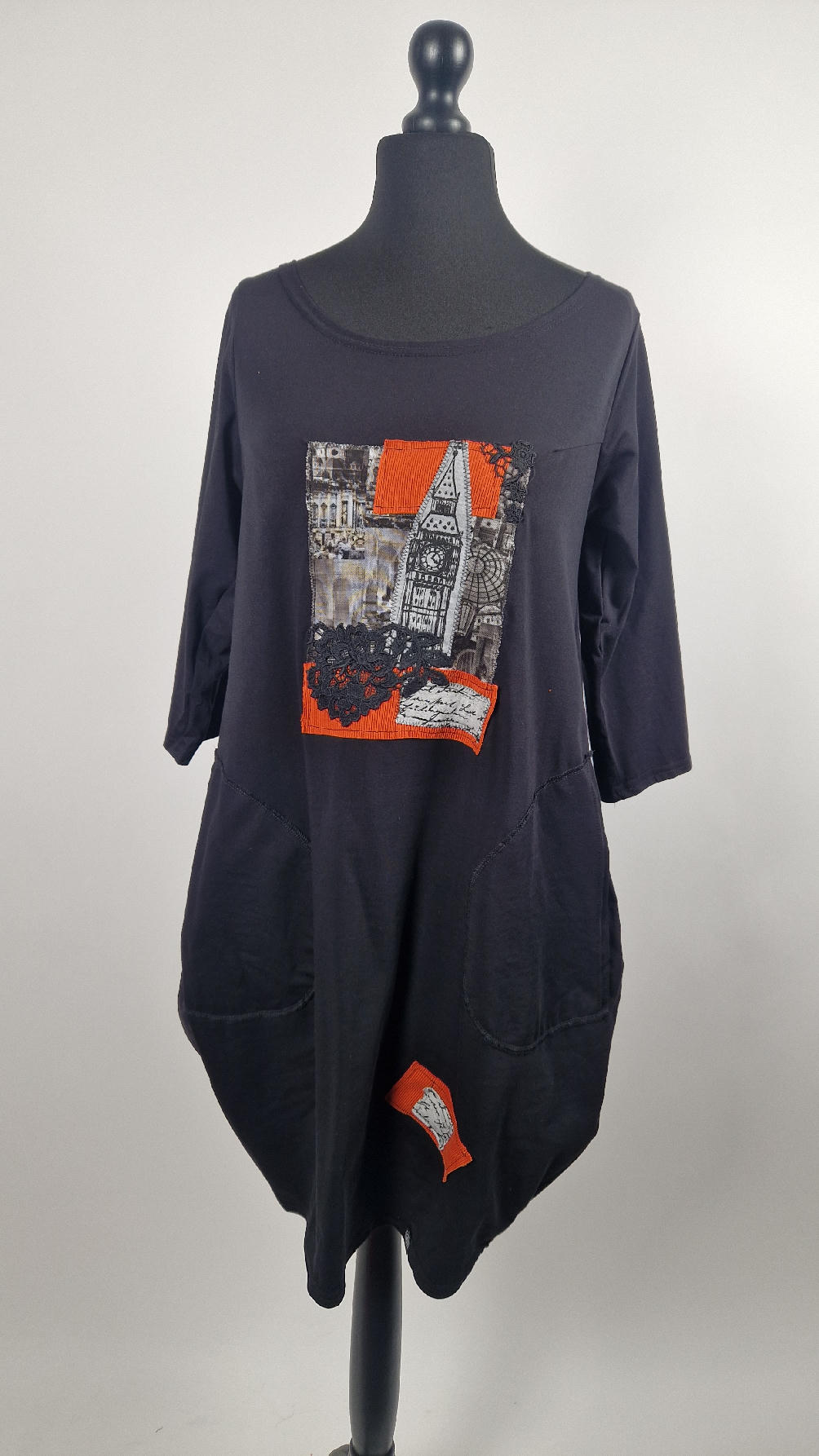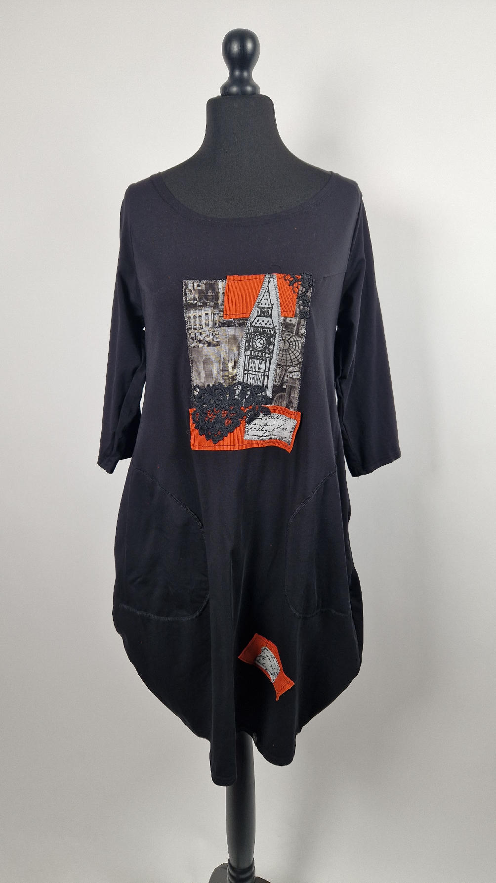 Czarna sukienka z rękawem 3/4 z unikatową aplikacją, uszyta z miękkiej bawełny typu jersey w kształcie, który pięknie ubierze Twoją sylwetkę, podkreślając to co trzeba lekko i luźno opływając pas i biodra; Każda aplikacja , każdy kolaż jest wykonany ręcznie, z różnych tkanin, koronek i cosiów. Każda sukienka jest niepowtarzalna, bo każdy kolaż jest inny.