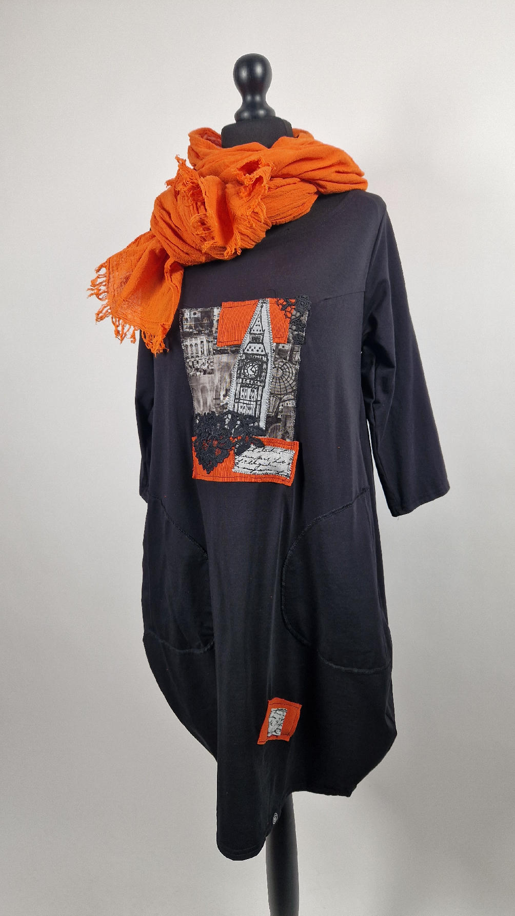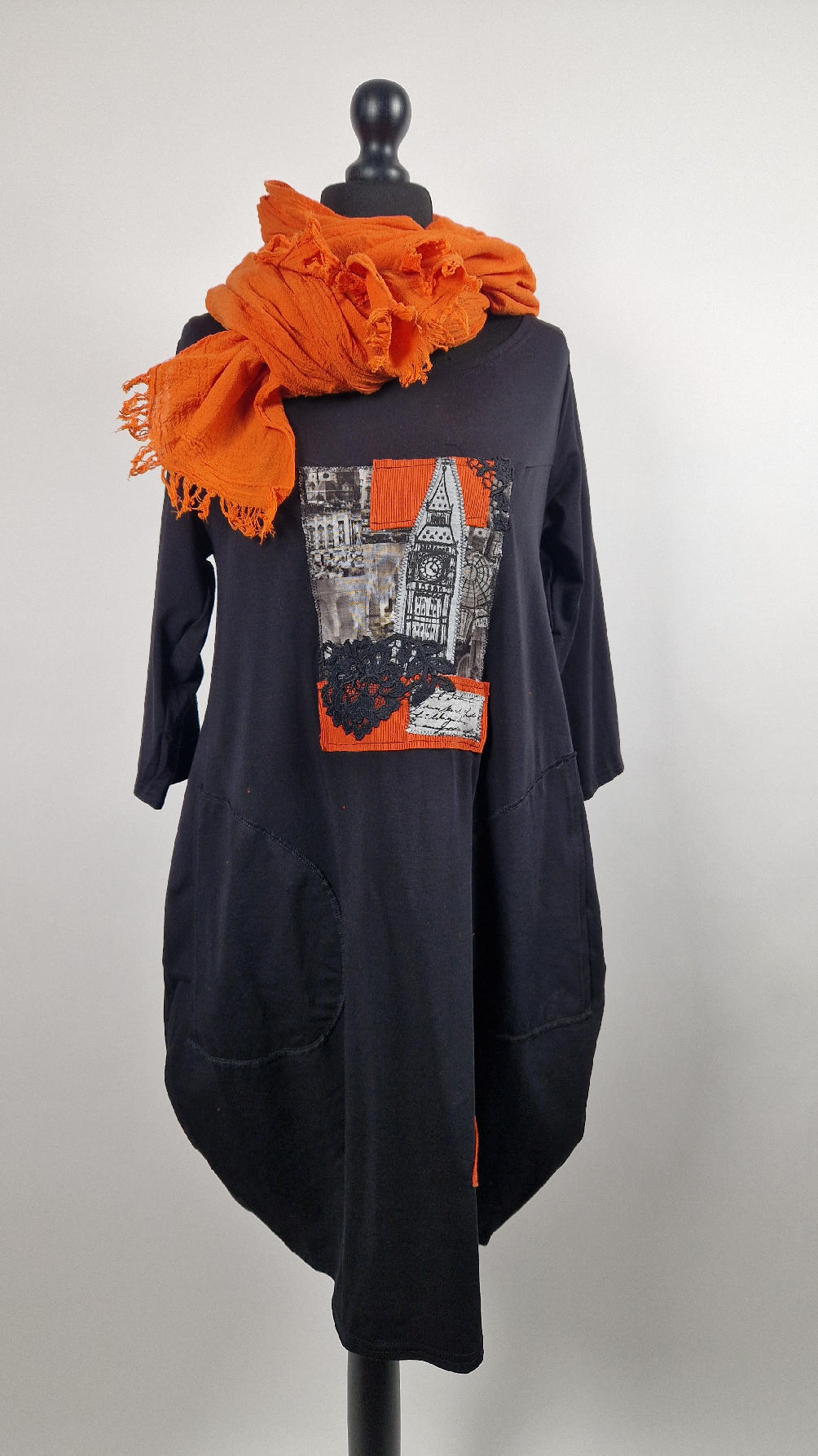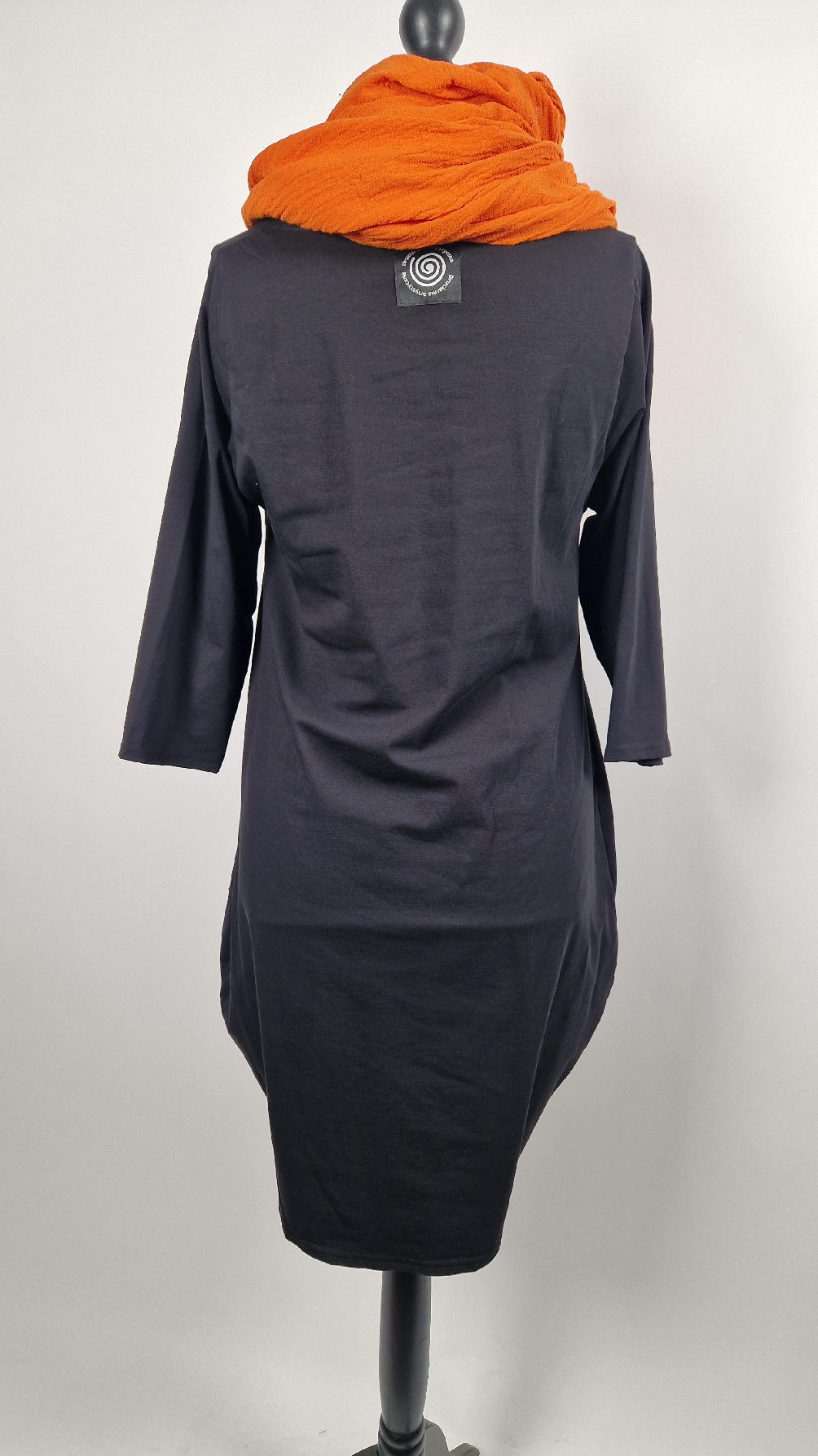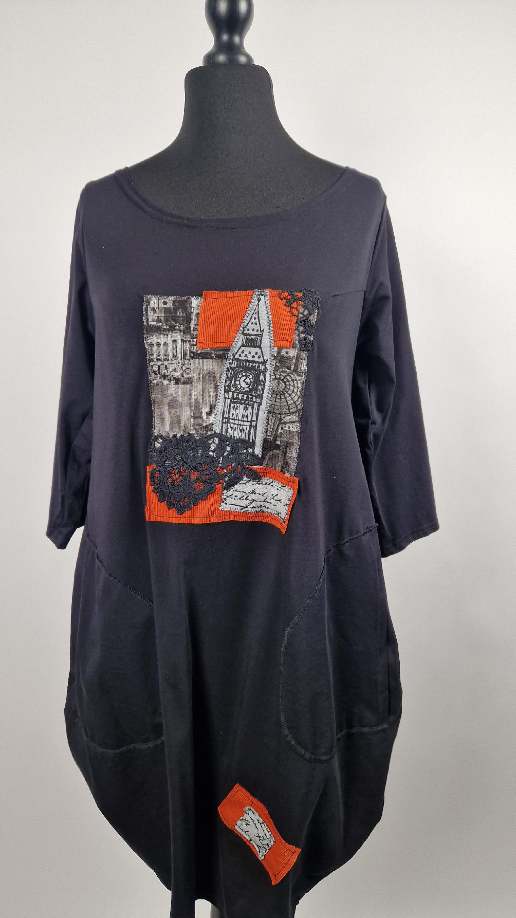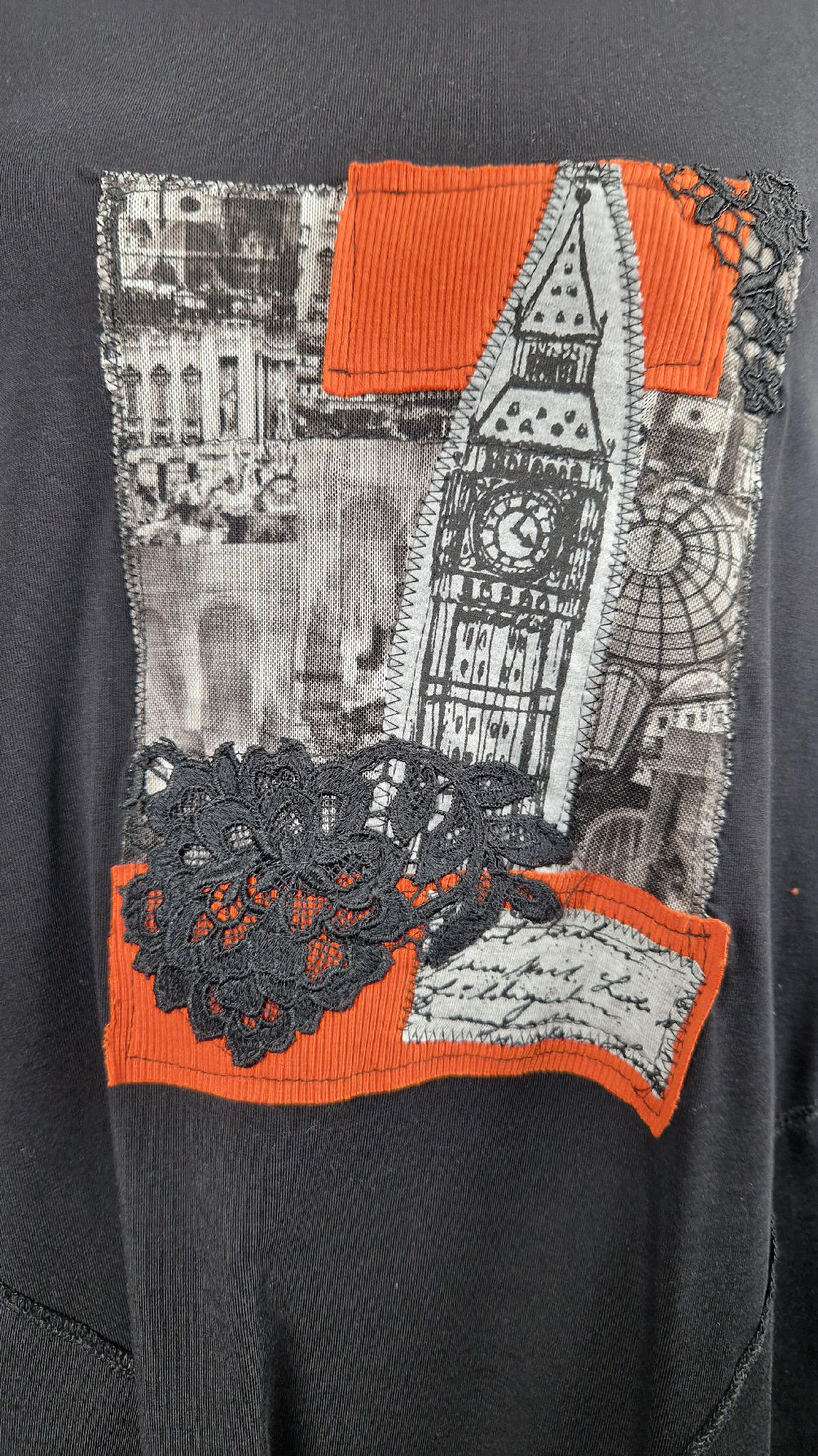 Czarna sukienka z rękawem 3/4 z unikatową aplikacją, uszyta z miękkiej bawełny typu jersey w kształcie, który pięknie ubierze Twoją sylwetkę, podkreślając to co trzeba lekko i luźno opływając pas i biodra; Każda aplikacja , każdy kolaż jest wykonany ręcznie, z różnych tkanin, koronek i cosiów. Każda sukienka jest niepowtarzalna, bo każdy kolaż jest inny.