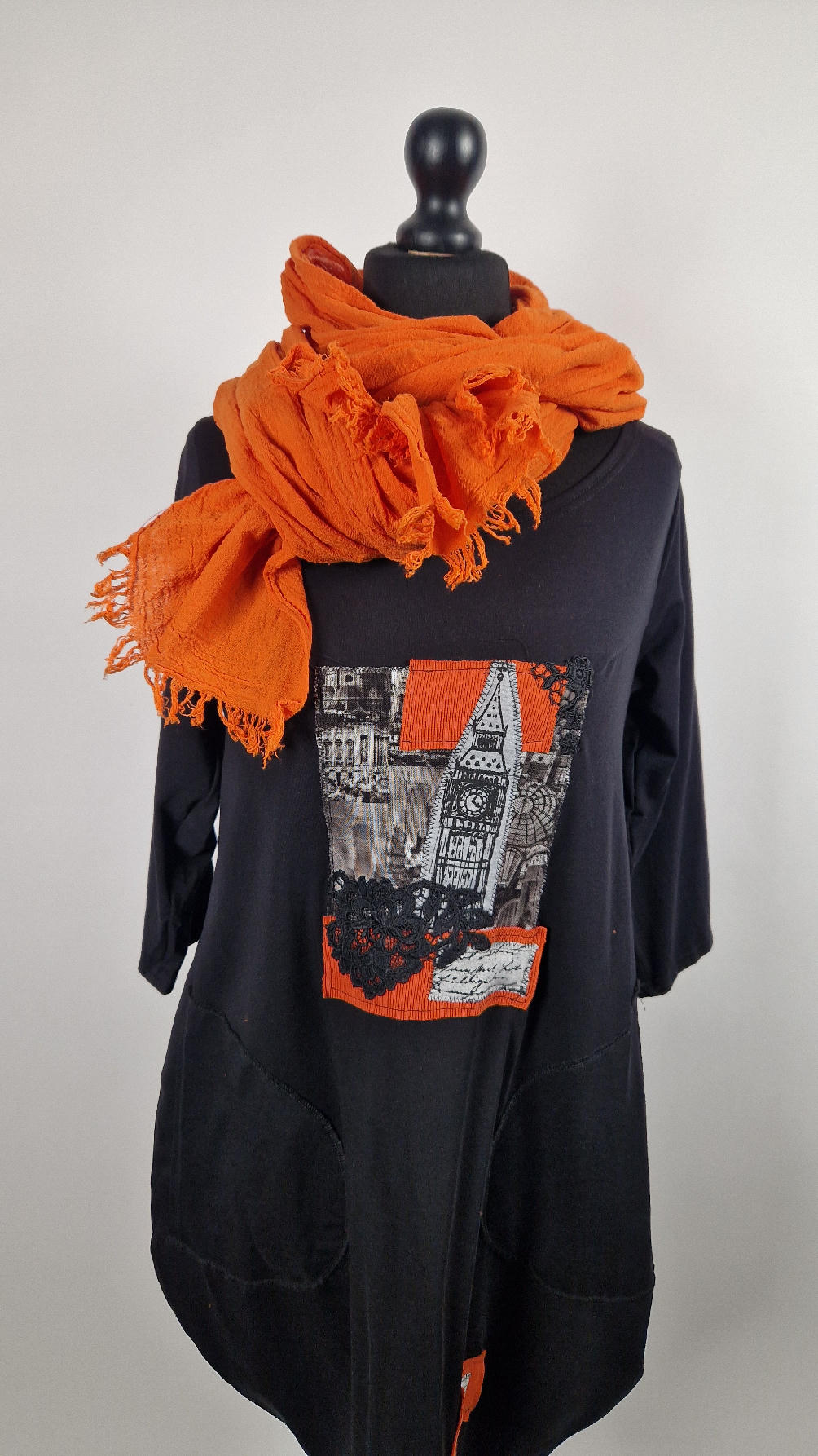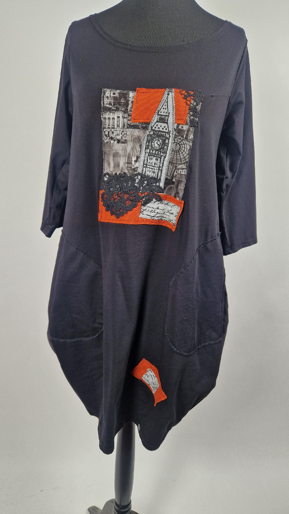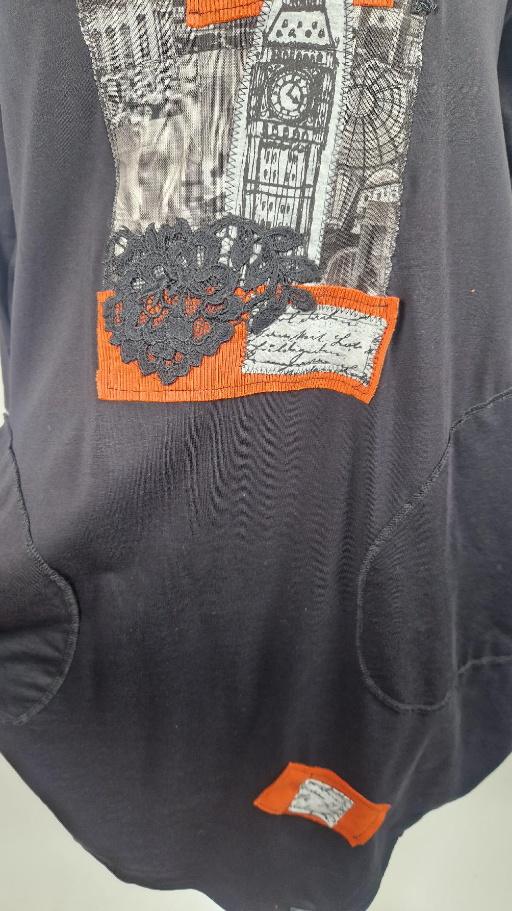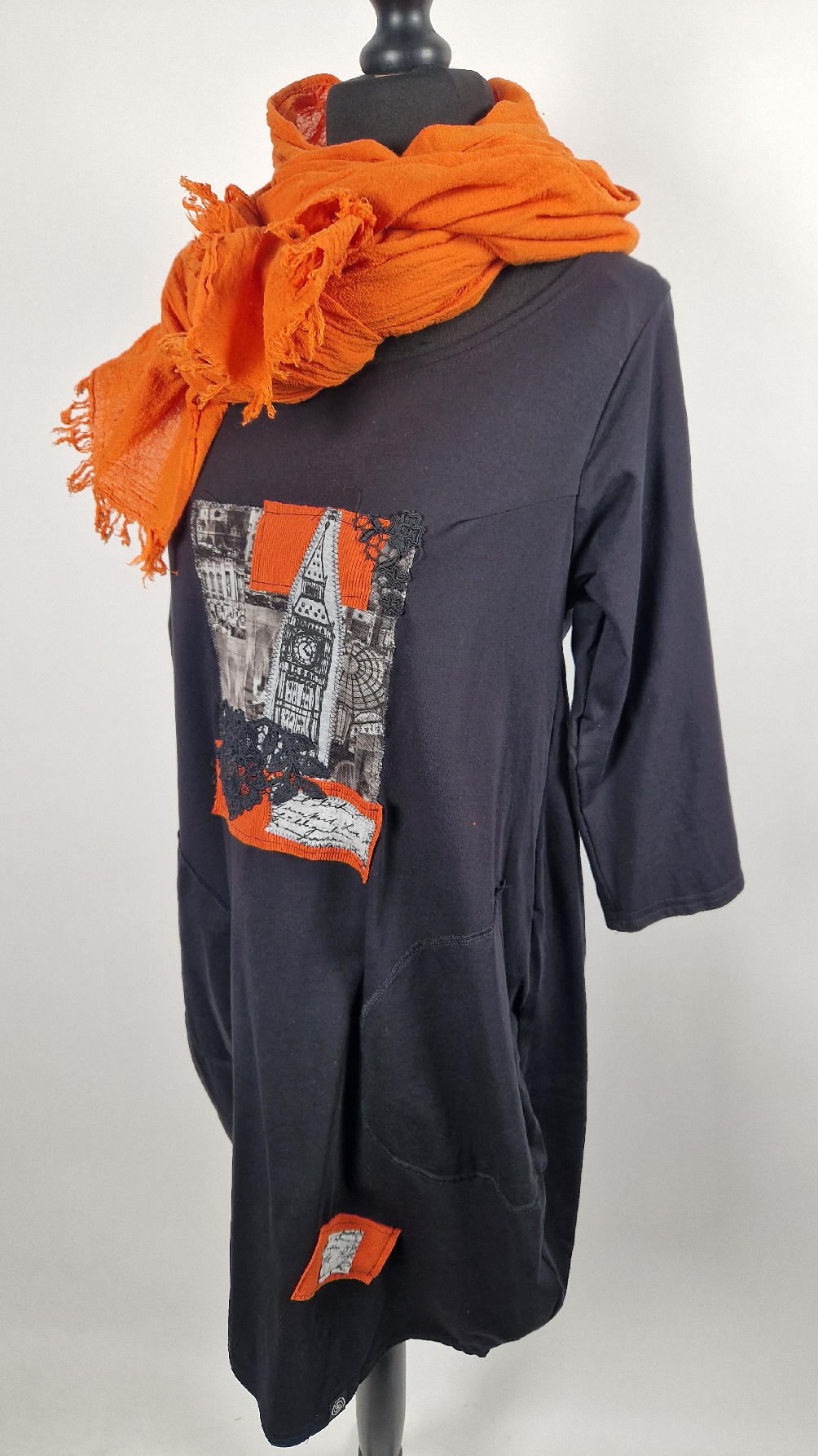 Czarna sukienka z rękawem 3/4 z unikatową aplikacją, uszyta z miękkiej bawełny typu jersey w kształcie, który pięknie ubierze Twoją sylwetkę, podkreślając to co trzeba lekko i luźno opływając pas i biodra; Każda aplikacja , każdy kolaż jest wykonany ręcznie, z różnych tkanin, koronek i cosiów. Każda sukienka jest niepowtarzalna, bo każdy kolaż jest inny.