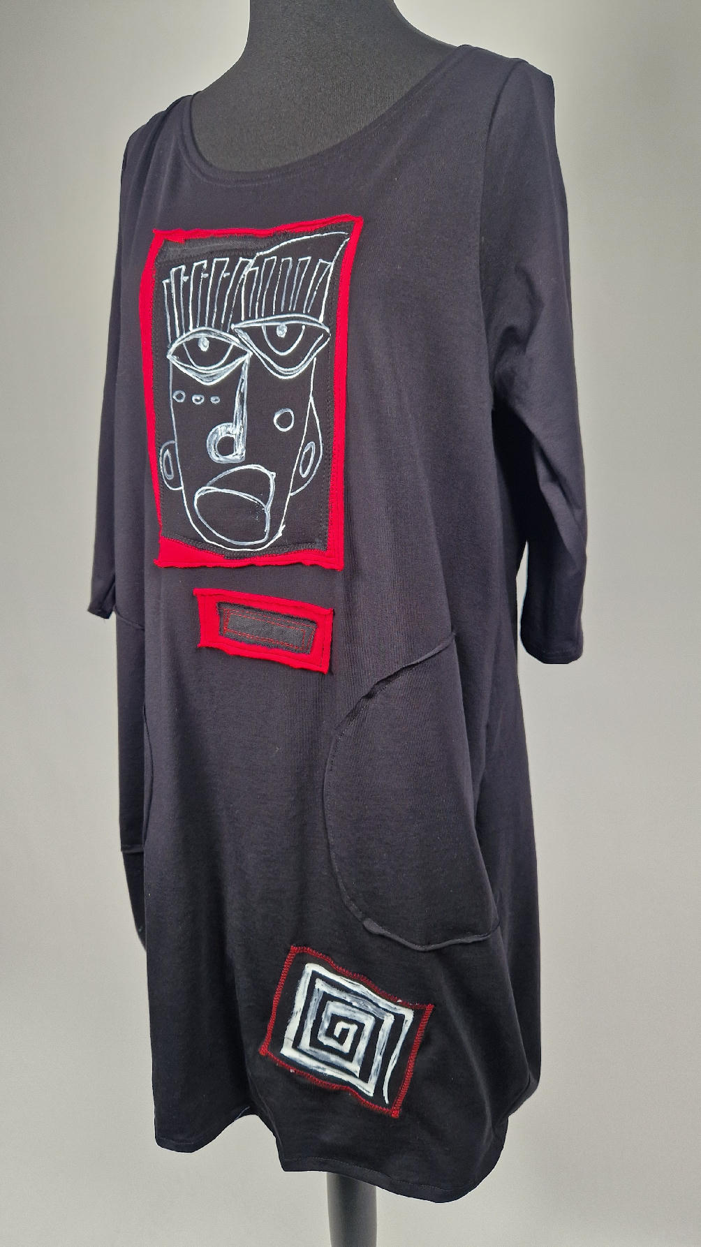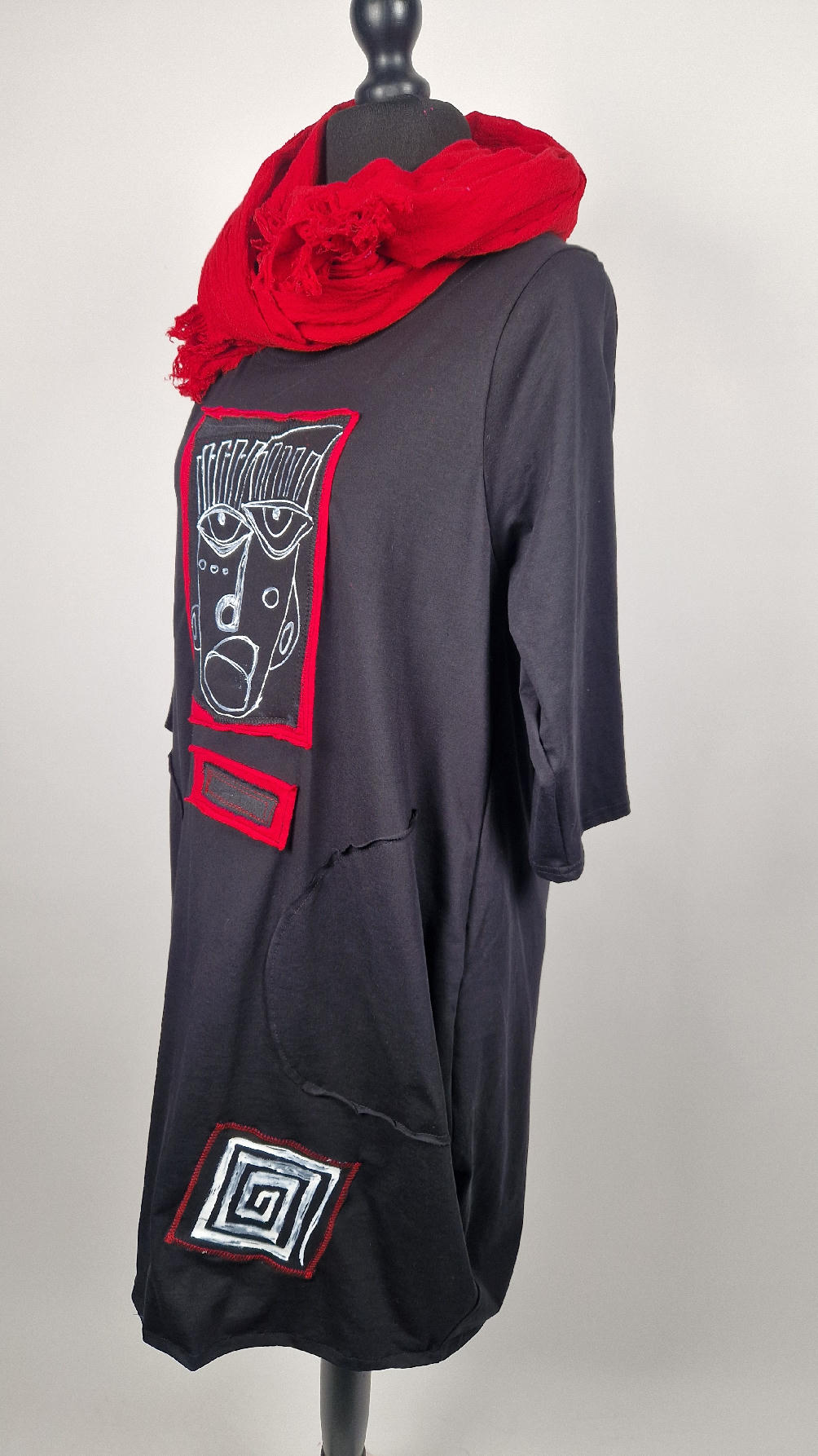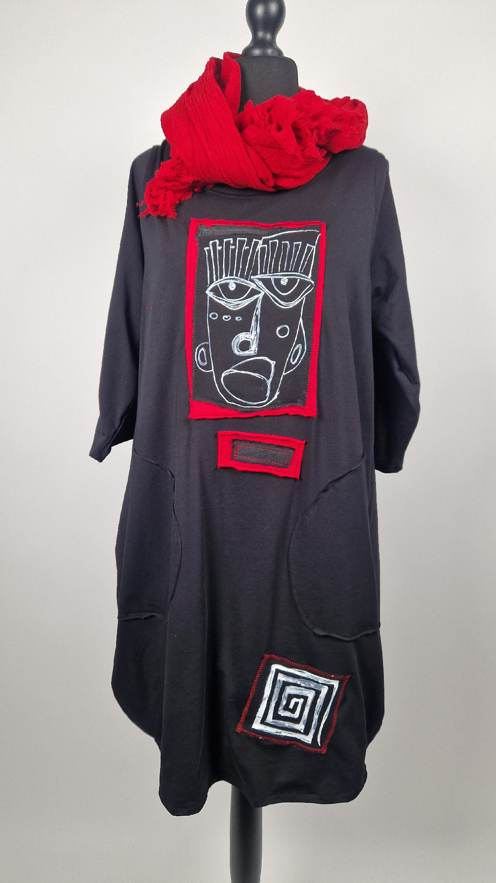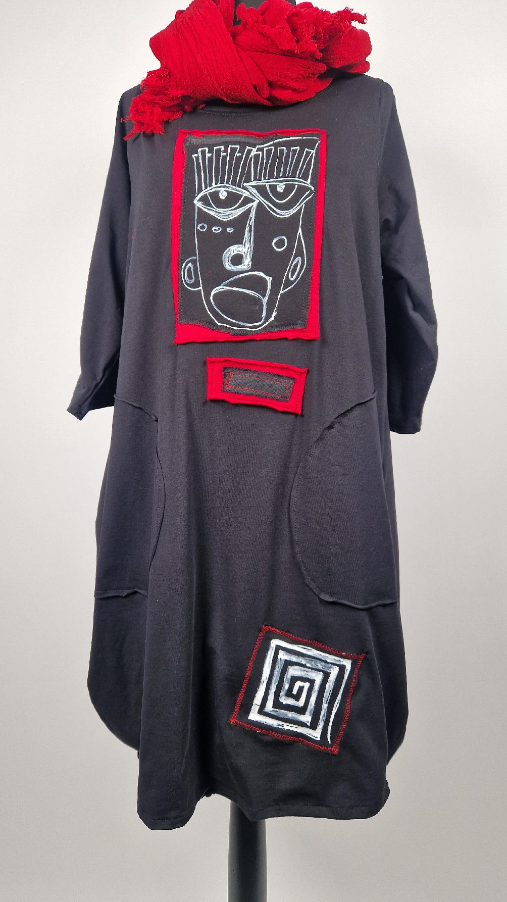 Czarna sukienka z unikatową, ręcznie malowaną aplikacją uszyta z bawełny typu jersey, uniwersalna i całoroczna, z rękawem 3/4…z przodu aplikacja-kolaż tkanin, unikatowy i jedyny dla każdej sukienki…Twoja sukienka jest wyjątkowa…poza tym bardzo wygodna i zgrabna i pokochasz ją od pierwszego zobaczenia.