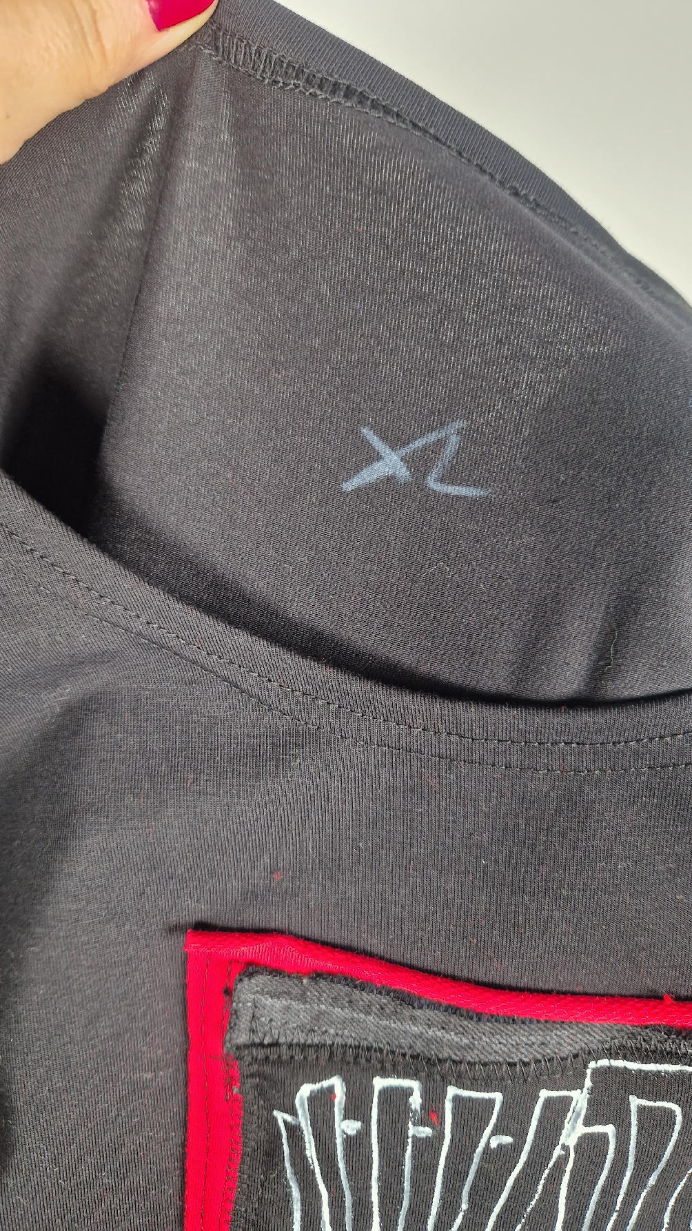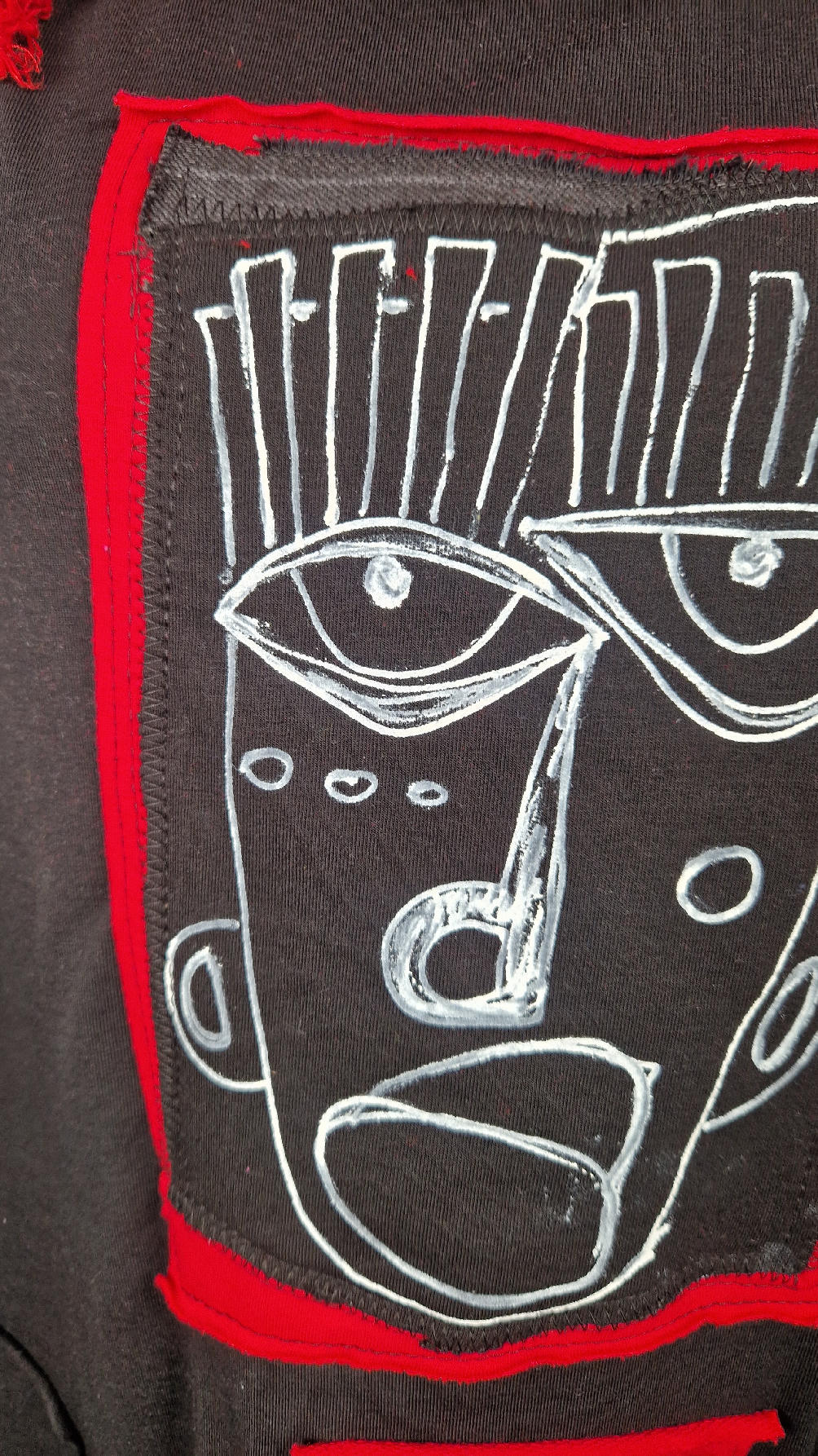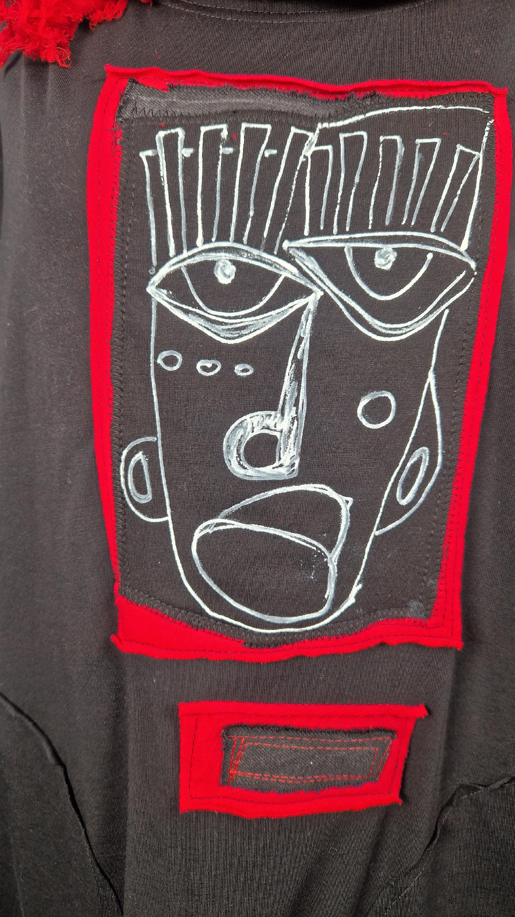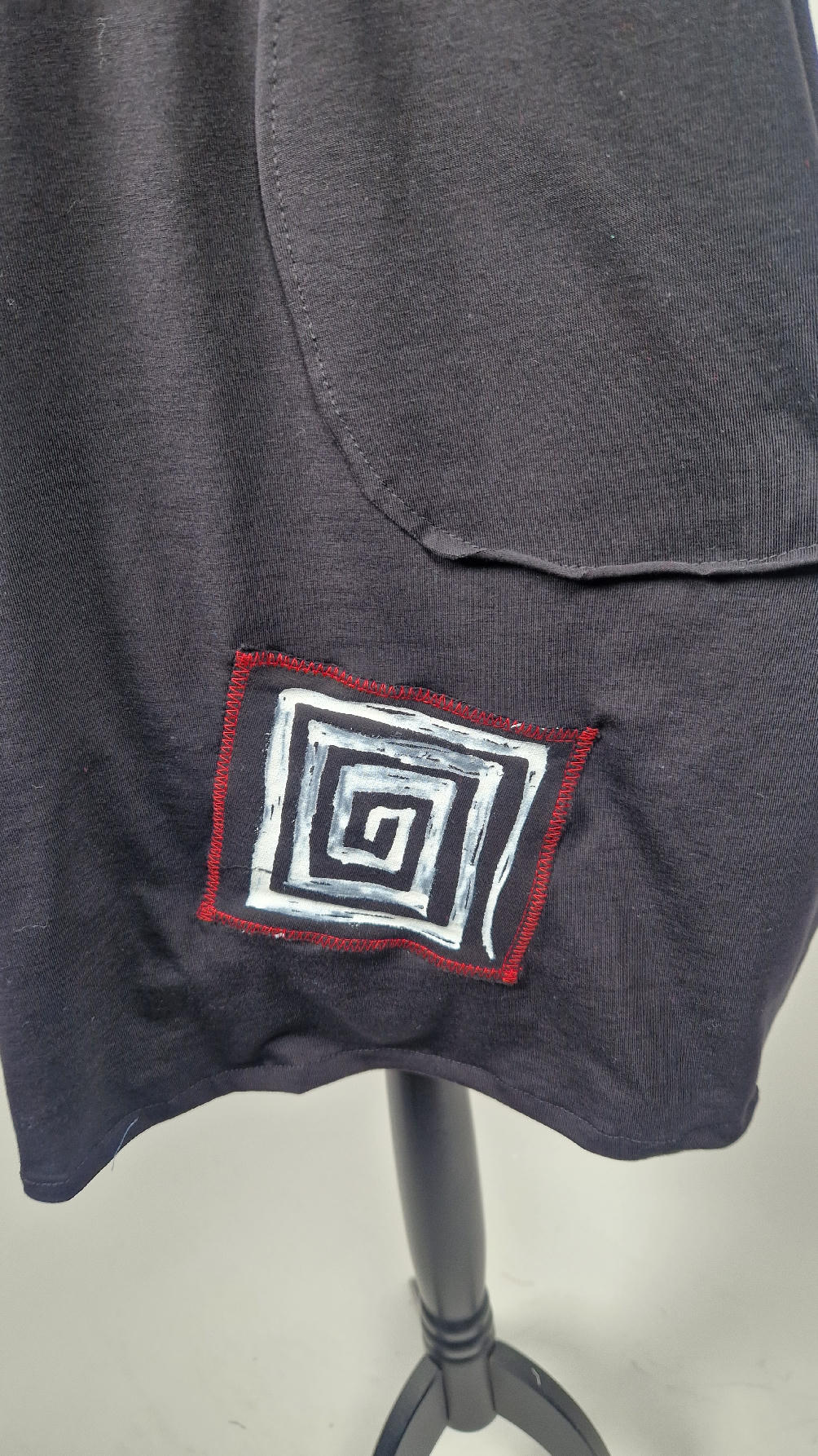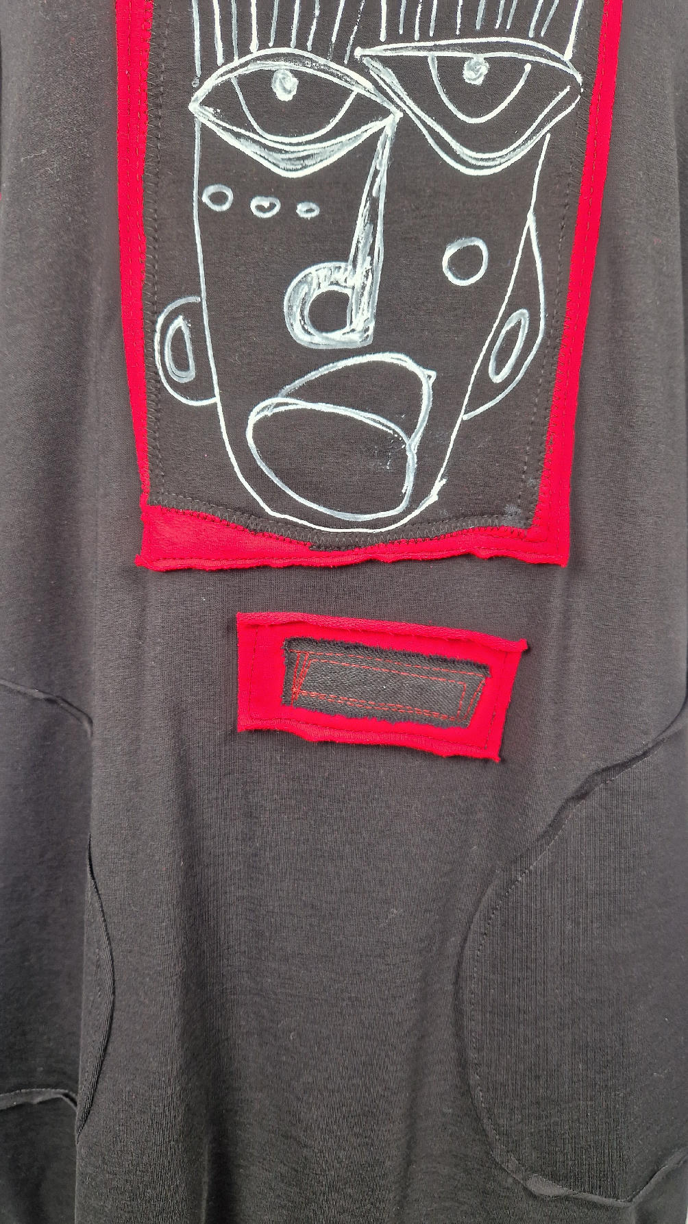 Czarna sukienka z unikatową, ręcznie malowaną aplikacją uszyta z bawełny typu jersey, uniwersalna i całoroczna, z rękawem 3/4…z przodu aplikacja-kolaż tkanin, unikatowy i jedyny dla każdej sukienki…Twoja sukienka jest wyjątkowa…poza tym bardzo wygodna i zgrabna i pokochasz ją od pierwszego zobaczenia.