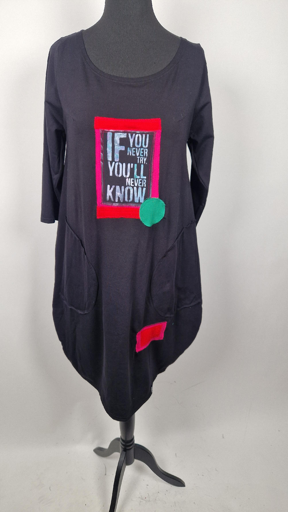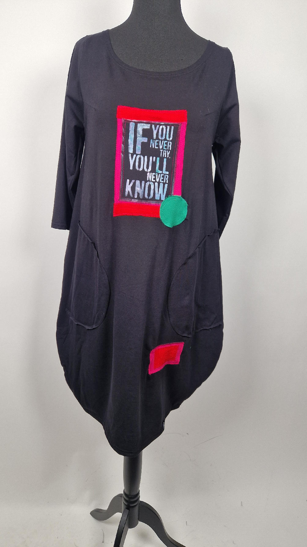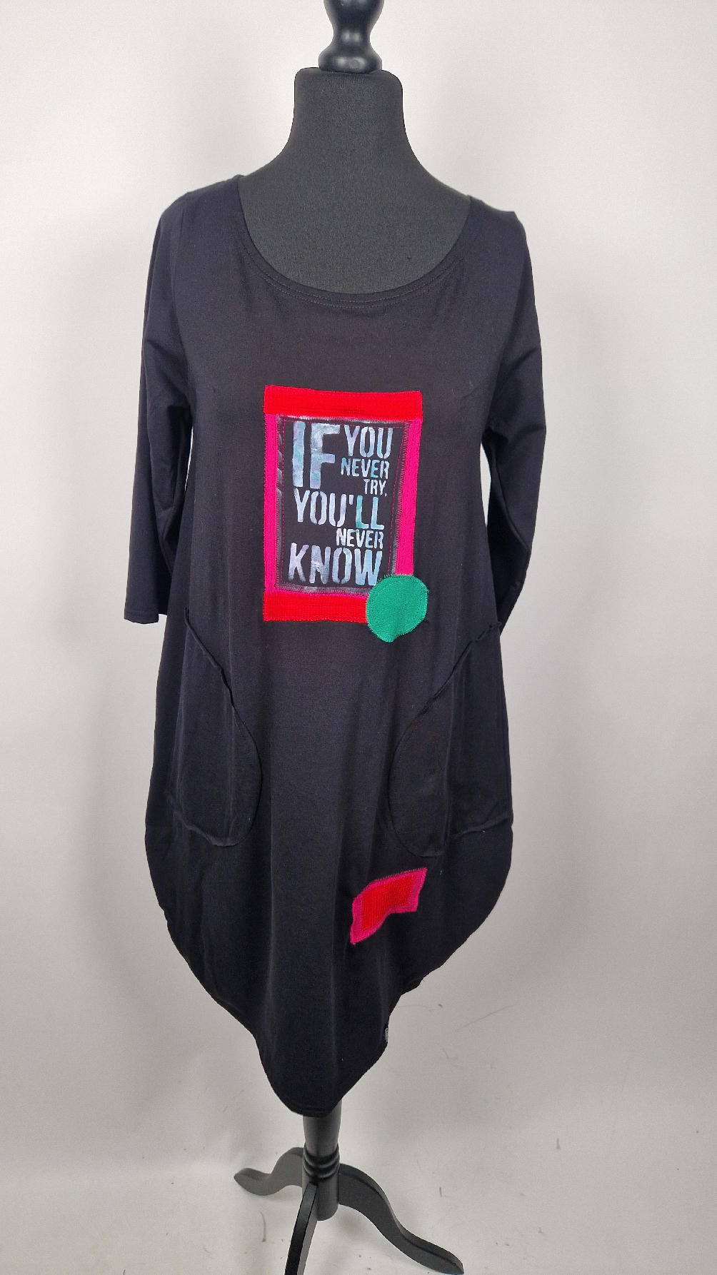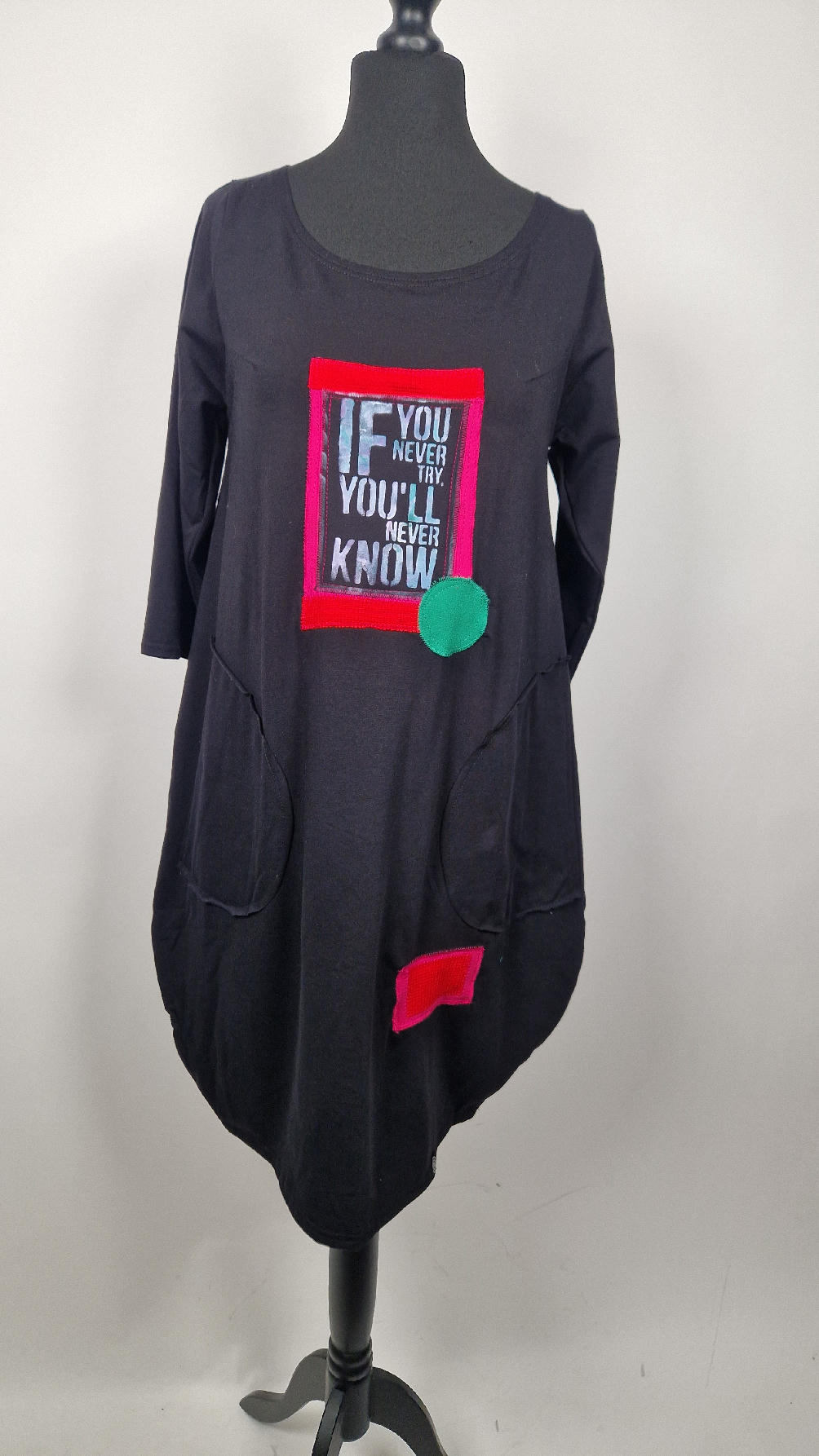 Czarna sukienka z rękawem 3/4 z unikatową aplikacją, uszyta z miękkiej bawełny typu jersey w kształcie, który pięknie ubierze Twoją sylwetkę, podkreślając to co trzeba lekko i luźno opływając pas i biodra; Każda aplikacja , każdy kolaż jest wykonany ręcznie, z różnych tkanin, koronek i cosiów. Każda sukienka jest niepowtarzalna, bo każdy kolaż jest inny.