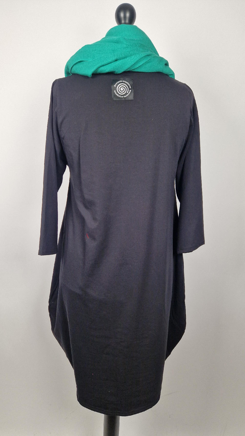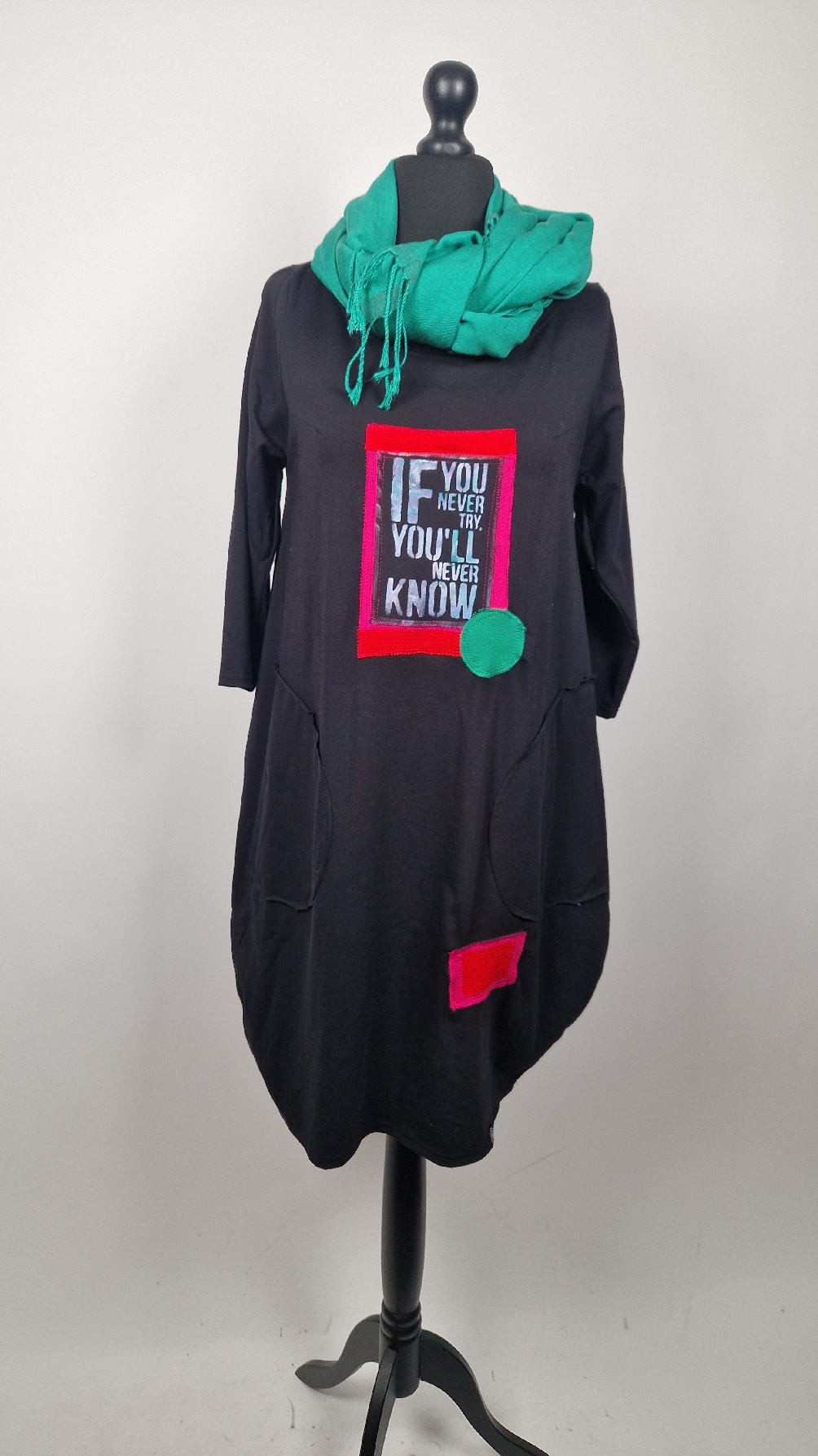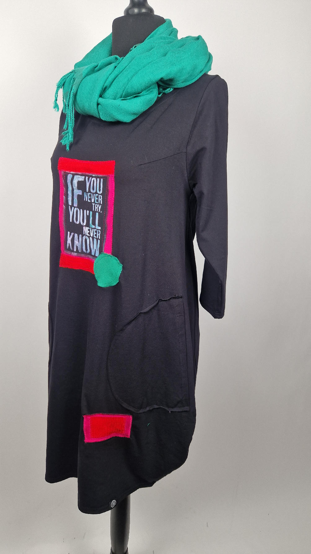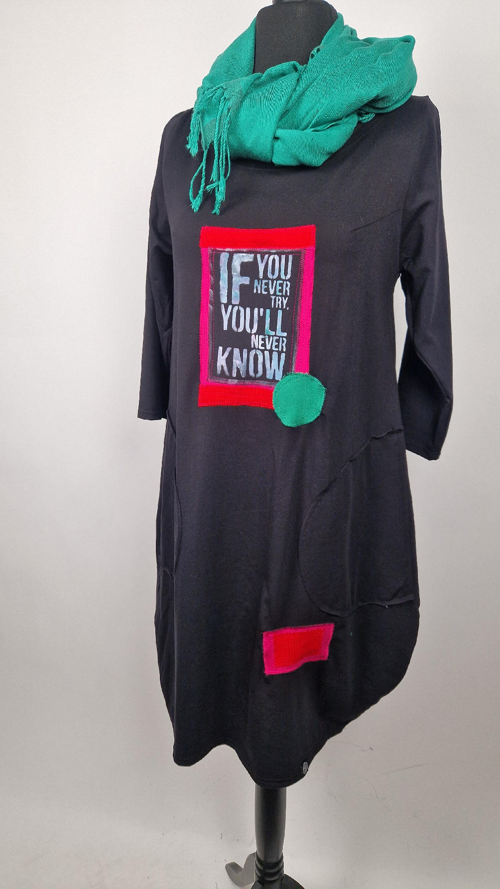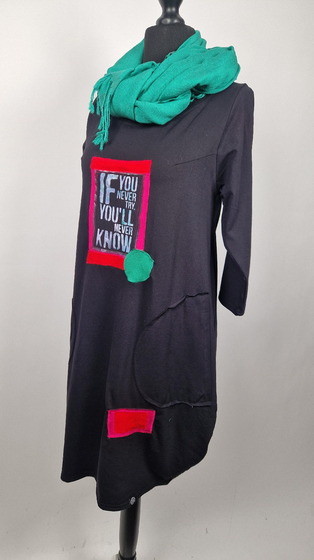 Czarna sukienka z rękawem 3/4 z unikatową aplikacją, uszyta z miękkiej bawełny typu jersey w kształcie, który pięknie ubierze Twoją sylwetkę, podkreślając to co trzeba lekko i luźno opływając pas i biodra; Każda aplikacja , każdy kolaż jest wykonany ręcznie, z różnych tkanin, koronek i cosiów. Każda sukienka jest niepowtarzalna, bo każdy kolaż jest inny.