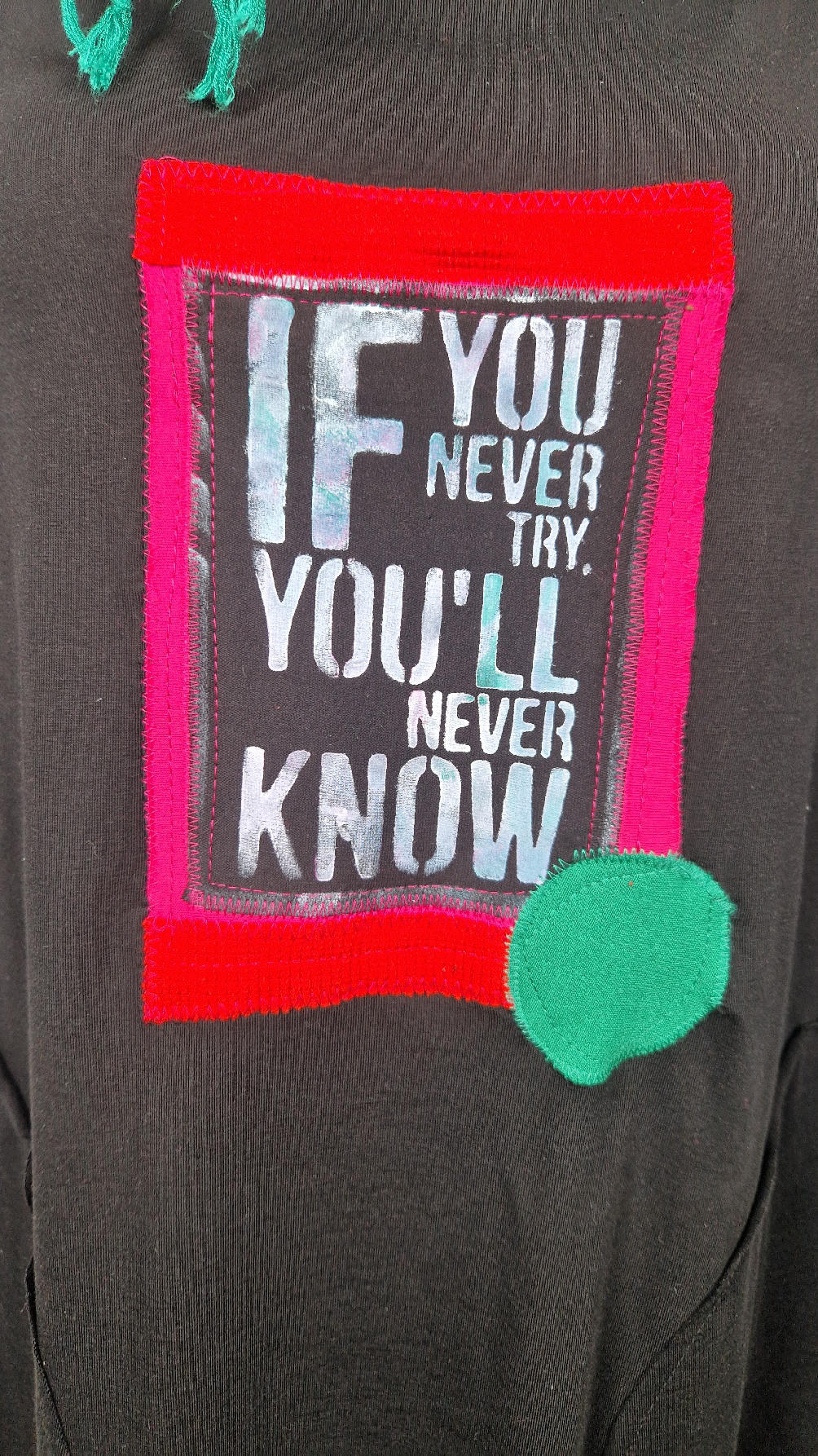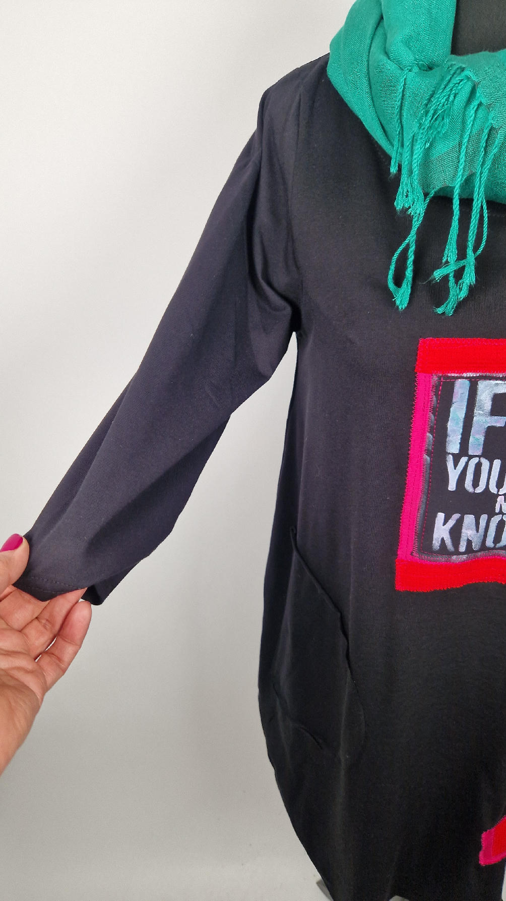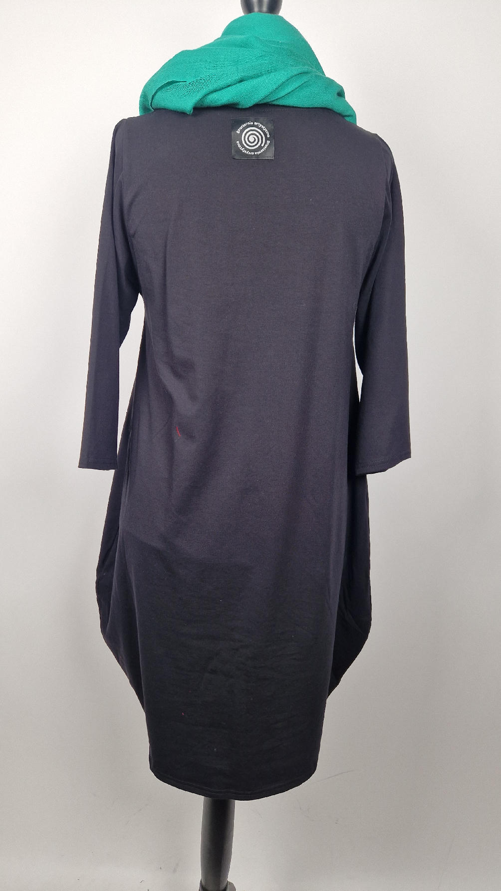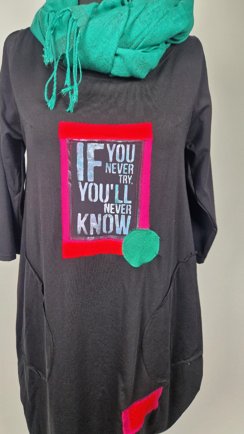 Czarna sukienka z rękawem 3/4 z unikatową aplikacją, uszyta z miękkiej bawełny typu jersey w kształcie, który pięknie ubierze Twoją sylwetkę, podkreślając to co trzeba lekko i luźno opływając pas i biodra; Każda aplikacja , każdy kolaż jest wykonany ręcznie, z różnych tkanin, koronek i cosiów. Każda sukienka jest niepowtarzalna, bo każdy kolaż jest inny.