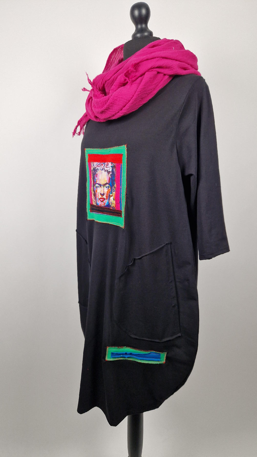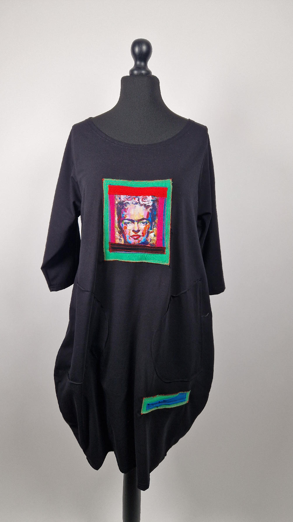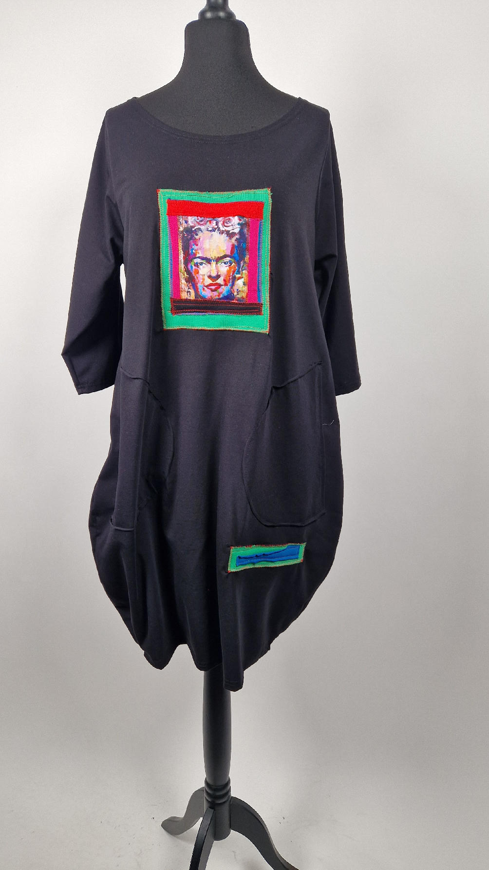 Bawełniana sukienka, w kształcie, który pięknie ubierze Twoją sylwetkę, podkreślając to co trzeba, lekko i luźno opływając pas i biodra;  z rękawem 3/4, z dużymi , wygodnymi kieszeniami, w których możesz schować dłonie. Z przodu duża aplikacja, kolaż z portretem Fridy w ciepłych odcieniach. Każdy kolaż jest jeden i nie będzie drugiej identycznej sukienki.