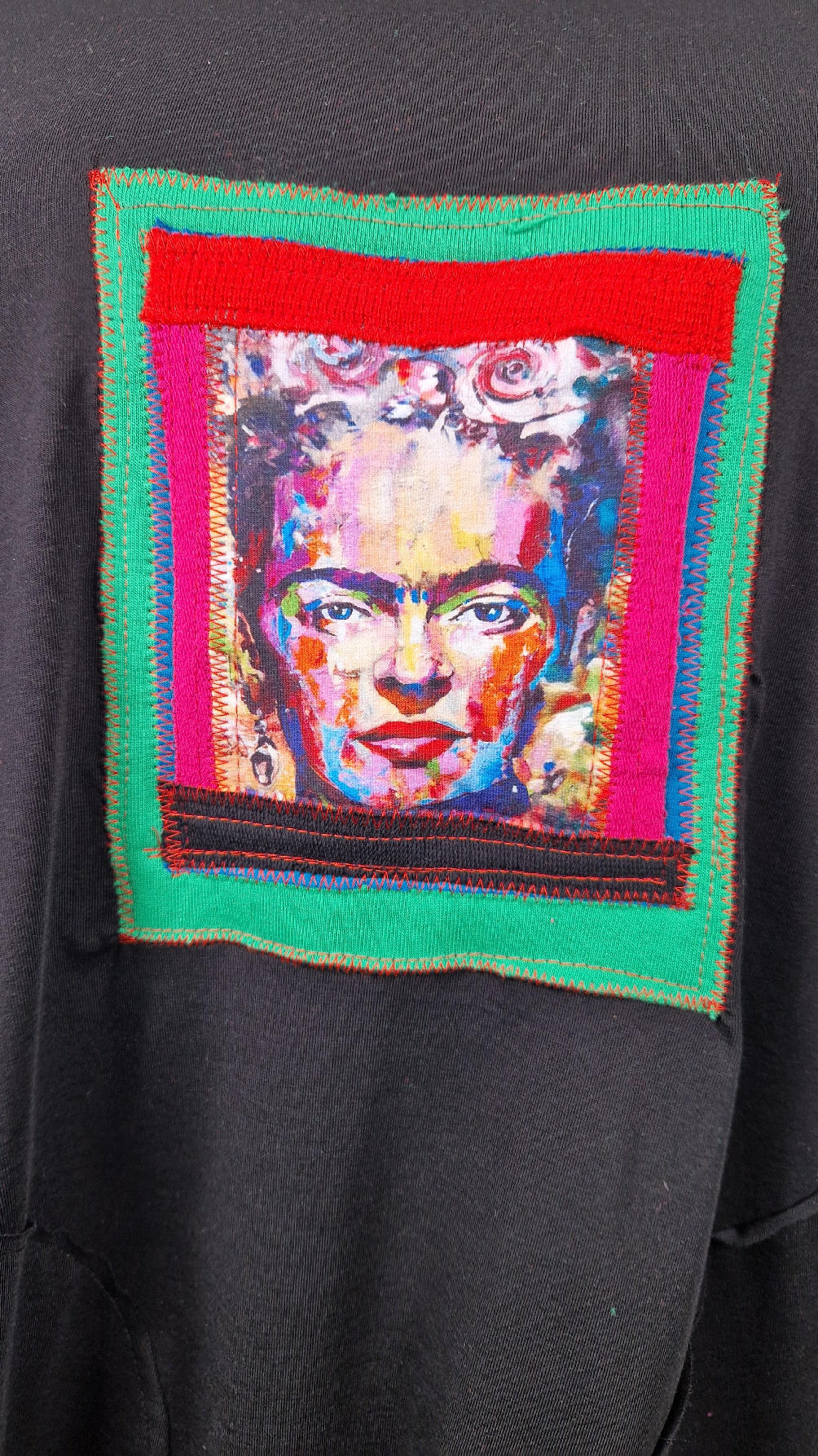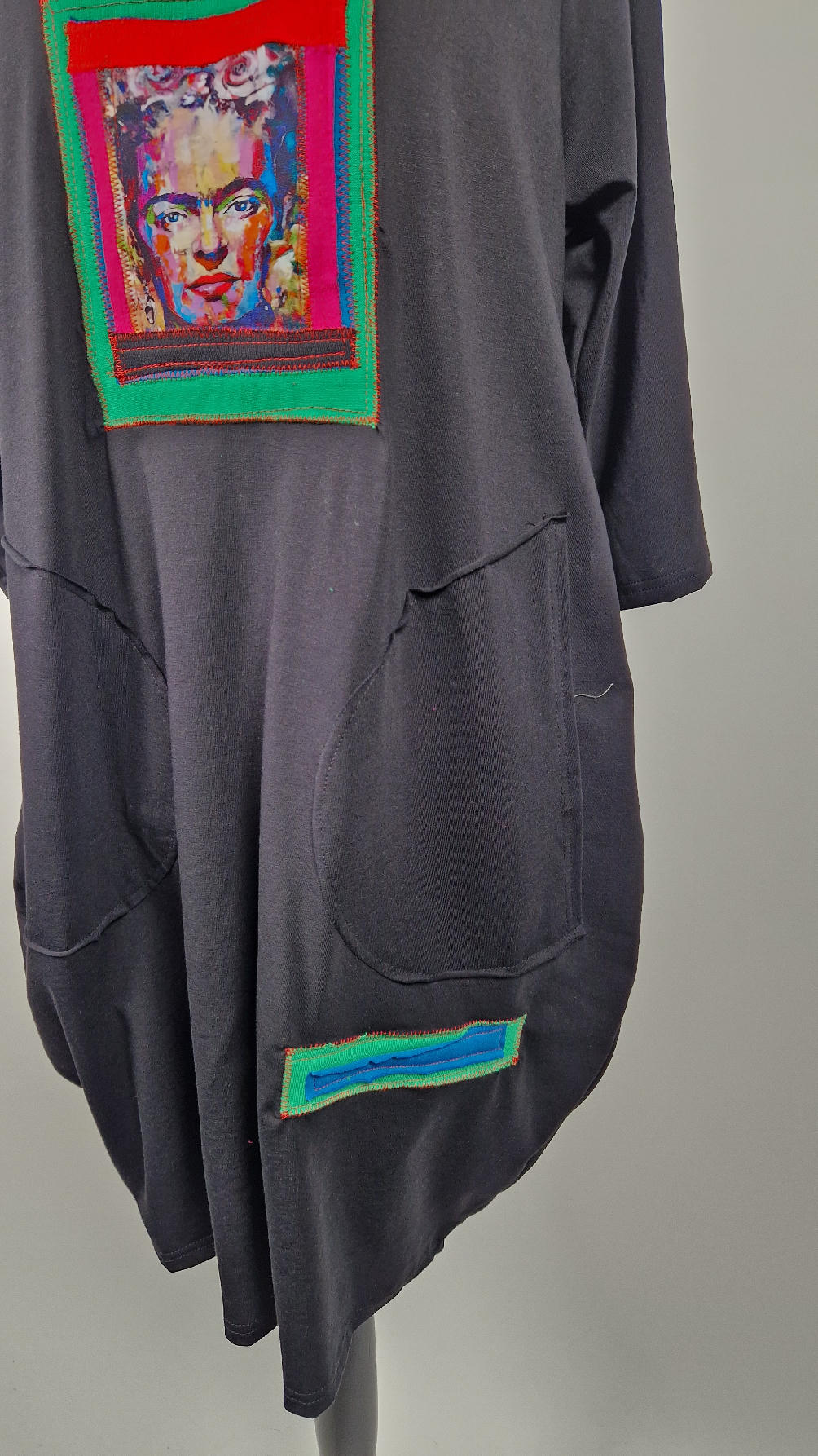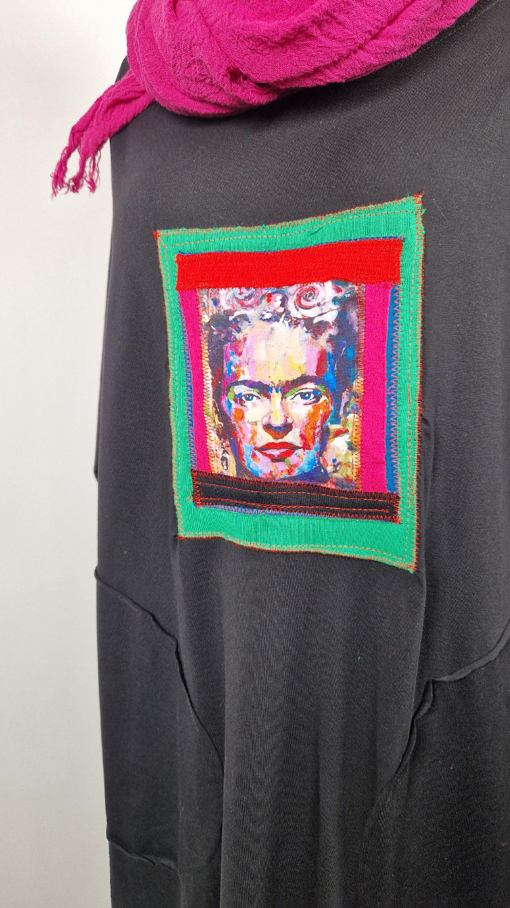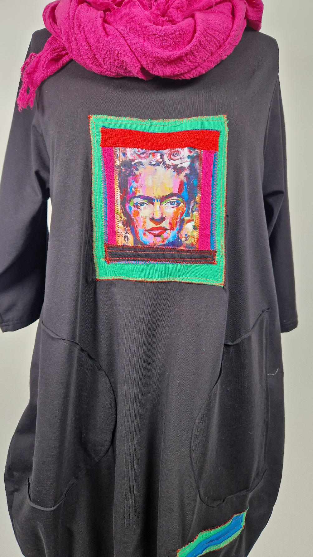 Bawełniana sukienka, w kształcie, który pięknie ubierze Twoją sylwetkę, podkreślając to co trzeba, lekko i luźno opływając pas i biodra;  z rękawem 3/4, z dużymi , wygodnymi kieszeniami, w których możesz schować dłonie. Z przodu duża aplikacja, kolaż z portretem Fridy w ciepłych odcieniach. Każdy kolaż jest jeden i nie będzie drugiej identycznej sukienki.