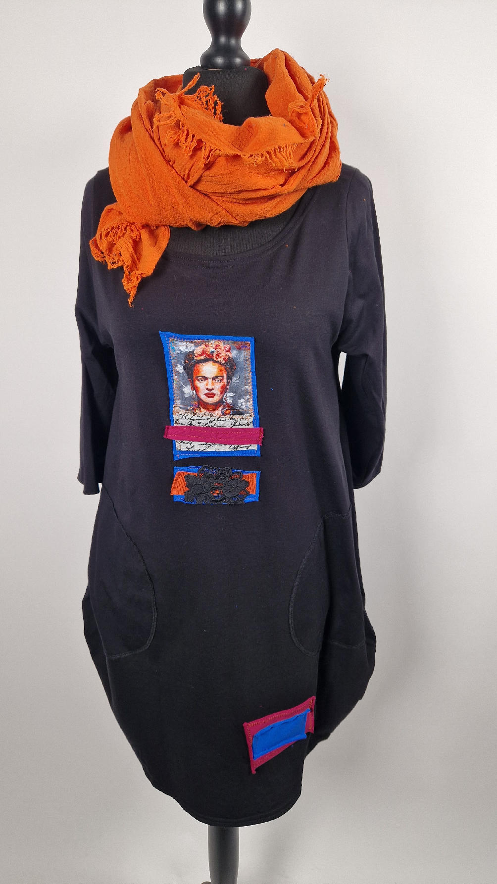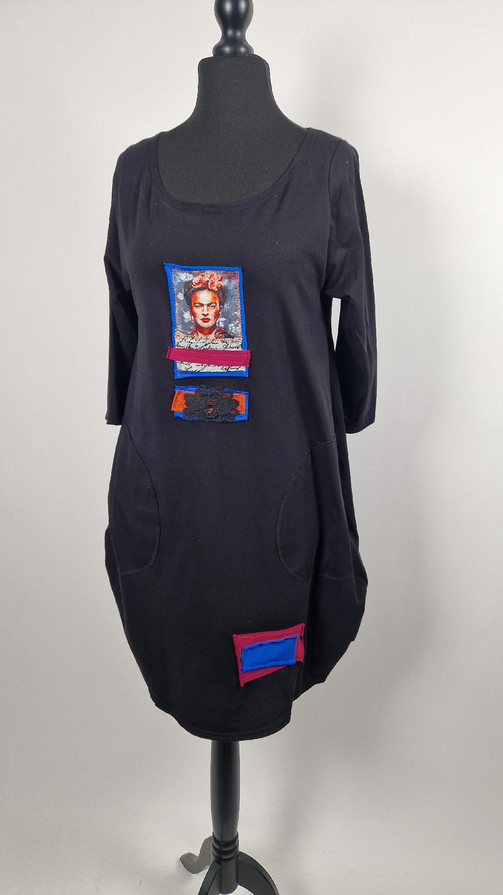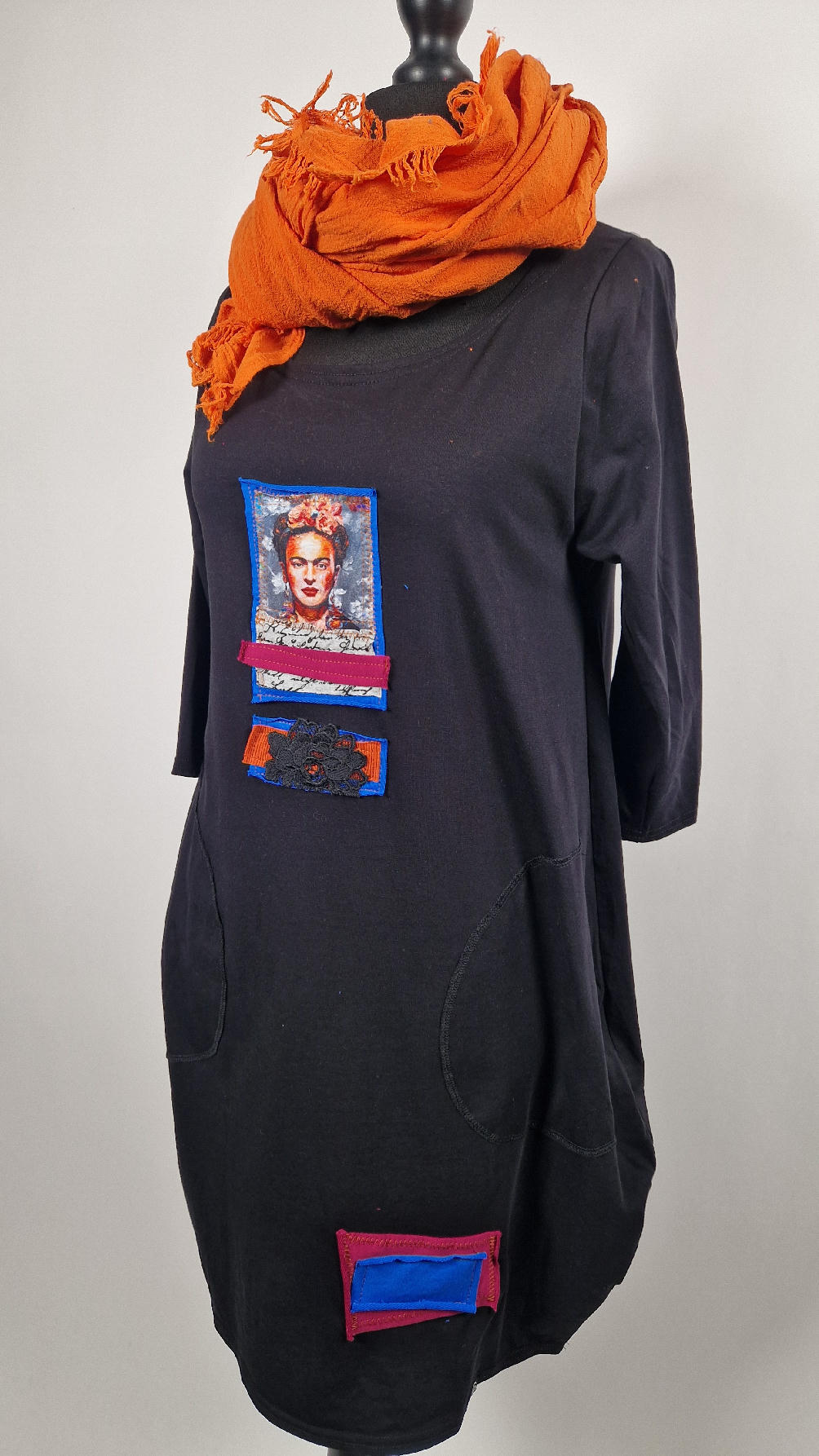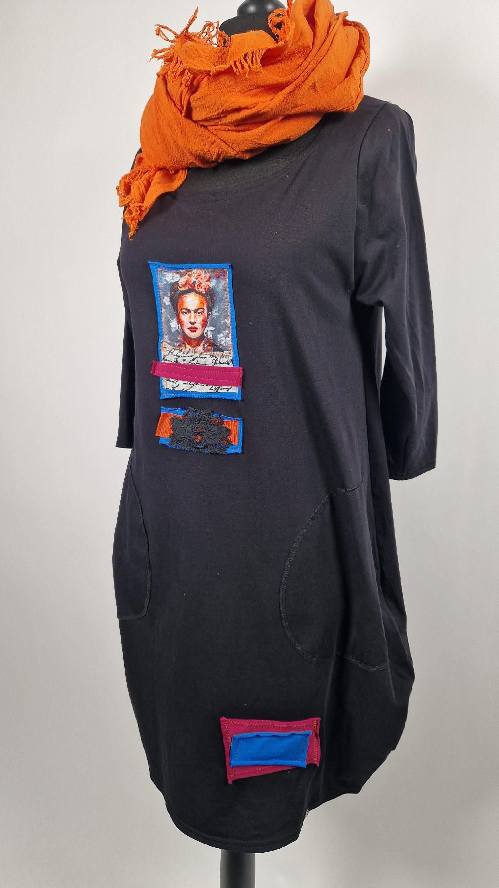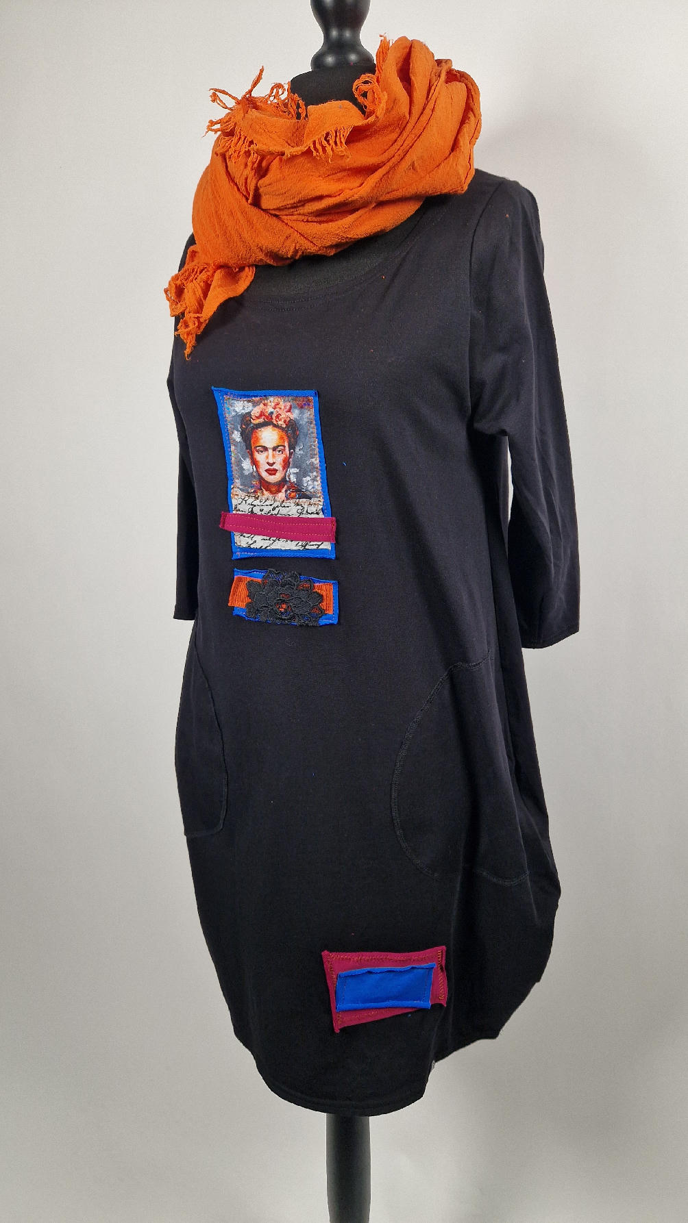 Czarna sukienka z rękawem 3/4 z unikatową aplikacją, z portretem Fridy, uszyta z miękkiej bawełny typu jersey w kształcie, który pięknie ubierze Twoją sylwetkę, podkreślając to co trzeba lekko i luźno opływając pas i biodra; Każda aplikacja , każdy kolaż jest wykonany ręcznie, z różnych tkanin, koronek i cosiów. Każda sukienka jest niepowtarzalna, bo każdy kolaż jest inny.