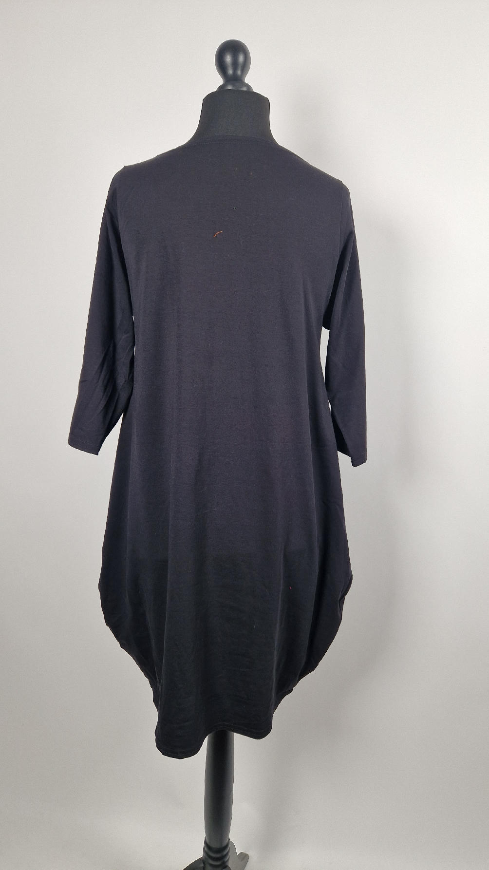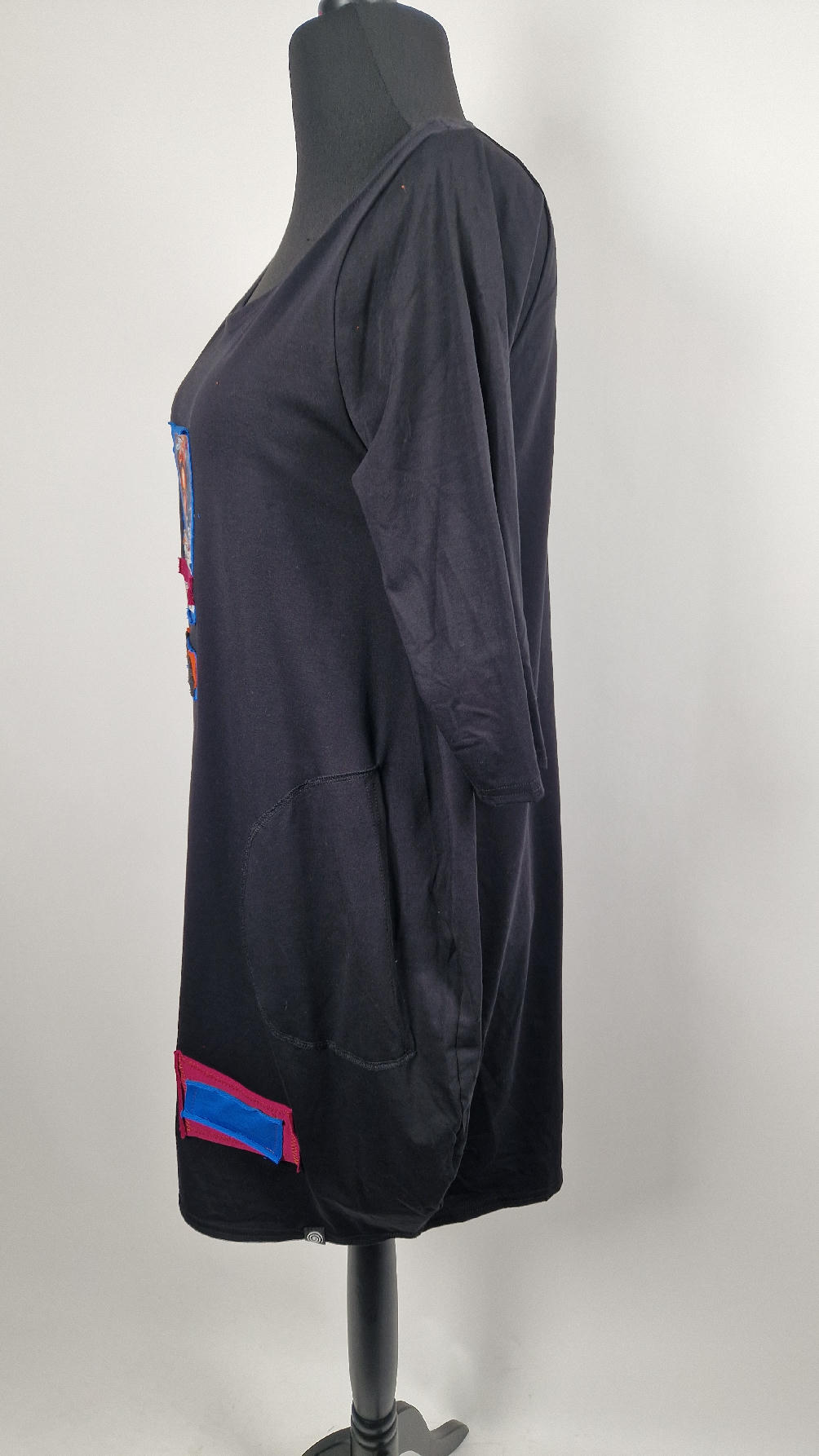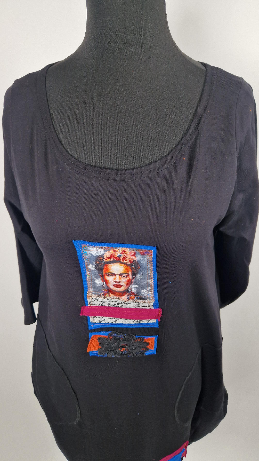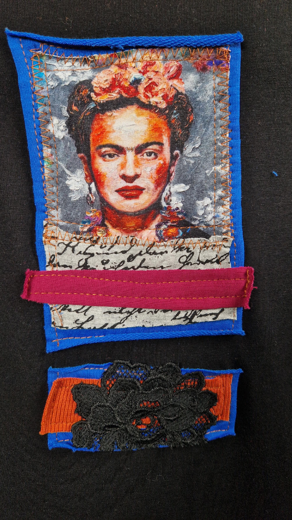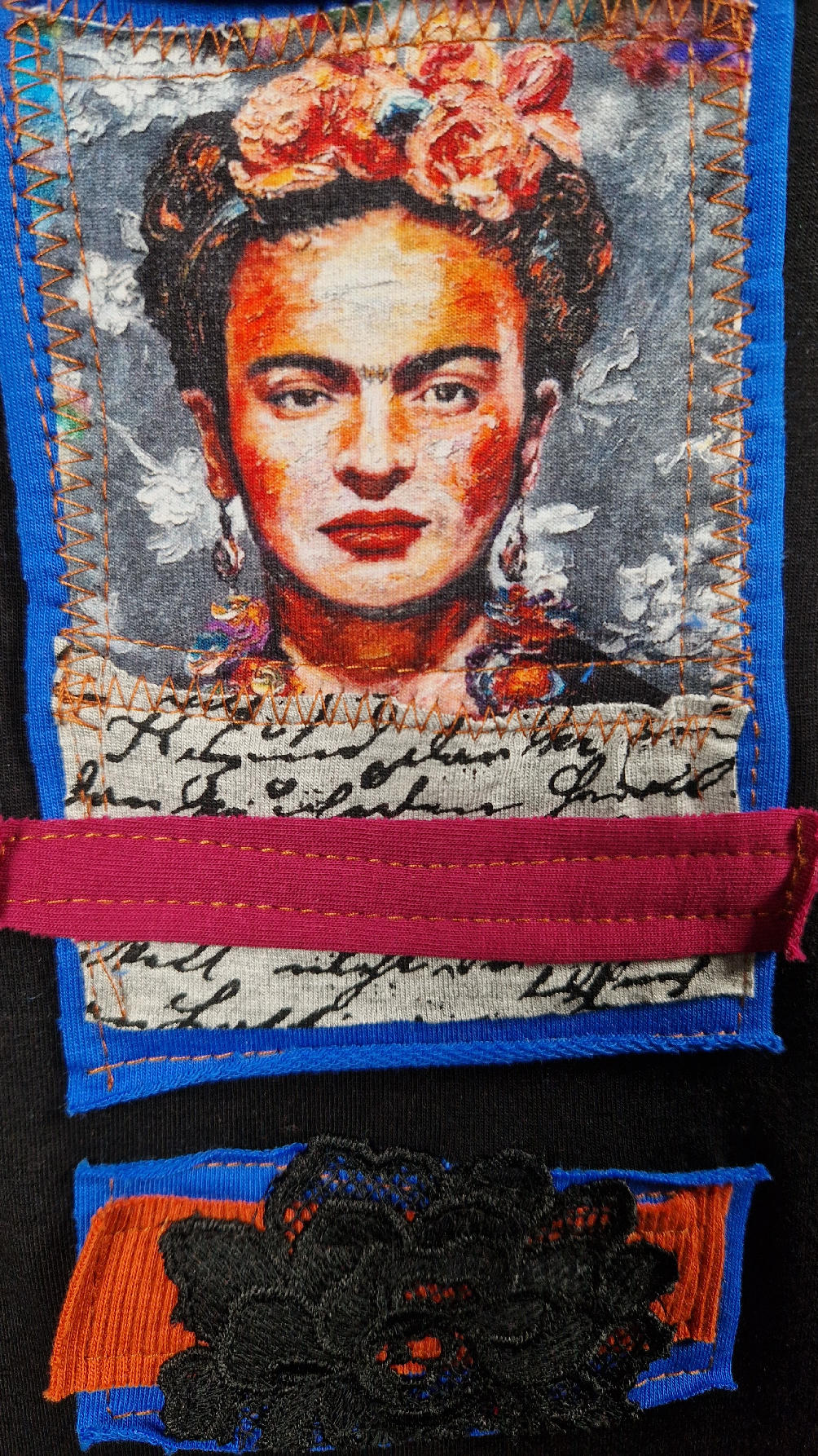Czarna sukienka z rękawem 3/4 z unikatową aplikacją, z portretem Fridy, uszyta z miękkiej bawełny typu jersey w kształcie, który pięknie ubierze Twoją sylwetkę, podkreślając to co trzeba lekko i luźno opływając pas i biodra; Każda aplikacja , każdy kolaż jest wykonany ręcznie, z różnych tkanin, koronek i cosiów. Każda sukienka jest niepowtarzalna, bo każdy kolaż jest inny.