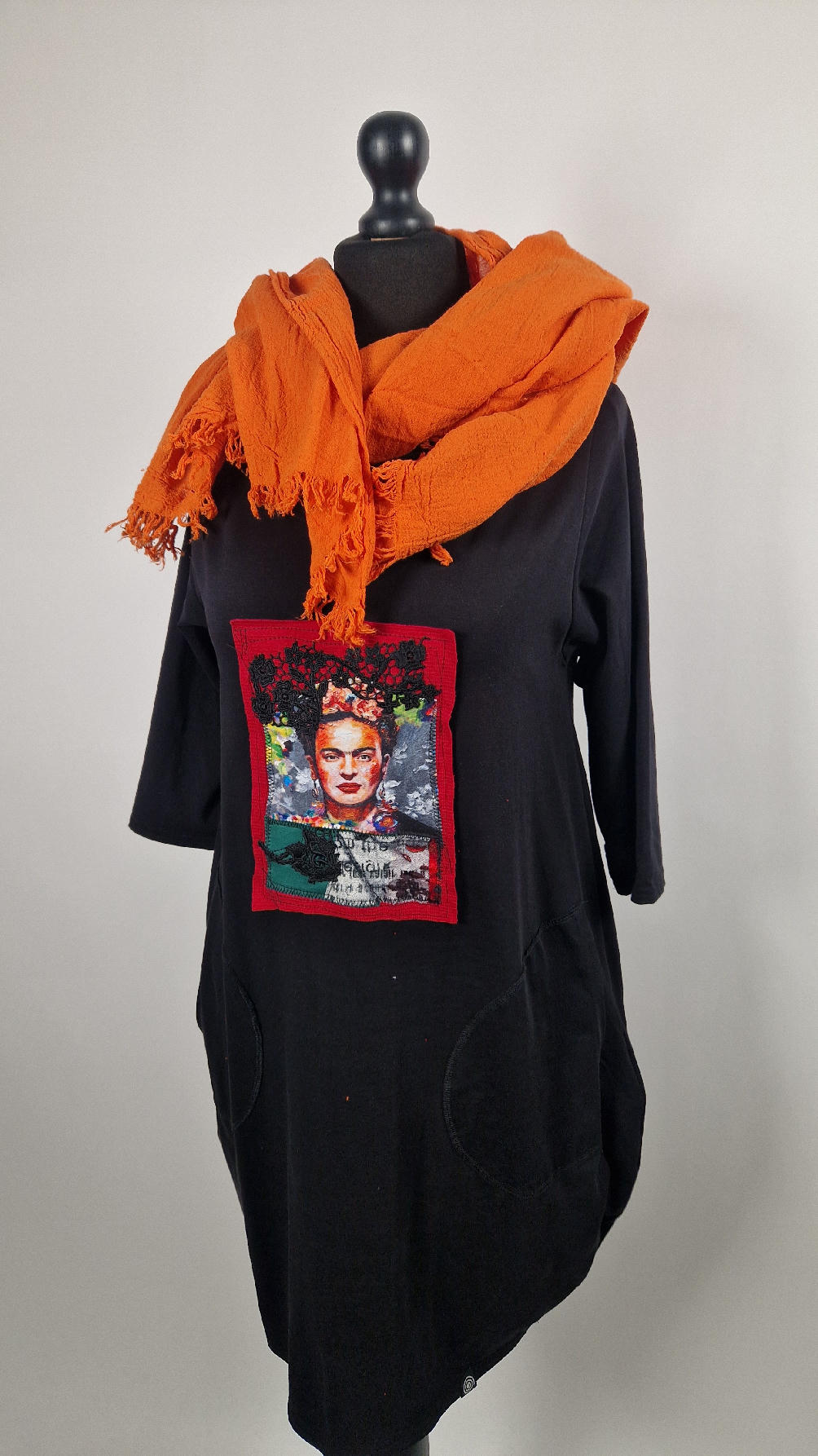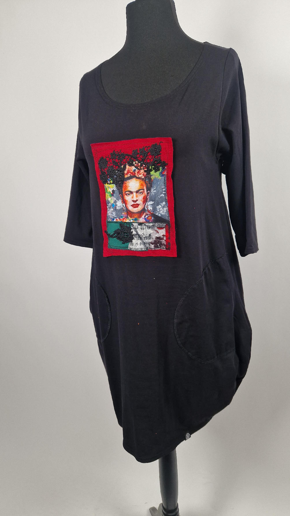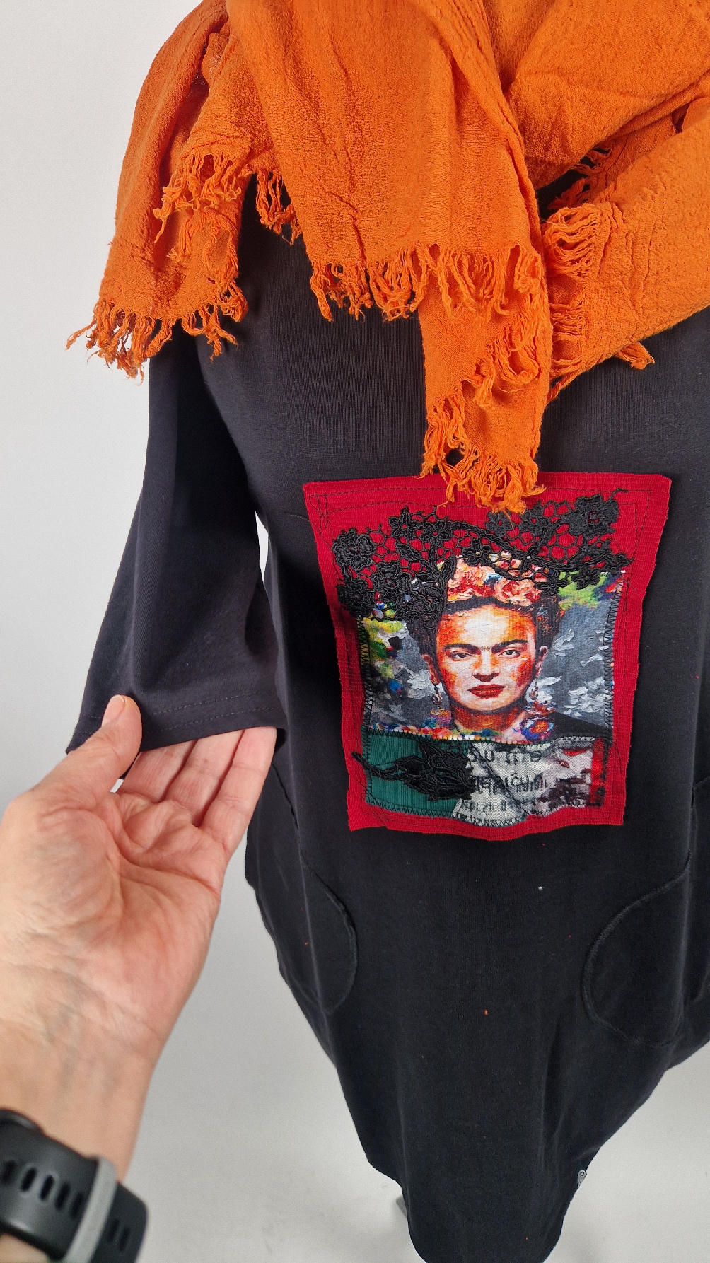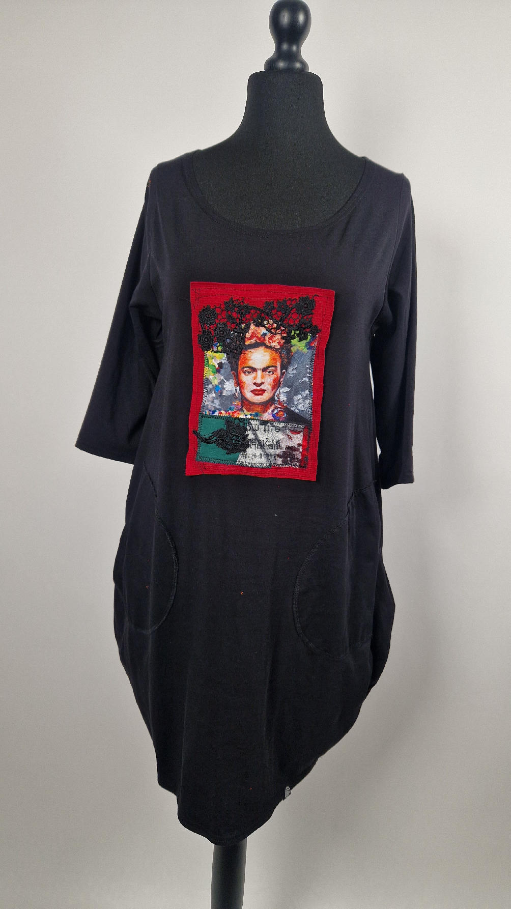 Czarna sukienka z rękawem 3/4 z unikatową aplikacją, z portretem Fridy, uszyta z miękkiej bawełny typu jersey w kształcie, który pięknie ubierze Twoją sylwetkę, podkreślając to co trzeba lekko i luźno opływając pas i biodra; Każda aplikacja , każdy kolaż jest wykonany ręcznie, z różnych tkanin, koronek i cosiów. Każda sukienka jest niepowtarzalna, bo każdy kolaż jest inny.