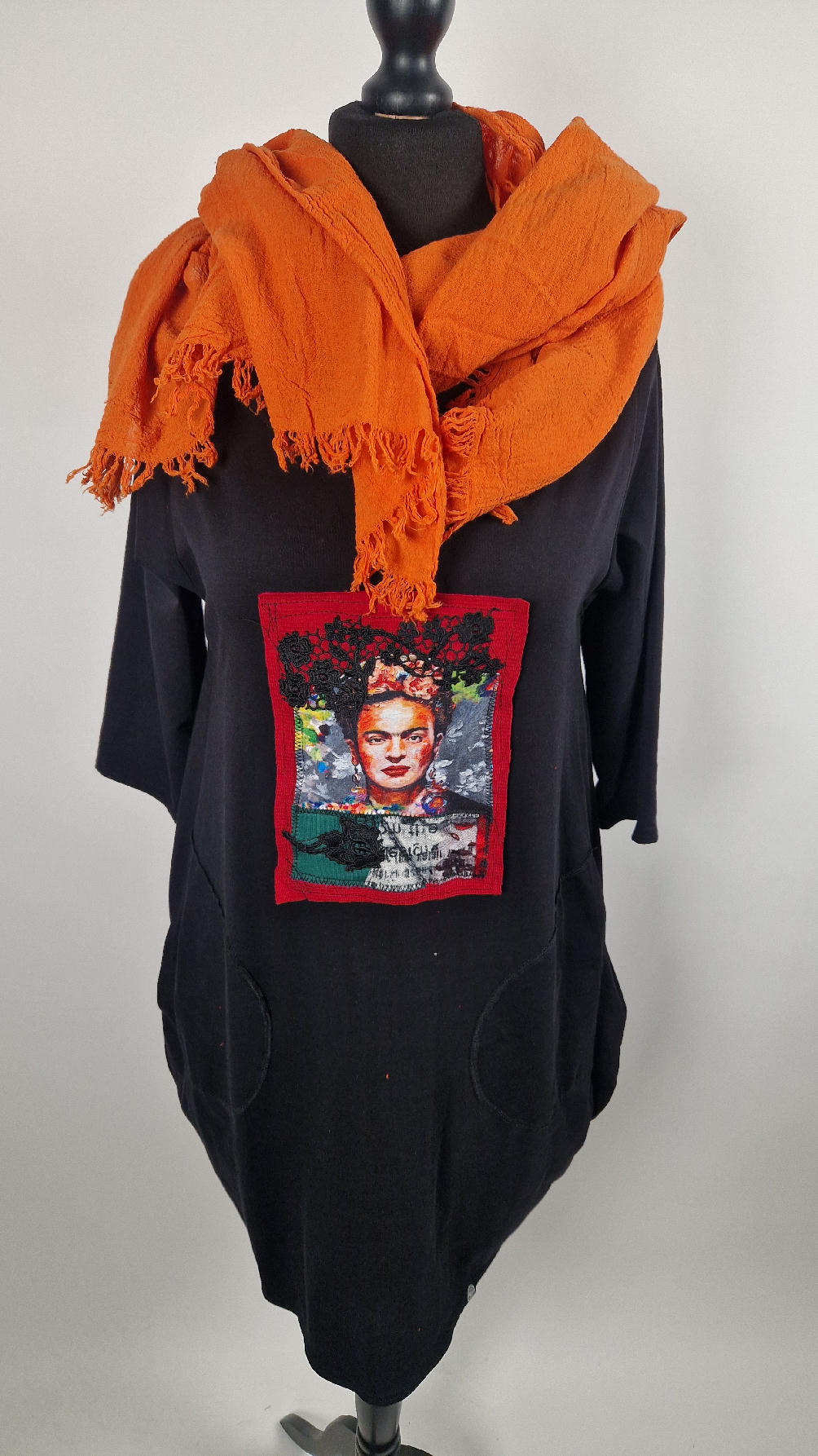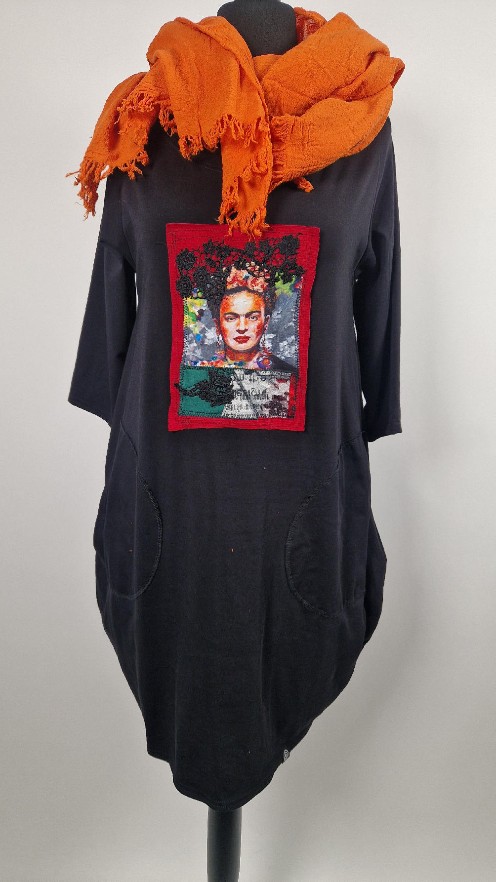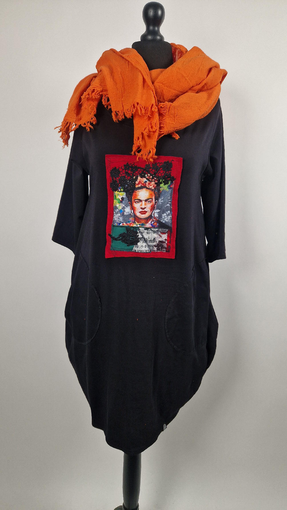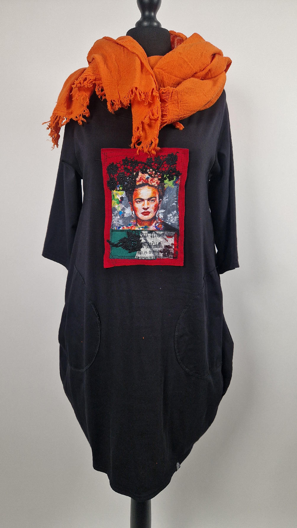 Czarna sukienka z rękawem 3/4 z unikatową aplikacją, z portretem Fridy, uszyta z miękkiej bawełny typu jersey w kształcie, który pięknie ubierze Twoją sylwetkę, podkreślając to co trzeba lekko i luźno opływając pas i biodra; Każda aplikacja , każdy kolaż jest wykonany ręcznie, z różnych tkanin, koronek i cosiów. Każda sukienka jest niepowtarzalna, bo każdy kolaż jest inny.