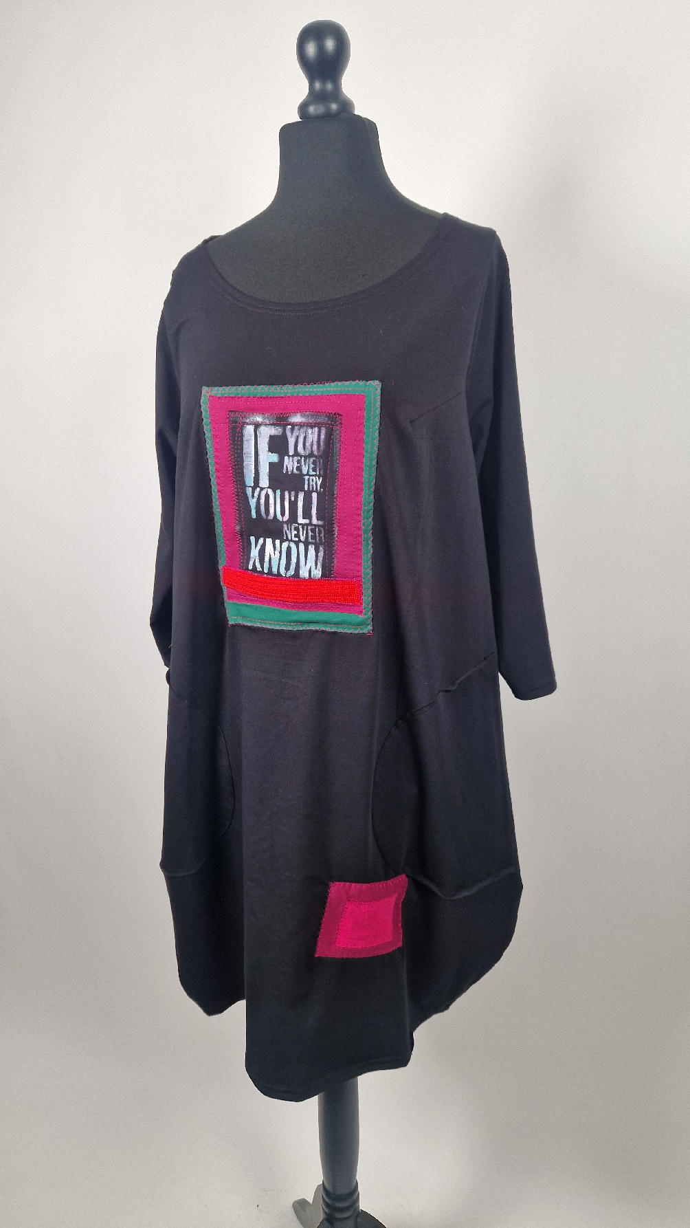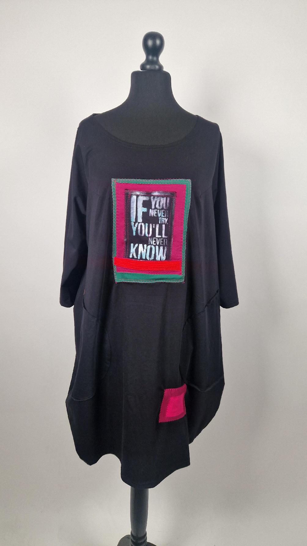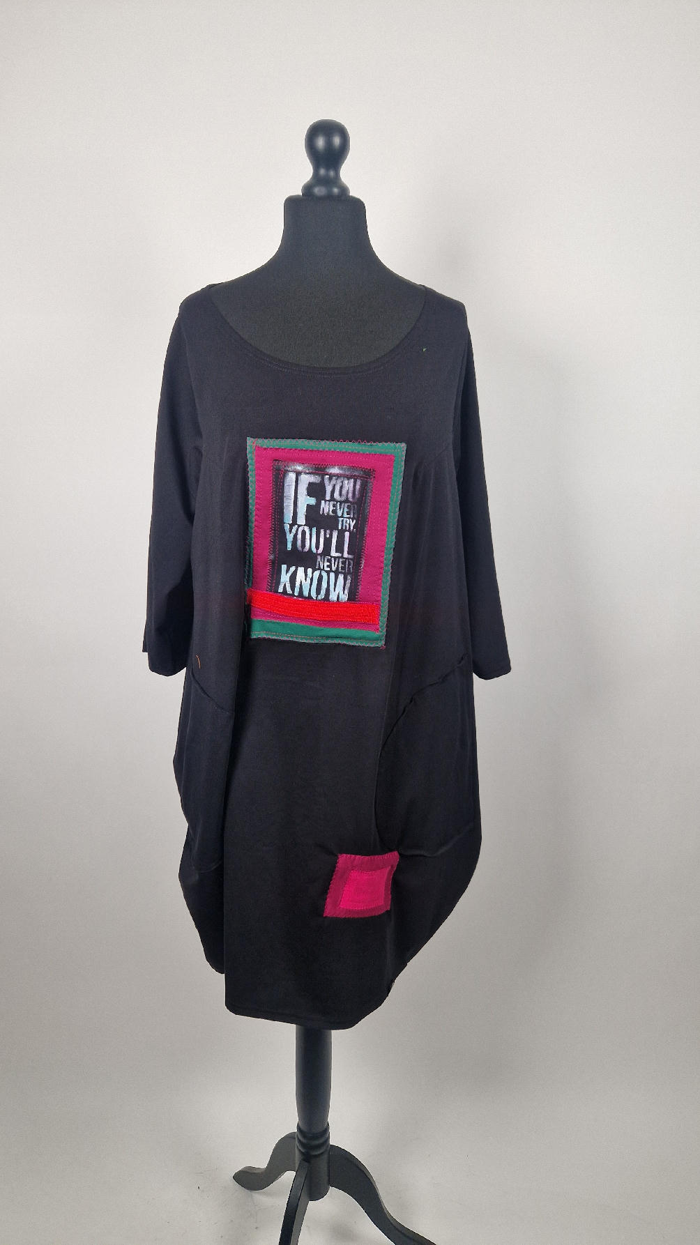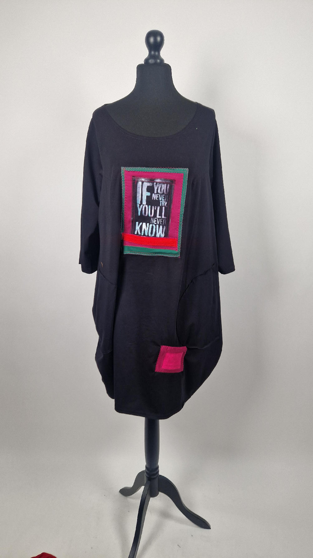 Czarna sukienka uszyta z bawełny typu jersey, uniwersalna i całoroczna, z rękawem 3/4…z przodu aplikacja-kolaż tkanin, unikatowy i jedyny dla każdej sukienki…Twoja sukienka jest wyjątkowa…poza tym bardzo wygodna i zgrabna i pokochasz ją od pierwszego zobaczenia.