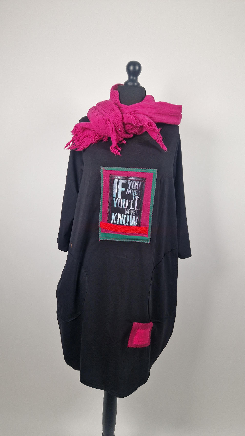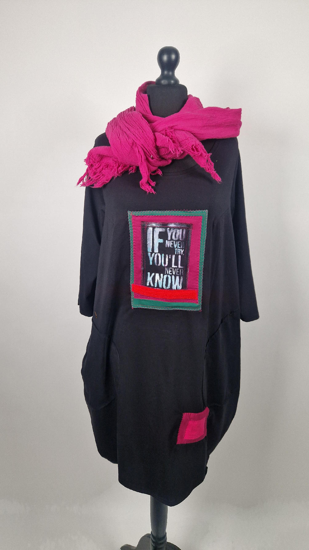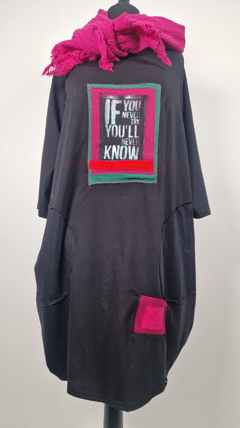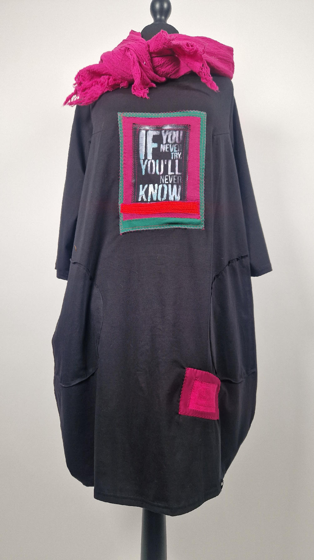 Czarna sukienka uszyta z bawełny typu jersey, uniwersalna i całoroczna, z rękawem 3/4…z przodu aplikacja-kolaż tkanin, unikatowy i jedyny dla każdej sukienki…Twoja sukienka jest wyjątkowa…poza tym bardzo wygodna i zgrabna i pokochasz ją od pierwszego zobaczenia.