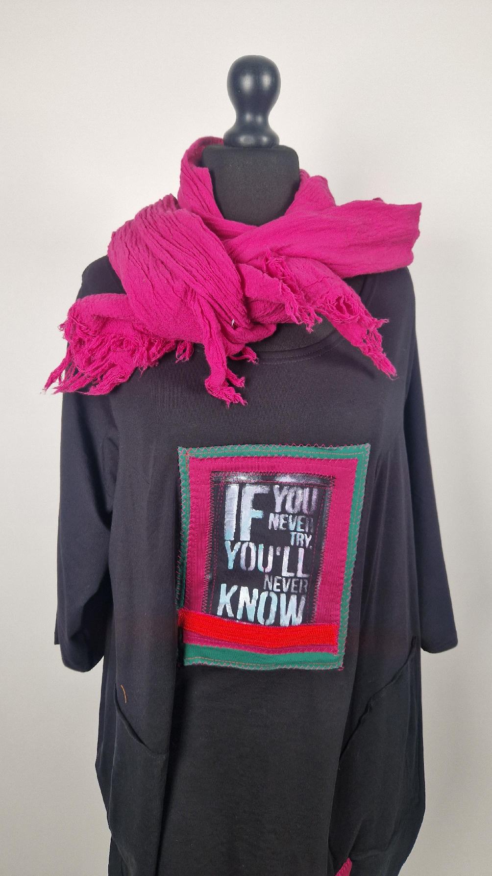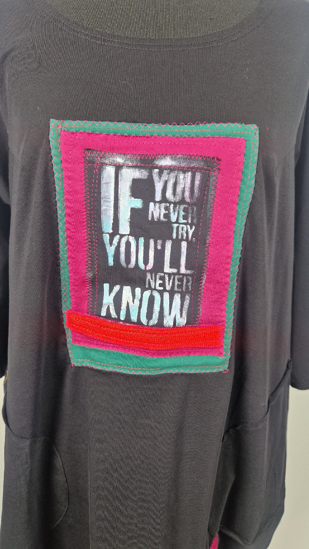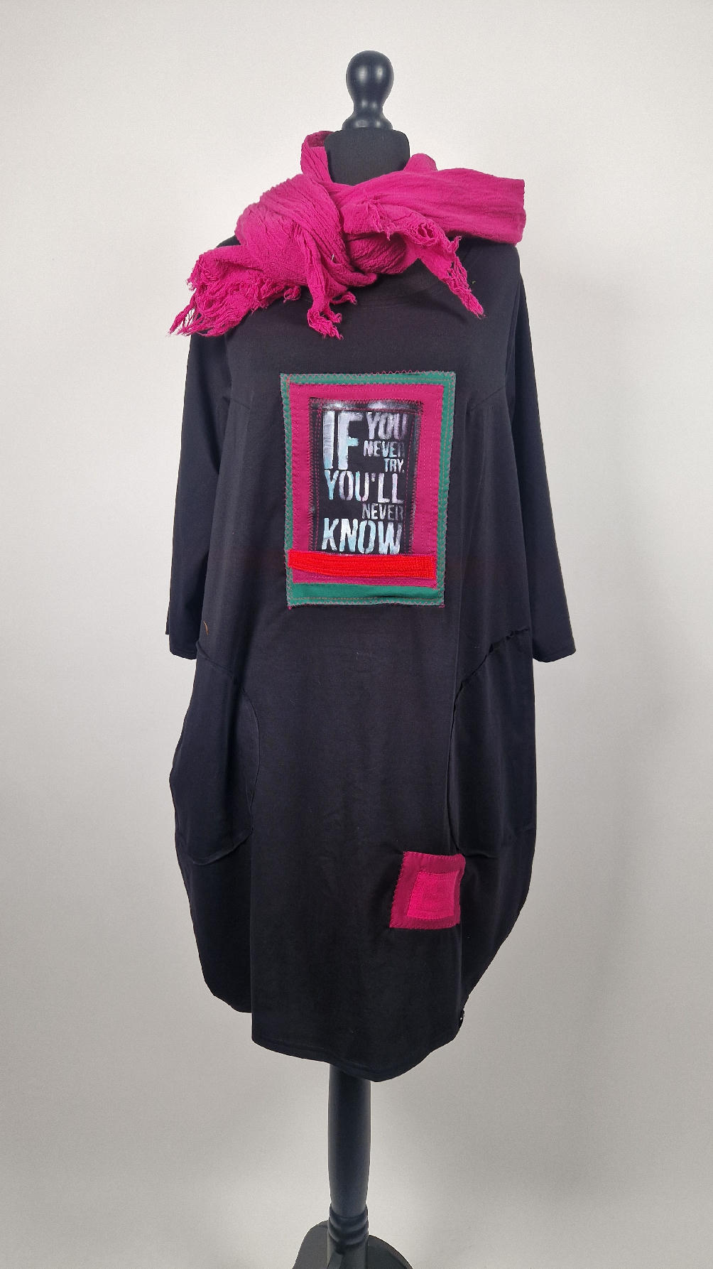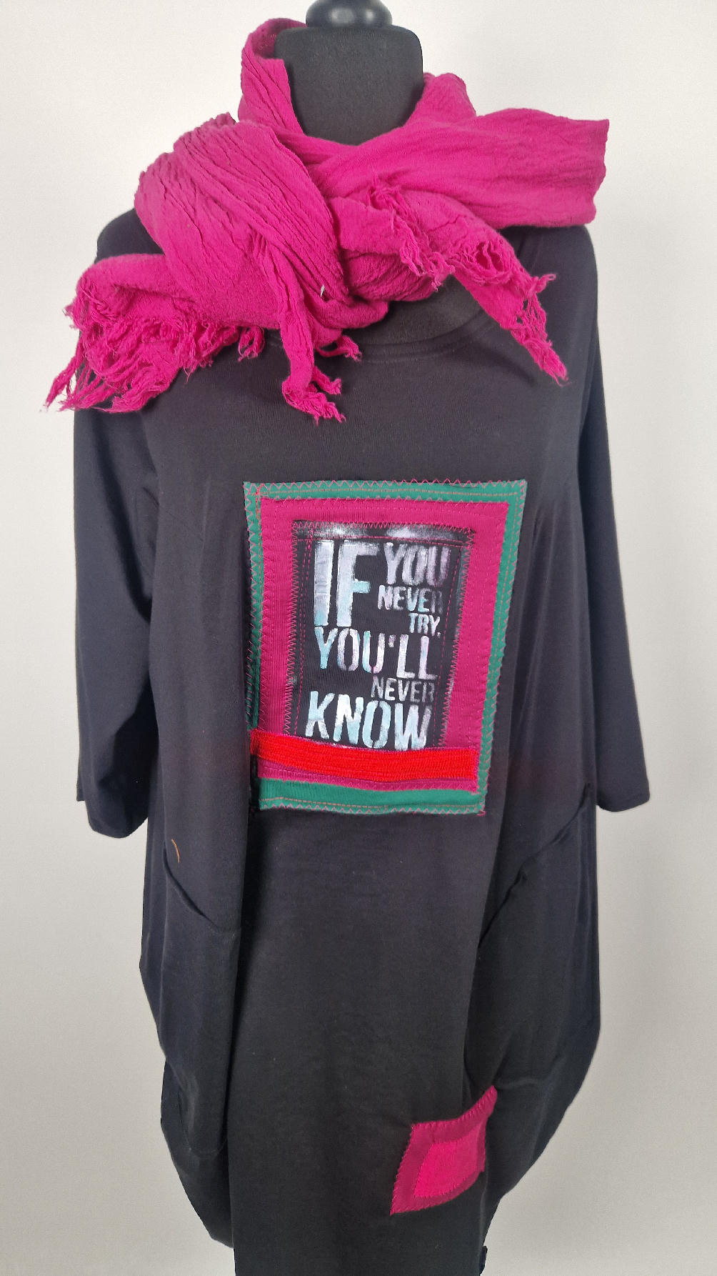 Czarna sukienka uszyta z bawełny typu jersey, uniwersalna i całoroczna, z rękawem 3/4…z przodu aplikacja-kolaż tkanin, unikatowy i jedyny dla każdej sukienki…Twoja sukienka jest wyjątkowa…poza tym bardzo wygodna i zgrabna i pokochasz ją od pierwszego zobaczenia.