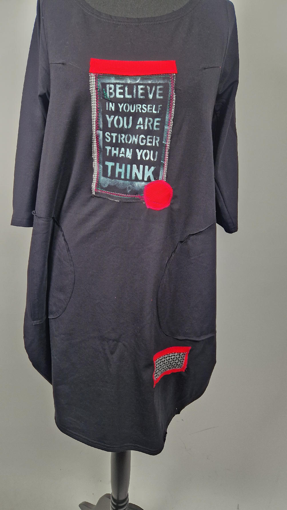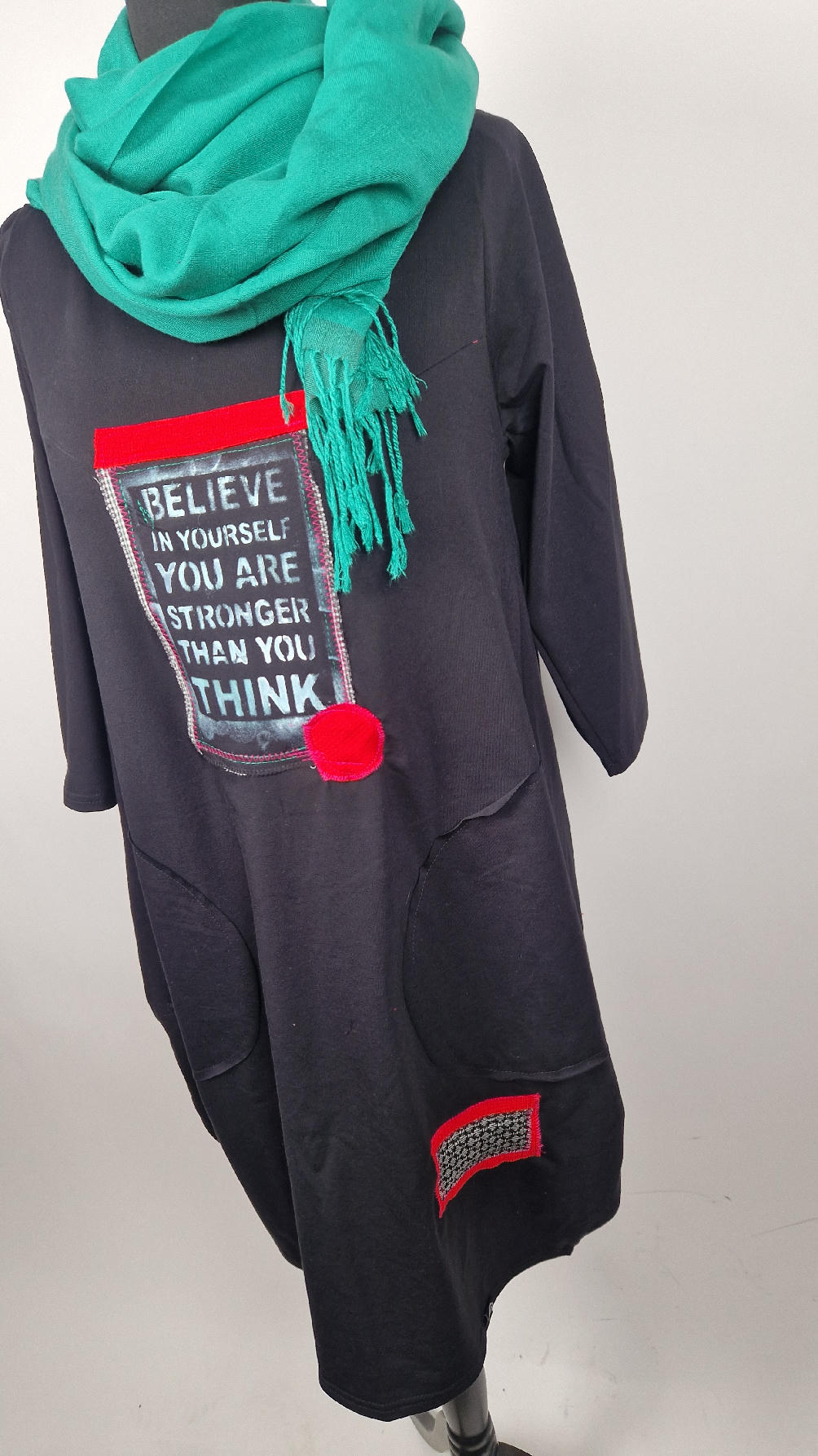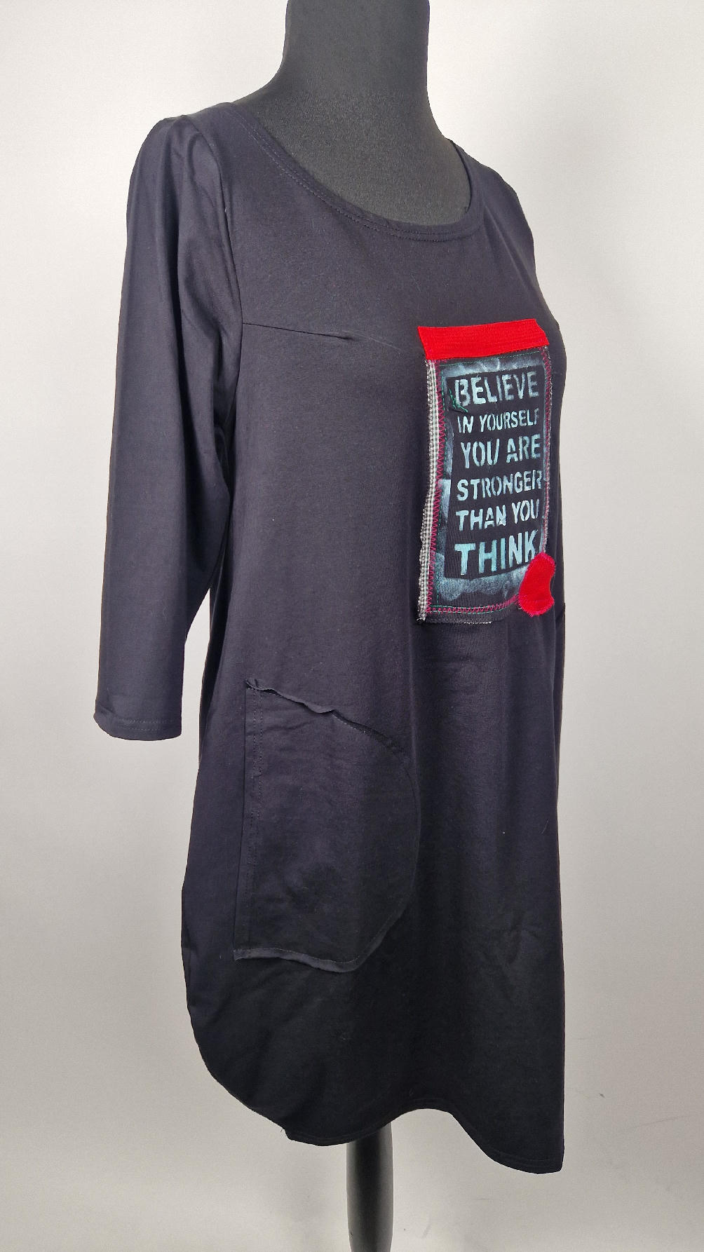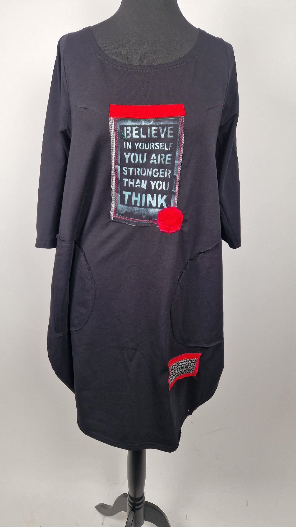 Czarna sukienka z rękawem 3/4 z unikatową aplikacją, uszyta z miękkiej bawełny typu jersey w kształcie, który pięknie ubierze Twoją sylwetkę, podkreślając to co trzeba lekko i luźno opływając pas i biodra; Każda aplikacja , każdy kolaż jest wykonany ręcznie, z różnych tkanin, koronek i cosiów. Każda sukienka jest niepowtarzalna, bo każdy kolaż jest inny.