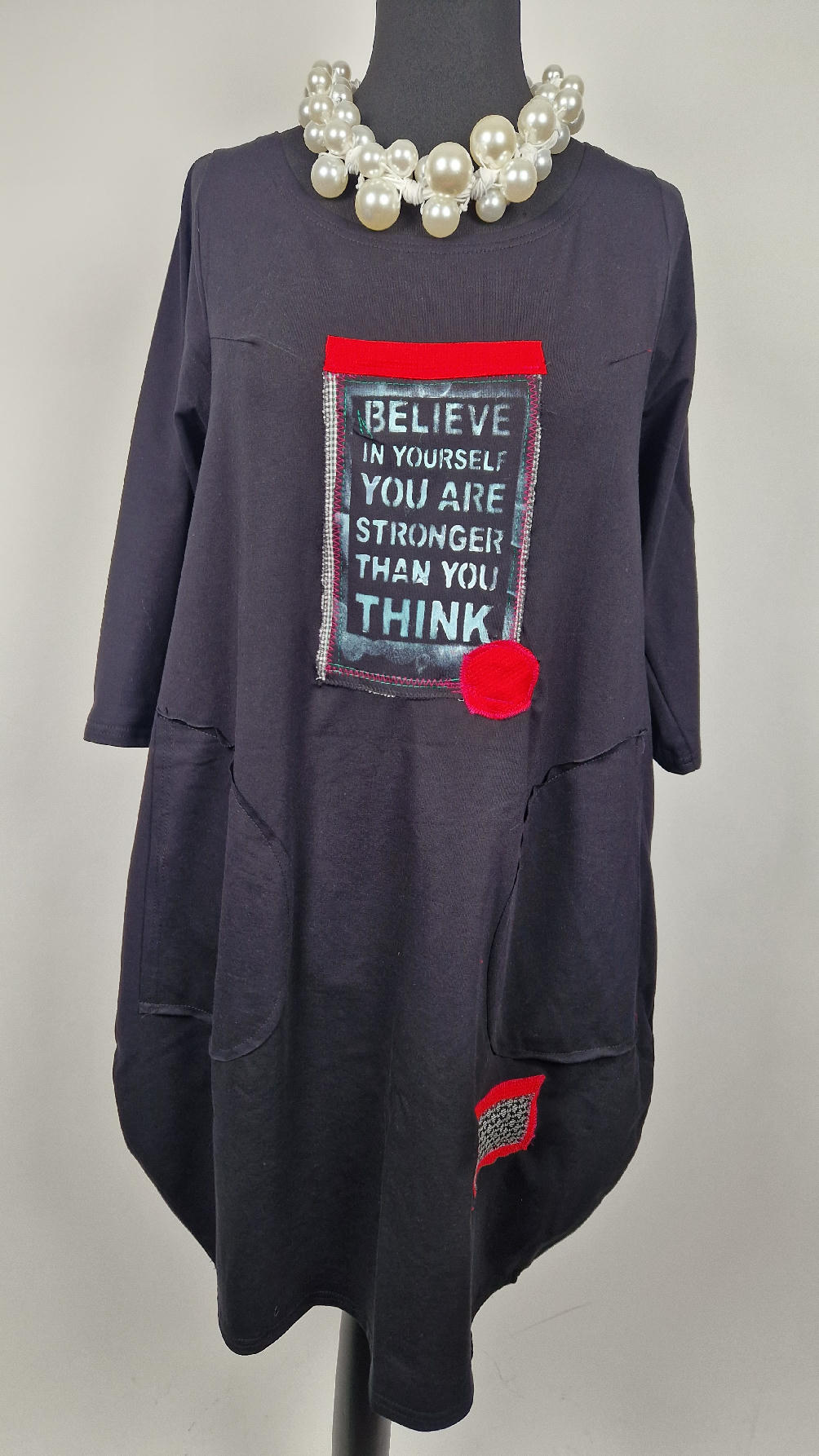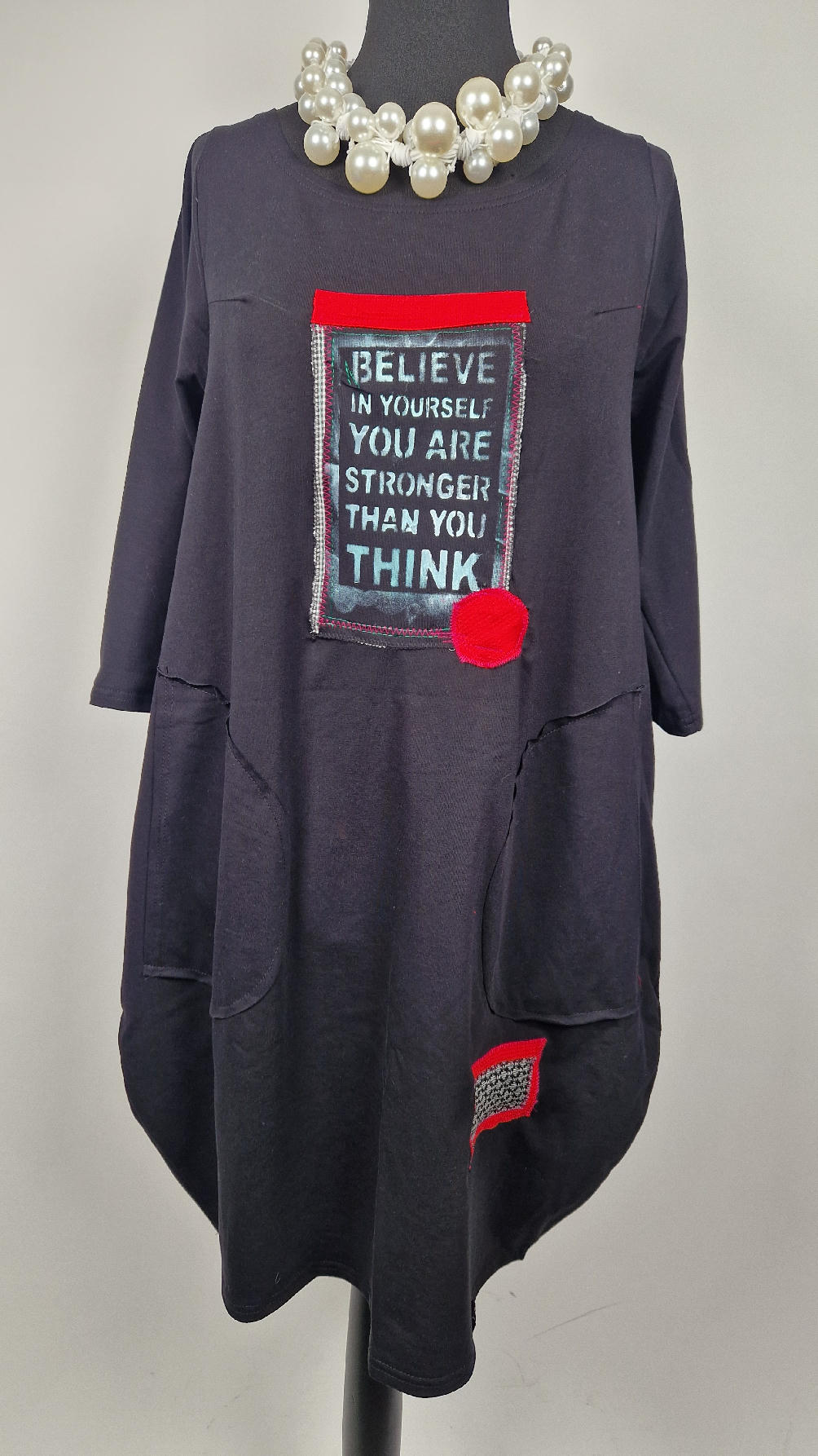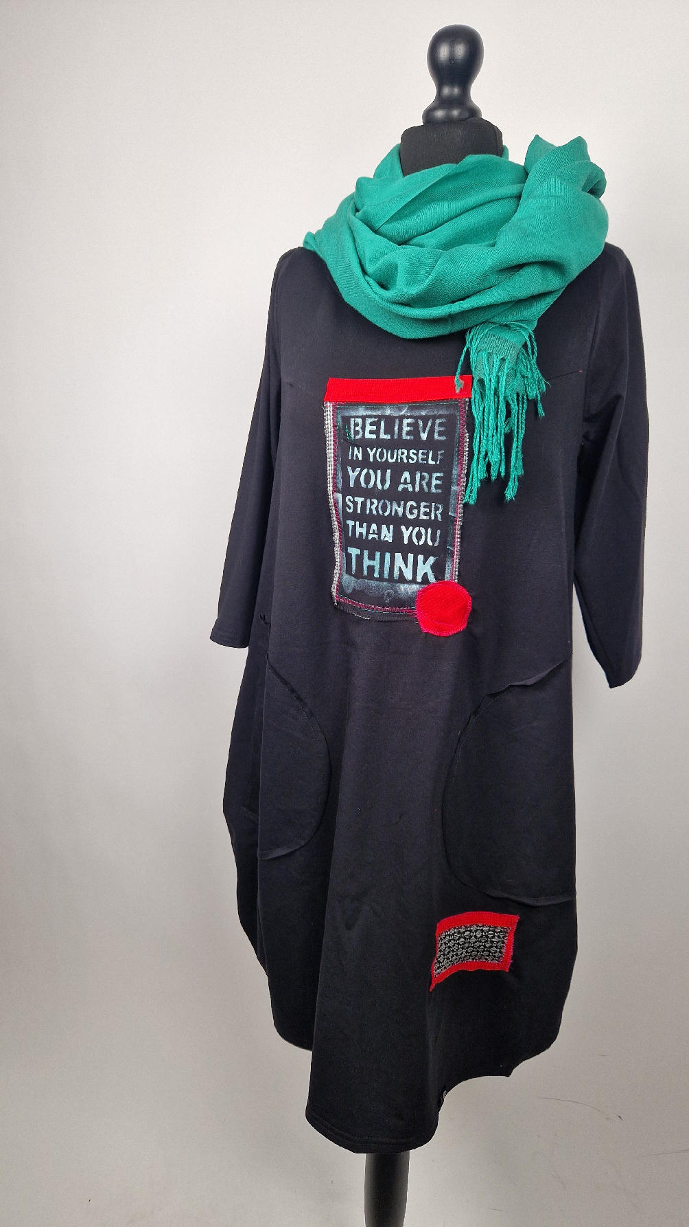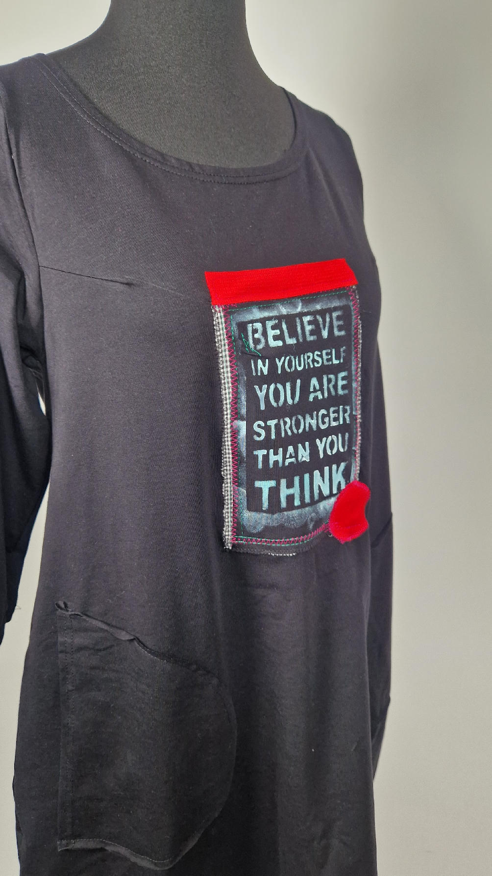 Czarna sukienka z rękawem 3/4 z unikatową aplikacją, uszyta z miękkiej bawełny typu jersey w kształcie, który pięknie ubierze Twoją sylwetkę, podkreślając to co trzeba lekko i luźno opływając pas i biodra; Każda aplikacja , każdy kolaż jest wykonany ręcznie, z różnych tkanin, koronek i cosiów. Każda sukienka jest niepowtarzalna, bo każdy kolaż jest inny.