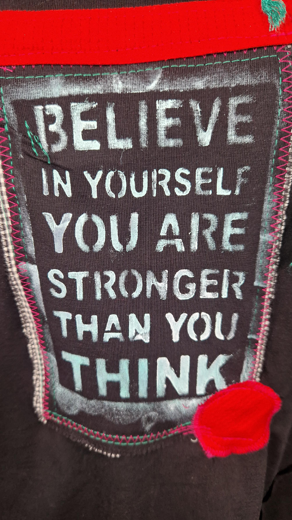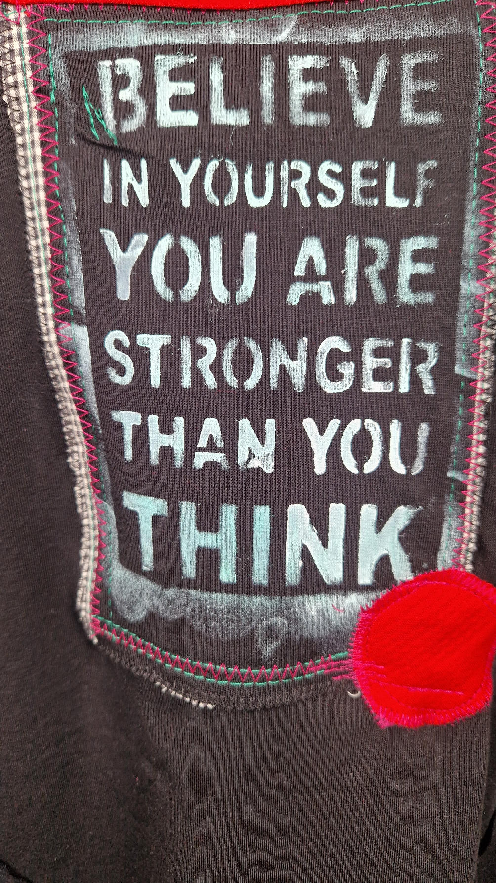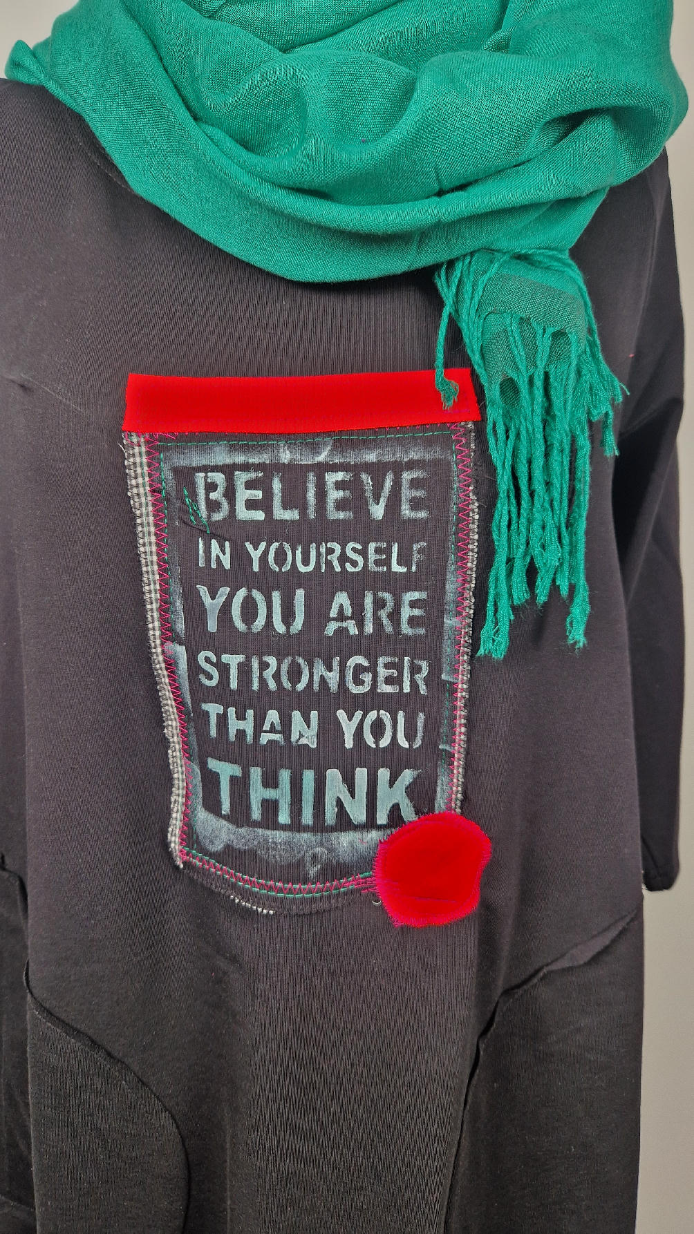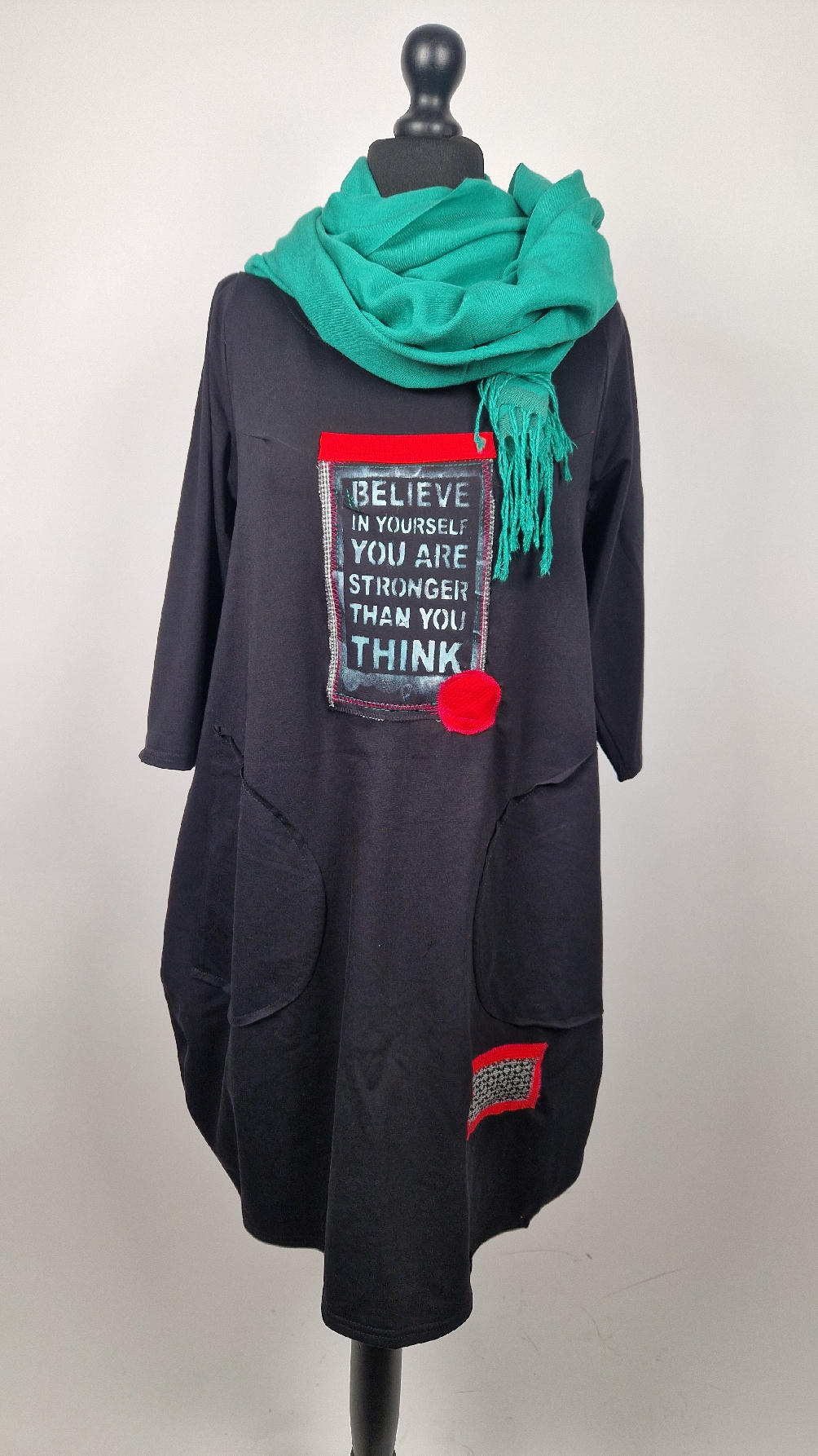 Czarna sukienka z rękawem 3/4 z unikatową aplikacją, uszyta z miękkiej bawełny typu jersey w kształcie, który pięknie ubierze Twoją sylwetkę, podkreślając to co trzeba lekko i luźno opływając pas i biodra; Każda aplikacja , każdy kolaż jest wykonany ręcznie, z różnych tkanin, koronek i cosiów. Każda sukienka jest niepowtarzalna, bo każdy kolaż jest inny.