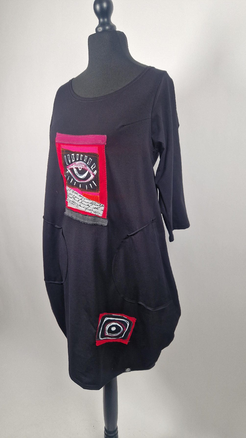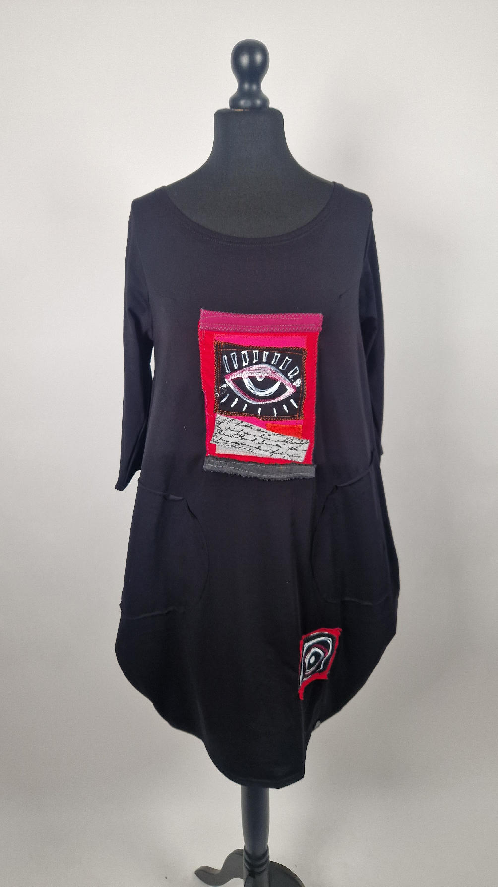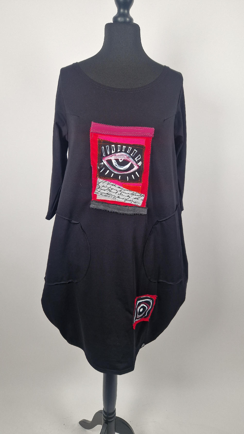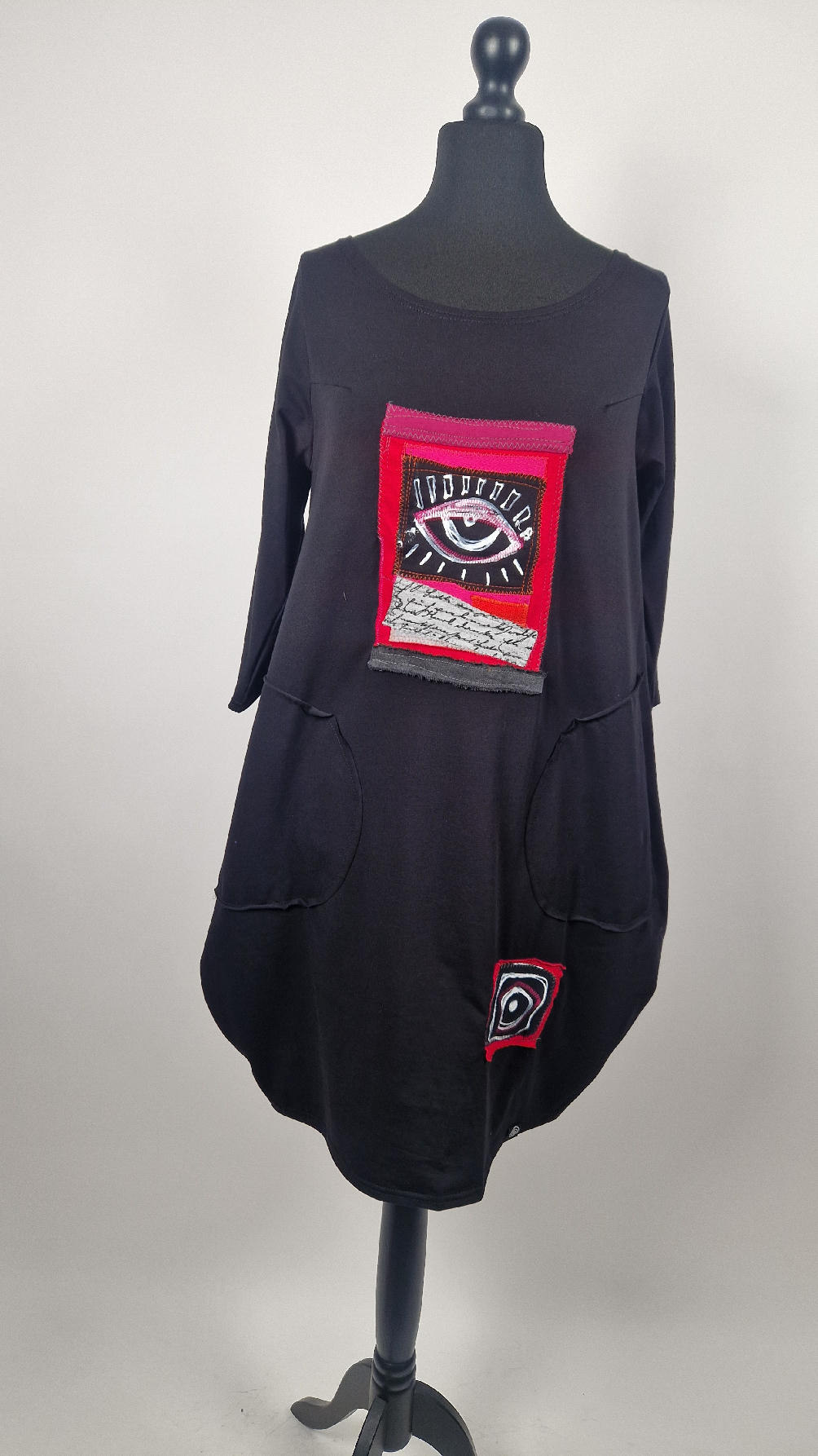 Czarna sukienka z rękawem 3/4 z unikatową aplikacją, uszyta z miękkiej bawełny typu jersey w kształcie, który pięknie ubierze Twoją sylwetkę, podkreślając to co trzeba lekko i luźno opływając pas i biodra; Każda aplikacja , każdy kolaż jest wykonany ręcznie, z różnych tkanin, koronek i cosiów. Każda sukienka jest niepowtarzalna, bo każdy kolaż jest inny.