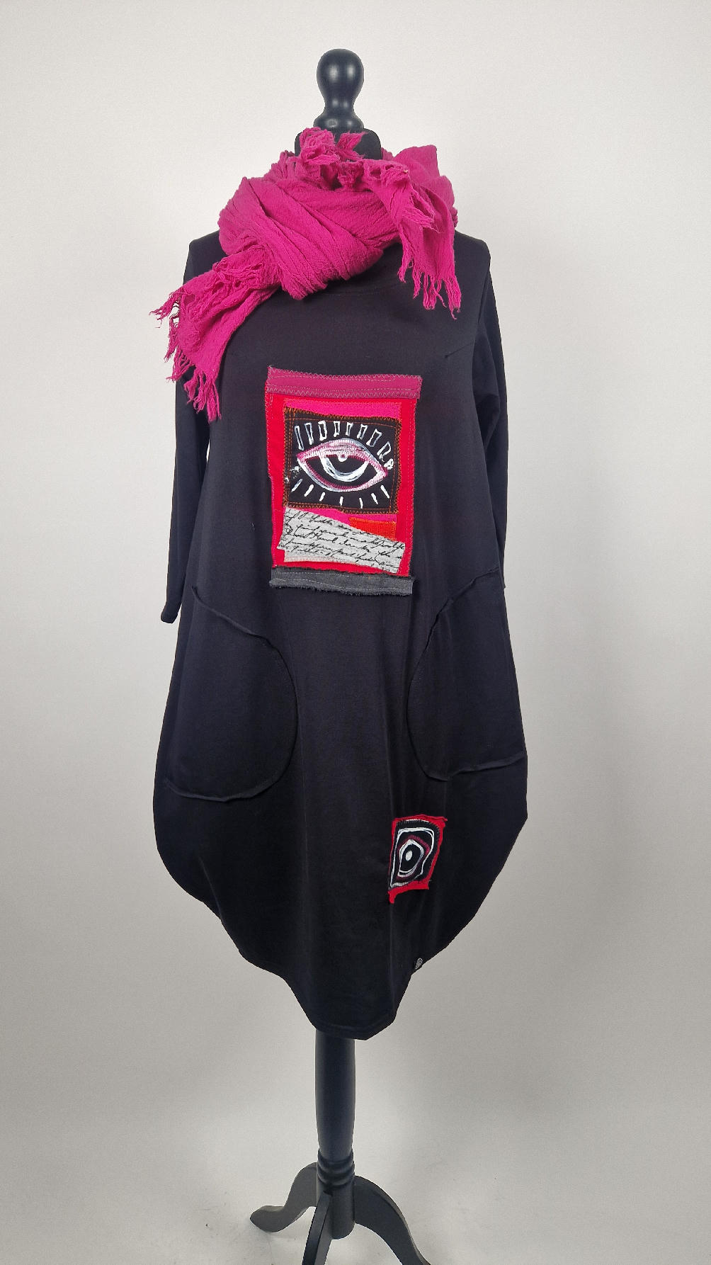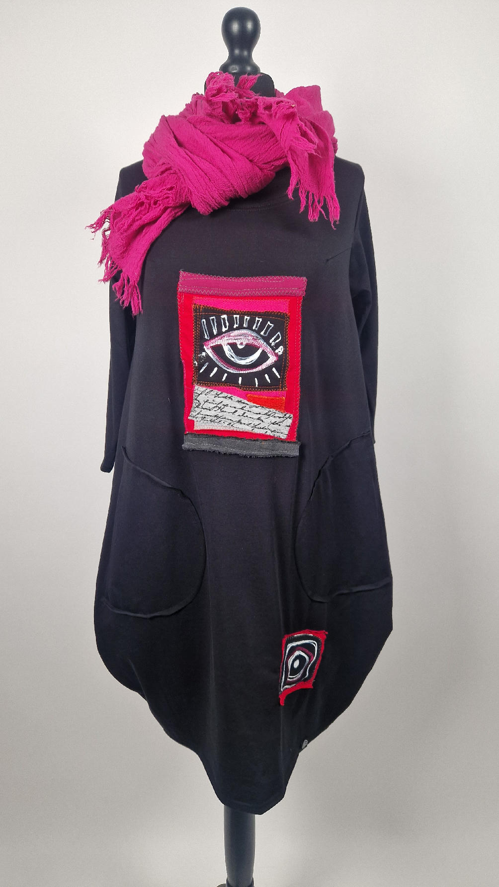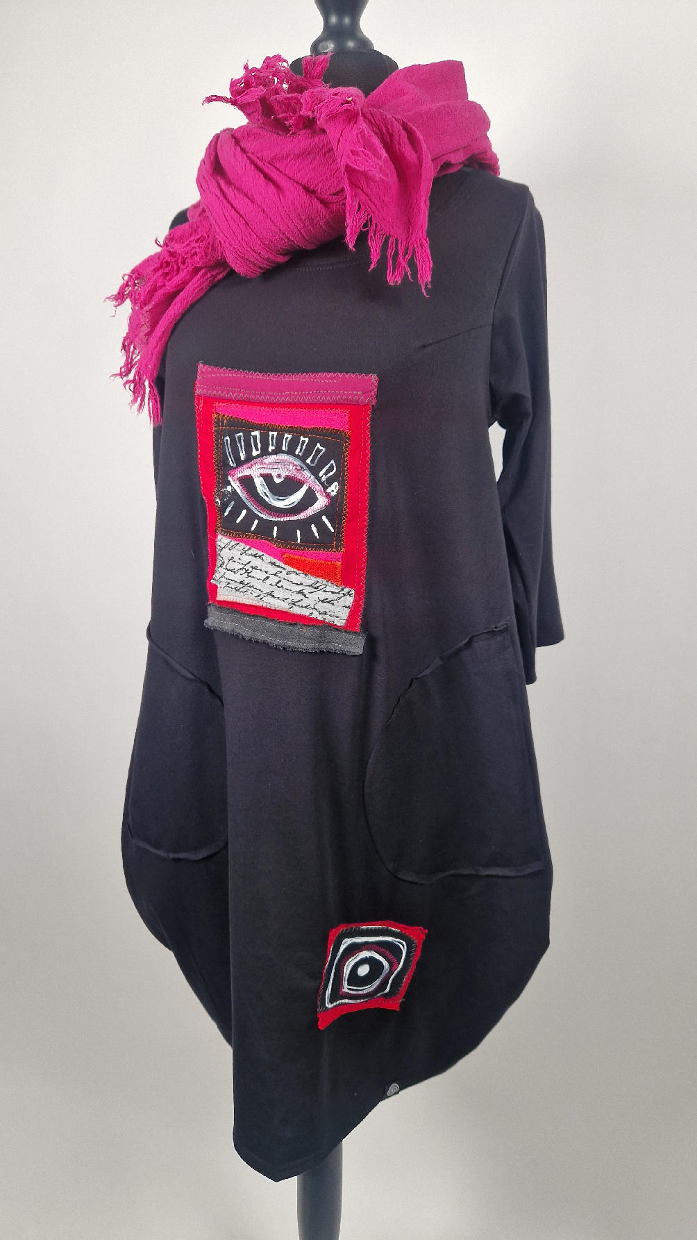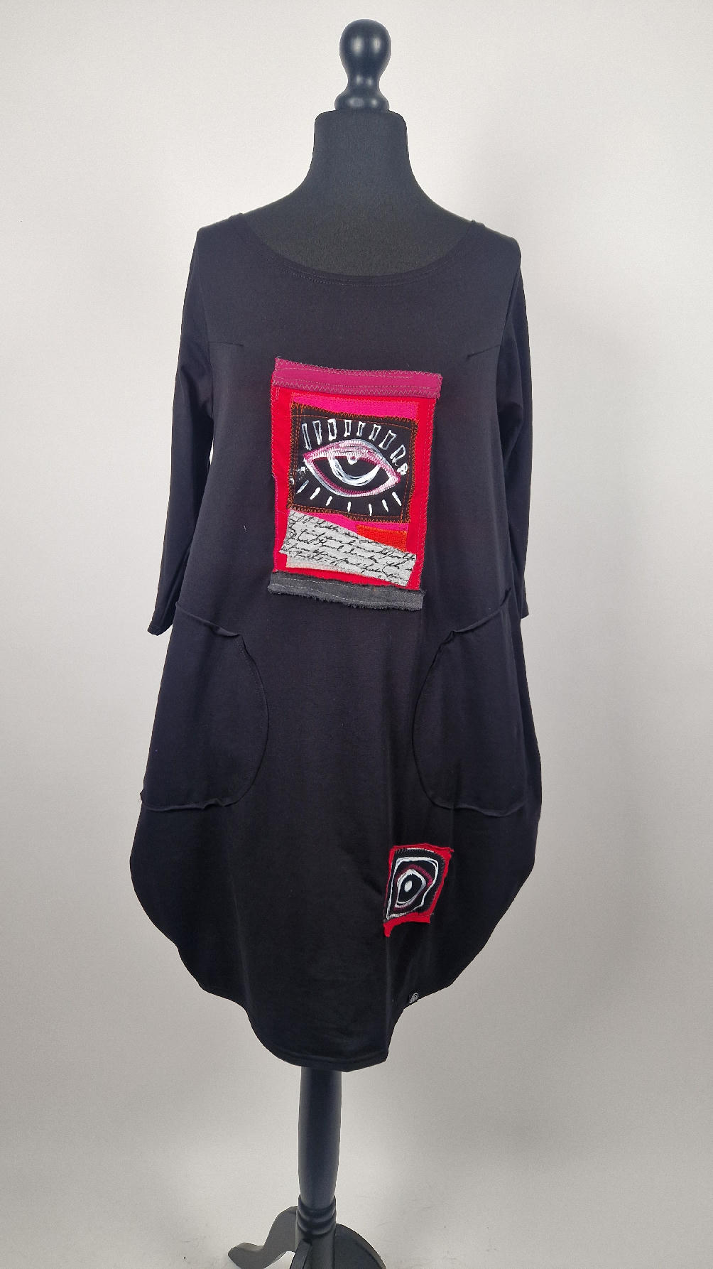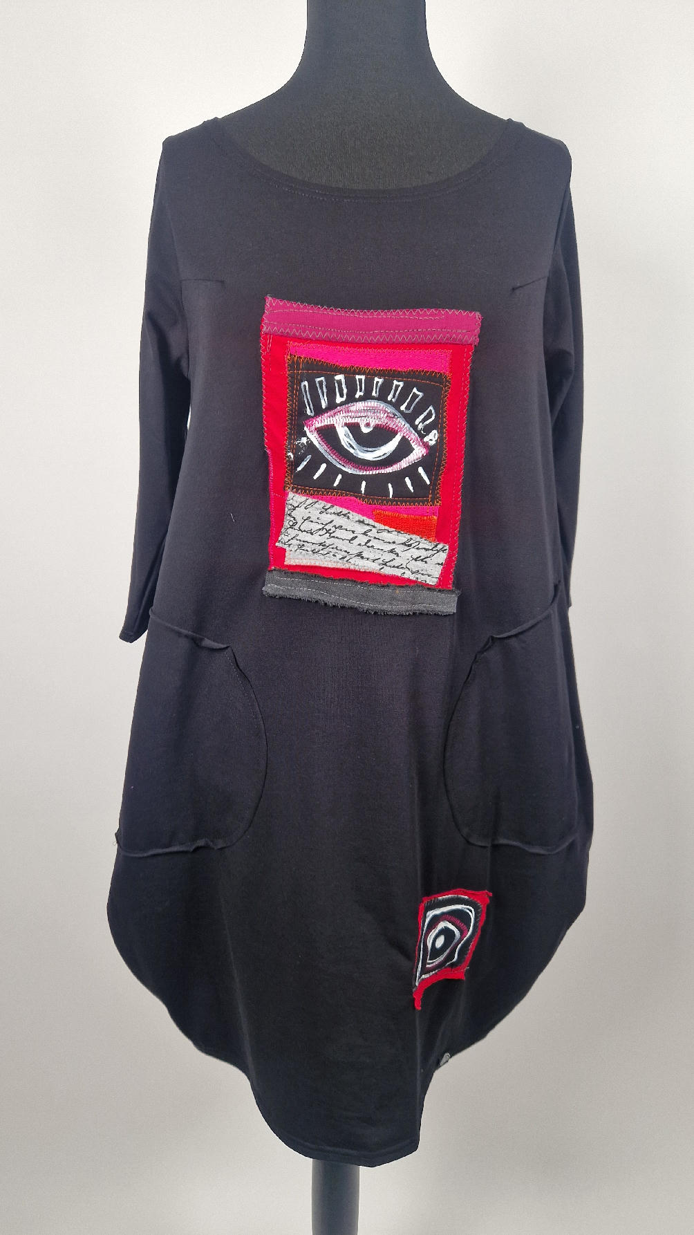 Czarna sukienka z rękawem 3/4 z unikatową aplikacją, uszyta z miękkiej bawełny typu jersey w kształcie, który pięknie ubierze Twoją sylwetkę, podkreślając to co trzeba lekko i luźno opływając pas i biodra; Każda aplikacja , każdy kolaż jest wykonany ręcznie, z różnych tkanin, koronek i cosiów. Każda sukienka jest niepowtarzalna, bo każdy kolaż jest inny.