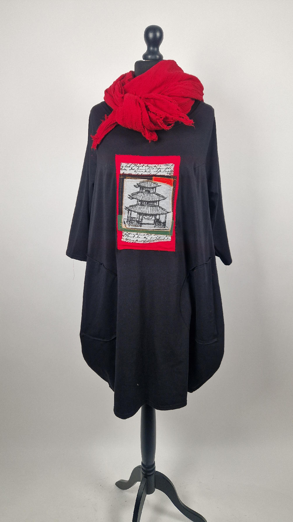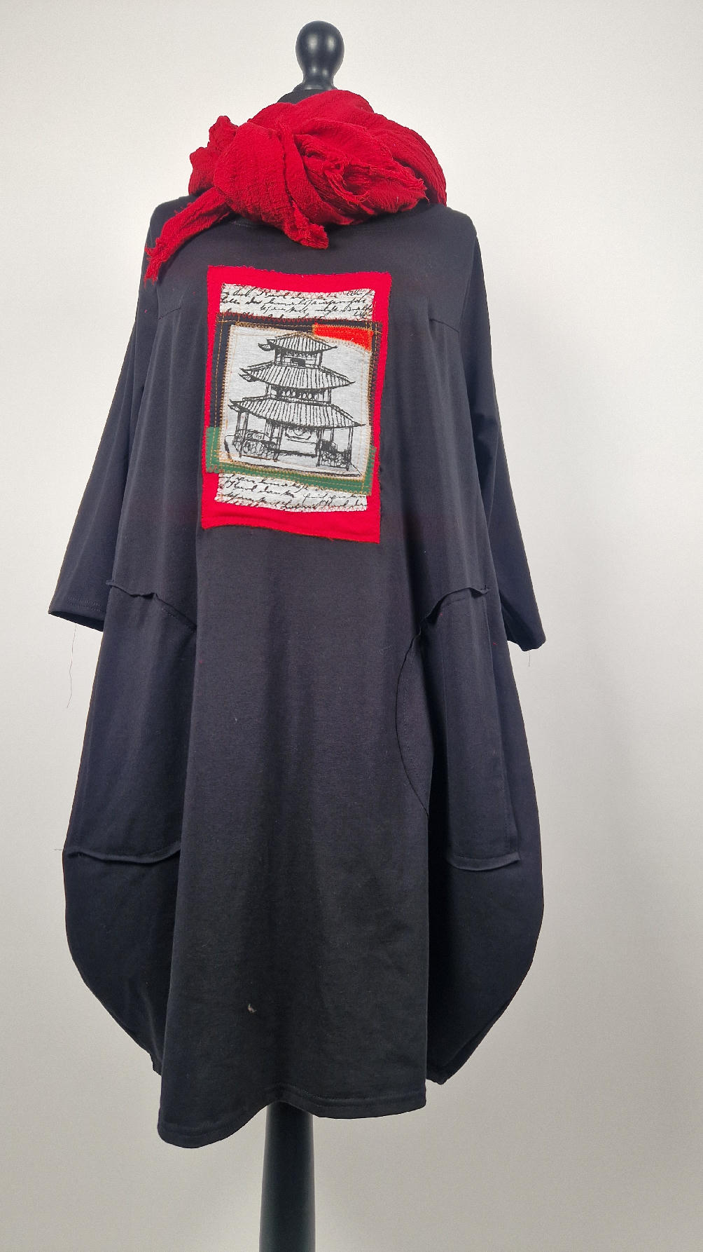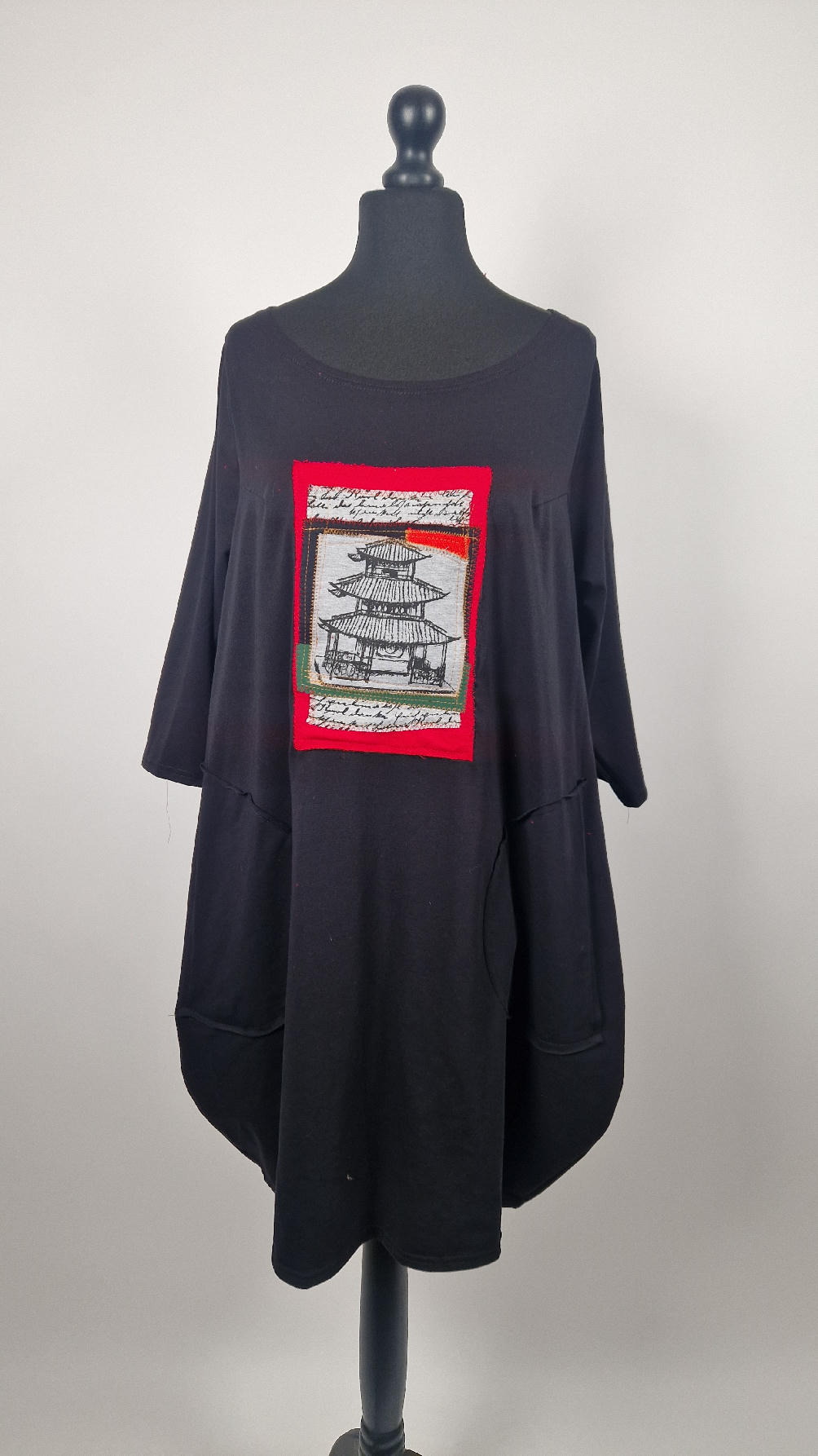 Czarna sukienka uszyta z bawełny typu jersey, uniwersalna i całoroczna, z rękawem 3/4…z przodu aplikacja-kolaż tkanin, unikatowy i jedyny dla każdej sukienki…Twoja sukienka jest wyjątkowa…poza tym bardzo wygodna i zgrabna i pokochasz ją od pierwszego zobaczenia.