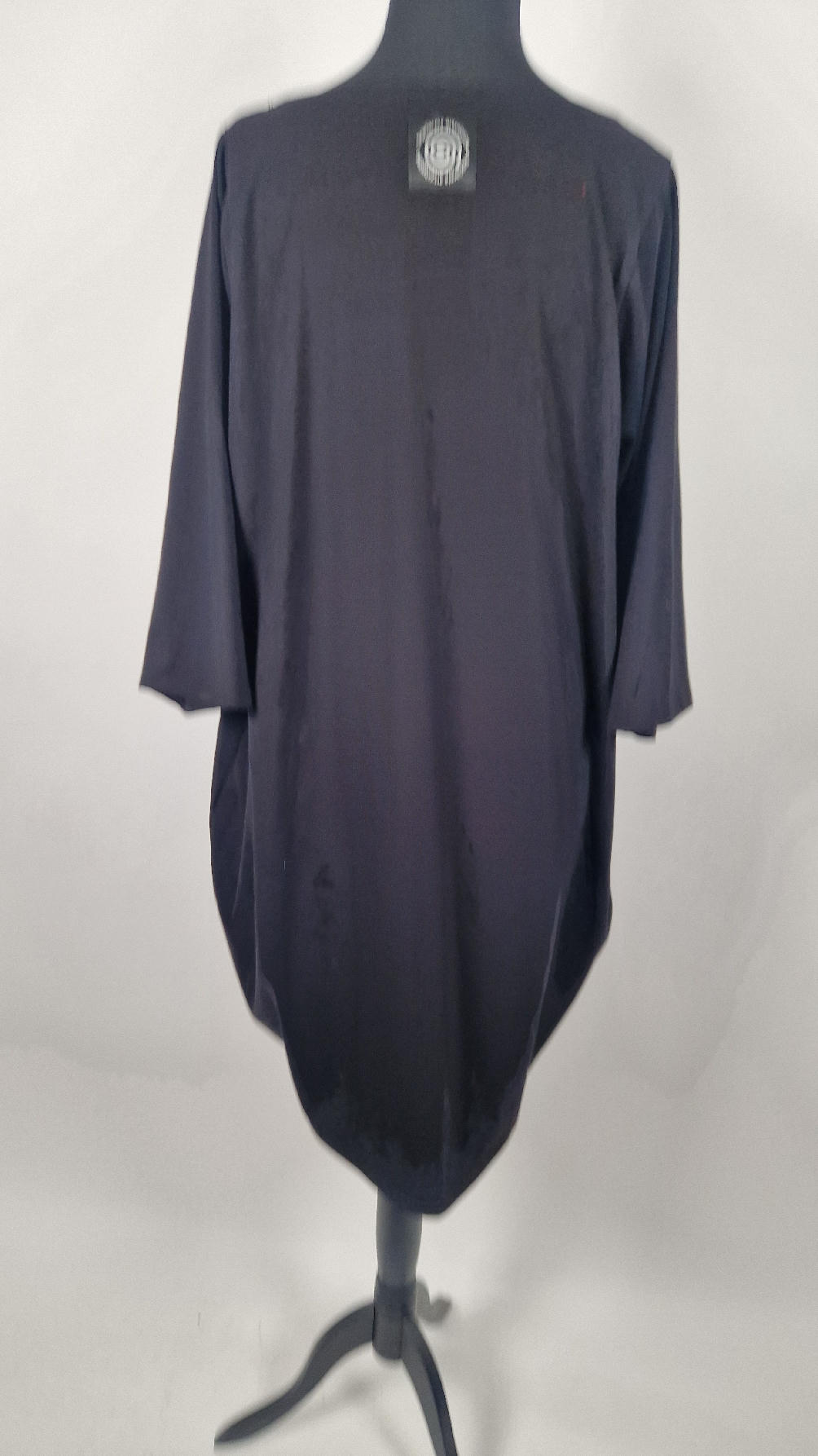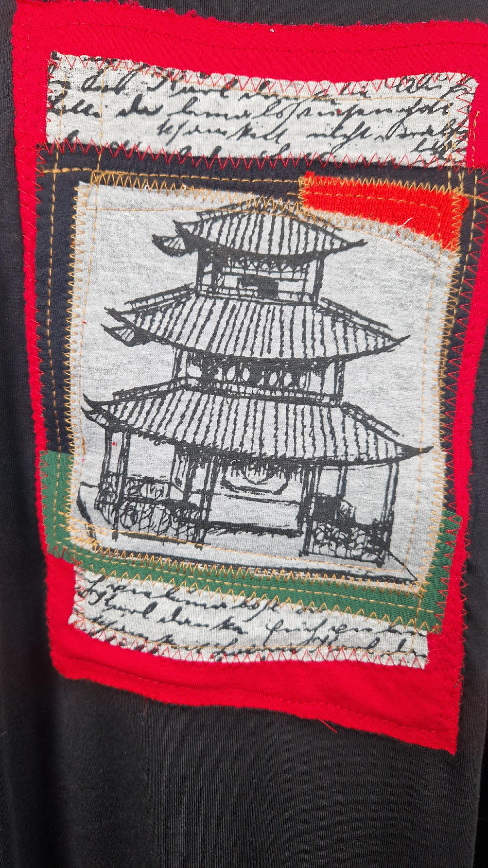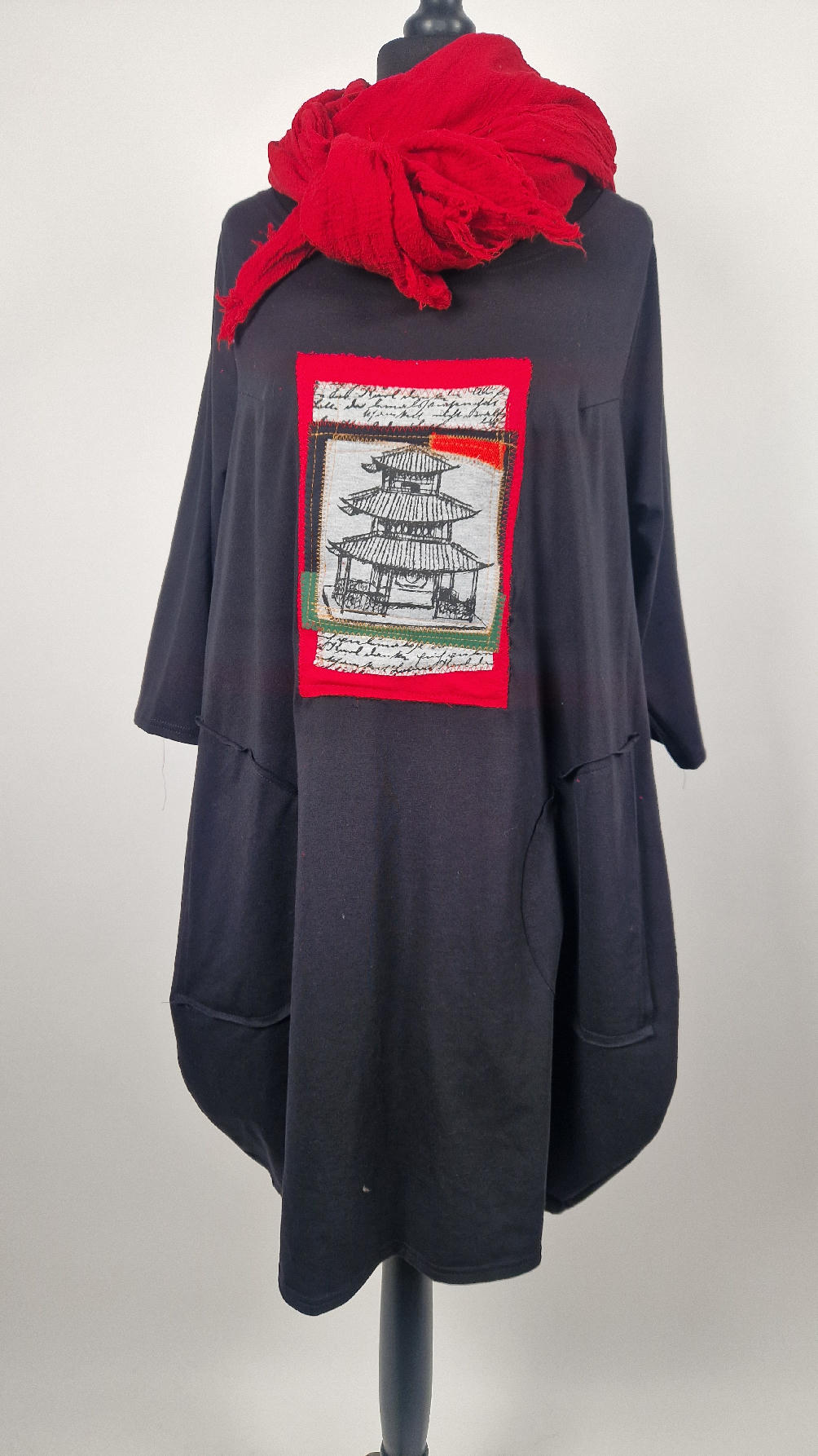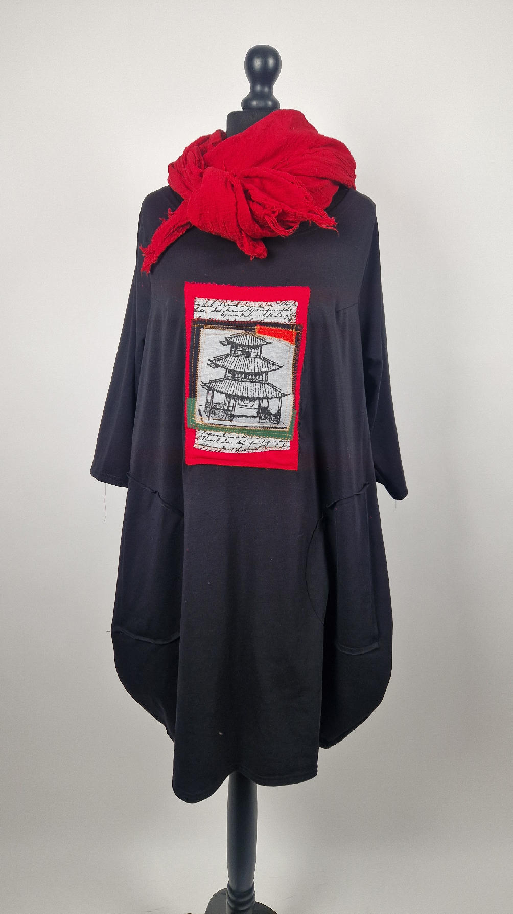 Czarna sukienka uszyta z bawełny typu jersey, uniwersalna i całoroczna, z rękawem 3/4…z przodu aplikacja-kolaż tkanin, unikatowy i jedyny dla każdej sukienki…Twoja sukienka jest wyjątkowa…poza tym bardzo wygodna i zgrabna i pokochasz ją od pierwszego zobaczenia.