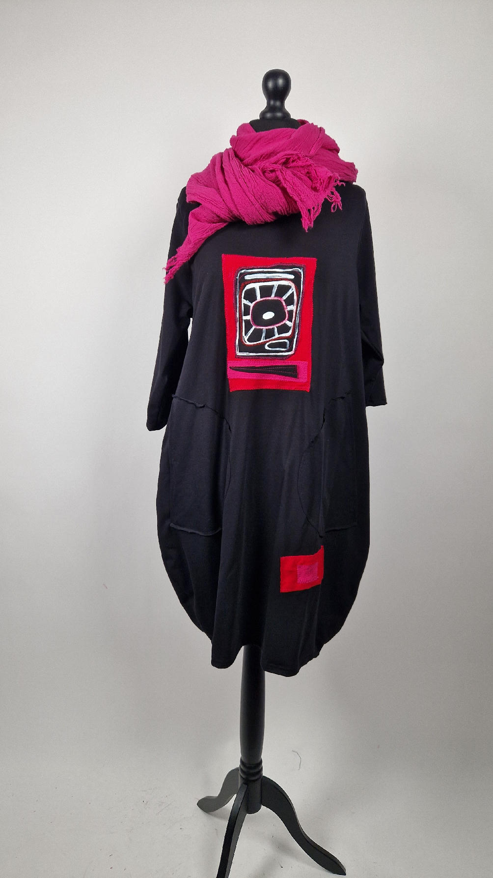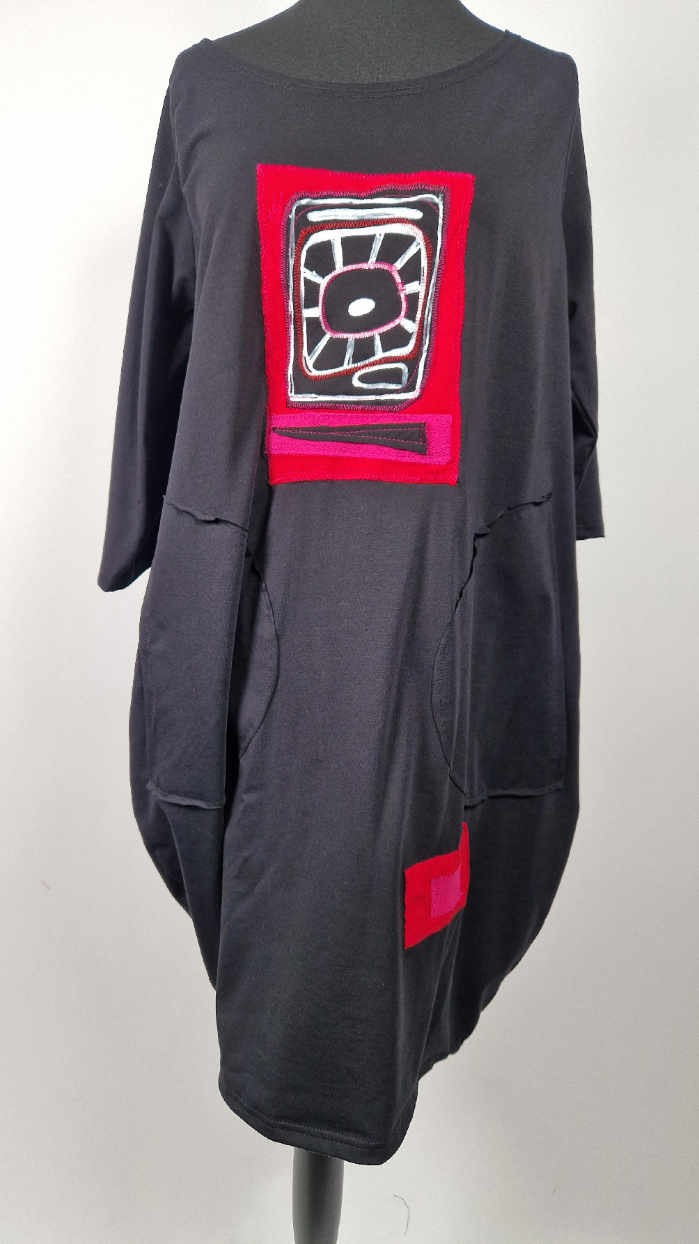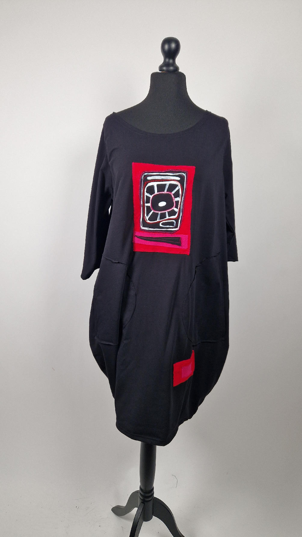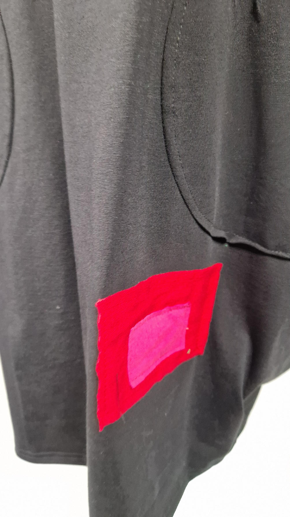 Czarna sukienka  z unikatową, aplikacją uszyta z bawełny typu jersey, uniwersalna i całoroczna,  rysunek namalowaney na czarnym tle, poprzeszywany czerwona nitką naszyty na czerwony materiał, do tego madżenta i odrobina pomarańczy. Sukienka  z rękawem 3/4…z przodu aplikacja-kolaż tkanin, unikatowy i jedyny dla każdej sukienki…Twoja sukienka jest  wyjątkowa…poza tym bardzo wygodna i zgrabna i pokochasz ją od pierwszego zobaczenia.