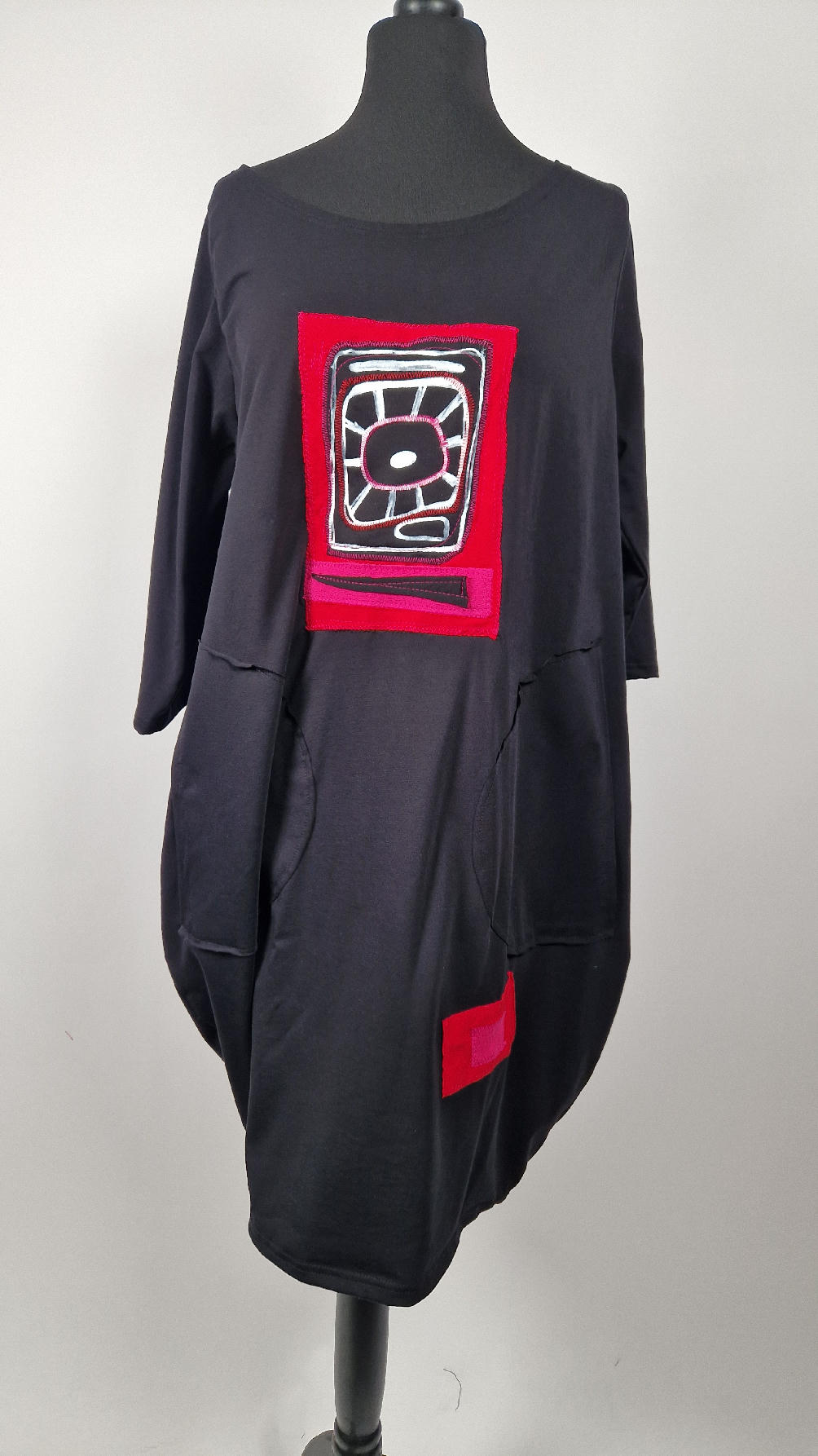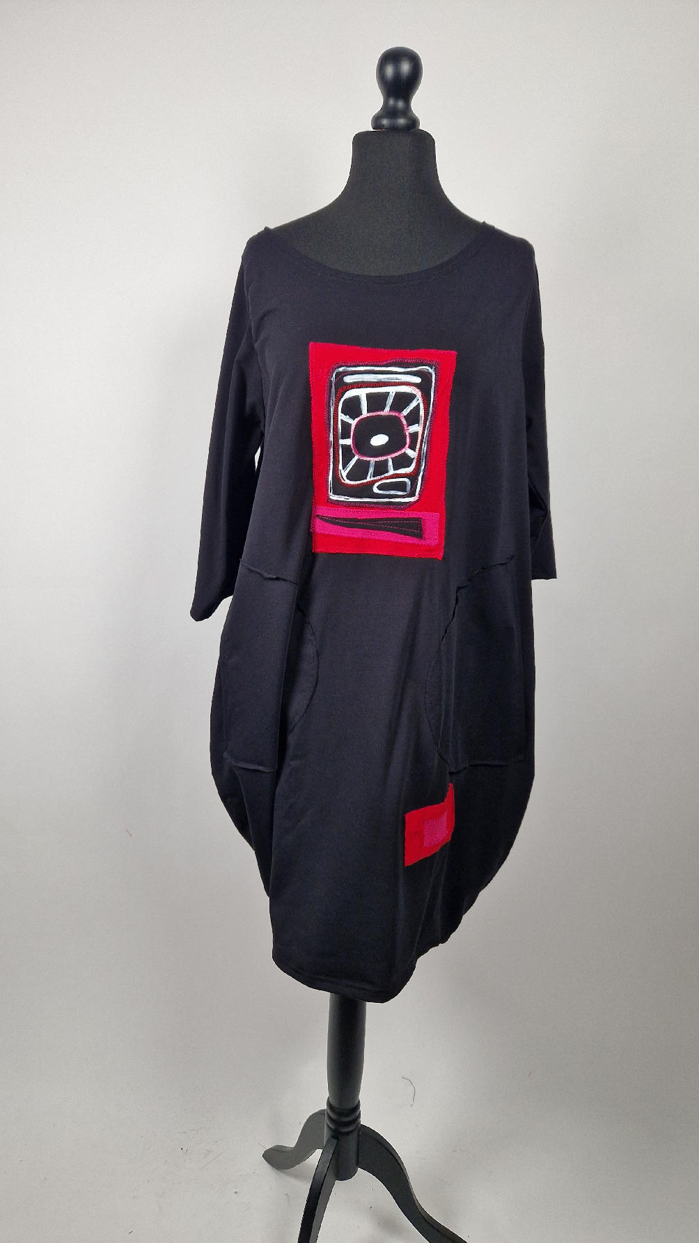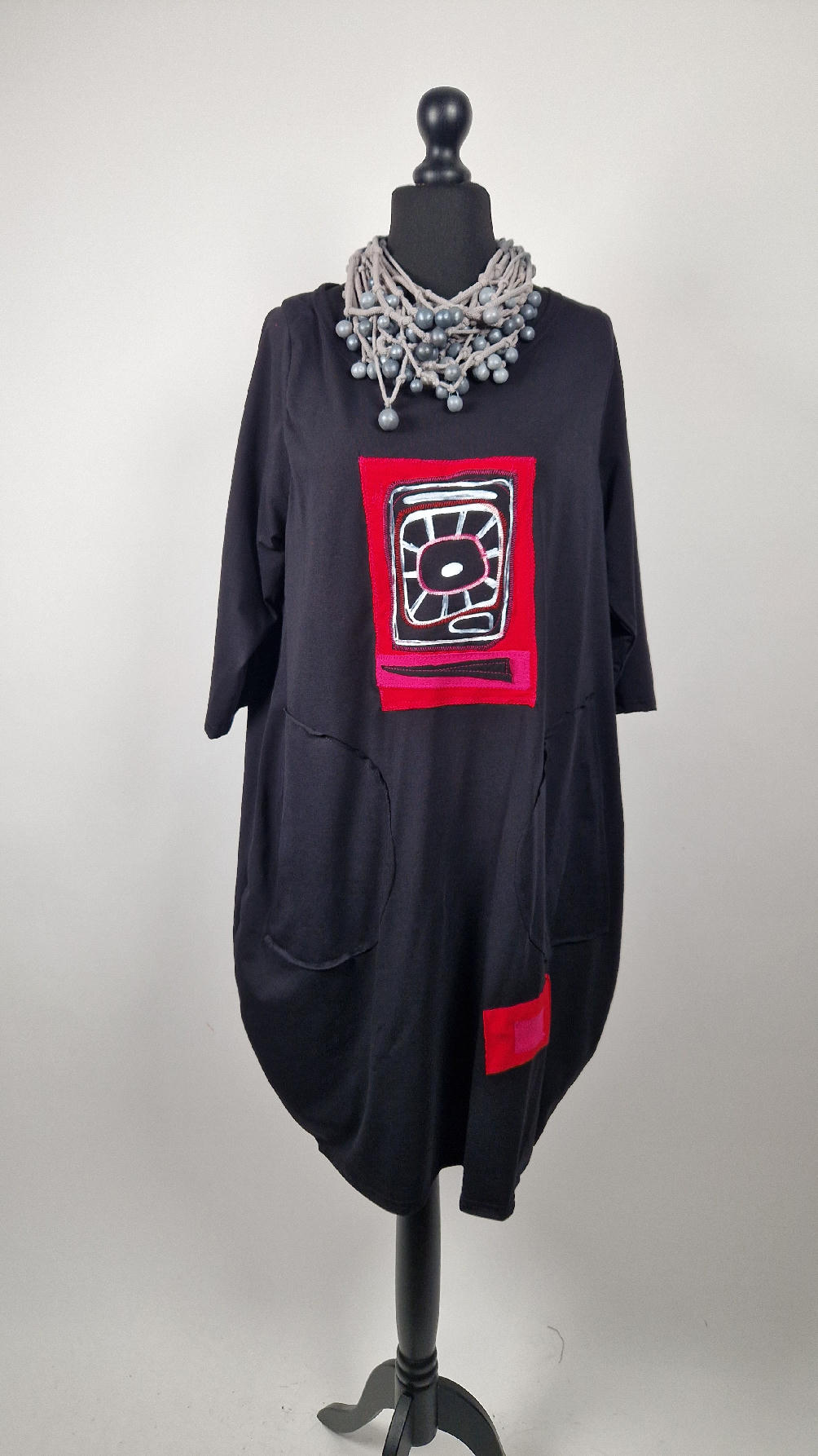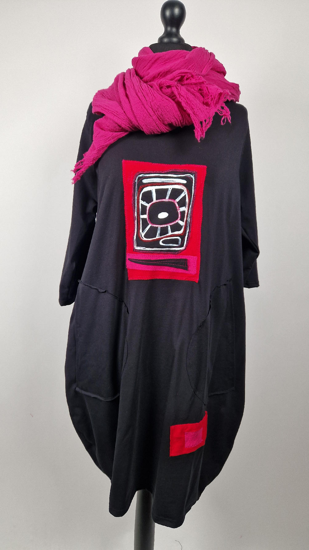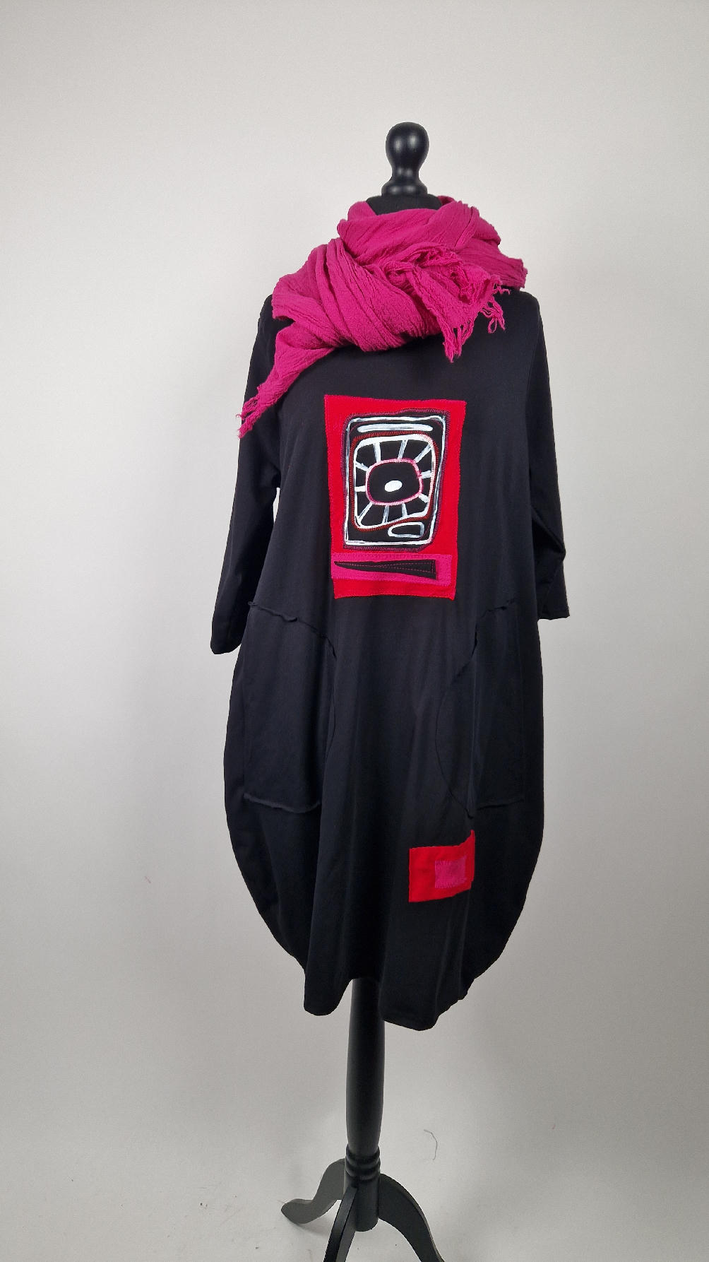 Czarna sukienka  z unikatową, aplikacją uszyta z bawełny typu jersey, uniwersalna i całoroczna,  rysunek namalowaney na czarnym tle, poprzeszywany czerwona nitką naszyty na czerwony materiał, do tego madżenta i odrobina pomarańczy. Sukienka  z rękawem 3/4…z przodu aplikacja-kolaż tkanin, unikatowy i jedyny dla każdej sukienki…Twoja sukienka jest  wyjątkowa…poza tym bardzo wygodna i zgrabna i pokochasz ją od pierwszego zobaczenia.
