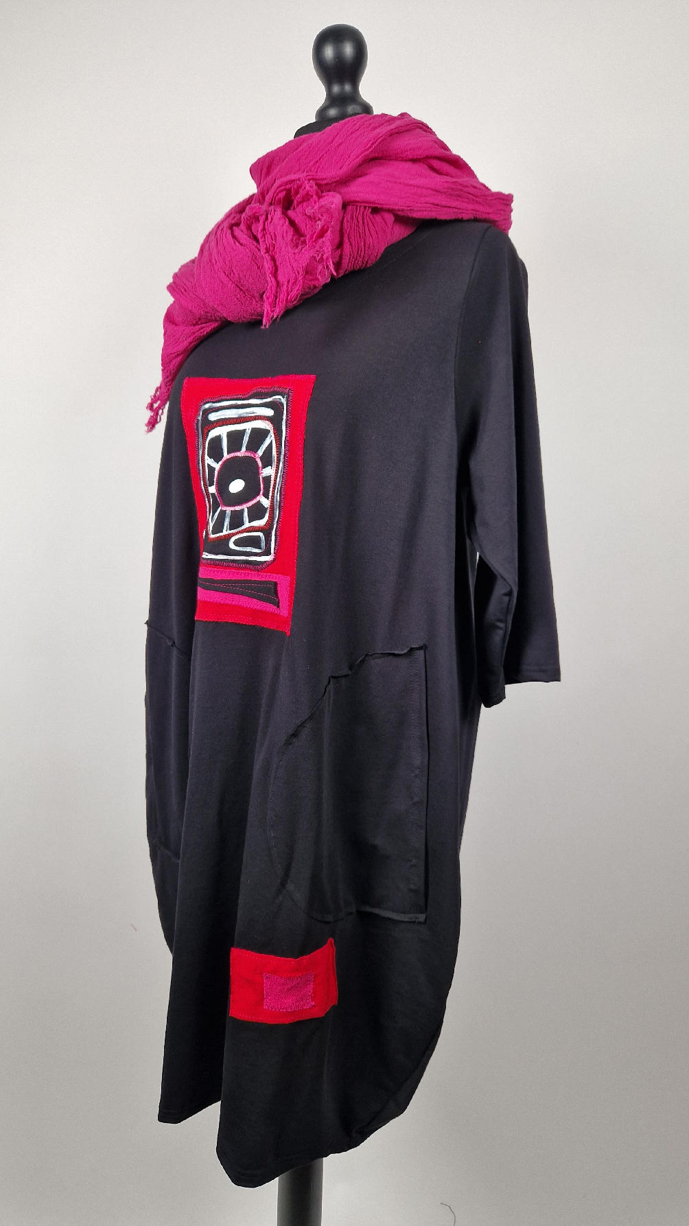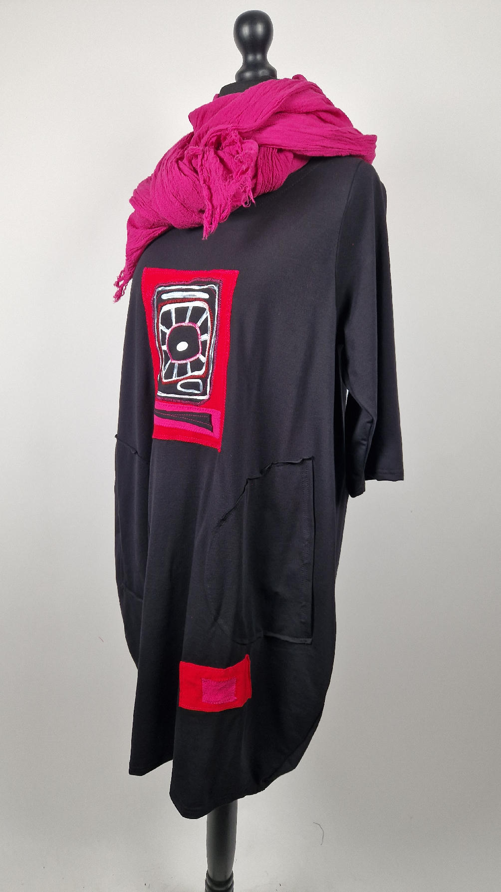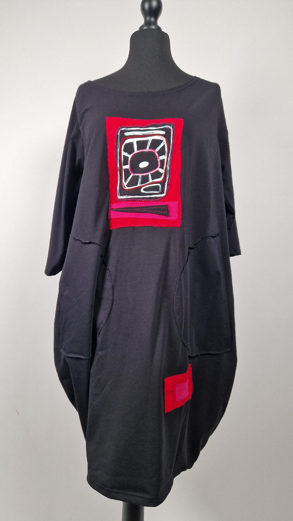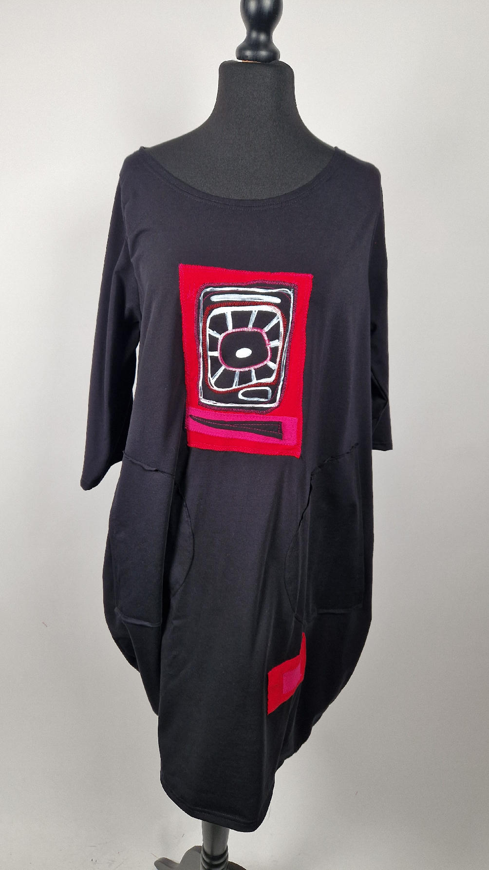 Czarna sukienka  z unikatową, aplikacją uszyta z bawełny typu jersey, uniwersalna i całoroczna,  rysunek namalowaney na czarnym tle, poprzeszywany czerwona nitką naszyty na czerwony materiał, do tego madżenta i odrobina pomarańczy. Sukienka  z rękawem 3/4…z przodu aplikacja-kolaż tkanin, unikatowy i jedyny dla każdej sukienki…Twoja sukienka jest  wyjątkowa…poza tym bardzo wygodna i zgrabna i pokochasz ją od pierwszego zobaczenia.