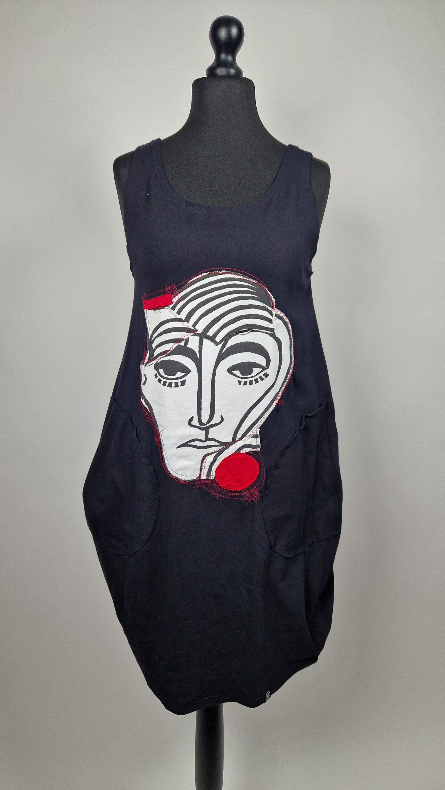 Czarna sukienka na grubych ramiączkach, bardzo zgrabna  z dużymi kieszeniami, które wysmuklają sylwetkę…z aplikacją, jakiej nie będzie mieć żadna inna babka……że niby czarna sukienka nie jest kolorowa?