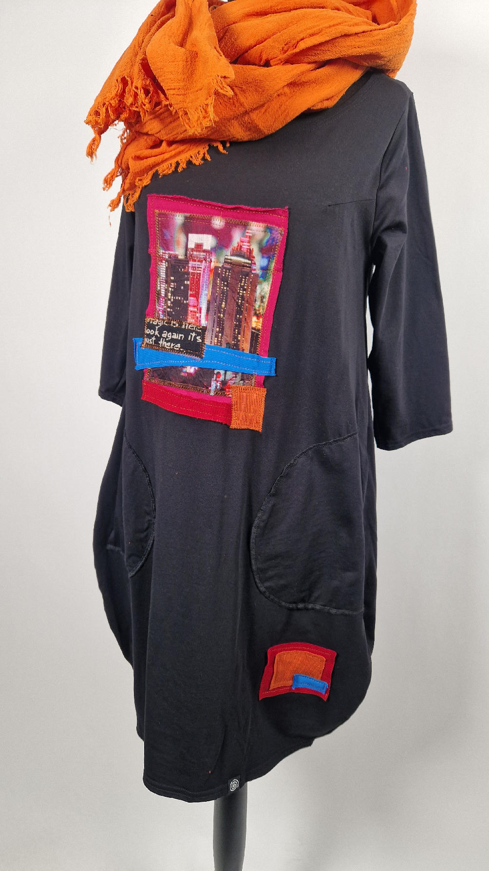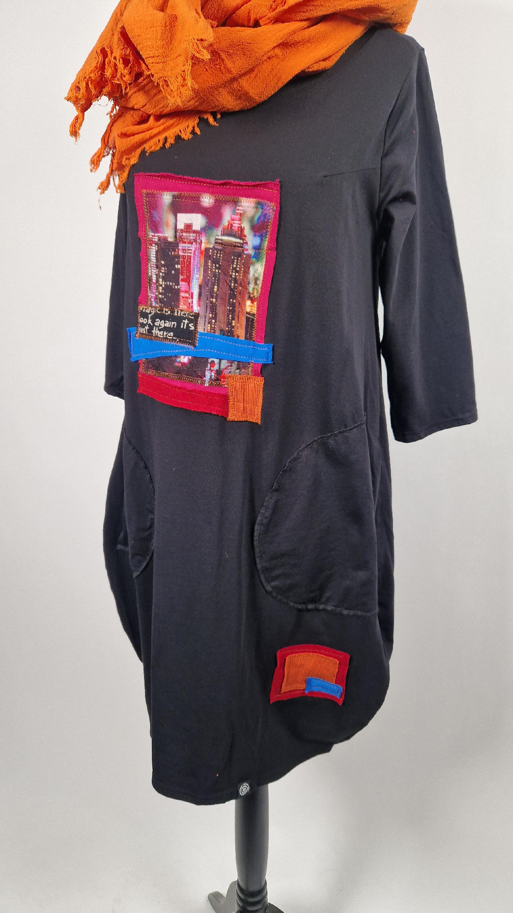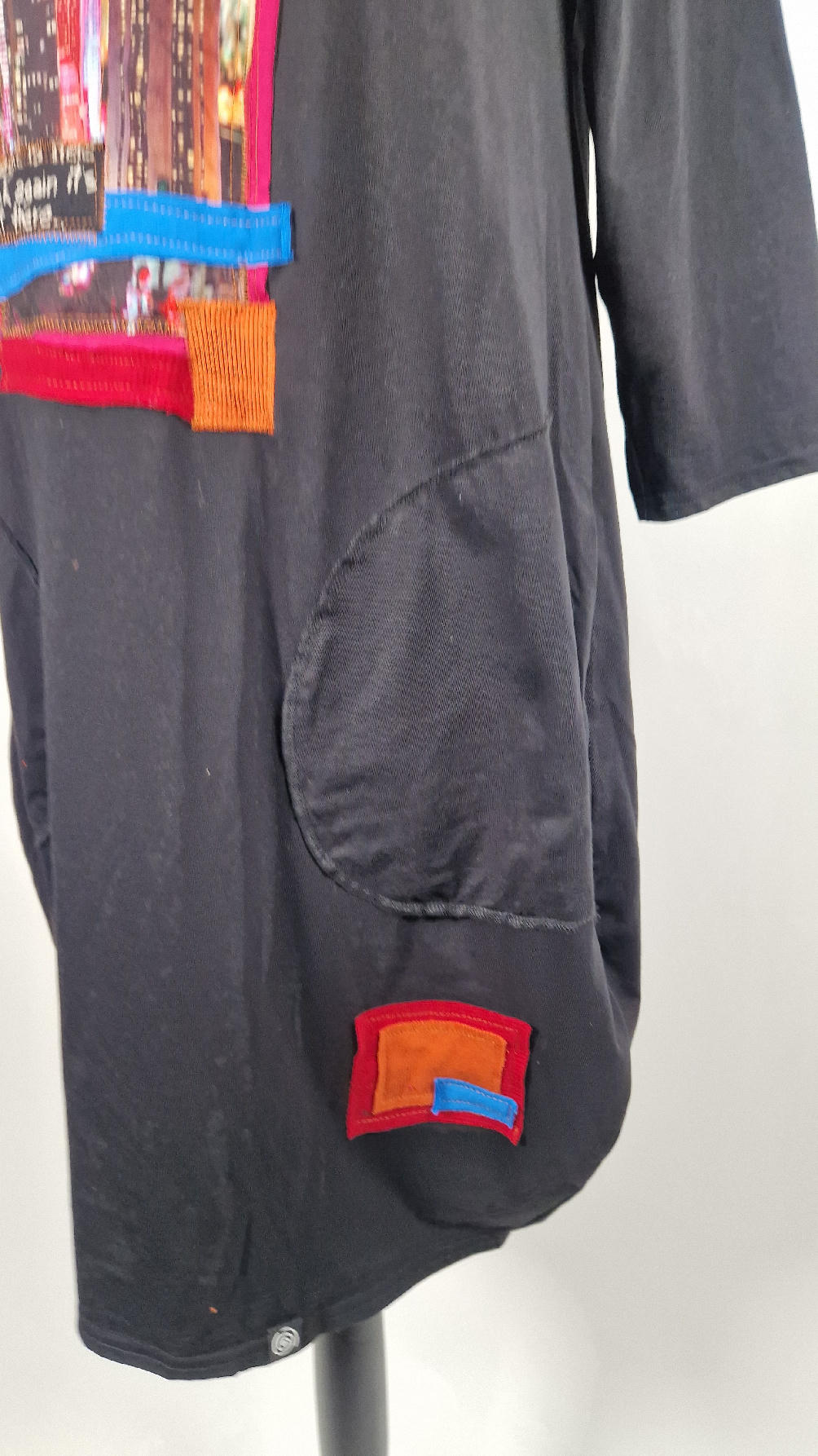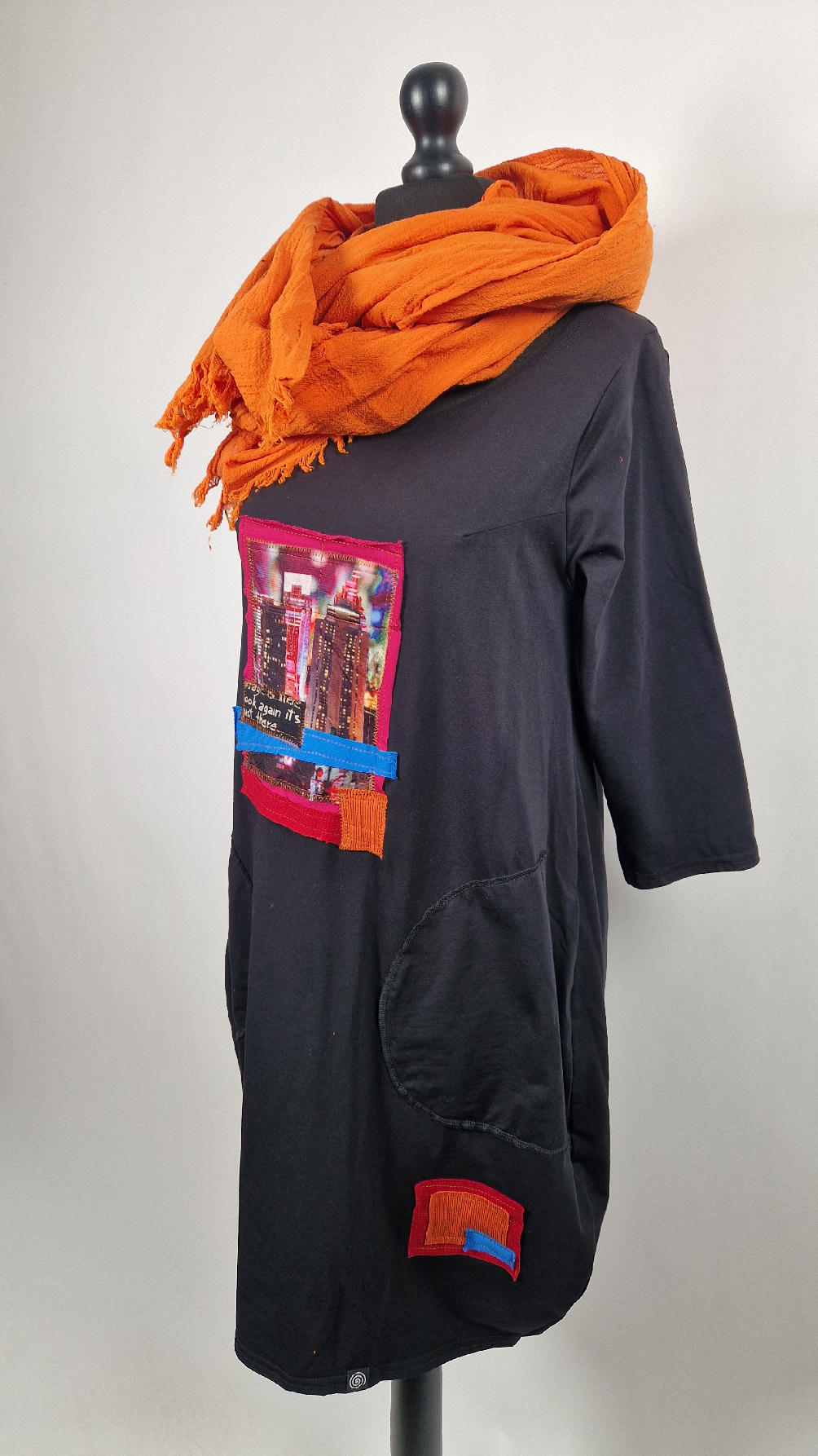 Czarna sukienka z rękawem 3/4 z unikatową aplikacją, uszyta z miękkiej bawełny typu jersey w kształcie, który pięknie ubierze Twoją sylwetkę, podkreślając to co trzeba lekko i luźno opływając pas i biodra; Każda aplikacja , każdy kolaż jest wykonany ręcznie, z różnych tkanin, koronek i cosiów. Każda sukienka jest niepowtarzalna, bo każdy kolaż jest inny.