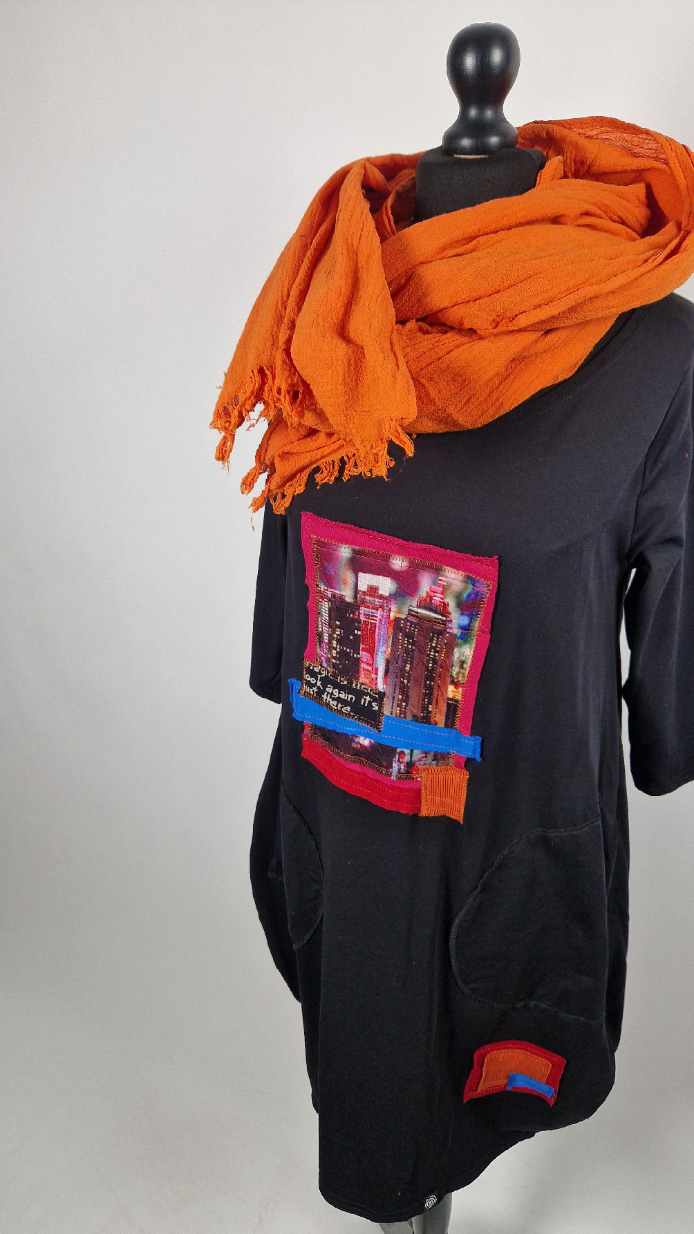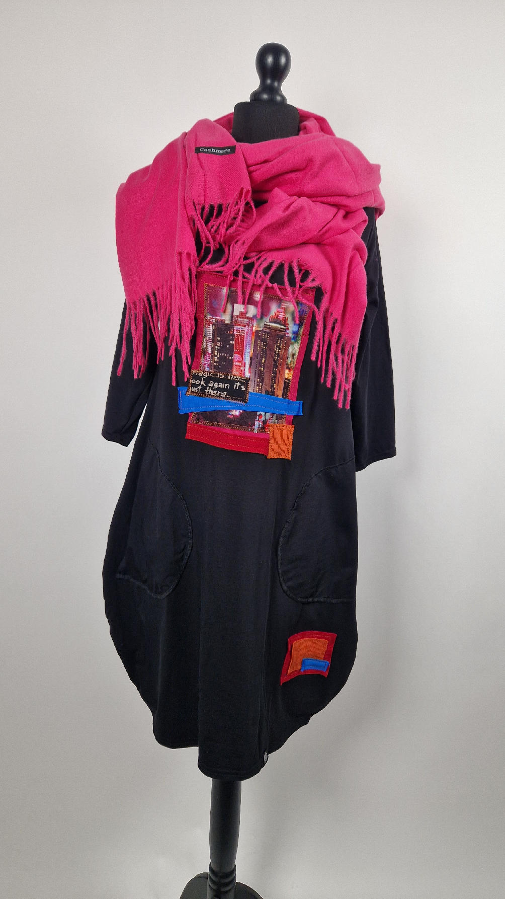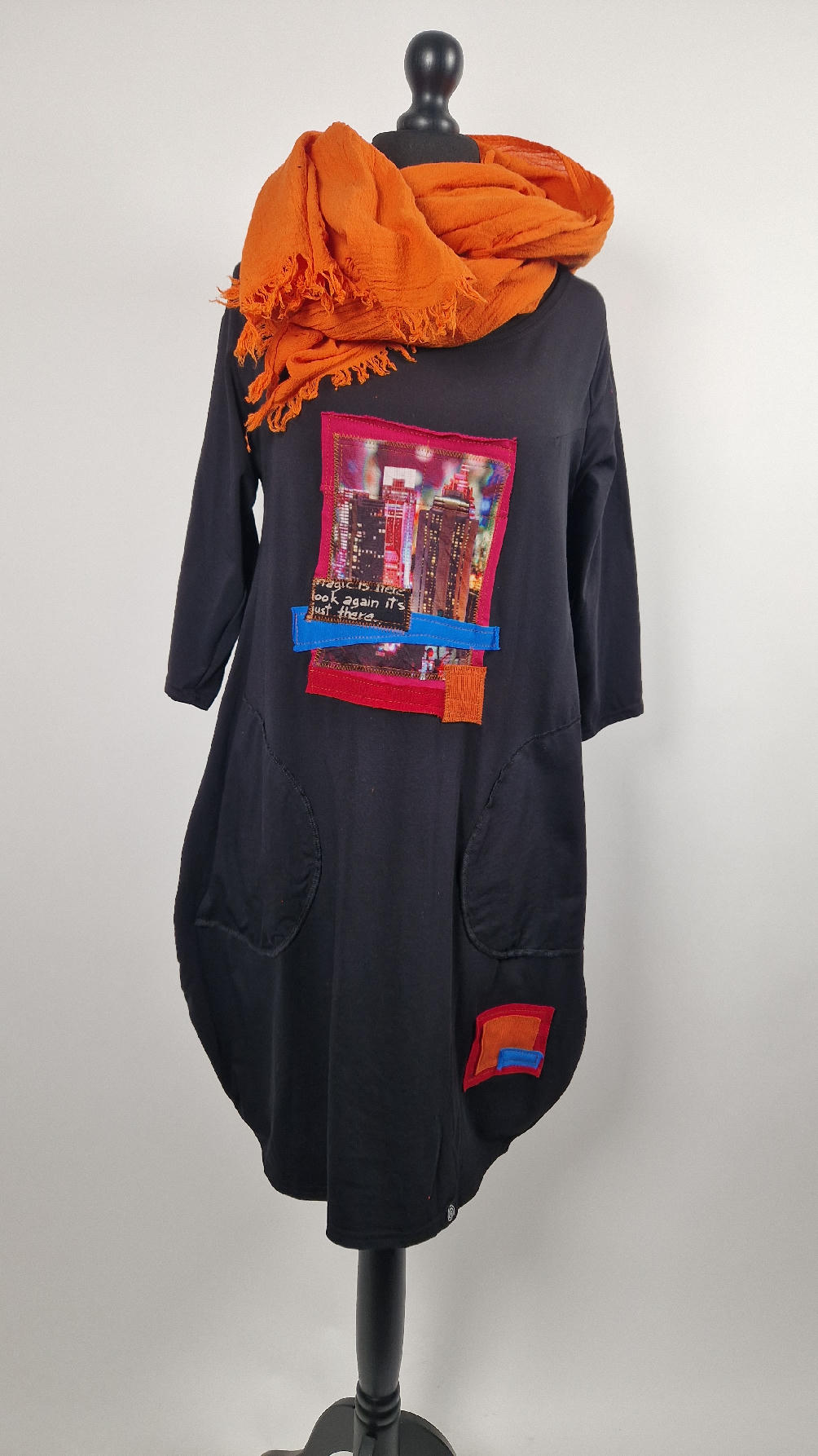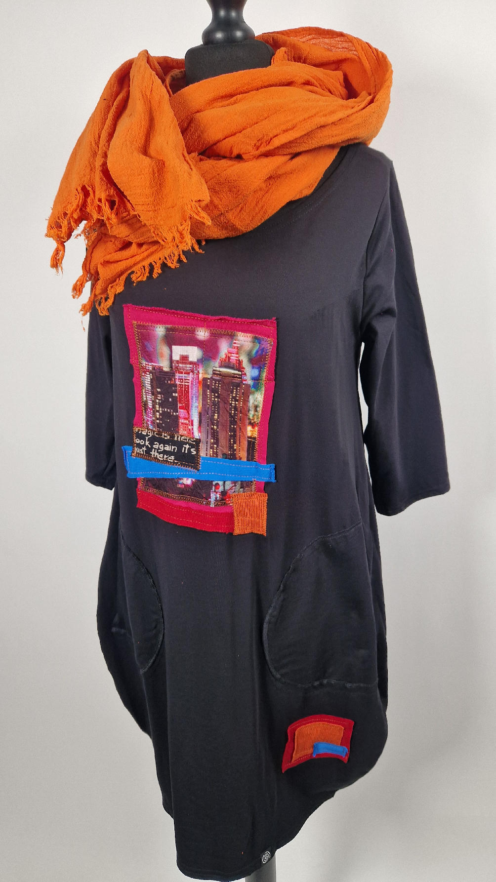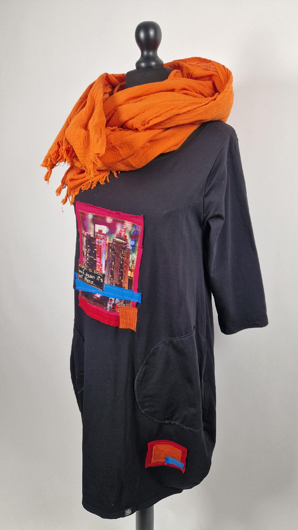 Czarna sukienka z rękawem 3/4 z unikatową aplikacją, uszyta z miękkiej bawełny typu jersey w kształcie, który pięknie ubierze Twoją sylwetkę, podkreślając to co trzeba lekko i luźno opływając pas i biodra; Każda aplikacja , każdy kolaż jest wykonany ręcznie, z różnych tkanin, koronek i cosiów. Każda sukienka jest niepowtarzalna, bo każdy kolaż jest inny.