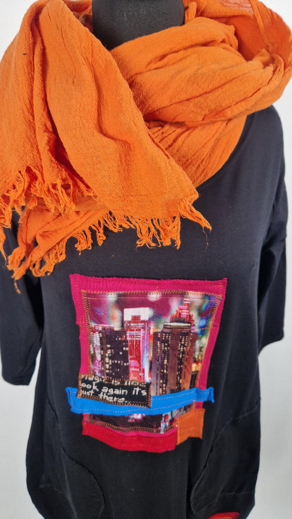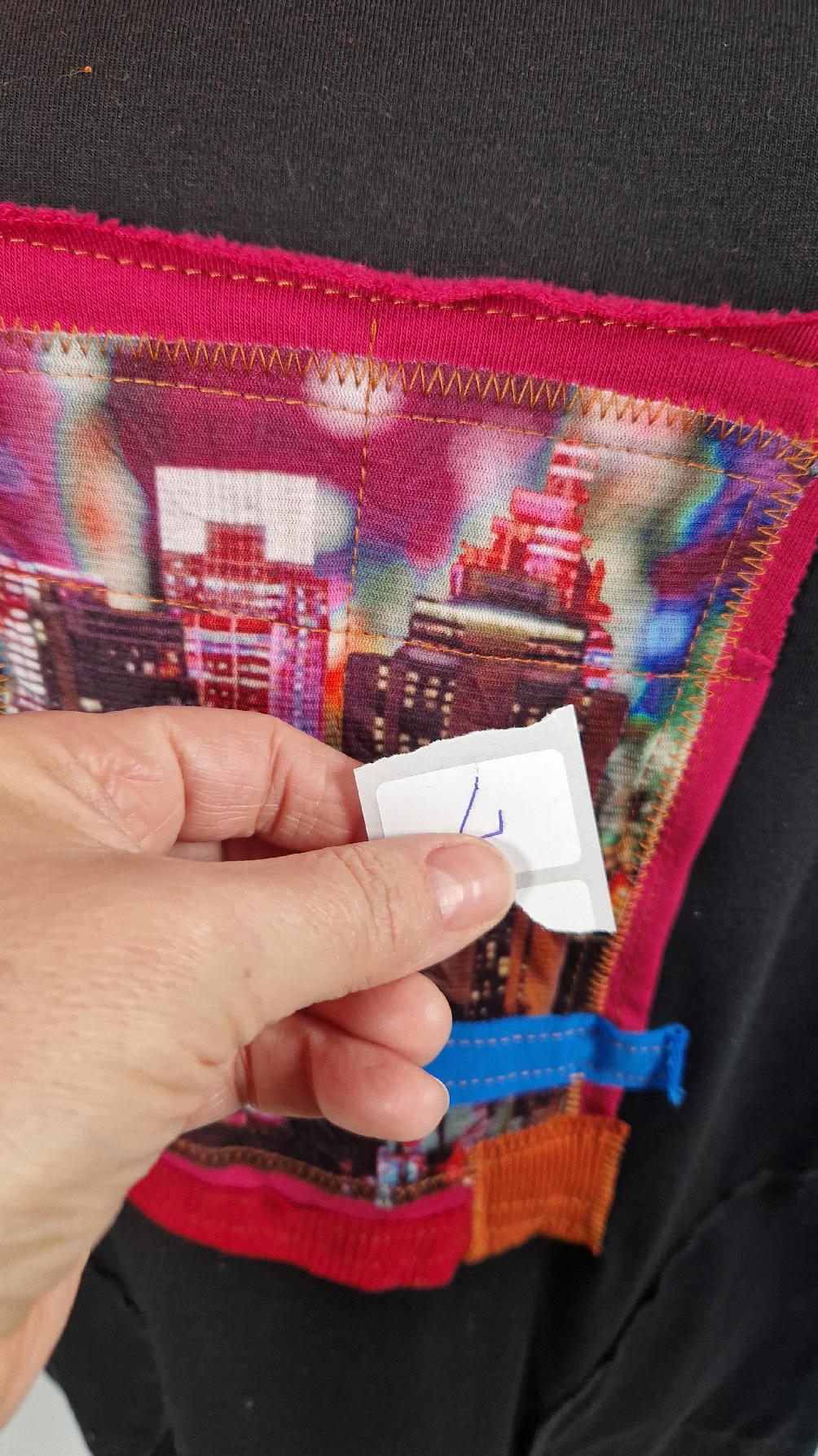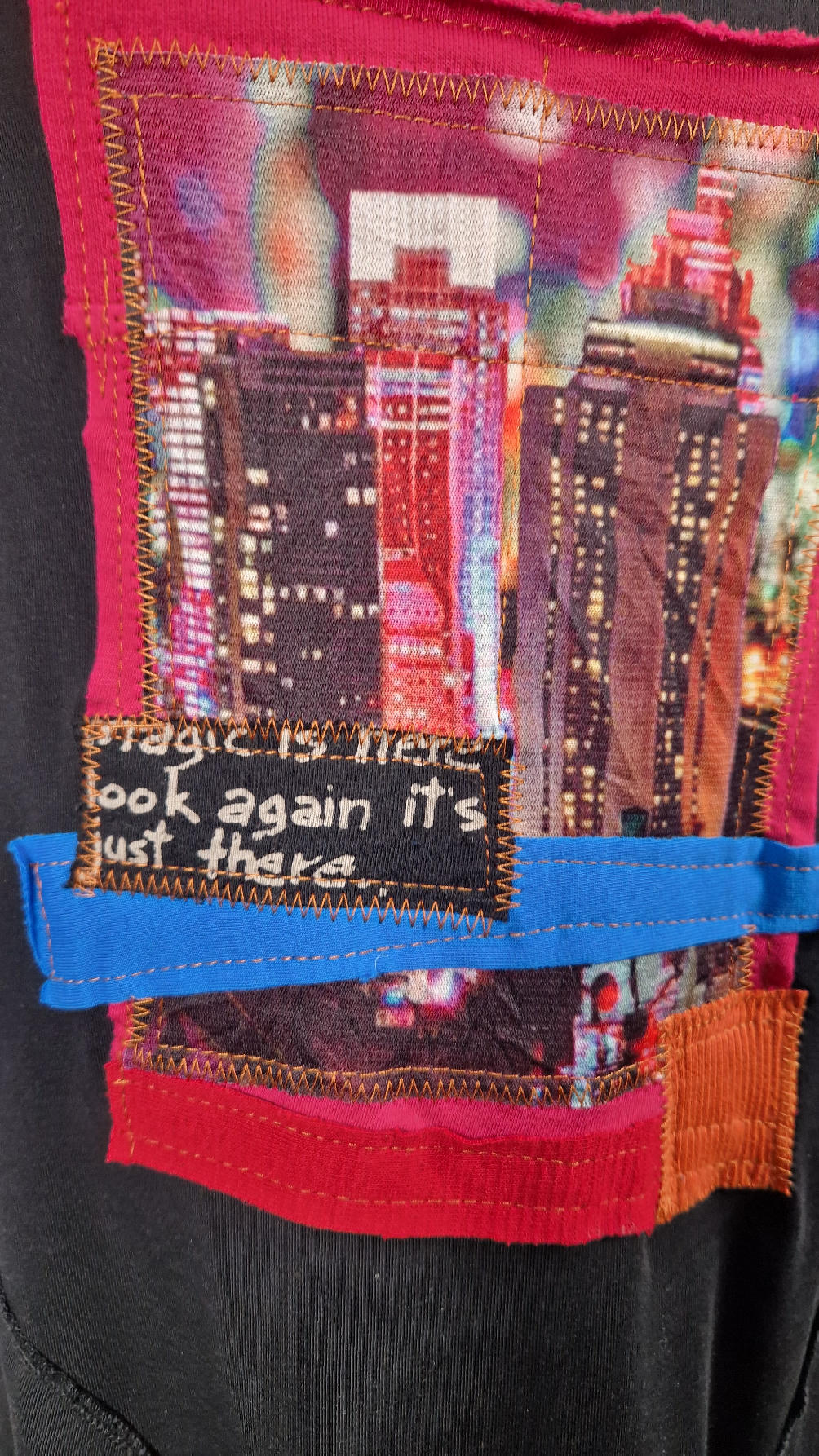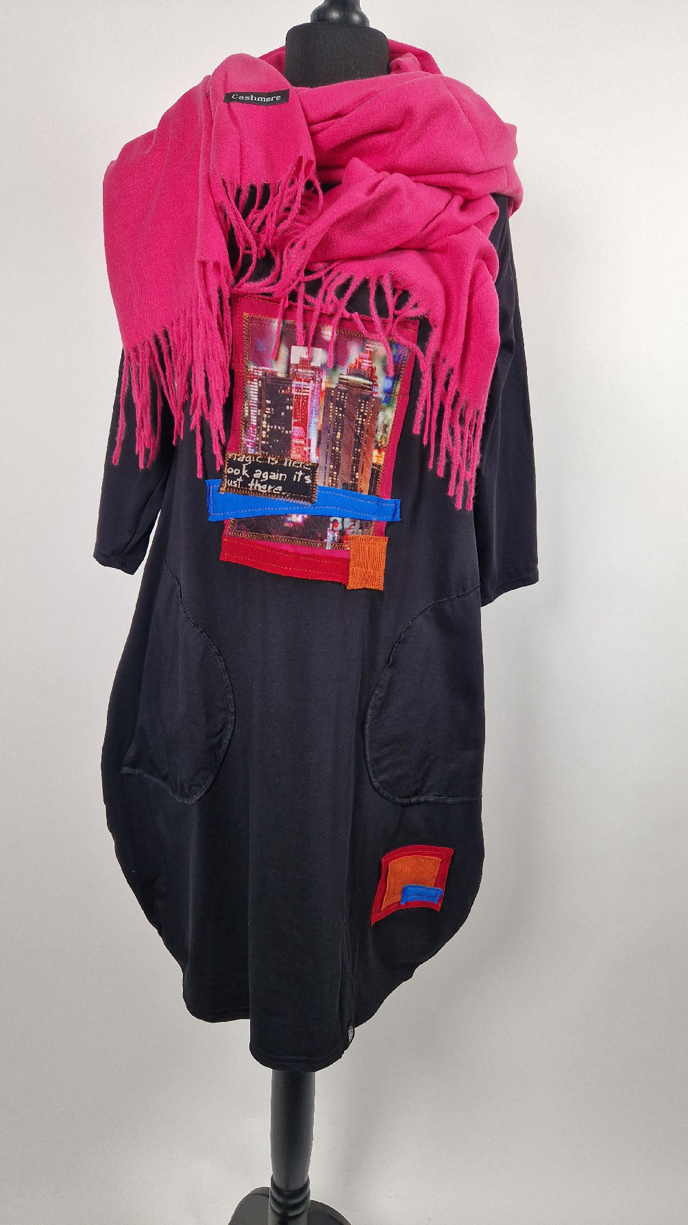 Czarna sukienka z rękawem 3/4 z unikatową aplikacją, uszyta z miękkiej bawełny typu jersey w kształcie, który pięknie ubierze Twoją sylwetkę, podkreślając to co trzeba lekko i luźno opływając pas i biodra; Każda aplikacja , każdy kolaż jest wykonany ręcznie, z różnych tkanin, koronek i cosiów. Każda sukienka jest niepowtarzalna, bo każdy kolaż jest inny.