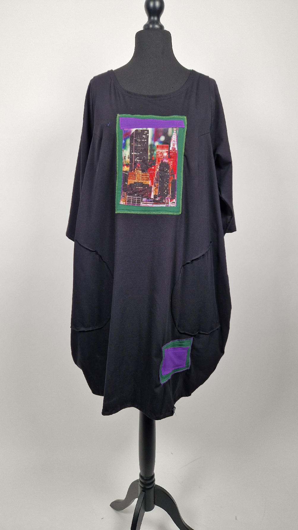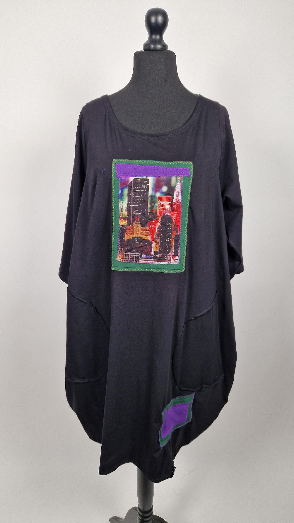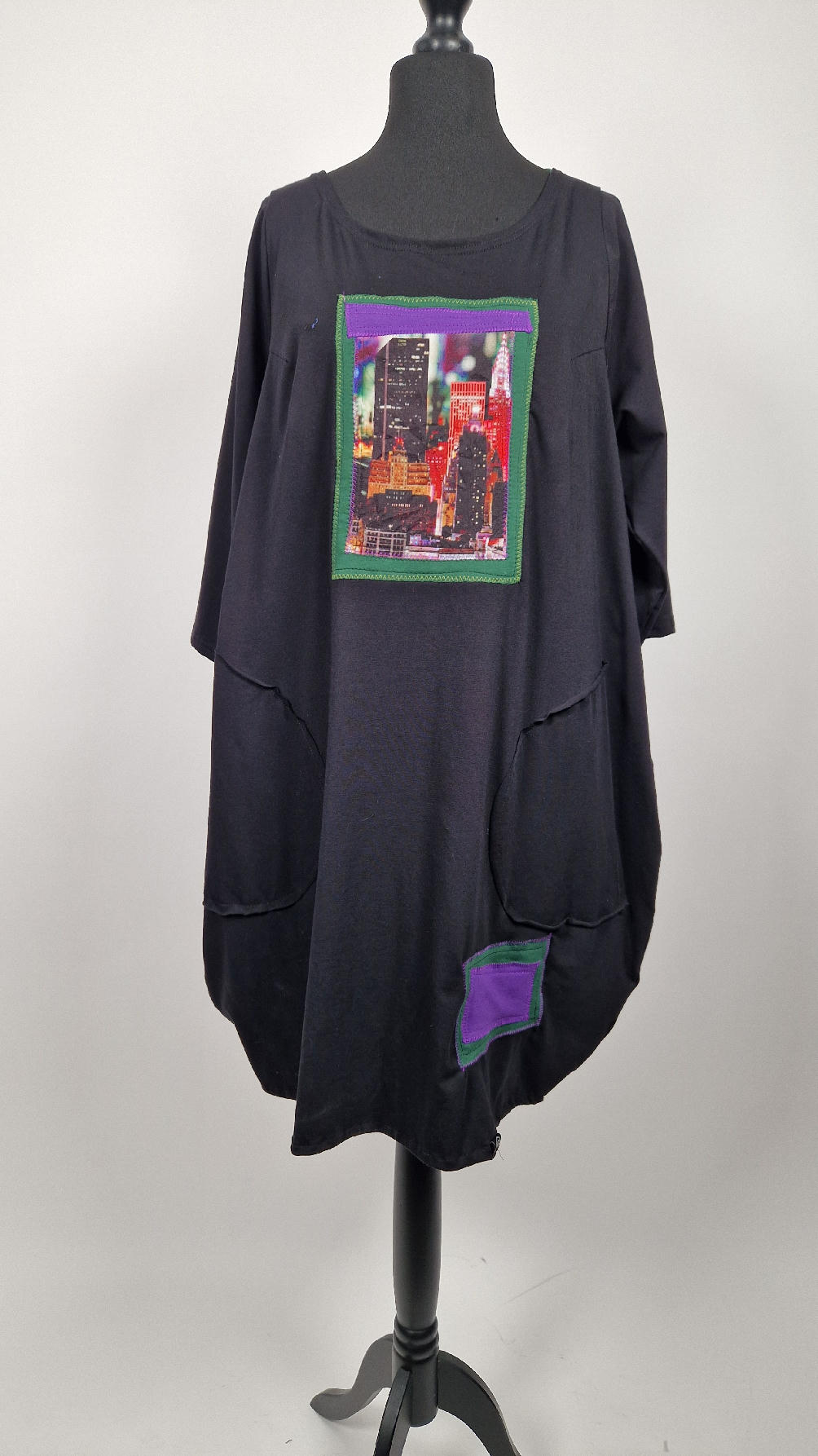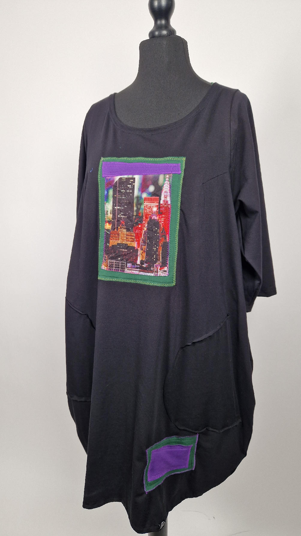 Czarna sukienka -Manhattan uszyta z bawełny typu jersey, uniwersalna i całoroczna, z rękawem 3/4…z przodu aplikacja-kolaż tkanin, unikatowy i jedyny dla każdej sukienki…