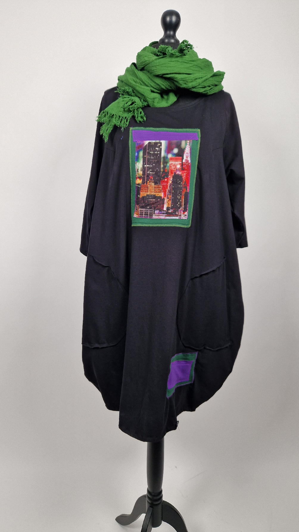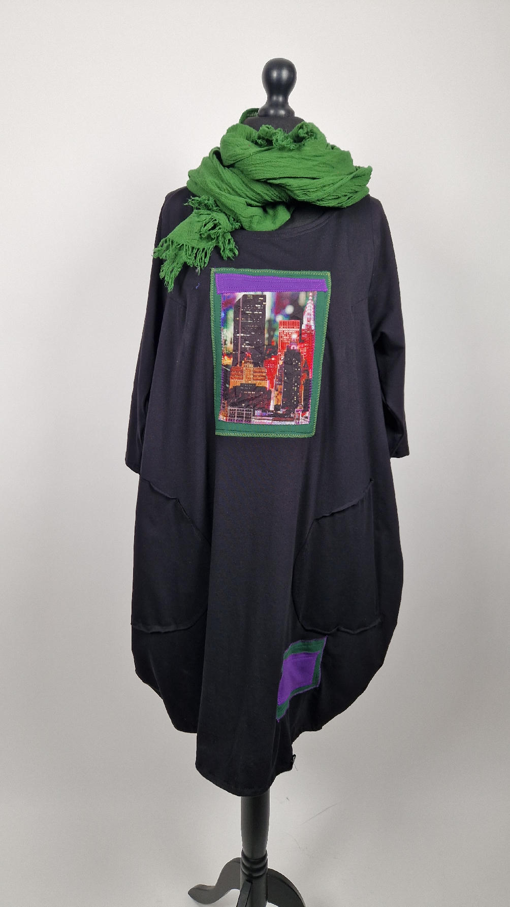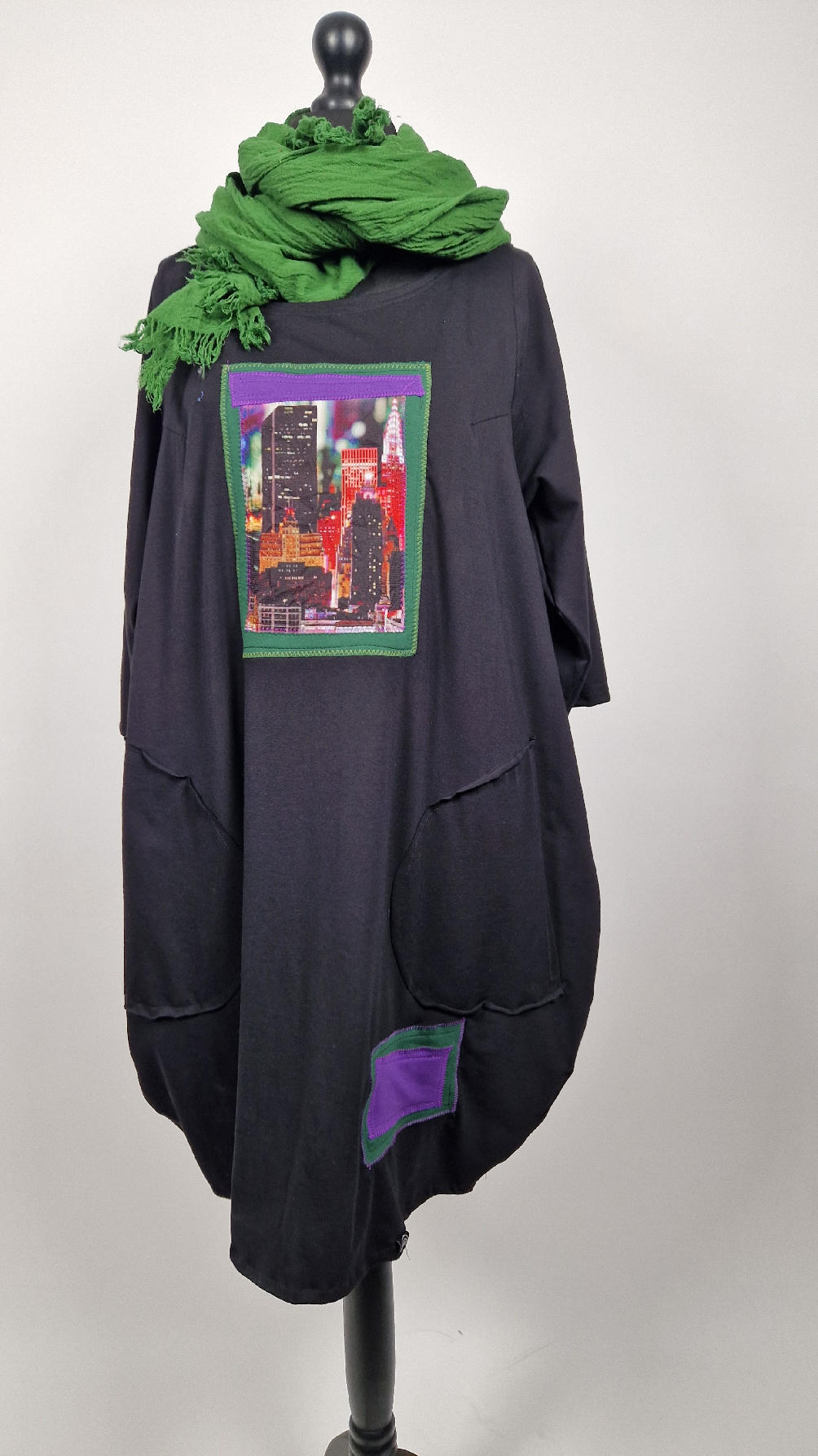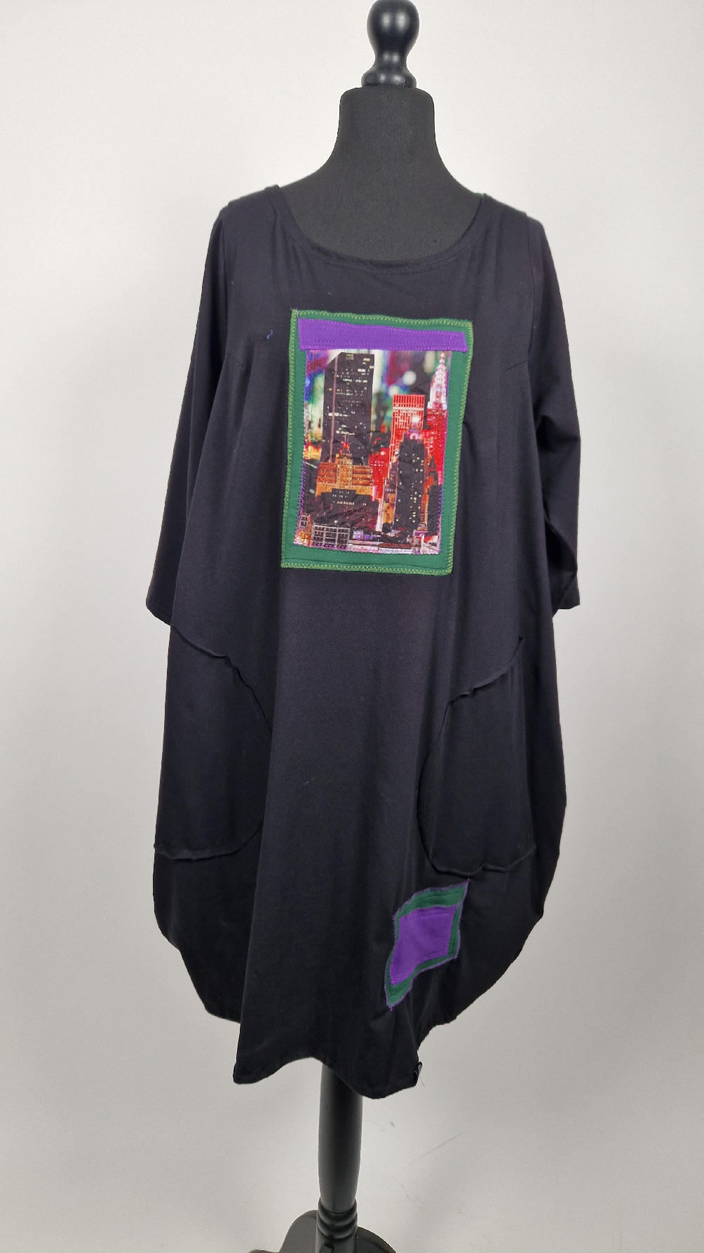 Czarna sukienka -Manhattan uszyta z bawełny typu jersey, uniwersalna i całoroczna, z rękawem 3/4…z przodu aplikacja-kolaż tkanin, unikatowy i jedyny dla każdej sukienki…