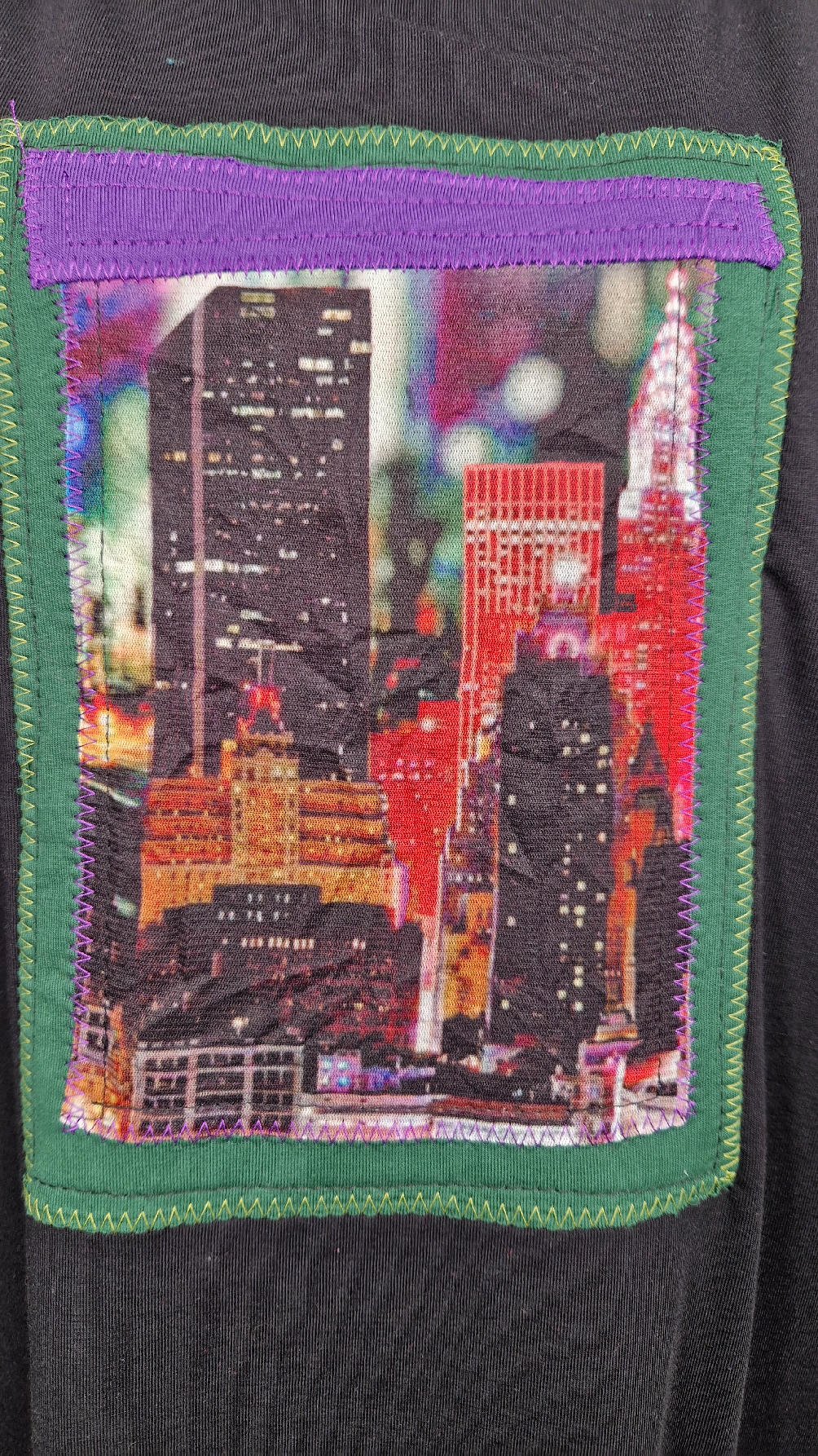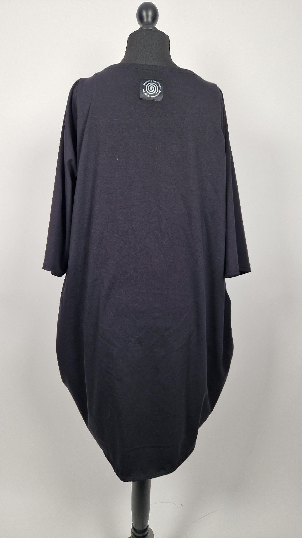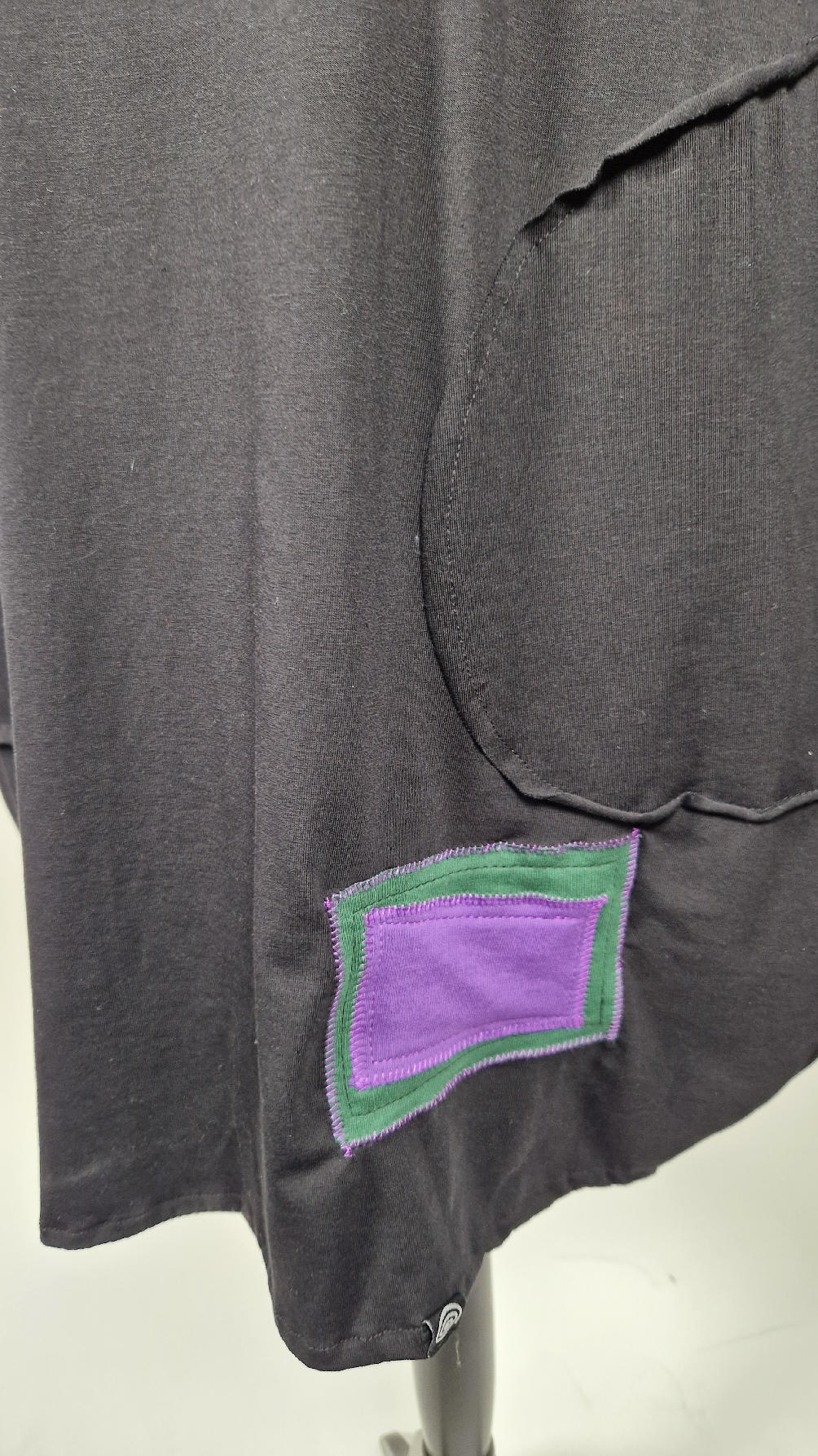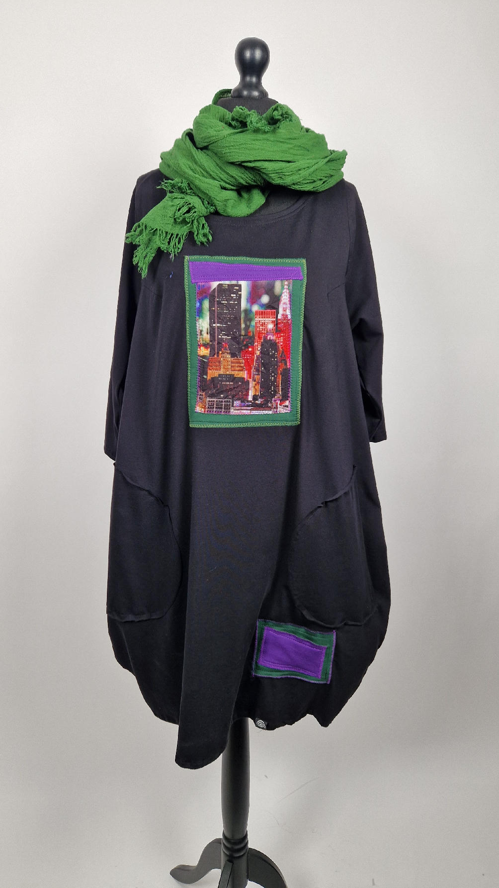 Czarna sukienka -Manhattan uszyta z bawełny typu jersey, uniwersalna i całoroczna, z rękawem 3/4…z przodu aplikacja-kolaż tkanin, unikatowy i jedyny dla każdej sukienki…