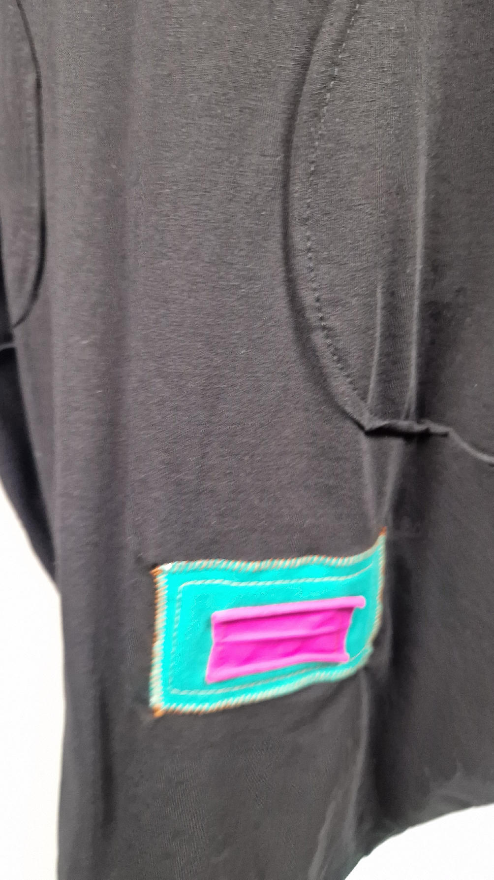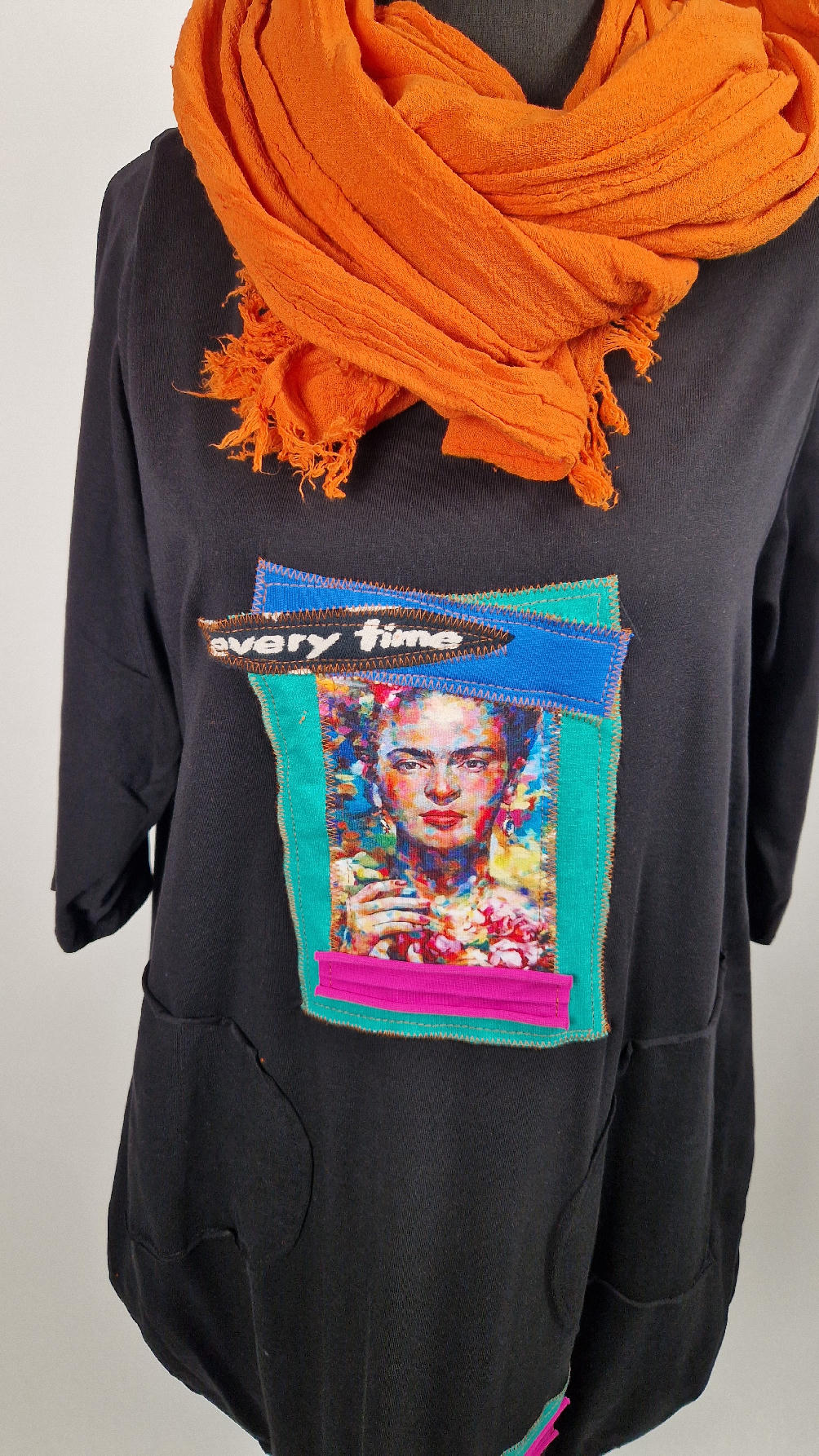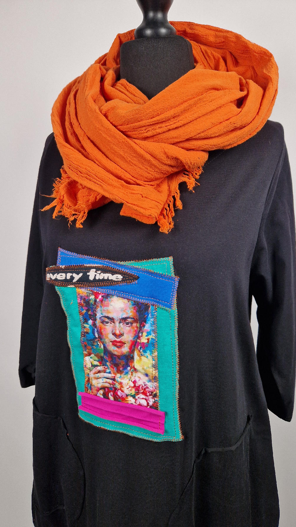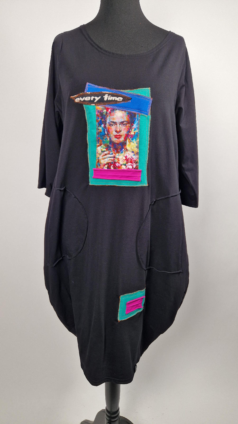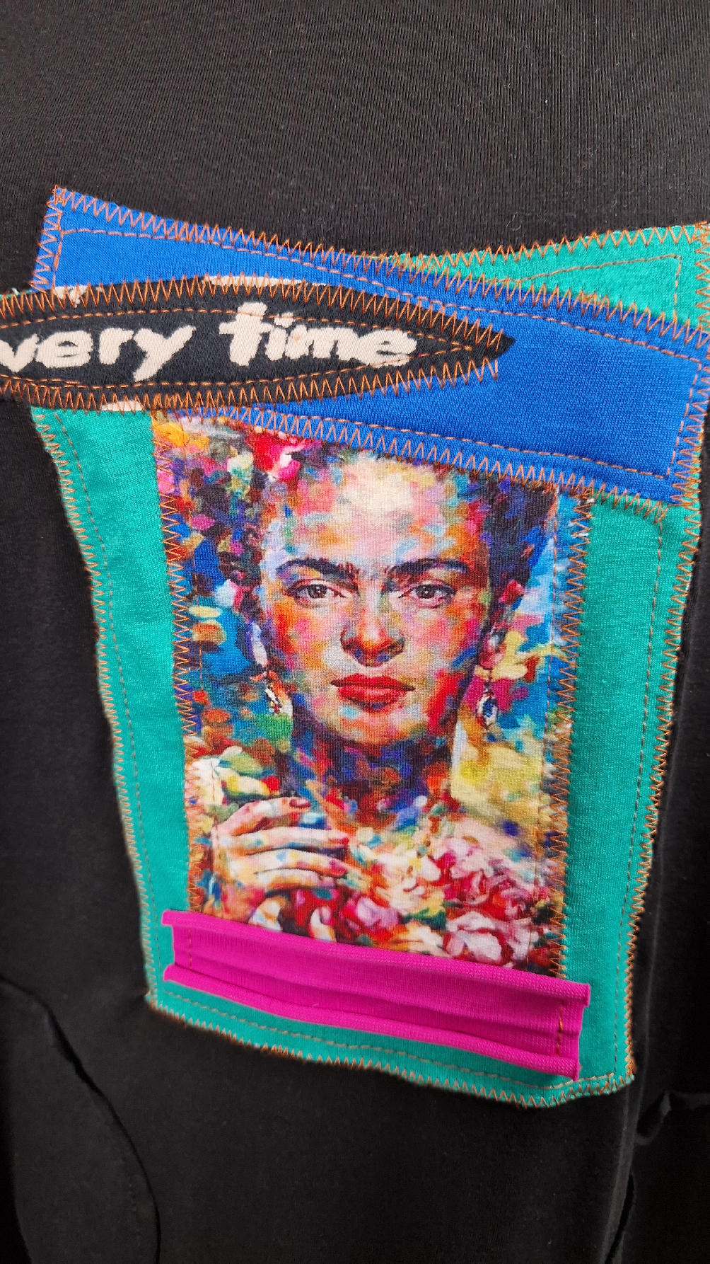 Bawełniana sukienka, w kształcie, który pięknie ubierze Twoją sylwetkę, podkreślając to co trzeba, lekko i luźno opływając pas i biodra;  z rękawem 3/4, z dużymi , wygodnymi kieszeniami, w których możesz schować dłonie. Z przodu duża aplikacja, kolaż z portretem Fridy. Każdy kolaż jest jeden i nie będzie drugiej identycznej sukienki.