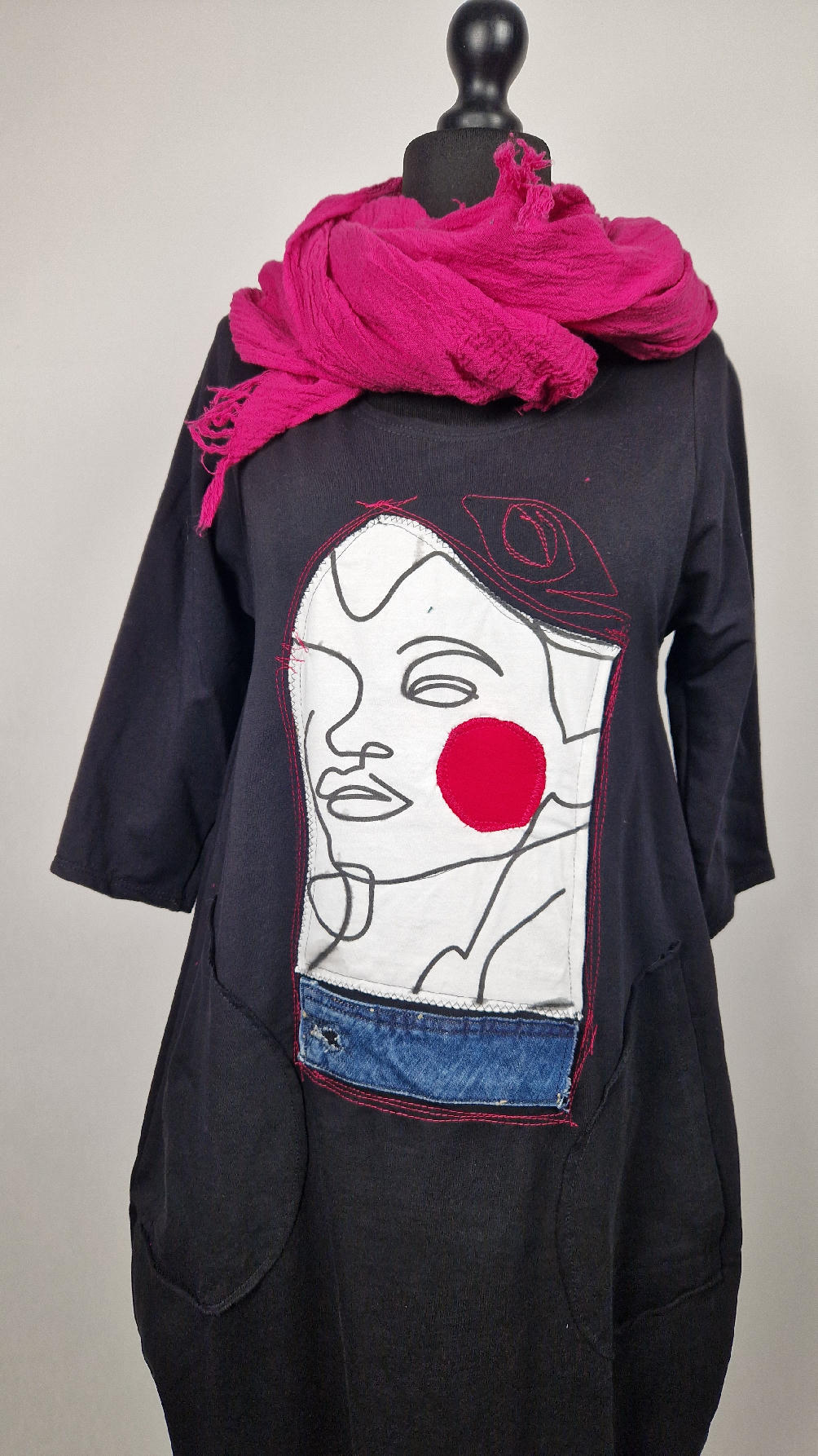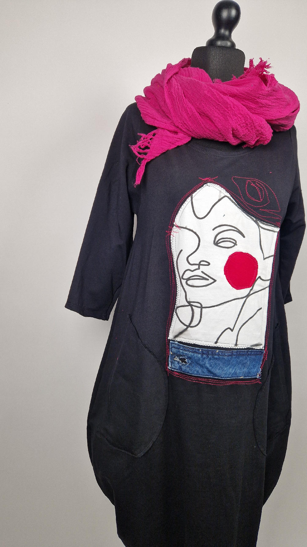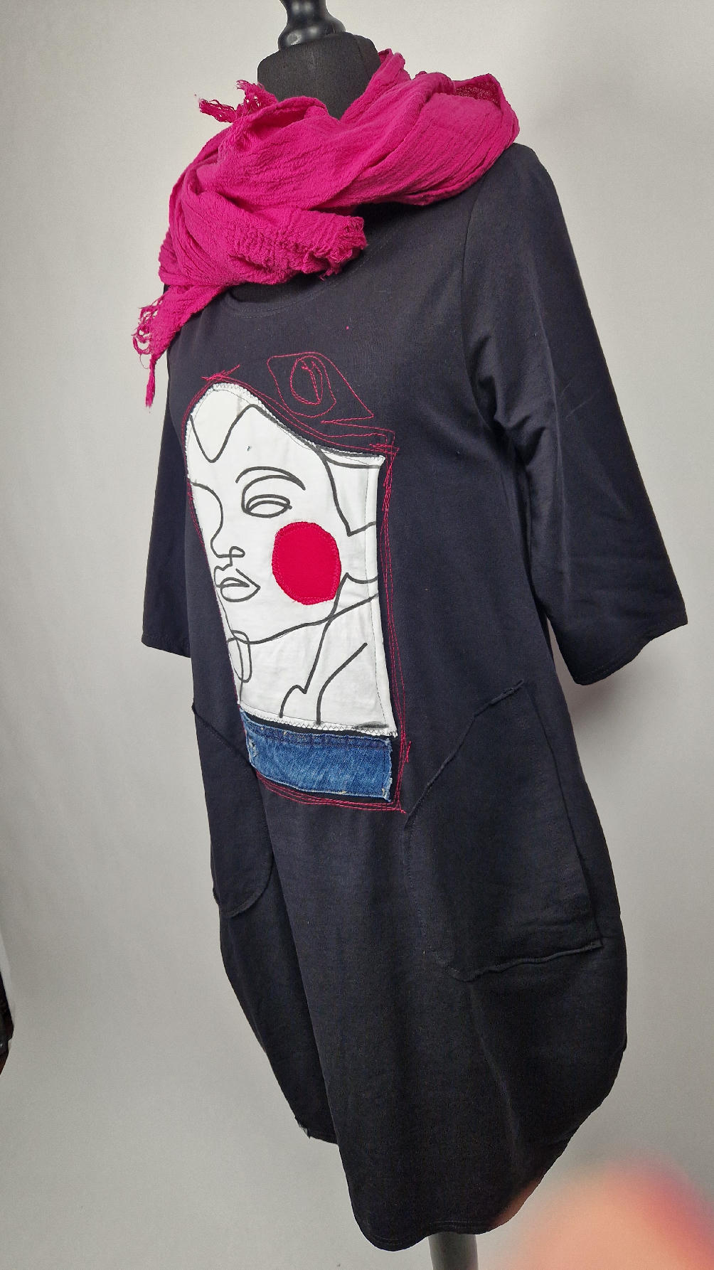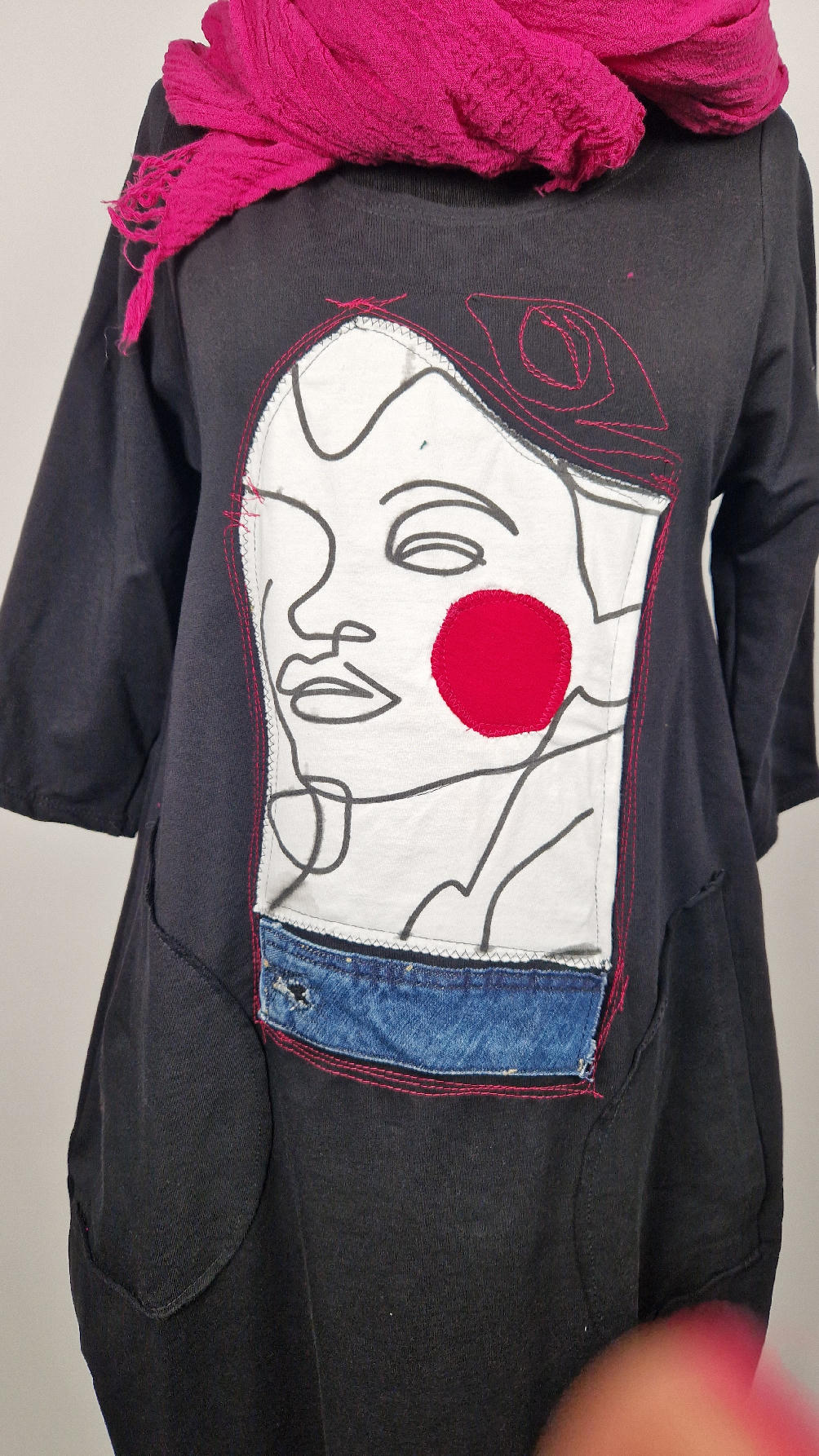 …sukienka z bawełny typu jersey, z rękawem 3/4 z dużymi kieszeniami, w których można schować ręce… sukienka ma dużą aplikację z przodu, która poprzeszywałam kontrastowa nitką, dołożyłam kawałek jeansu i kontrastową kropę w kolorze madżenty
