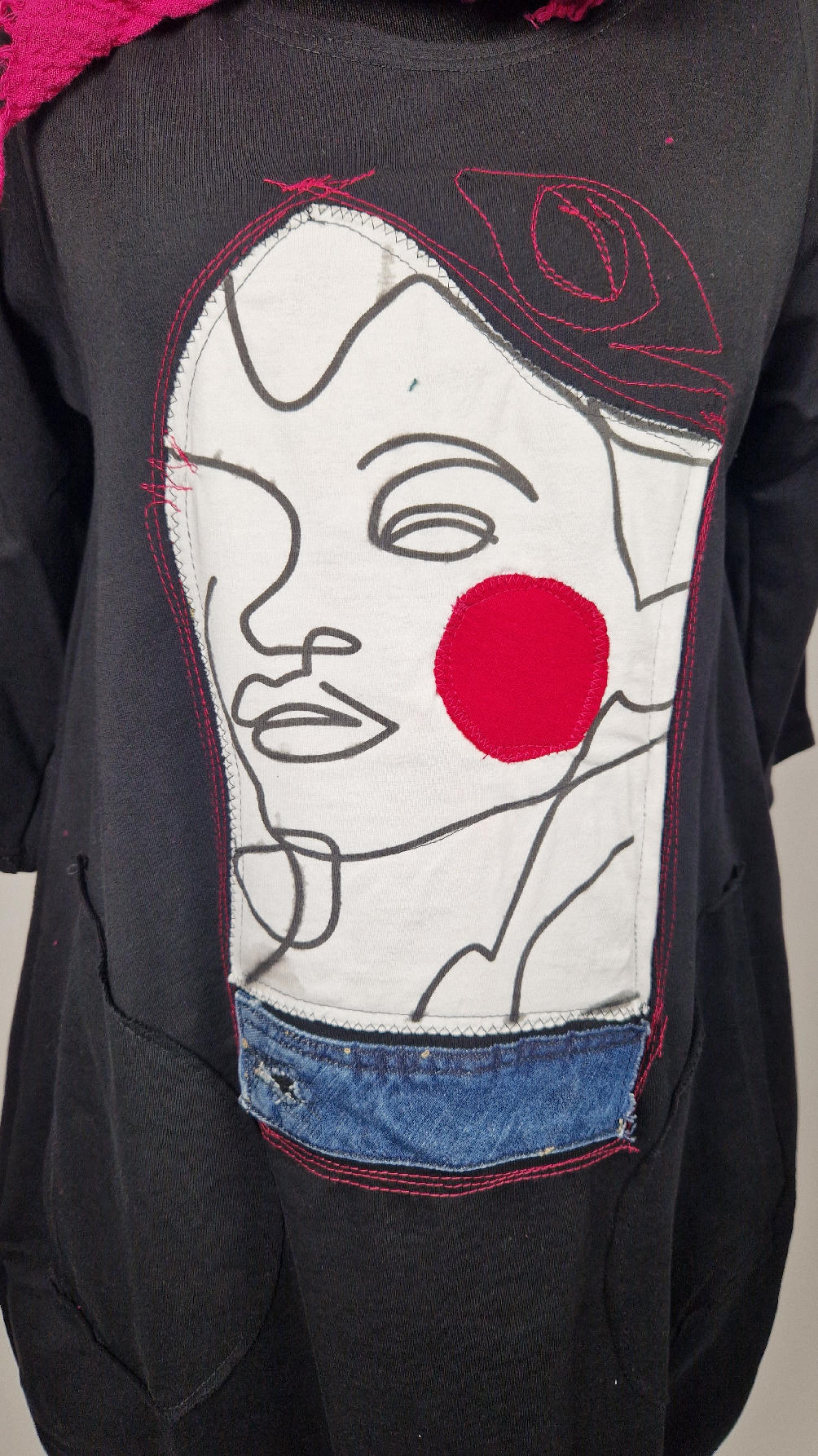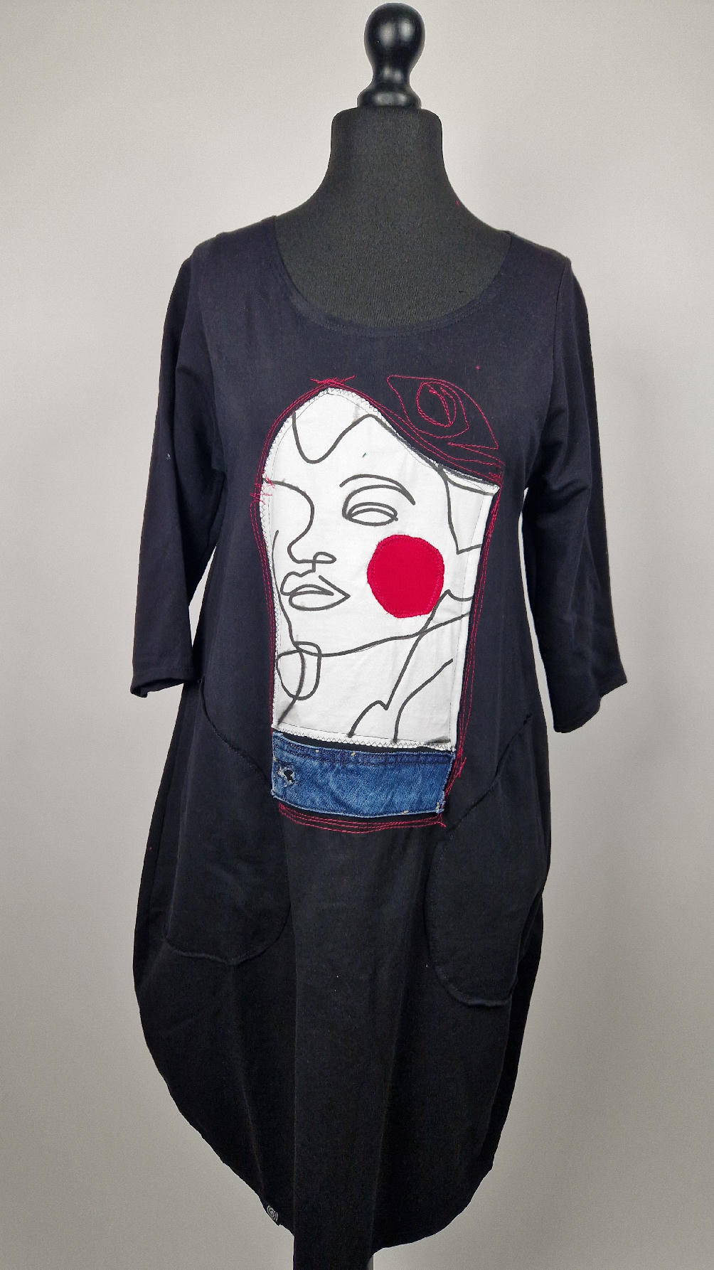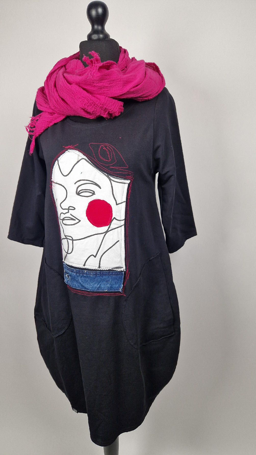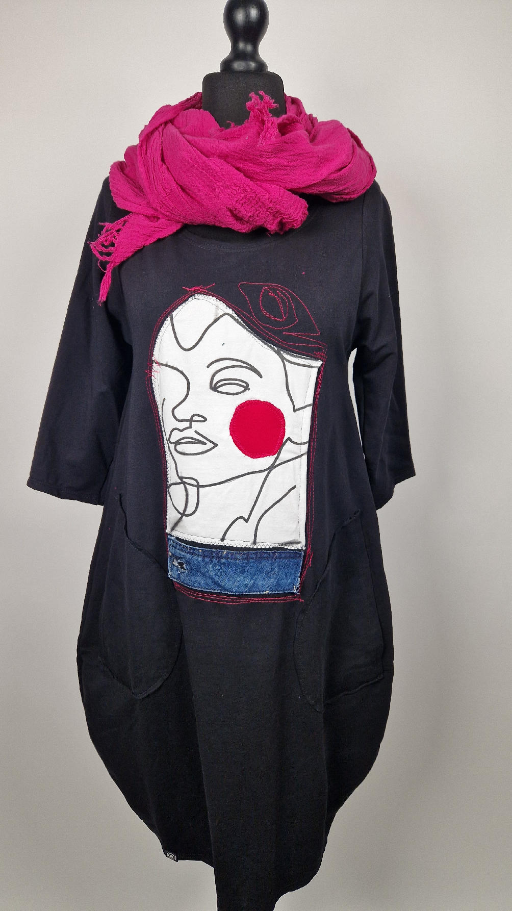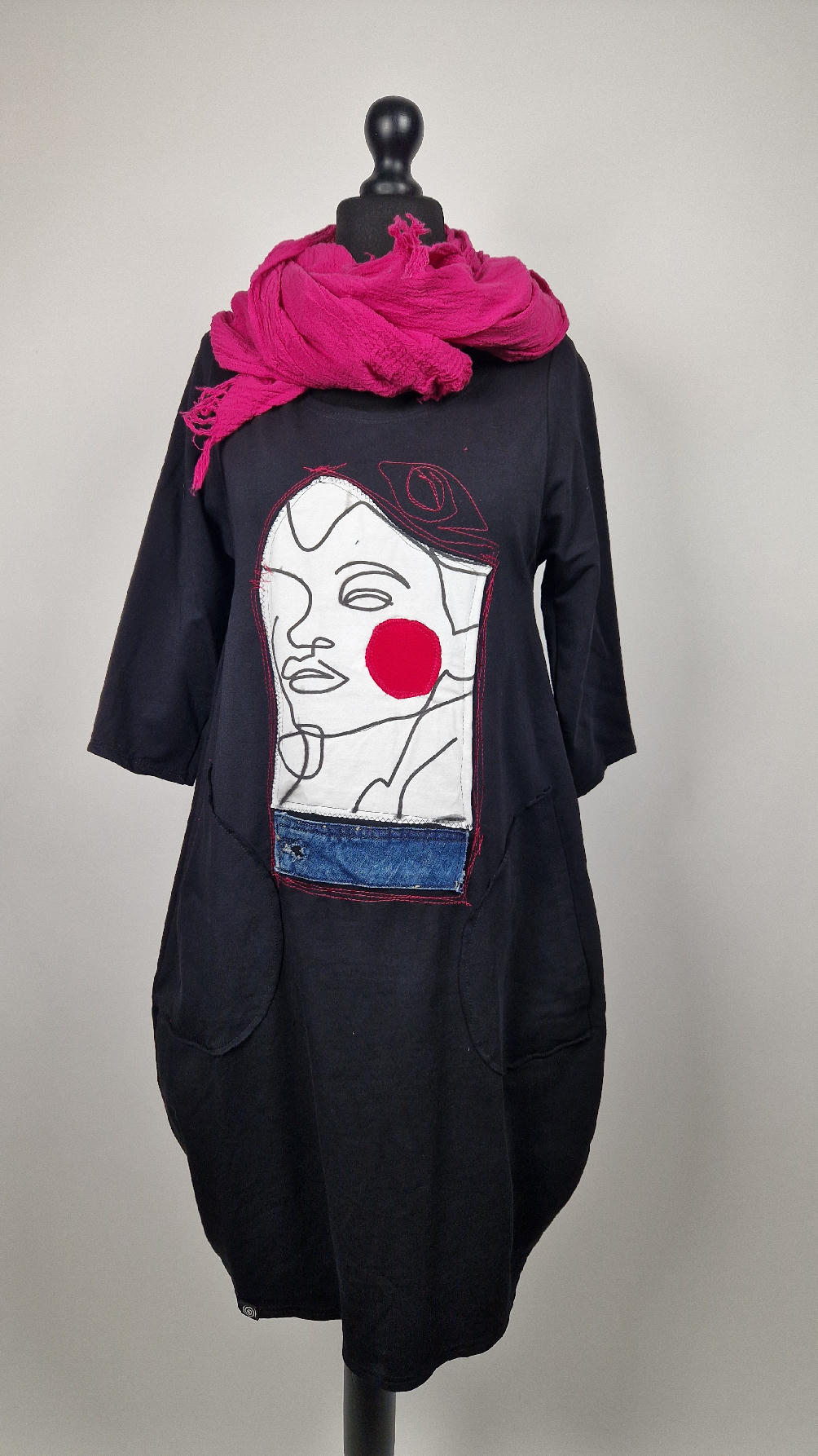…sukienka z bawełny typu jersey, z rękawem 3/4 z dużymi kieszeniami, w których można schować ręce… sukienka ma dużą aplikację z przodu, która poprzeszywałam kontrastowa nitką, dołożyłam kawałek jeansu i kontrastową kropę w kolorze madżenty