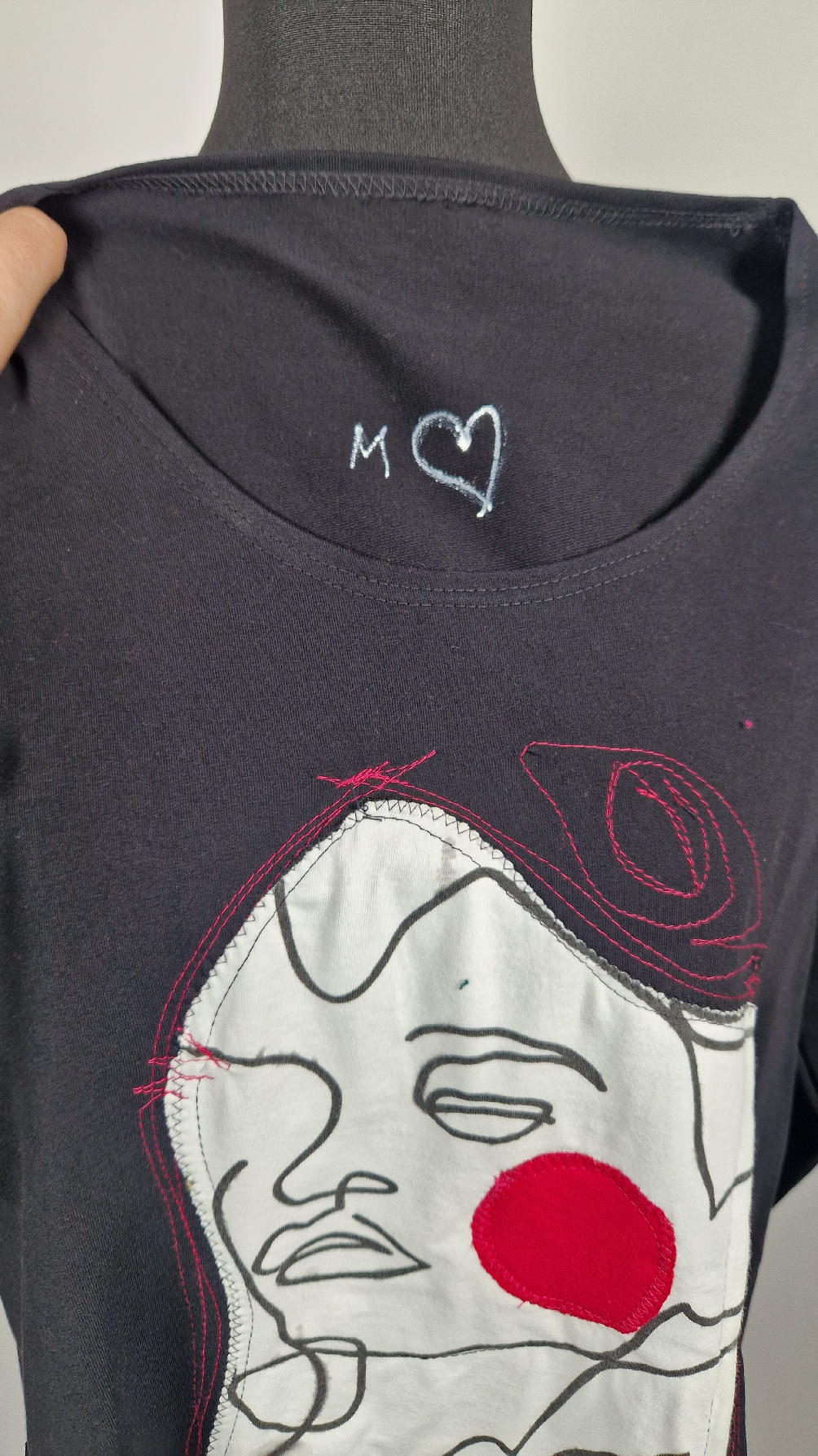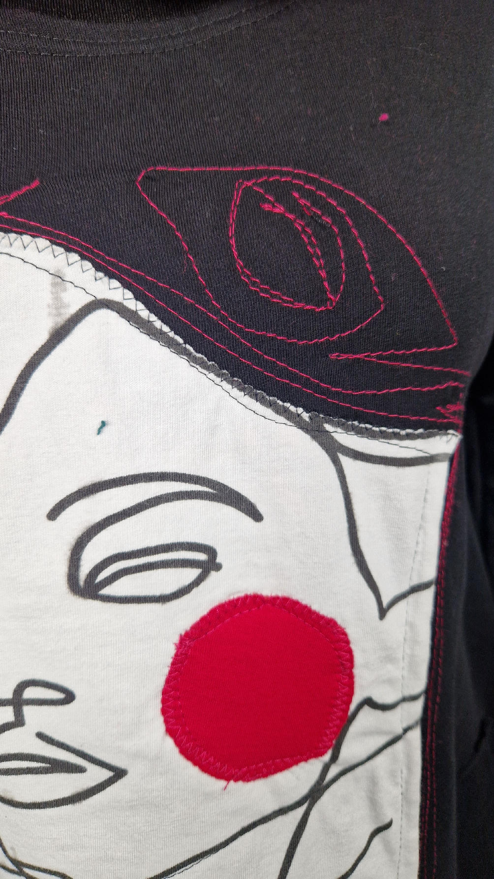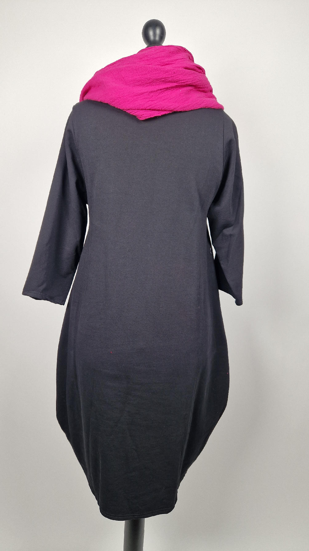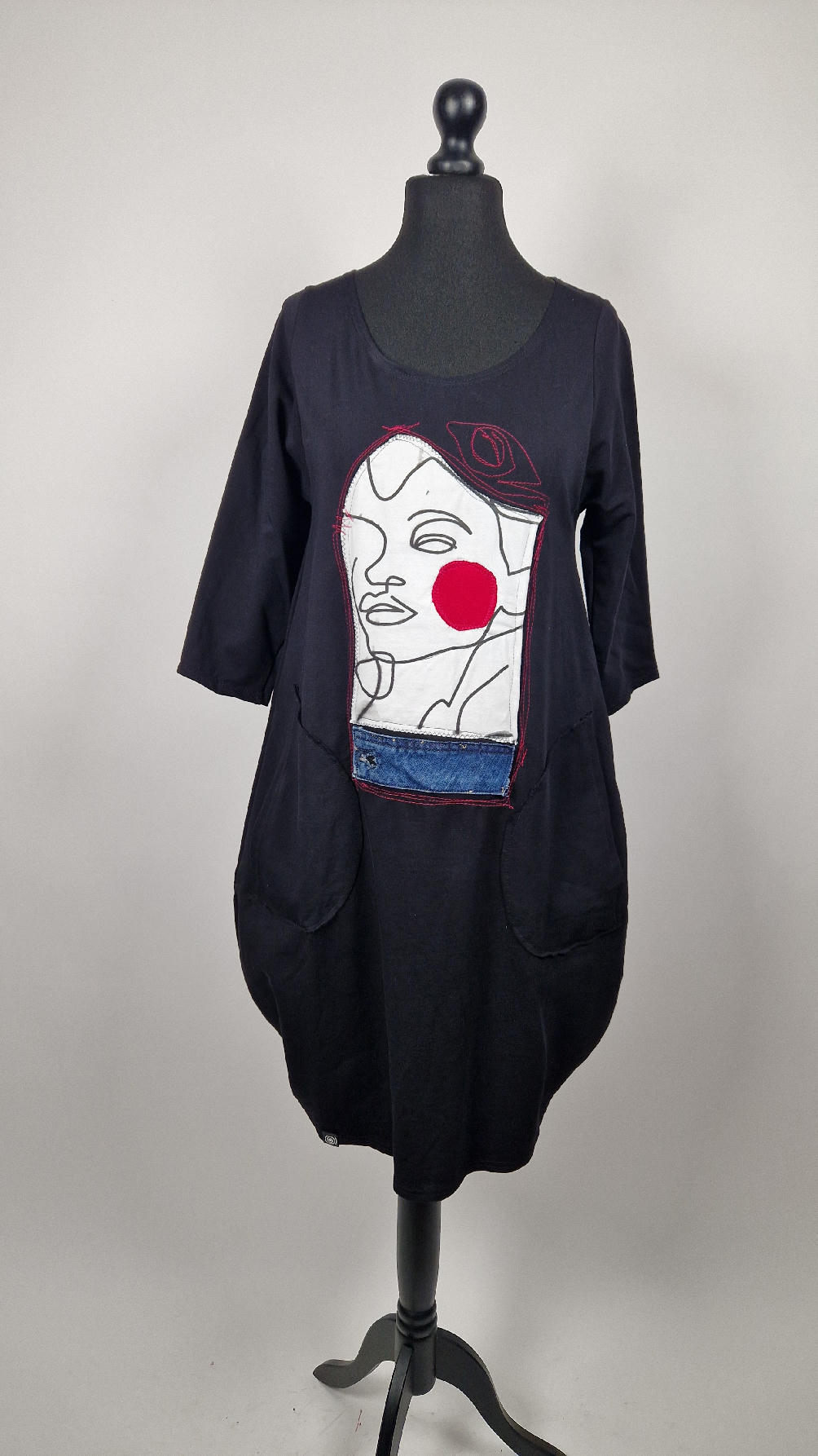 …sukienka z bawełny typu jersey, z rękawem 3/4 z dużymi kieszeniami, w których można schować ręce… sukienka ma dużą aplikację z przodu, która poprzeszywałam kontrastowa nitką, dołożyłam kawałek jeansu i kontrastową kropę w kolorze madżenty
