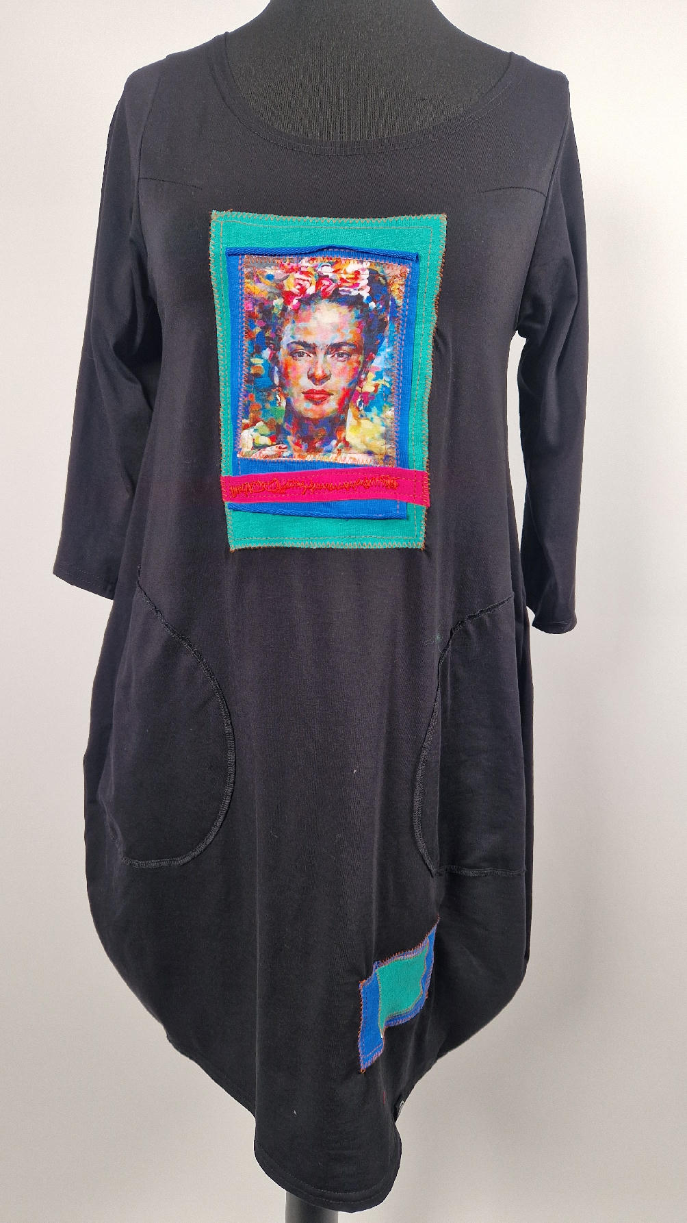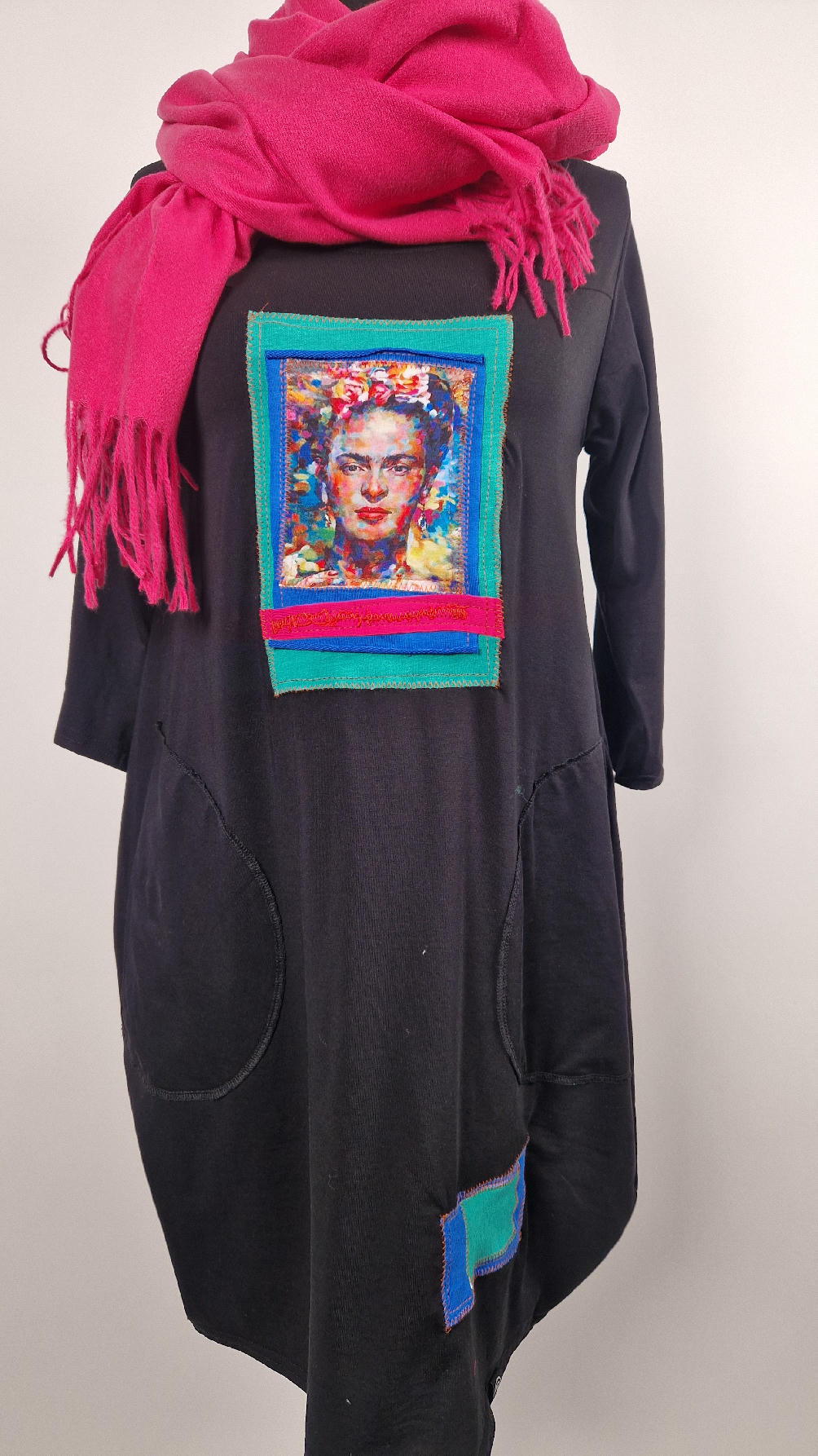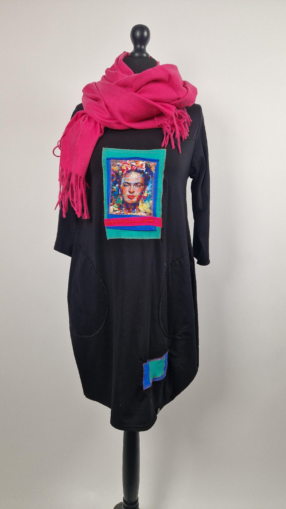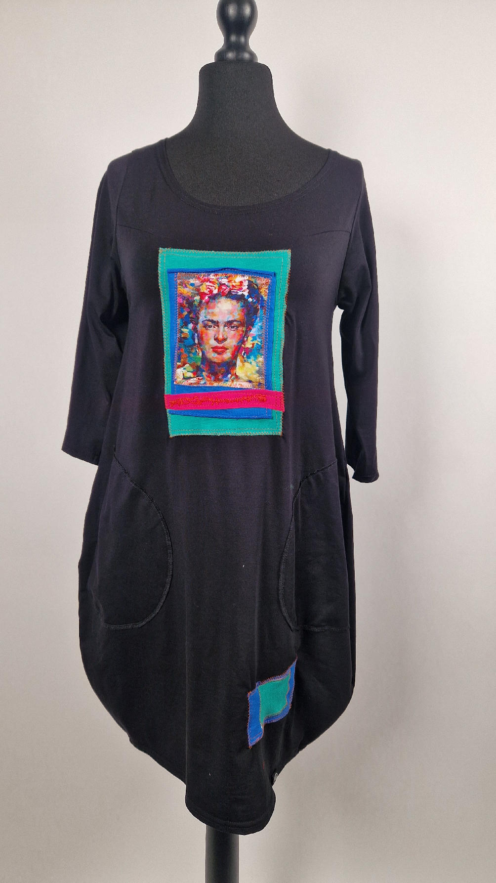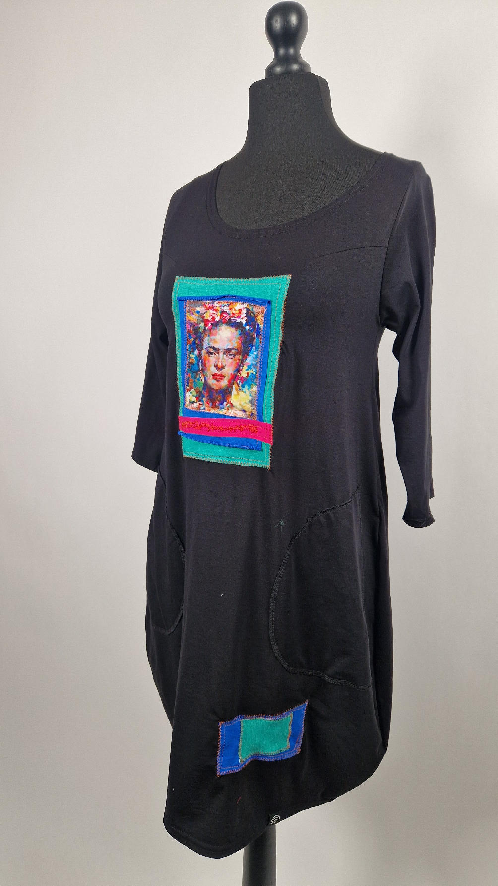Uszyta z bawełny typu jersey, bawełniana sukienka, w kształcie, który pięknie ubierze Twoją sylwetkę, podkreślając to co trzeba lekko i luźno opływając pas i biodra; z rękawem 3/4, z dużymi , wygodnymi kieszeniami, w których możesz schować dłonie, z unikatowa aplikacją