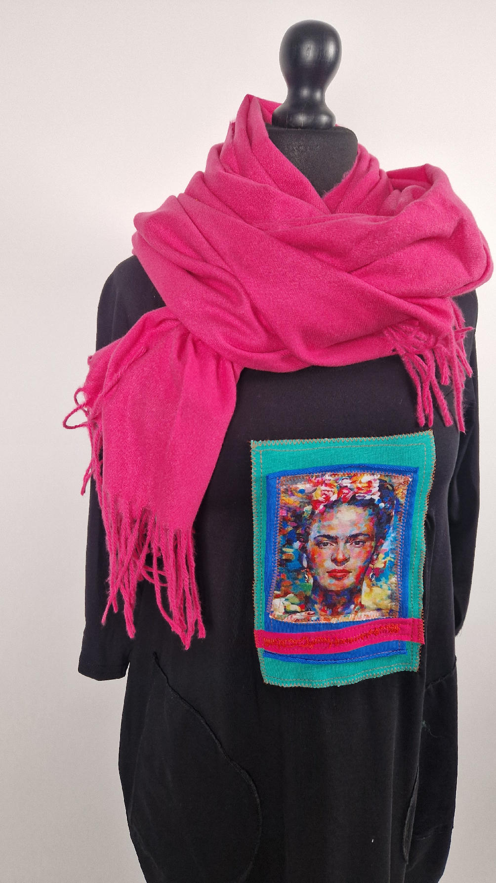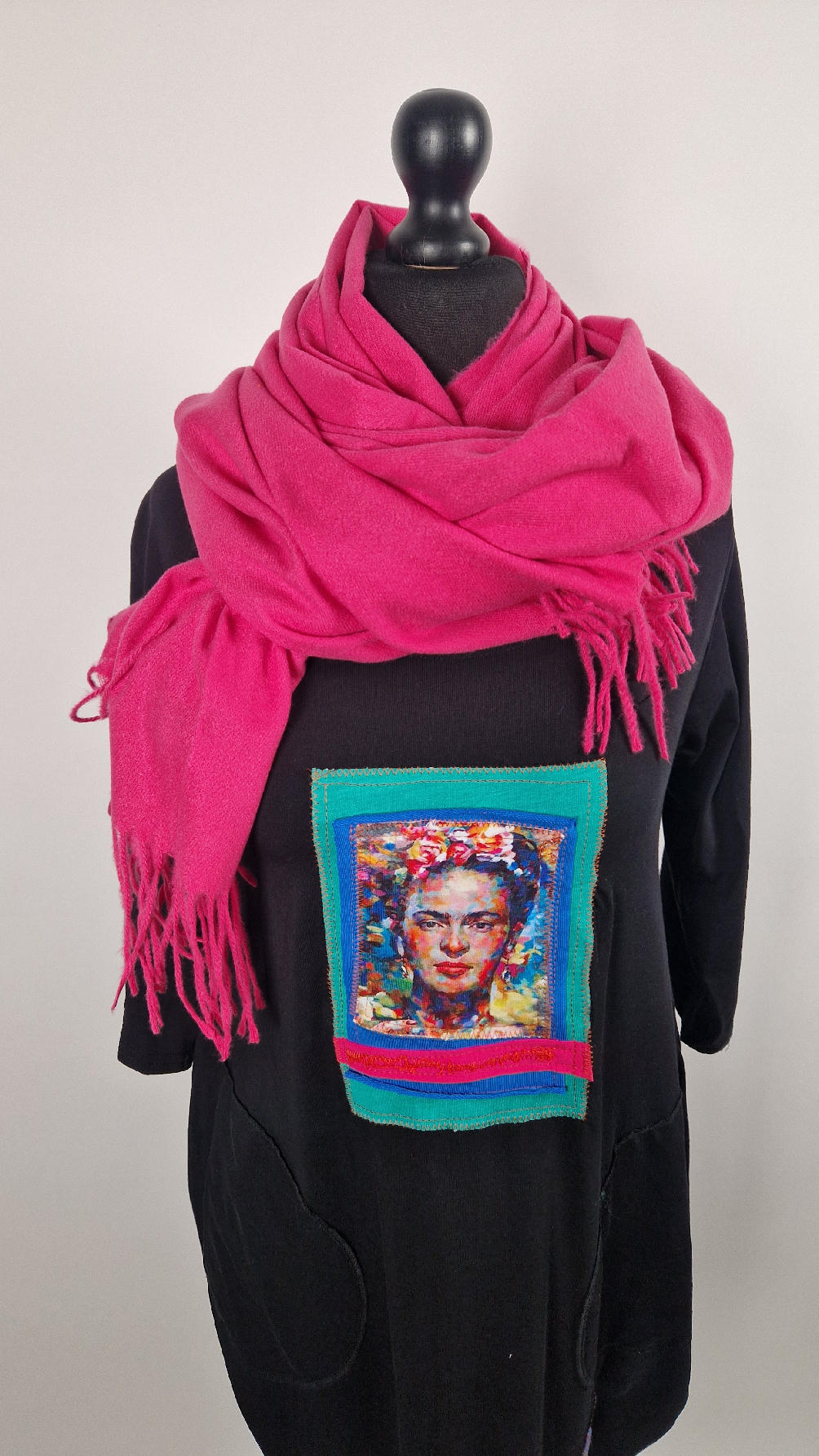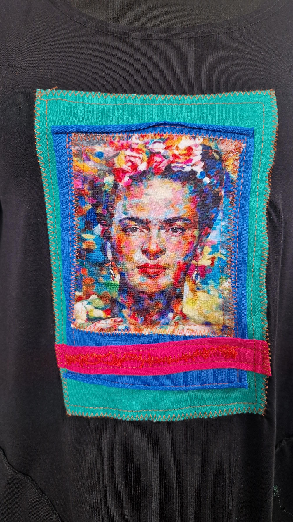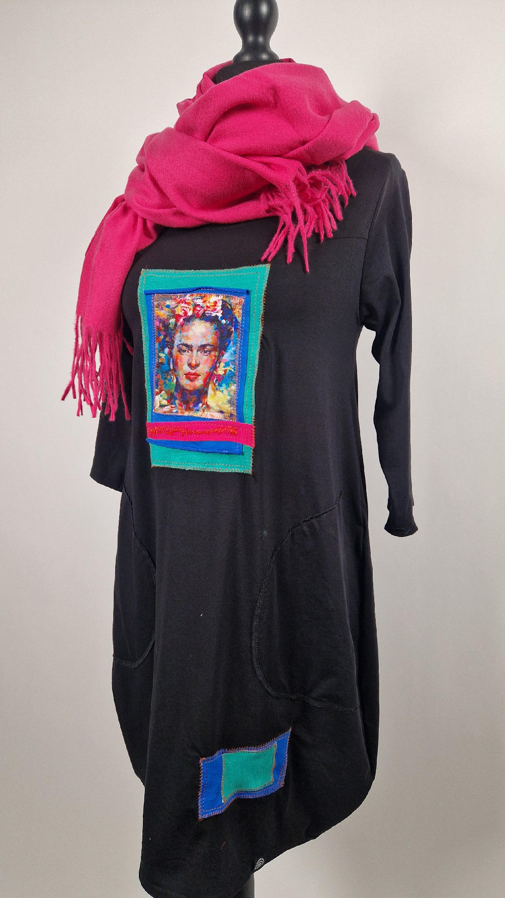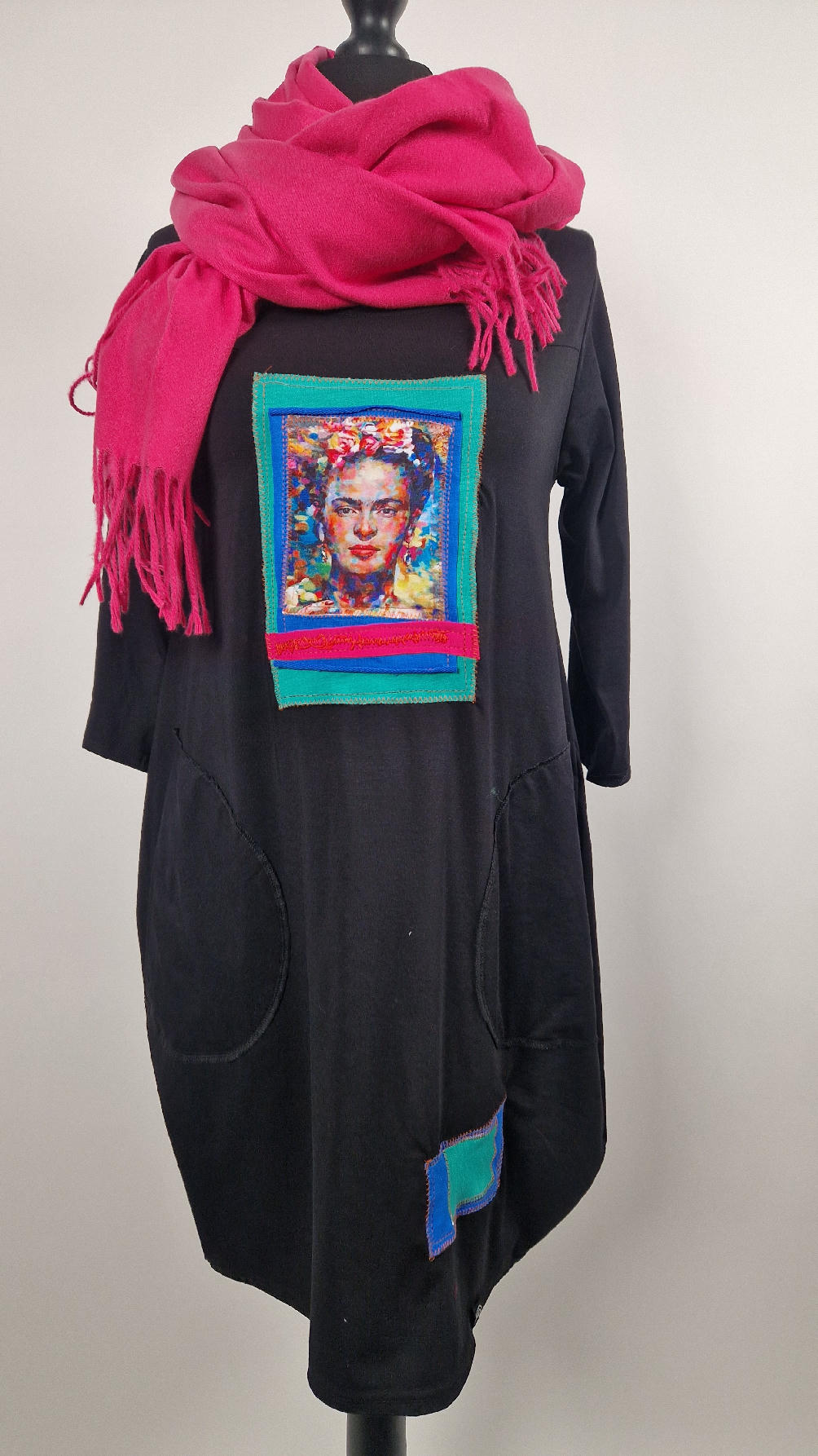 Uszyta z bawełny typu jersey, bawełniana sukienka, w kształcie, który pięknie ubierze Twoją sylwetkę, podkreślając to co trzeba lekko i luźno opływając pas i biodra; z rękawem 3/4, z dużymi , wygodnymi kieszeniami, w których możesz schować dłonie, z unikatowa aplikacją