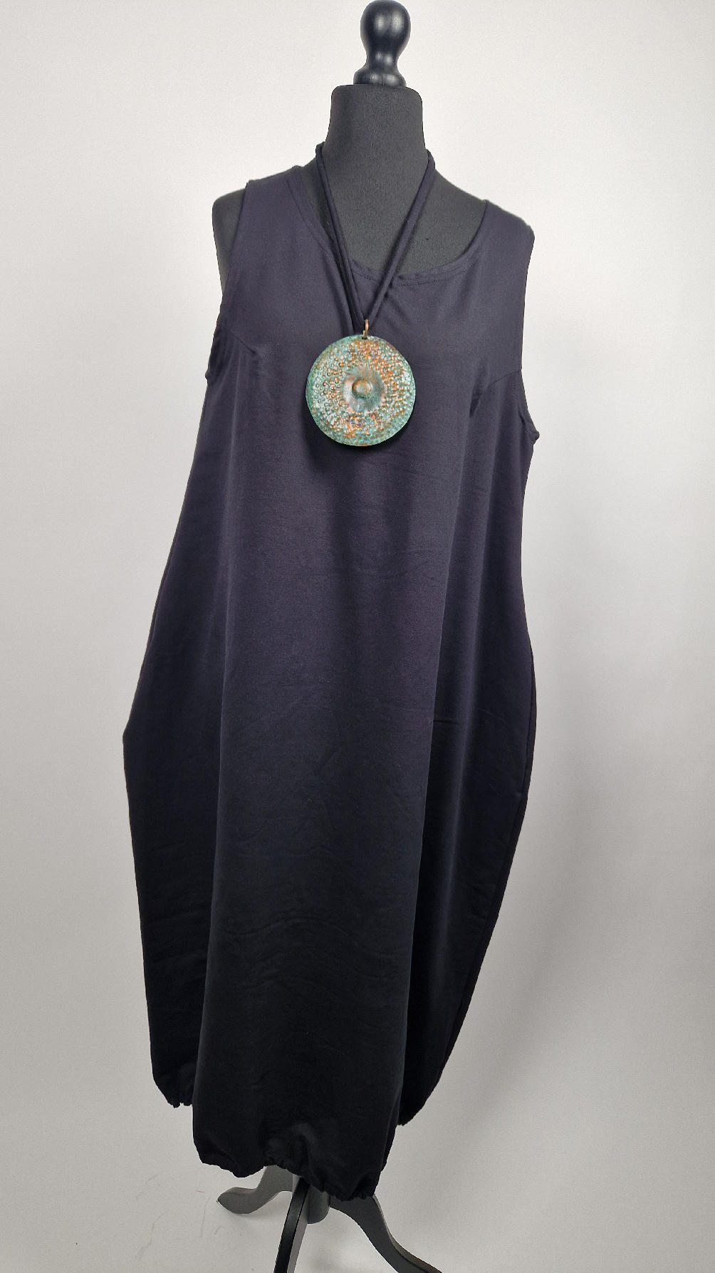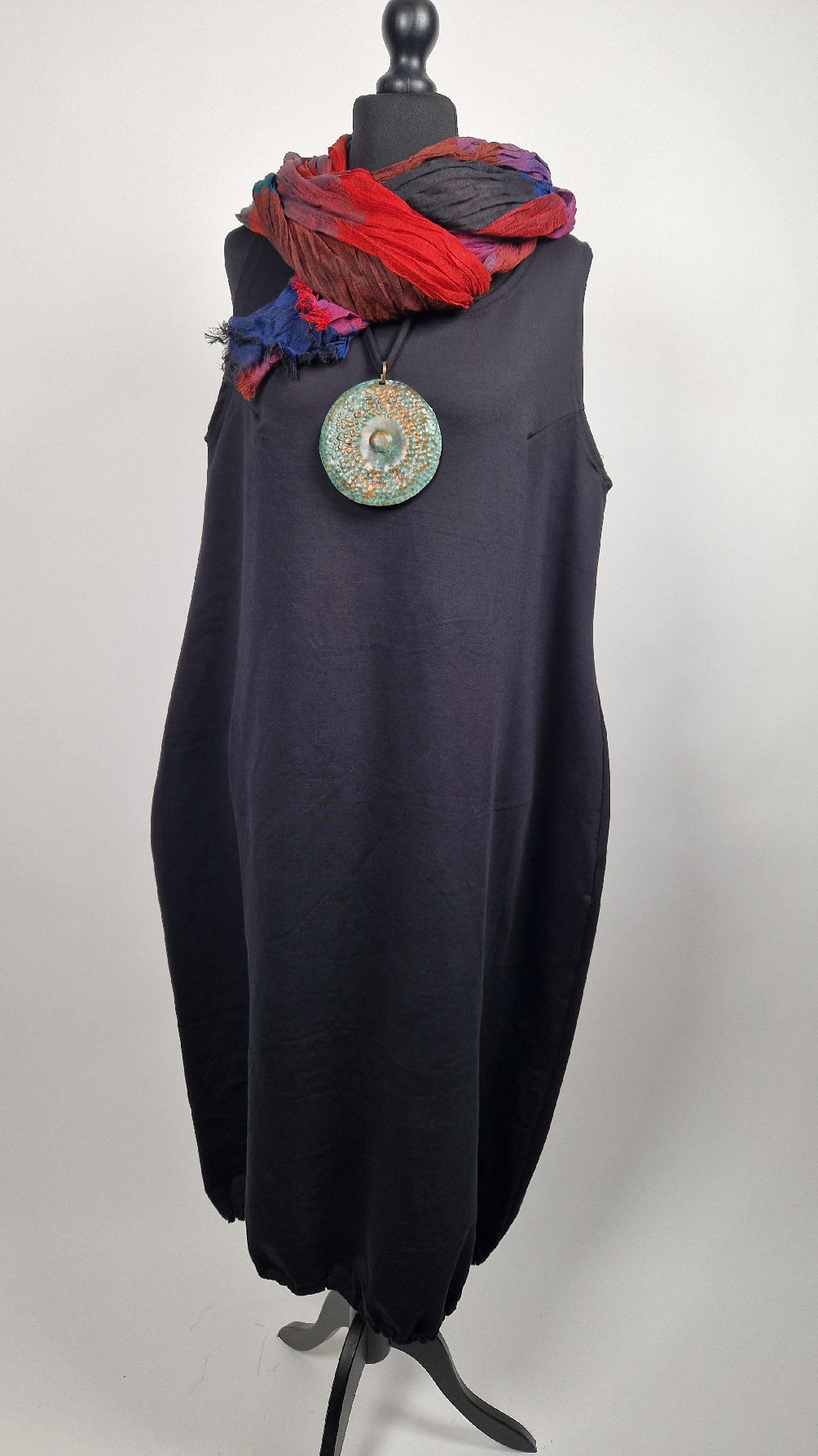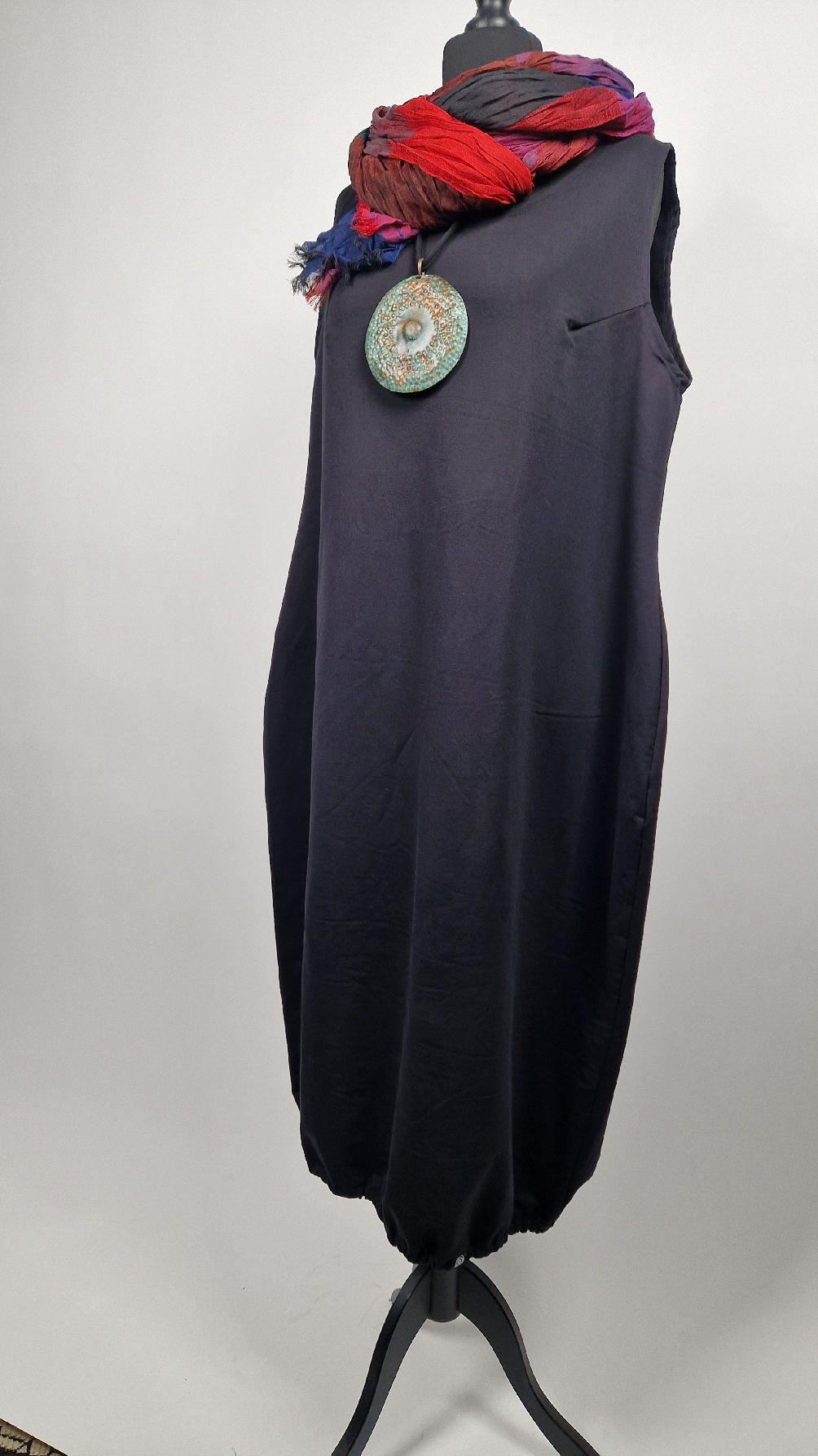 Taka jak moja idealna, ulubiona sukienka, Zuza, która bardzo często, a właściwie codziennie jest bazą do moich wszystkich stylizacji , ale ta jest dłuższa ma 120 cm, od ramienia do dołu. Zakrywa brzuch, a zazwyczaj chcemy go choć trochę zamaskować, chowa biodra, ale jeśli chcesz , możesz ją podciągnąć i zrobić bluzkę lub tunikę, wszyta na dole gumka, na pewno będzie się trzymać tu, gdzie chcesz…Sukienka jest idealna do wyeksponowania biżuterii, możesz do niej założyć wszystkie wisiory i naszyjniki i kolczyki…Możesz ją założyć oczywiście solo, jest idealna! Na tą czarną kieckę możesz zarzucić katanę, otulak, szalik- bo to jest po prostu sukienka idealna do wszystkiego, na lato, na zimę, do teatru, na wyjazd, do samolotu- sama sprawdź!
