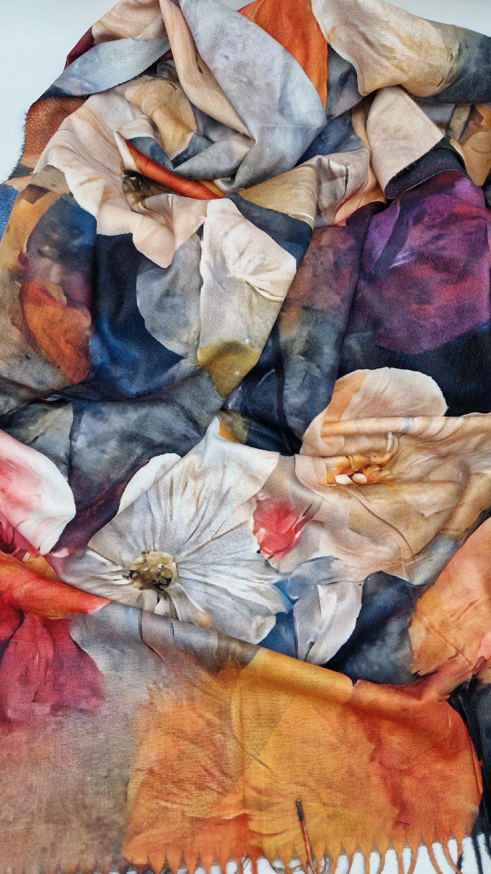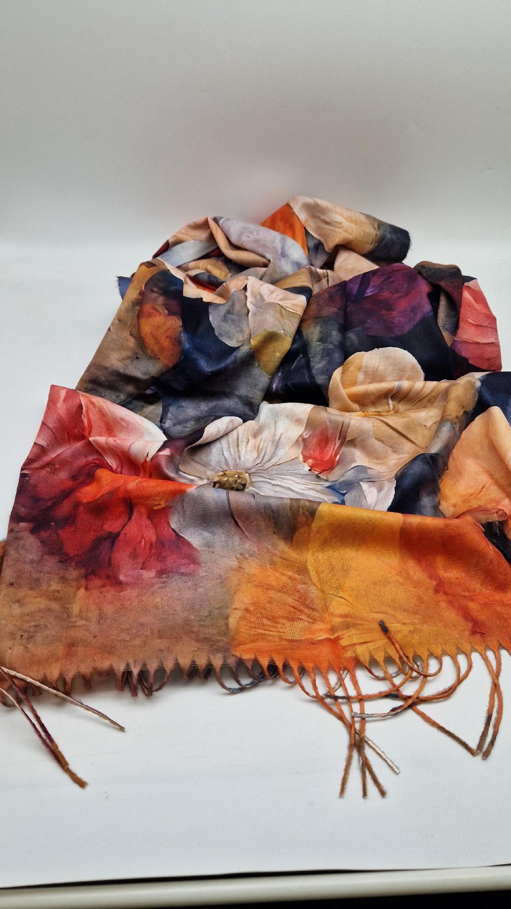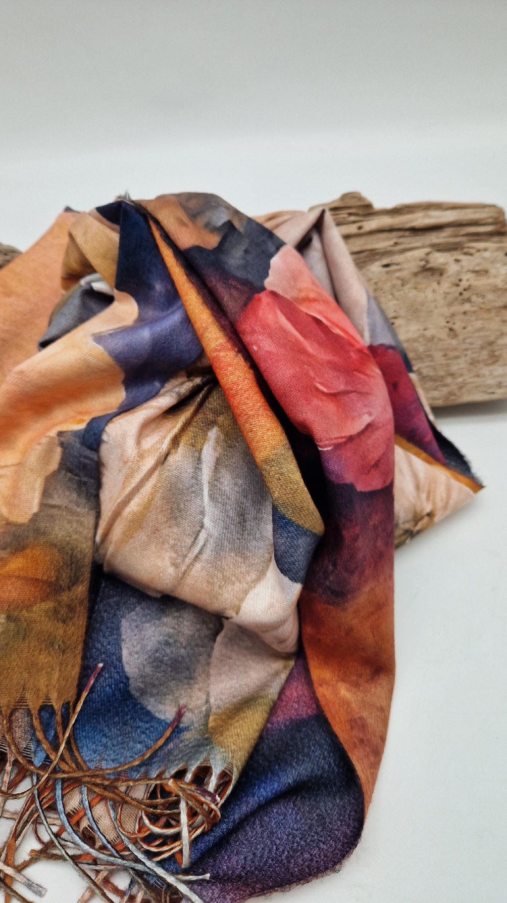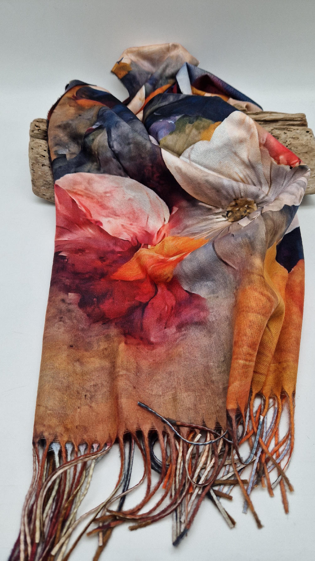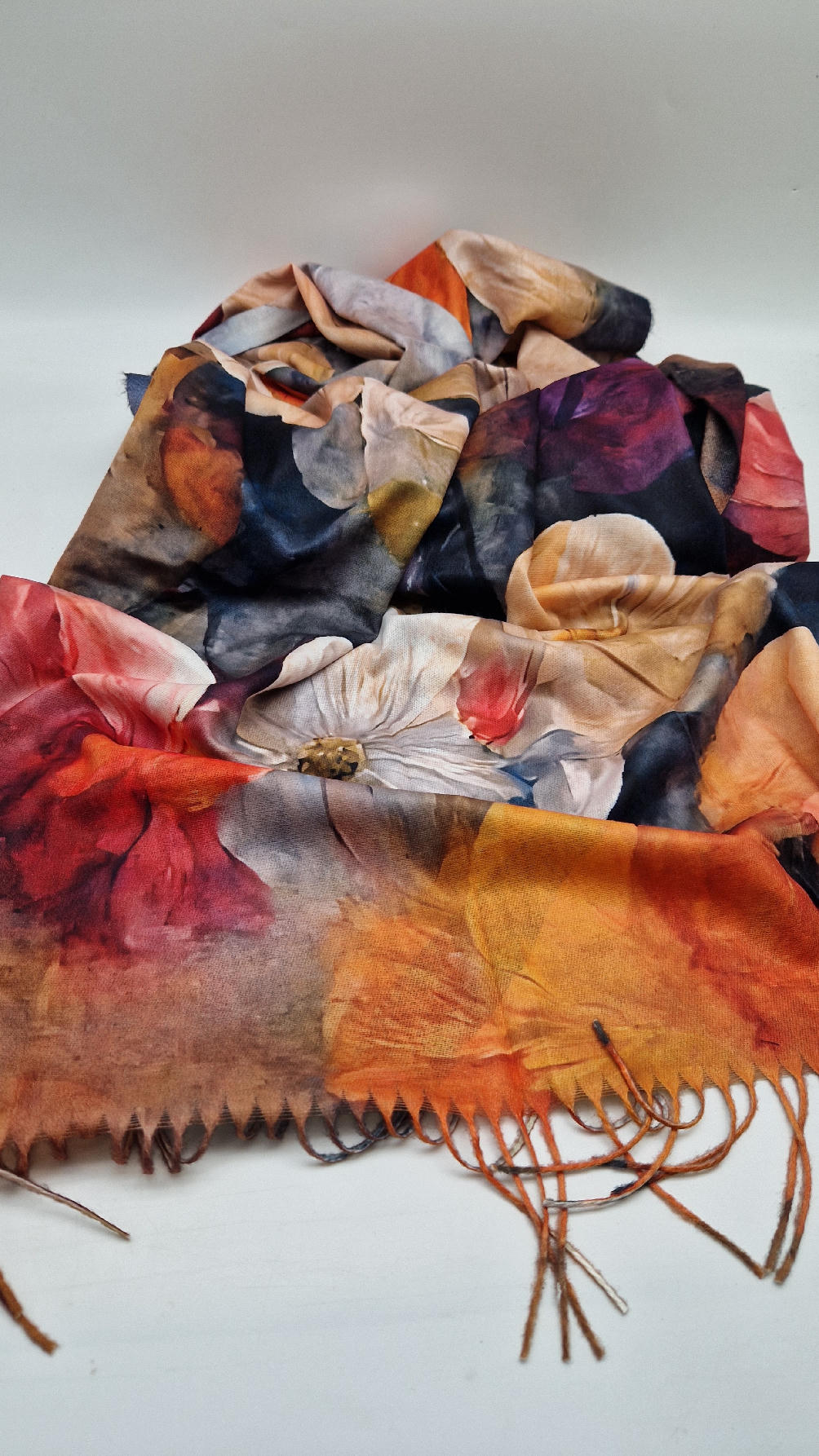 Duży, bardzo miękki, kaszmirowy, kolorowy, ale taki dystyngowanie….piękny i elegancki szal w kwiaty . Szalik jest super miękki, niegryzący, nie taki bardzo gruby..taki idealny . Świetnie zestawione kolory, energetyczne i eleganckie zarazem.