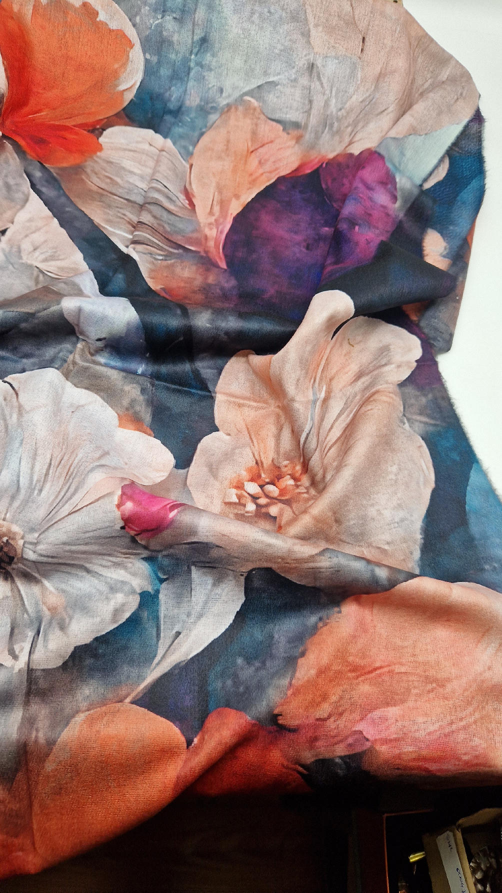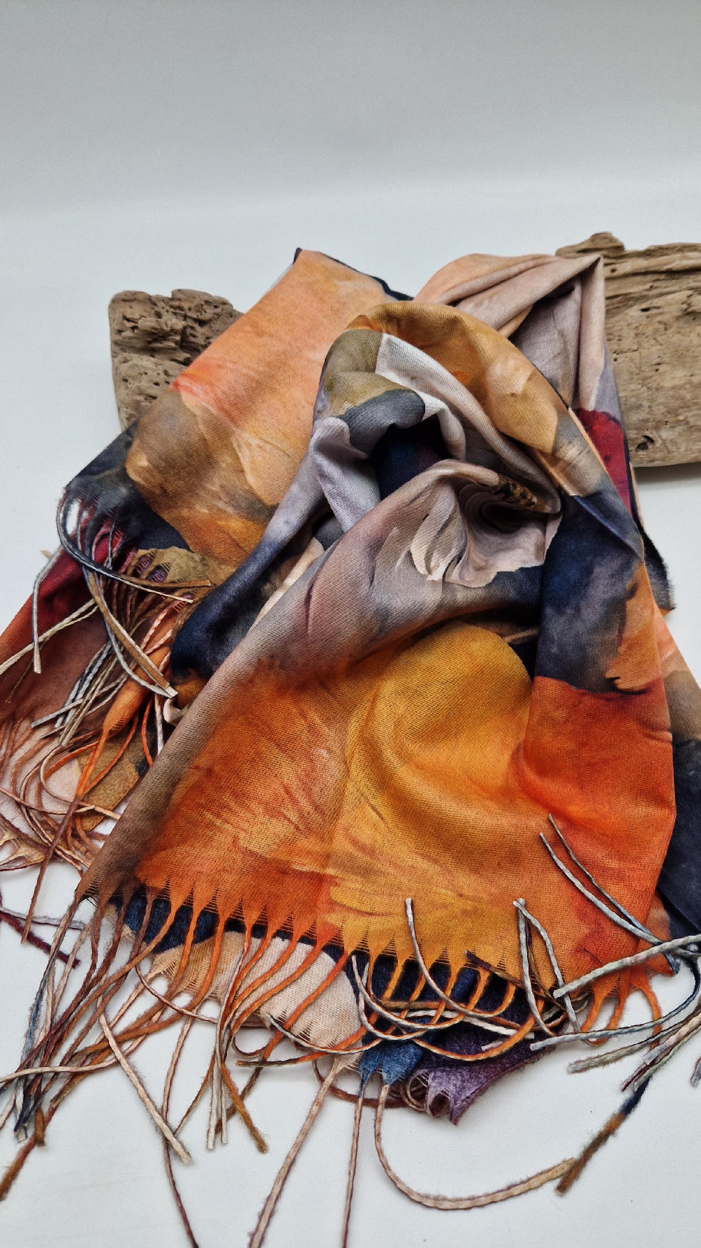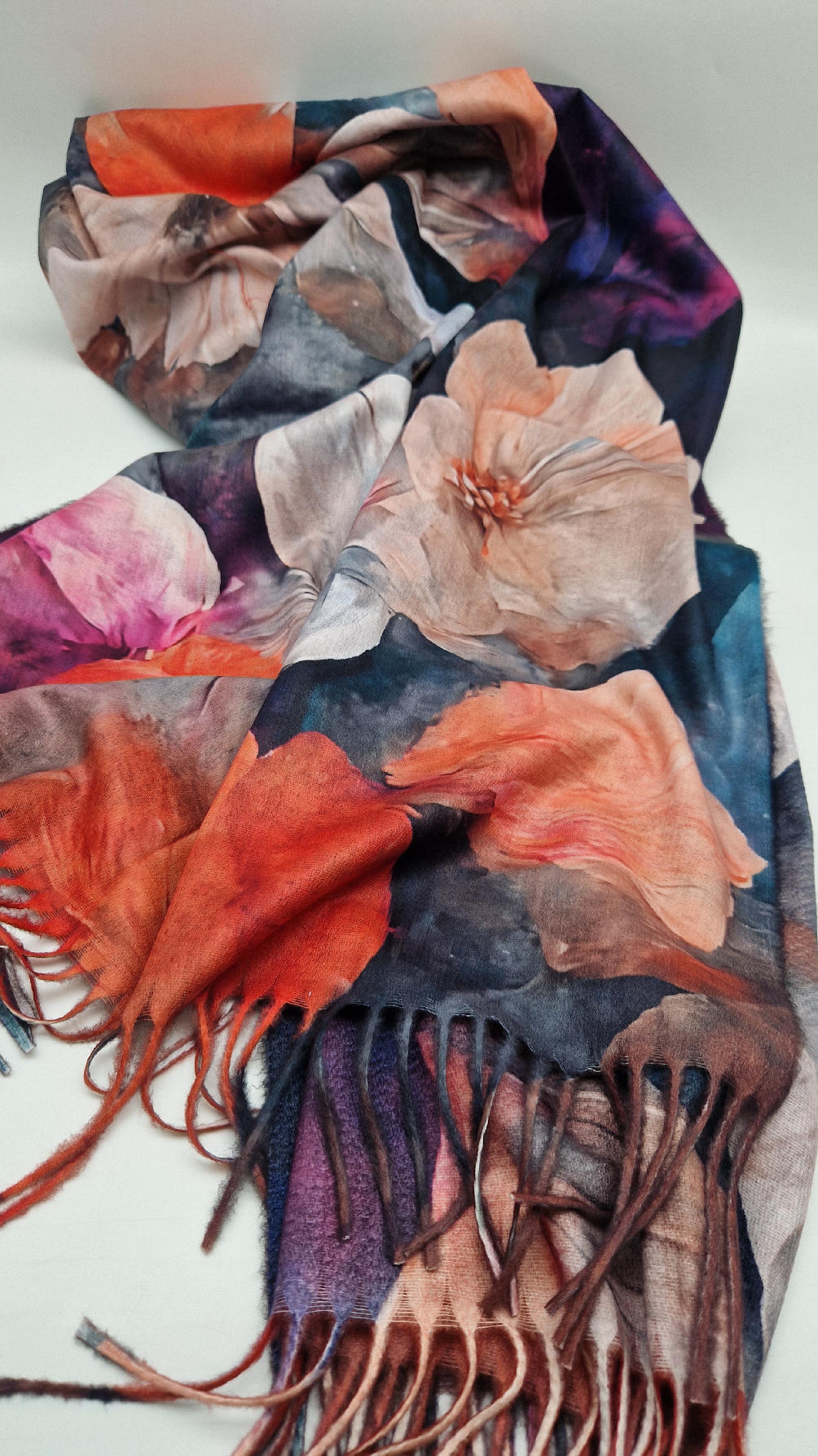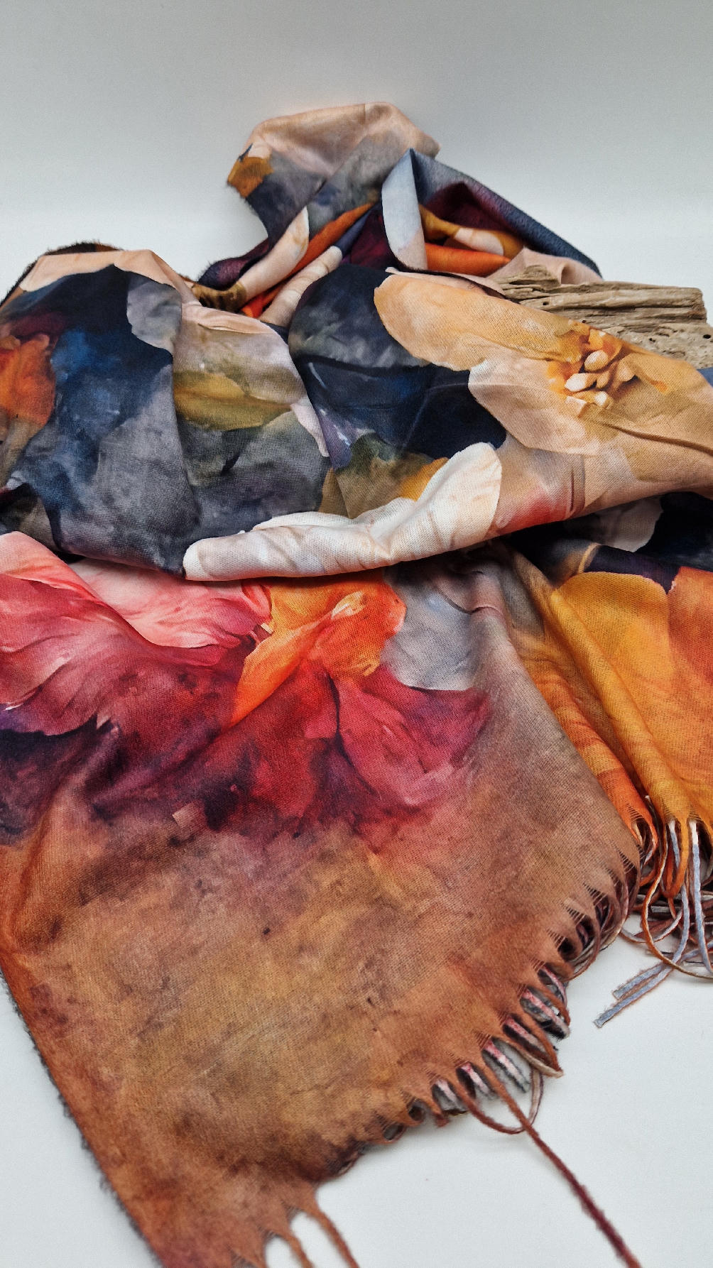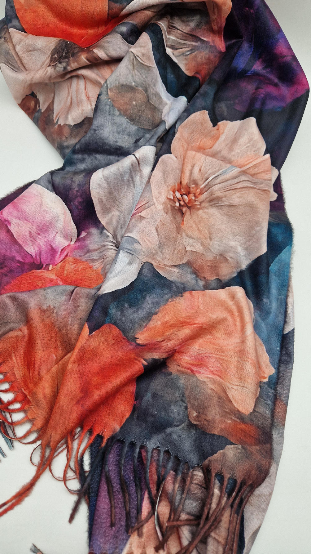 Duży, bardzo miękki, kaszmirowy, kolorowy, ale taki dystyngowanie….piękny i elegancki szal w kwiaty . Szalik jest super miękki, niegryzący, nie taki bardzo gruby..taki idealny . Świetnie zestawione kolory, energetyczne i eleganckie zarazem.