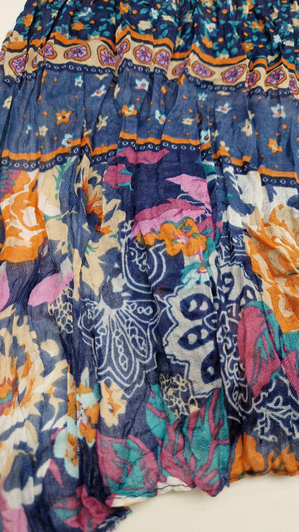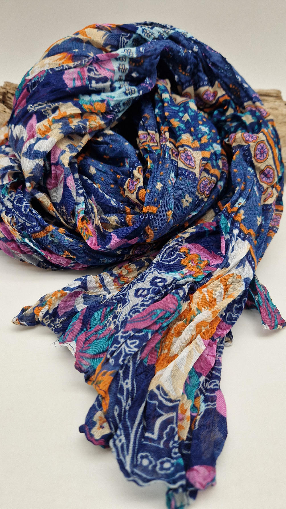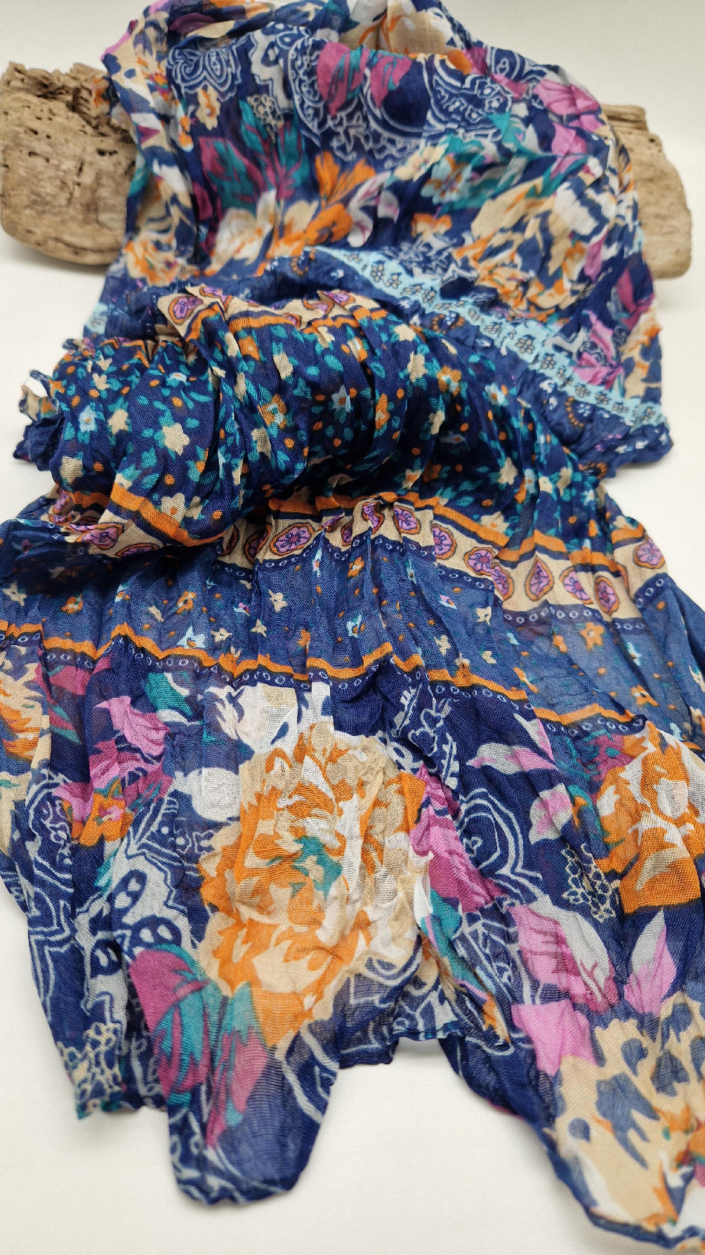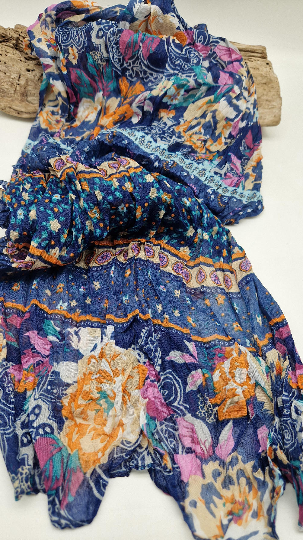 Duży, bardzo miękki, ,,pognieciony” niebieski szal w kolorowe kwiaty i kwiatki… Taki radosny , idealny do katany na przykład…