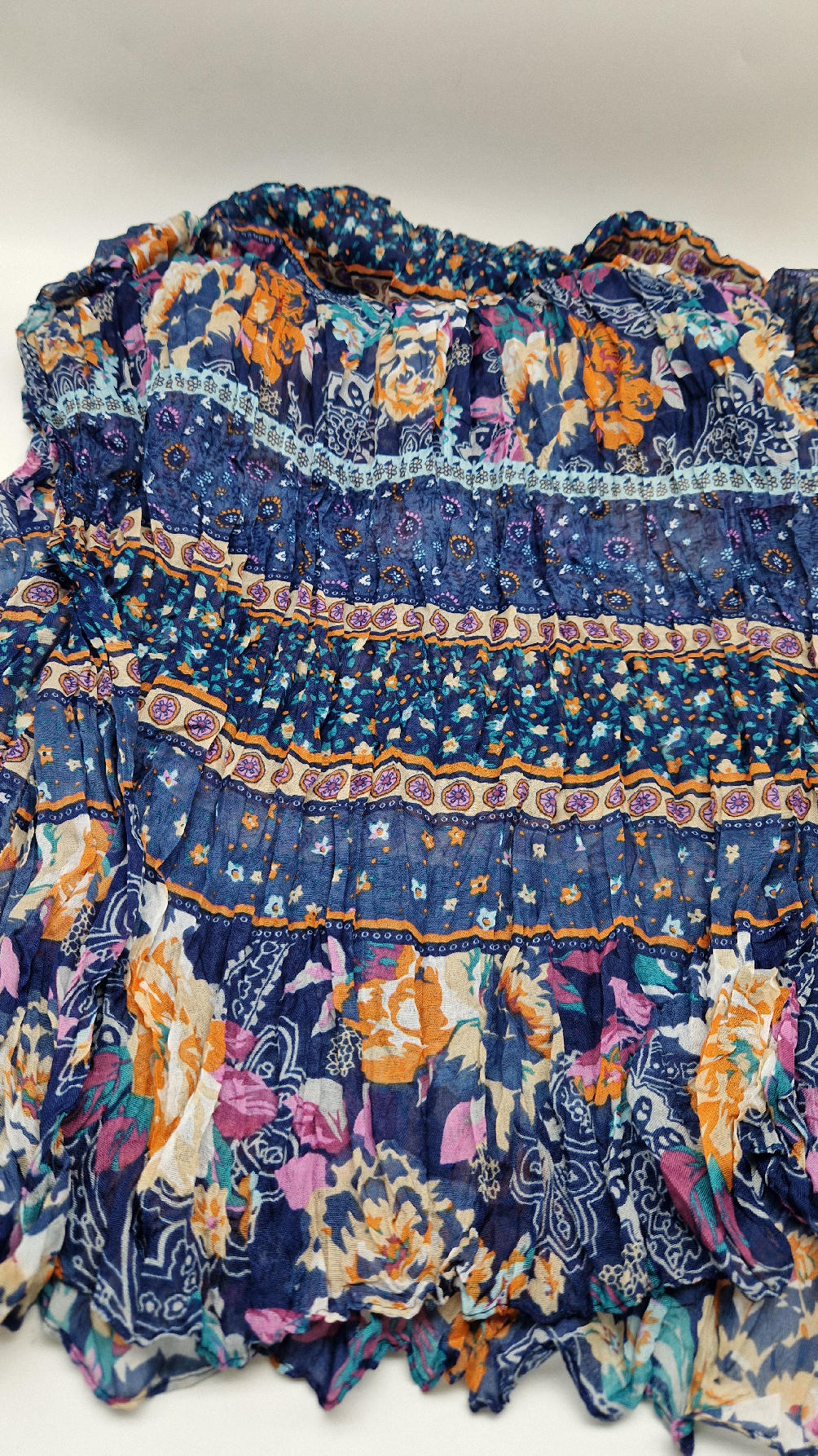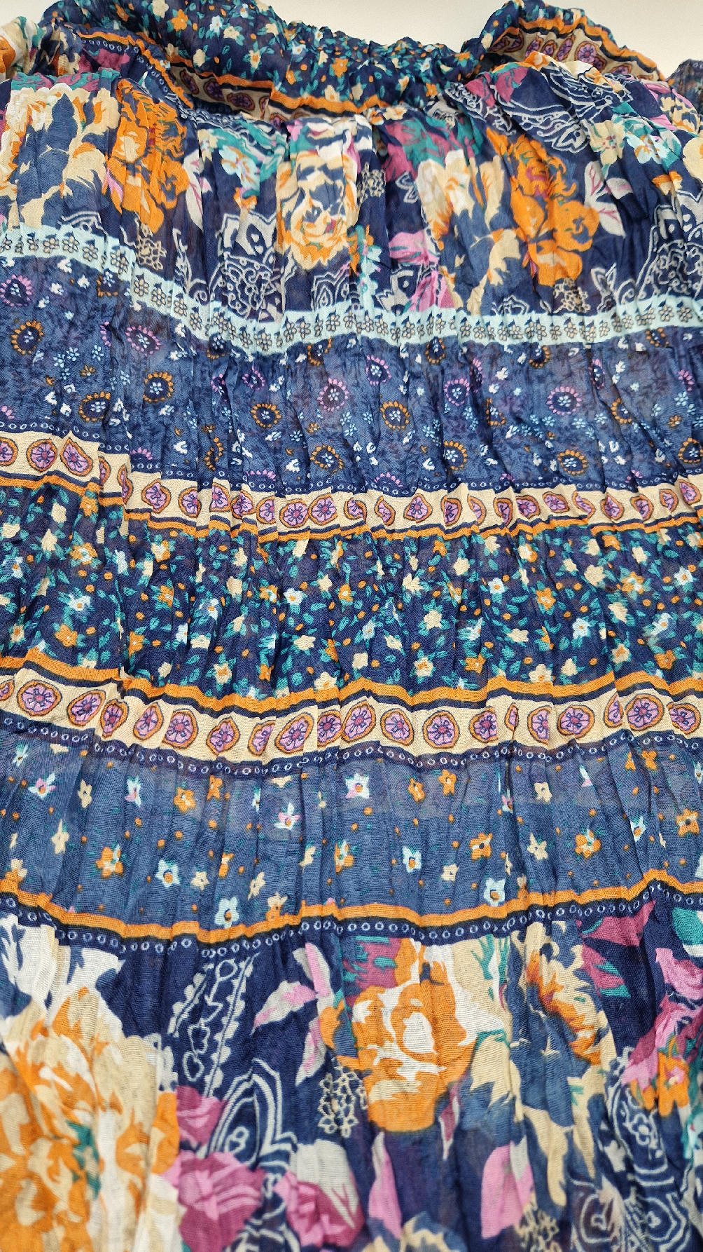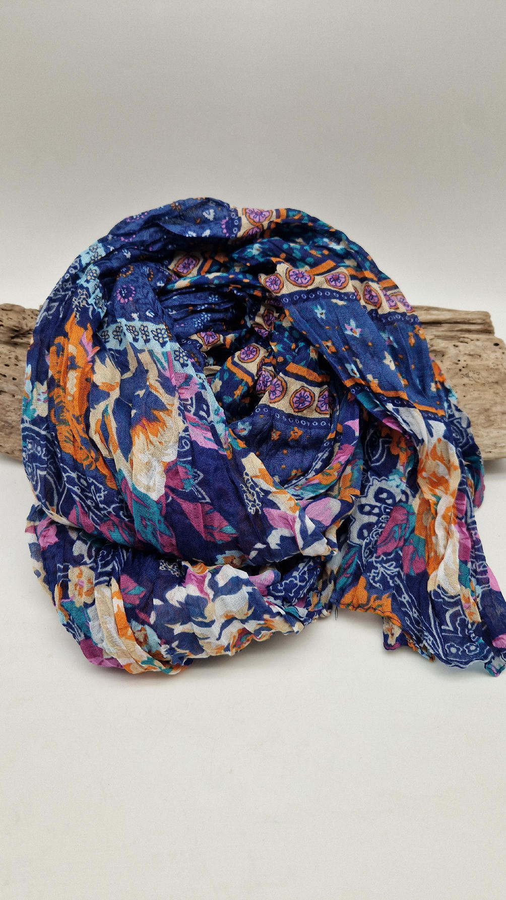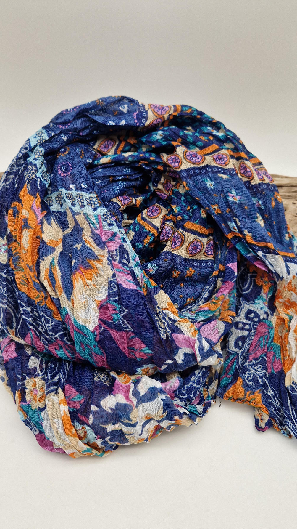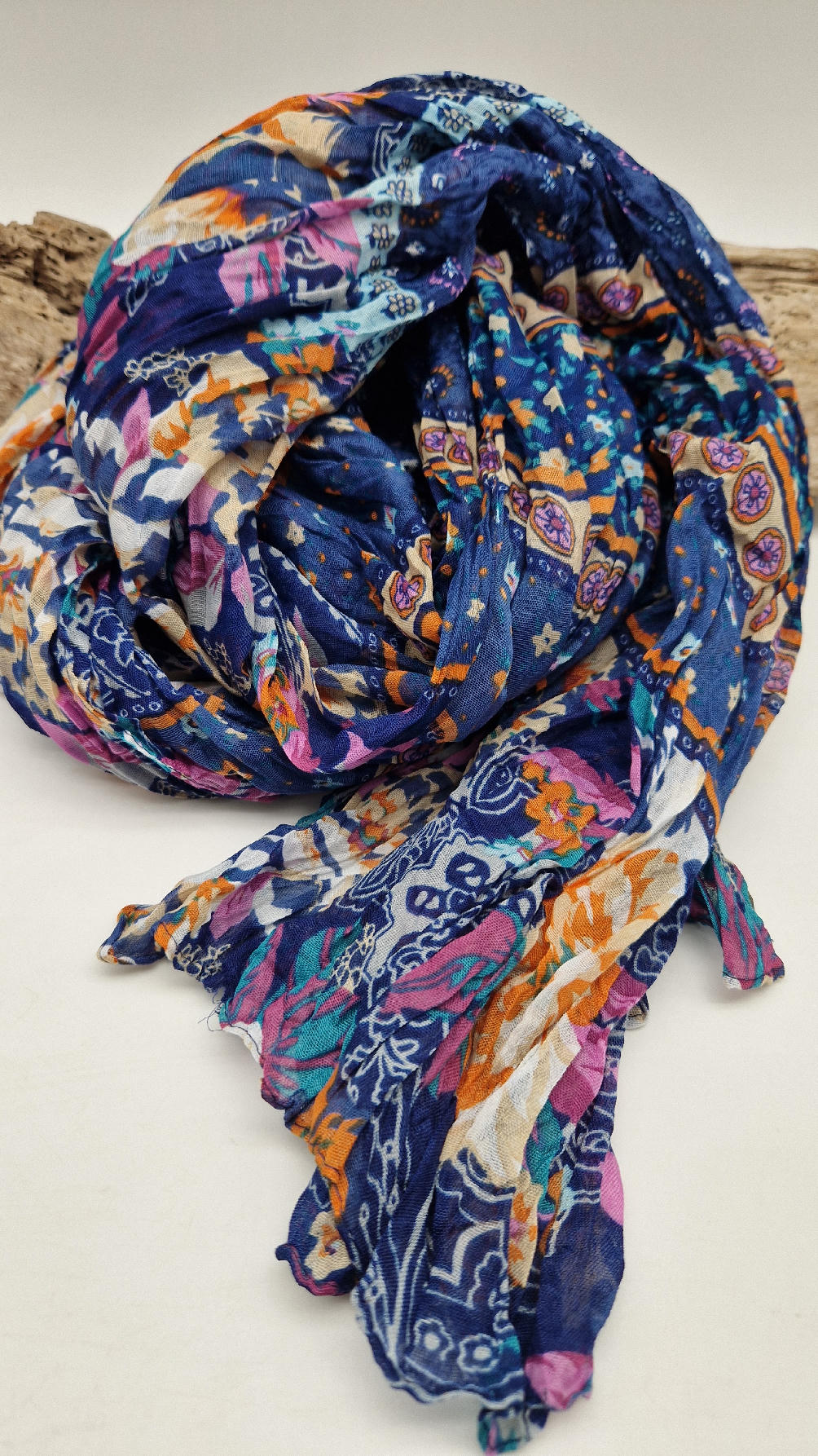Duży, bardzo miękki, ,,pognieciony” niebieski szal w kolorowe kwiaty i kwiatki… Taki radosny , idealny do katany na przykład…