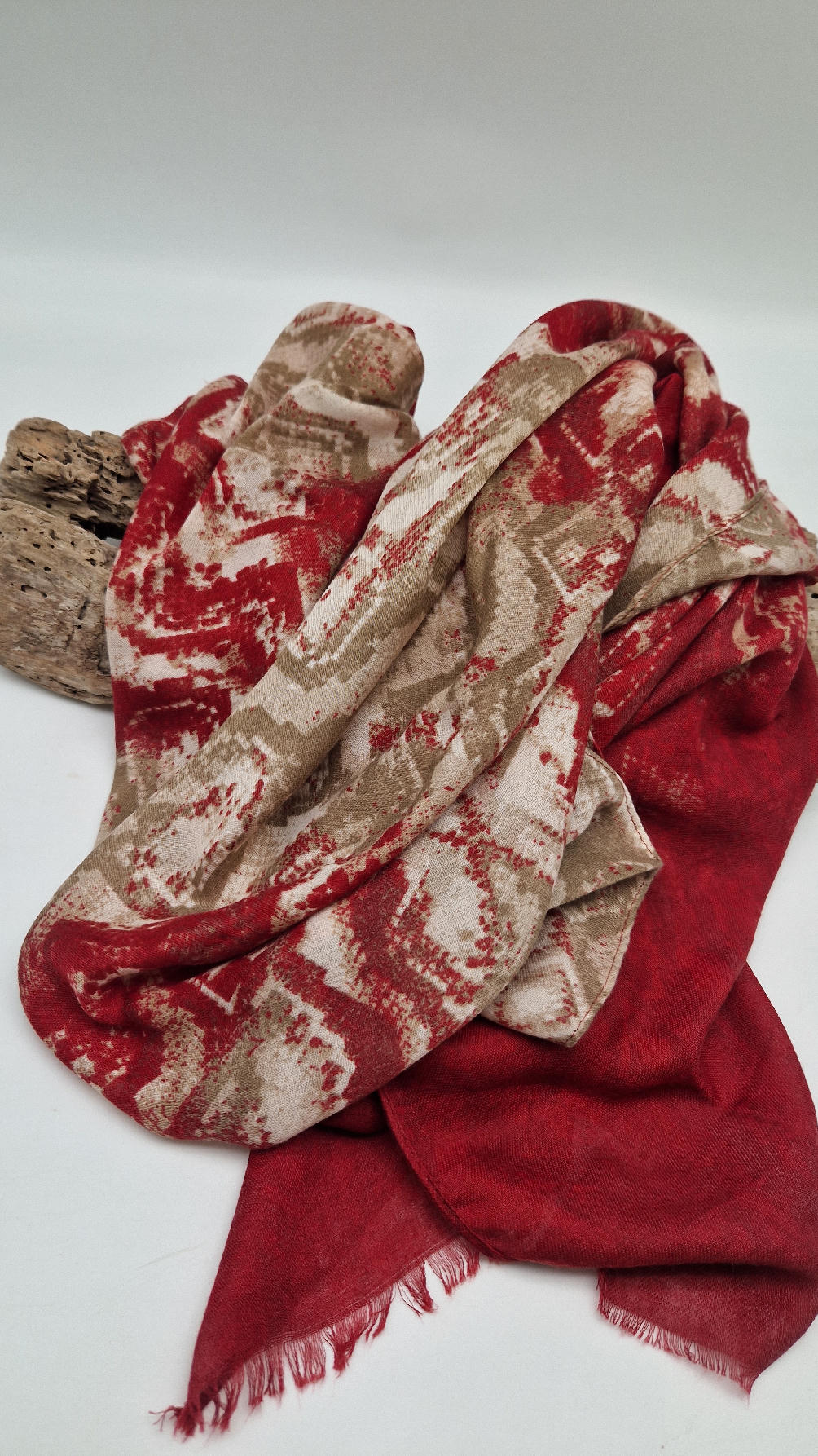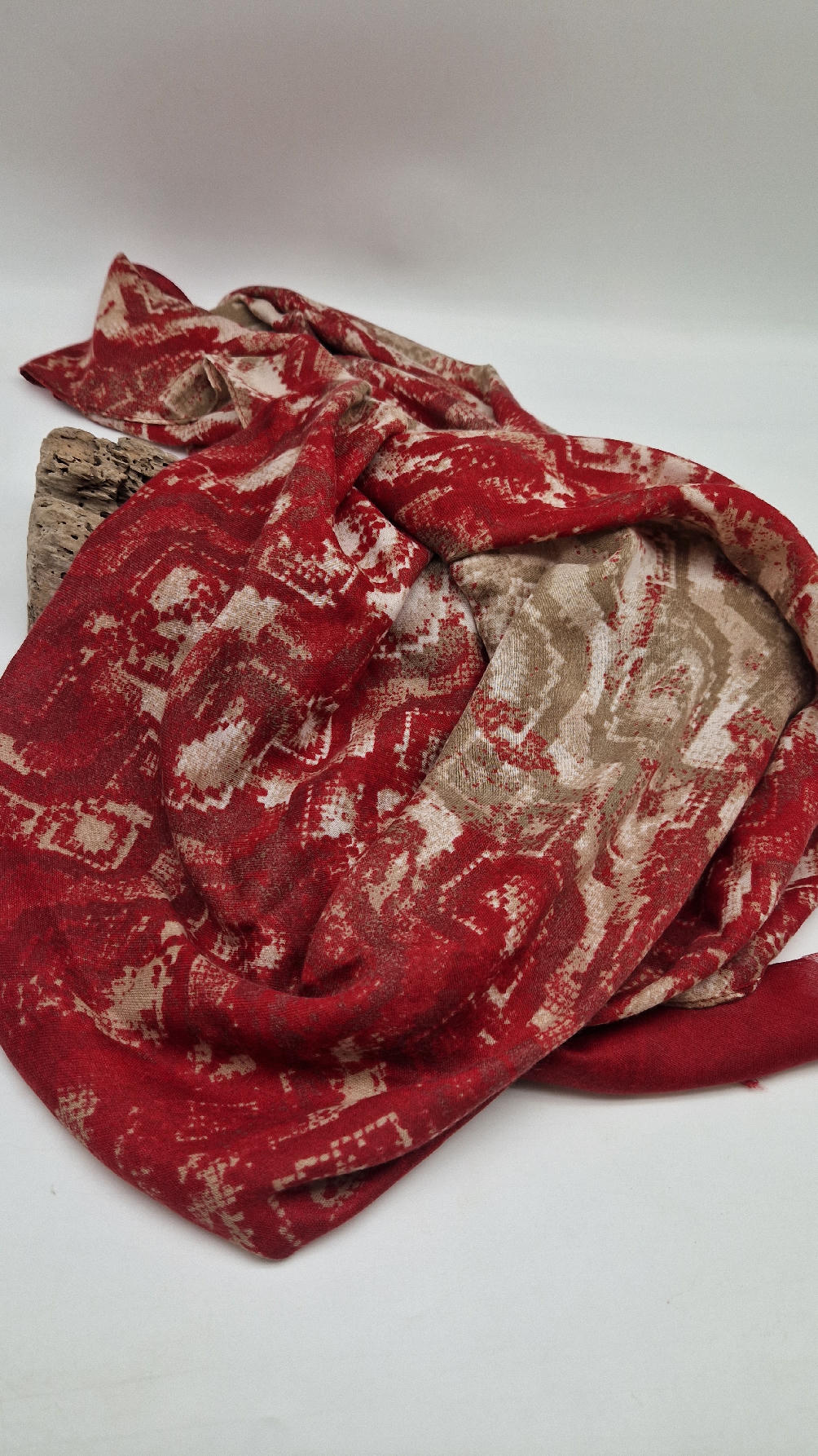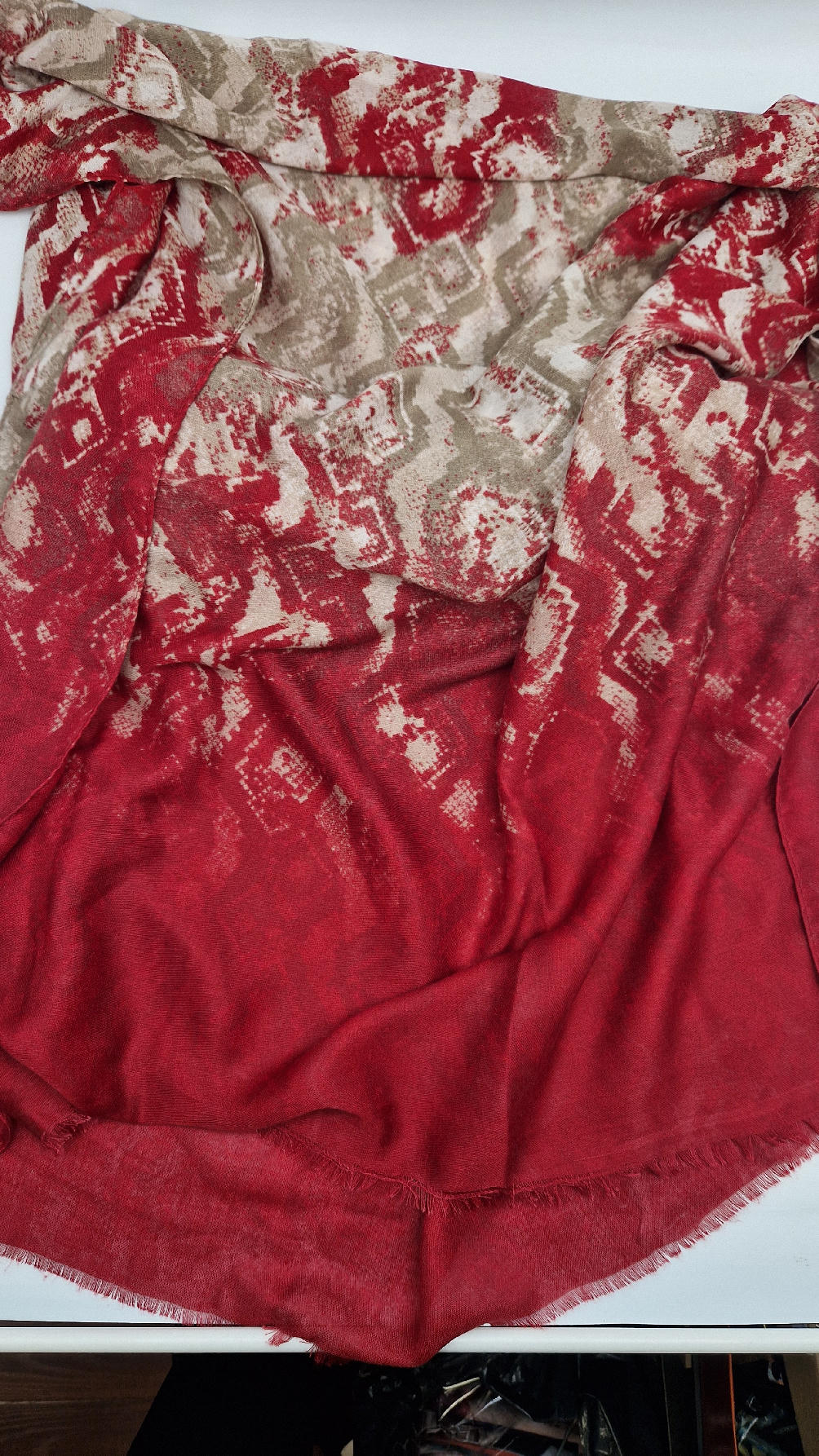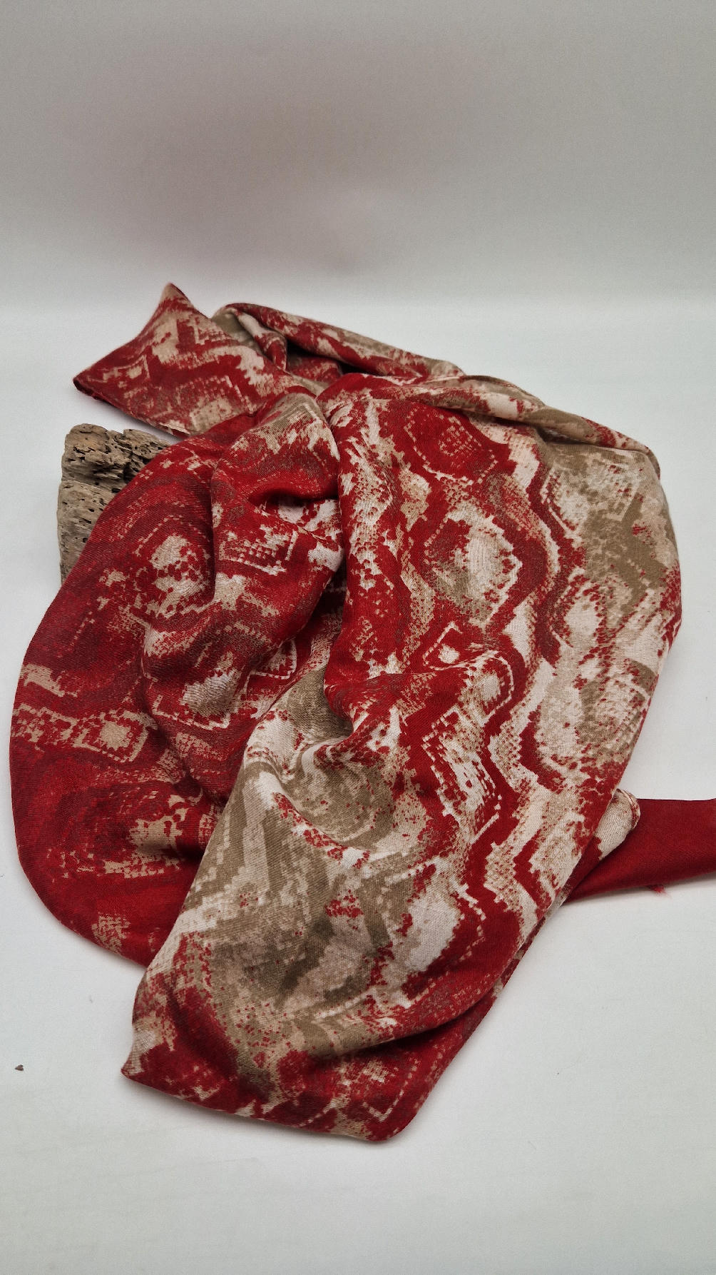 Duży, bardzo miękki, bordowo-beżowy, elegancki szal z wężowym wzorem. Szalik jest grubszy ciut, taki idealny do katany, czy otulaka . Świetnie zestawione kolory, energetyczne i eleganckie zarazem, z lekkim, takim jedwabistym połyskiem.