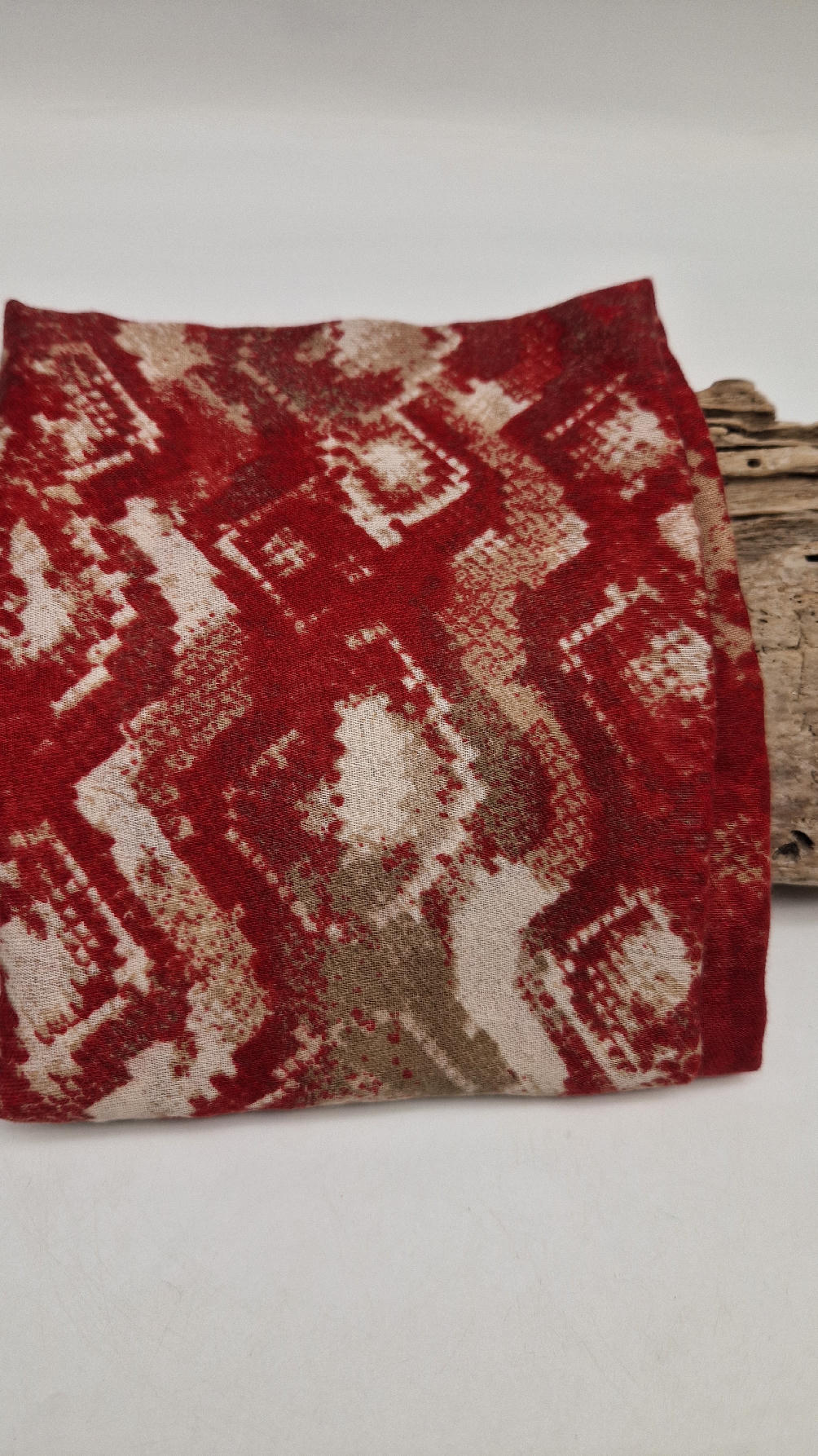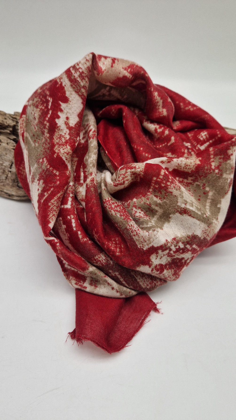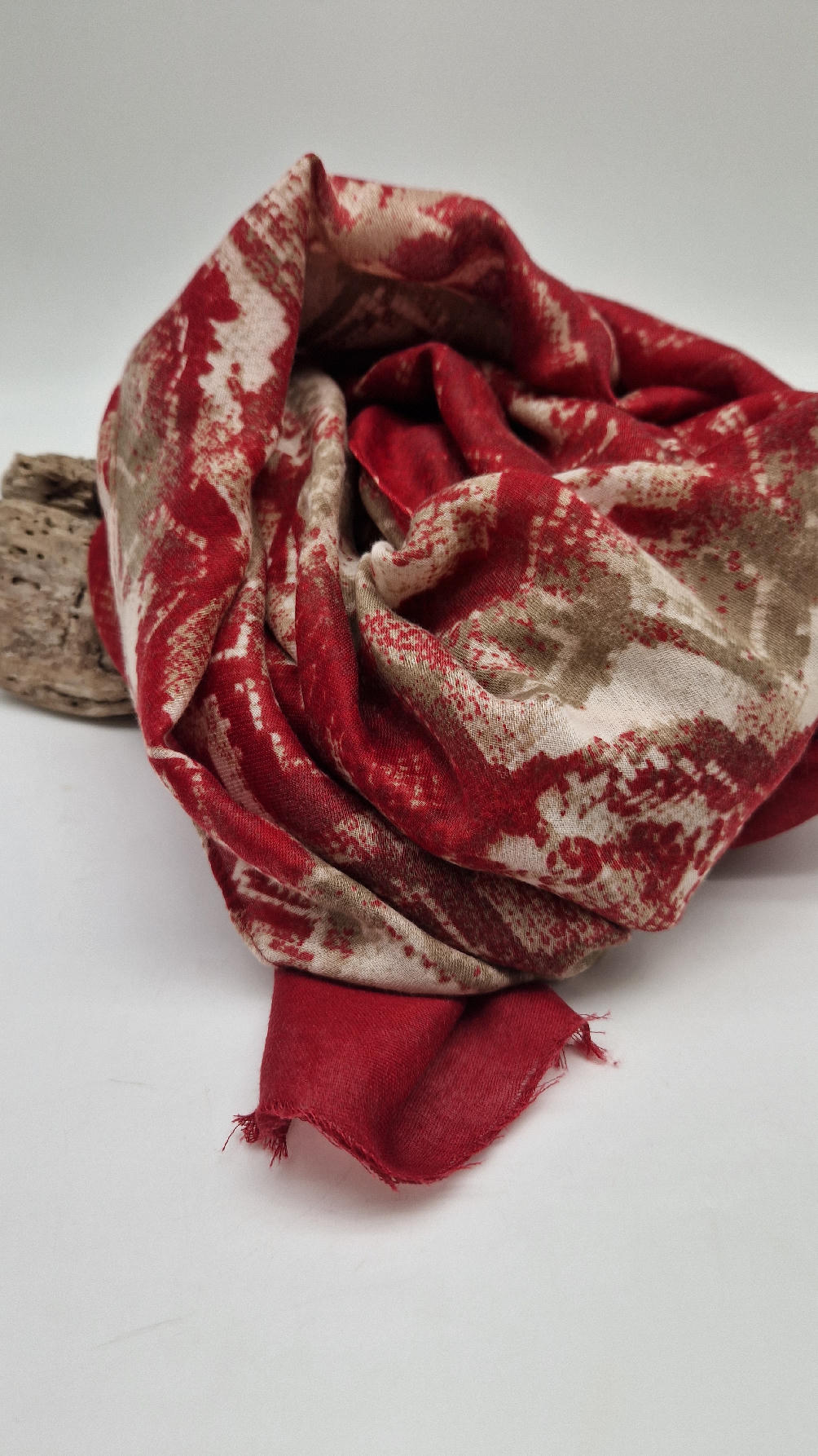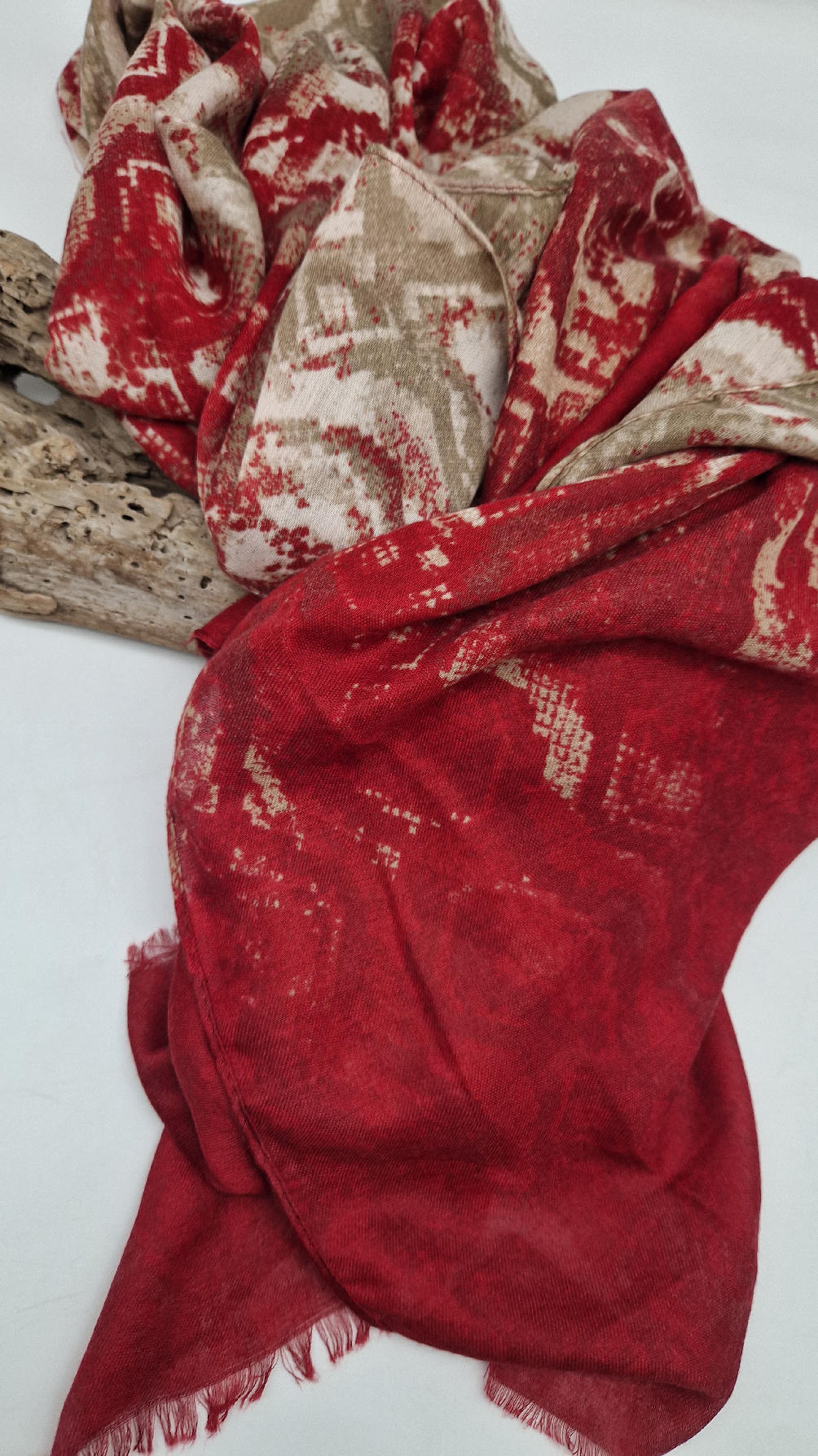 Duży, bardzo miękki, bordowo-beżowy, elegancki szal z wężowym wzorem. Szalik jest grubszy ciut, taki idealny do katany, czy otulaka . Świetnie zestawione kolory, energetyczne i eleganckie zarazem, z lekkim, takim jedwabistym połyskiem.