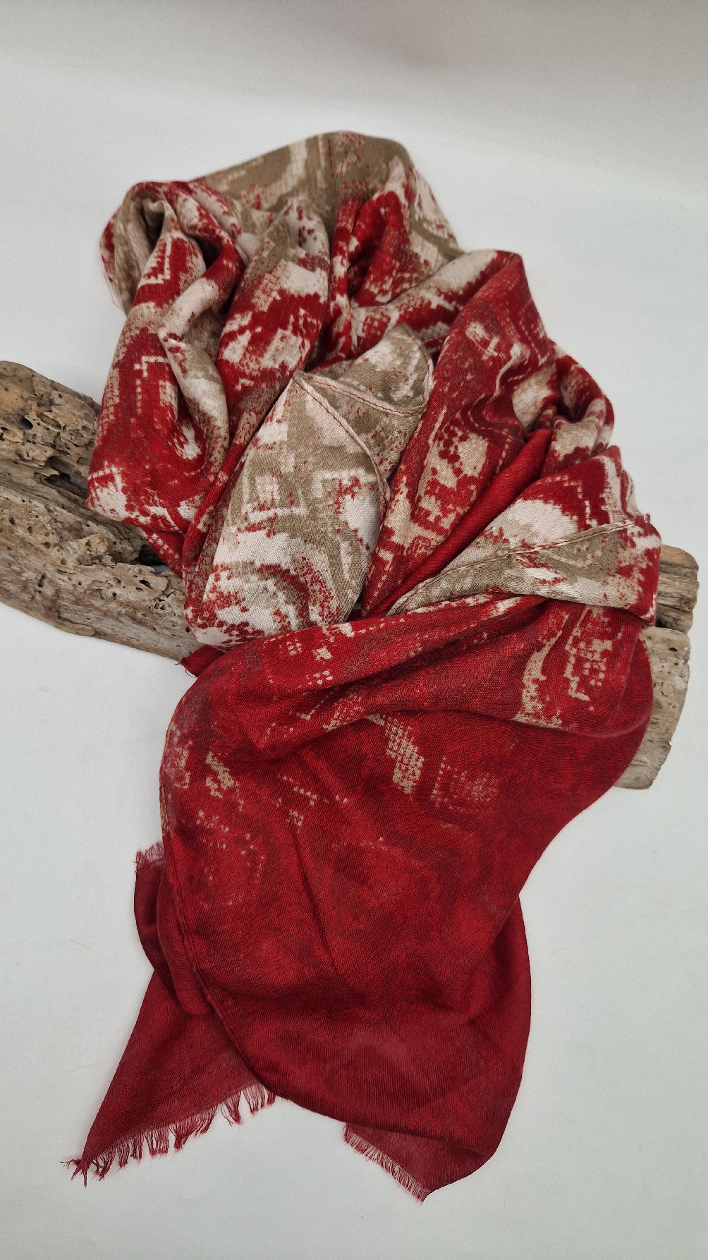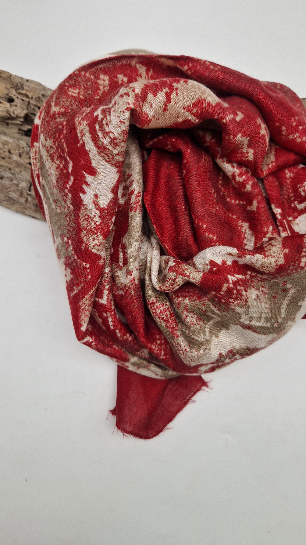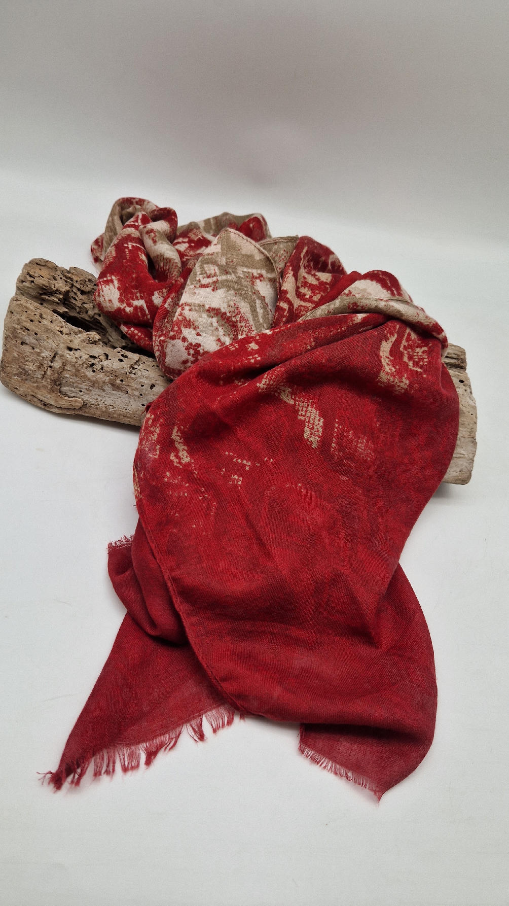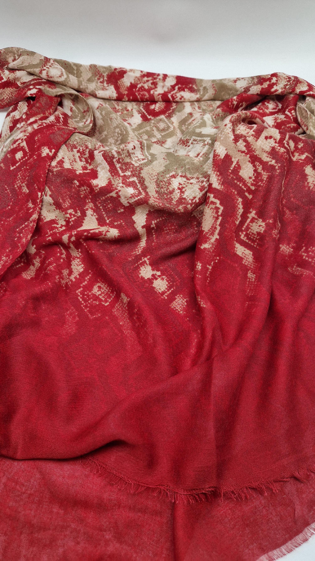 Duży, bardzo miękki, bordowo-beżowy, elegancki szal z wężowym wzorem. Szalik jest grubszy ciut, taki idealny do katany, czy otulaka . Świetnie zestawione kolory, energetyczne i eleganckie zarazem, z lekkim, takim jedwabistym połyskiem.