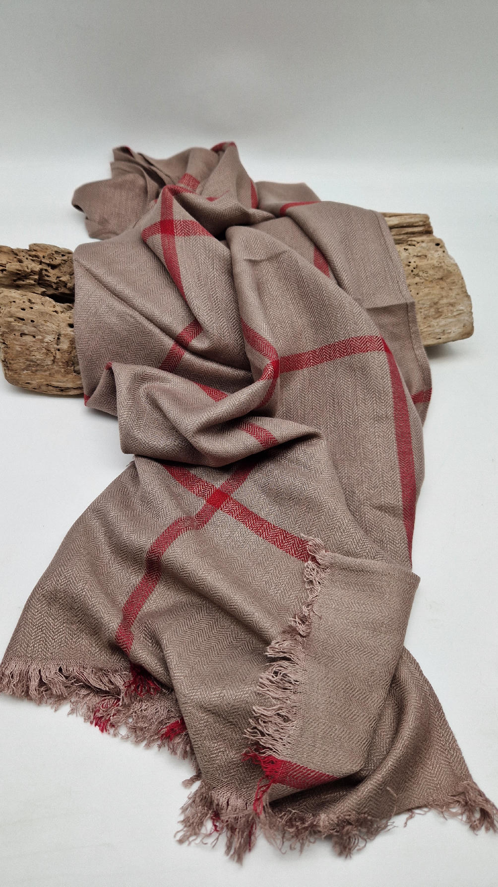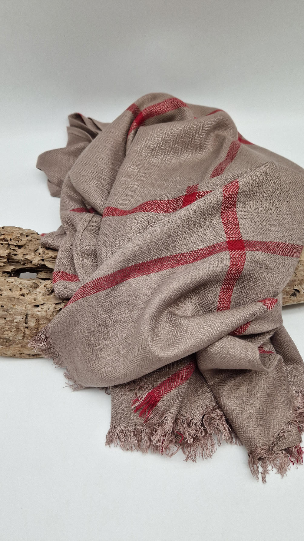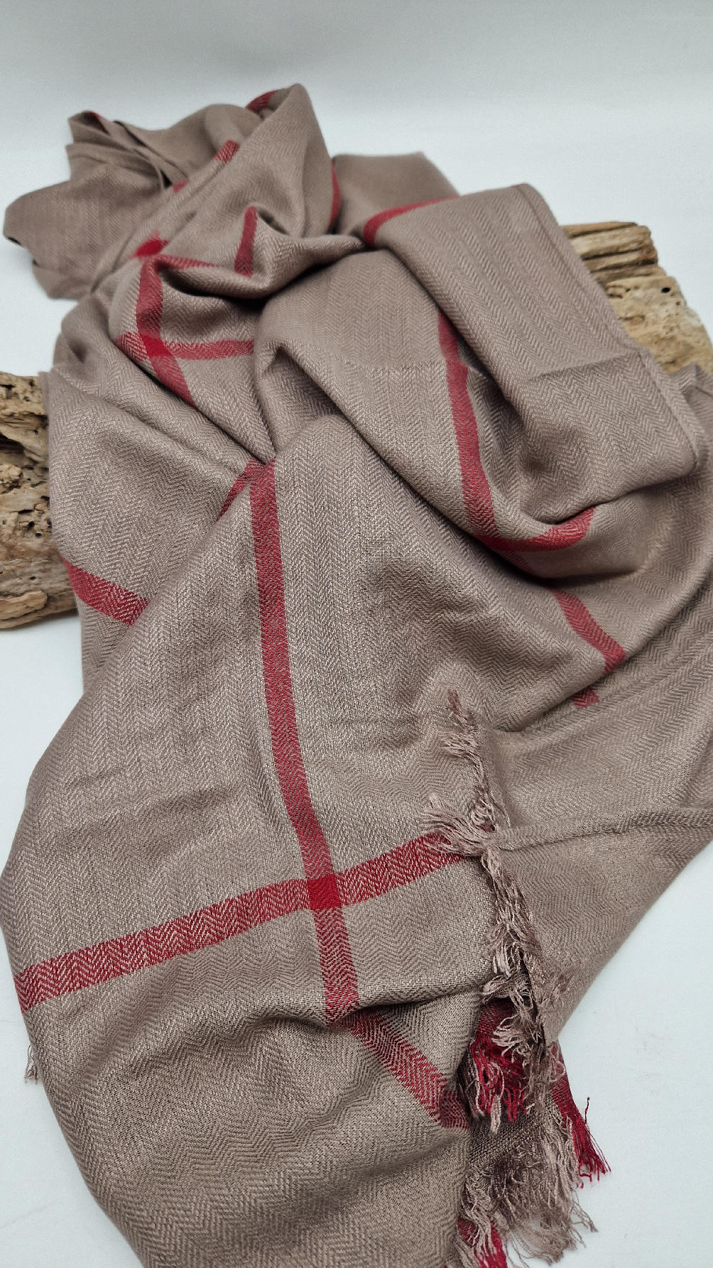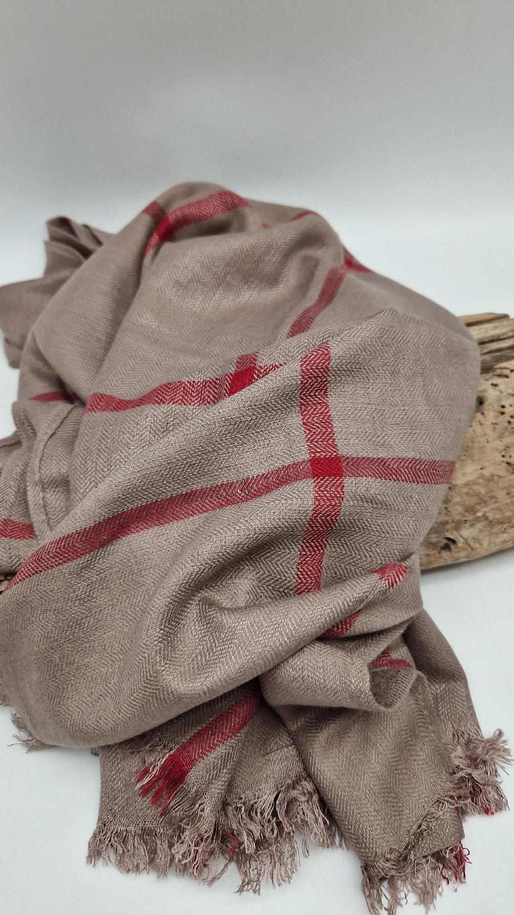 Duży, miękki, klasyczny beżowy szal w kratę z ociupiną czerwieni. Cudny, zwariowany i klasyczny, ponadczasowy, elegancki, zawsze modny, taki…z włoskim sznytem…dla Ciebie, a może dla eleganckiego mężczyzny …?