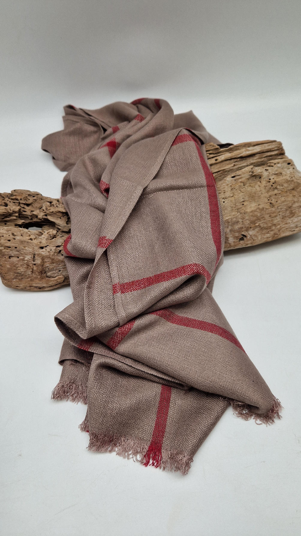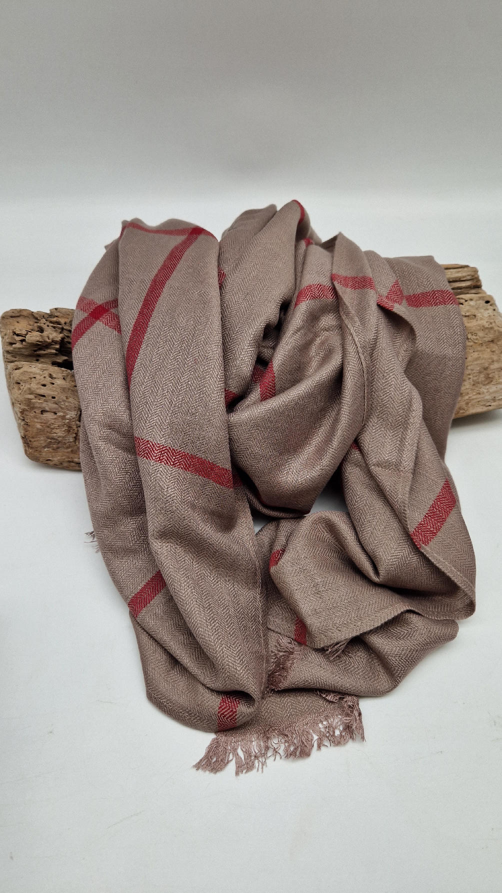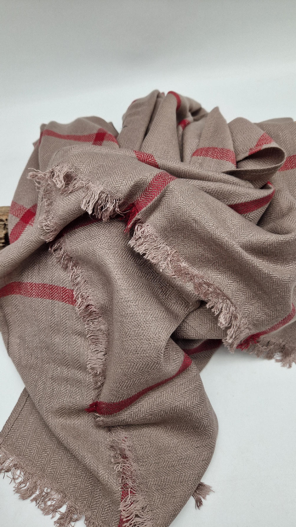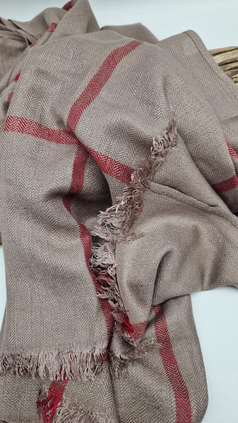 Duży, miękki, klasyczny beżowy szal w kratę z ociupiną czerwieni. Cudny, zwariowany i klasyczny, ponadczasowy, elegancki, zawsze modny, taki…z włoskim sznytem…dla Ciebie, a może dla eleganckiego mężczyzny …?